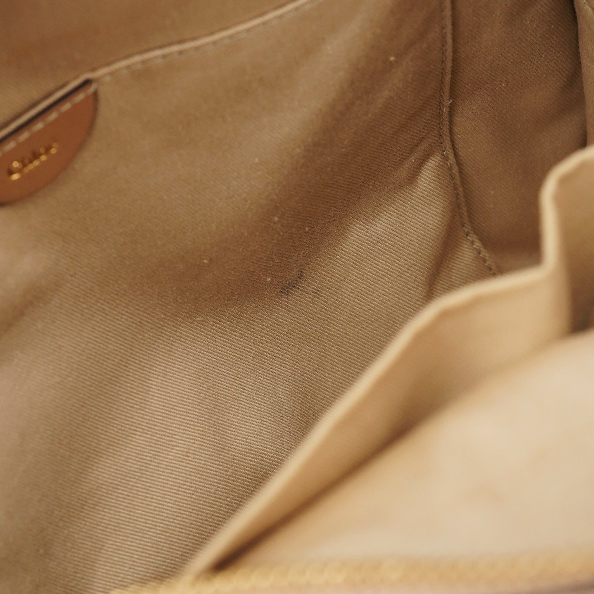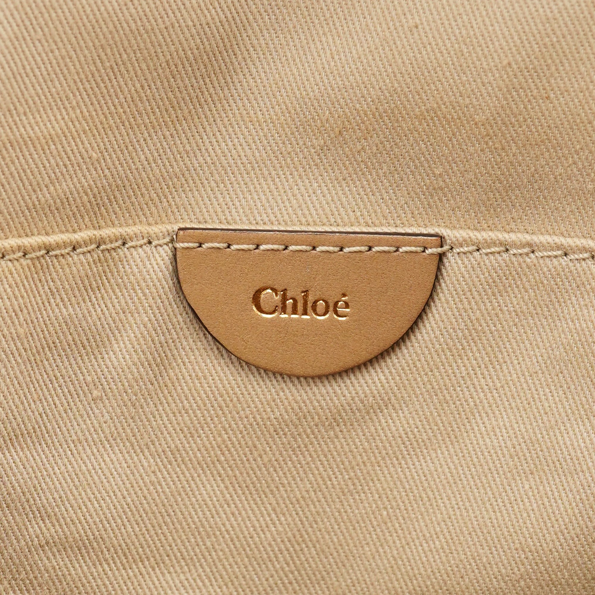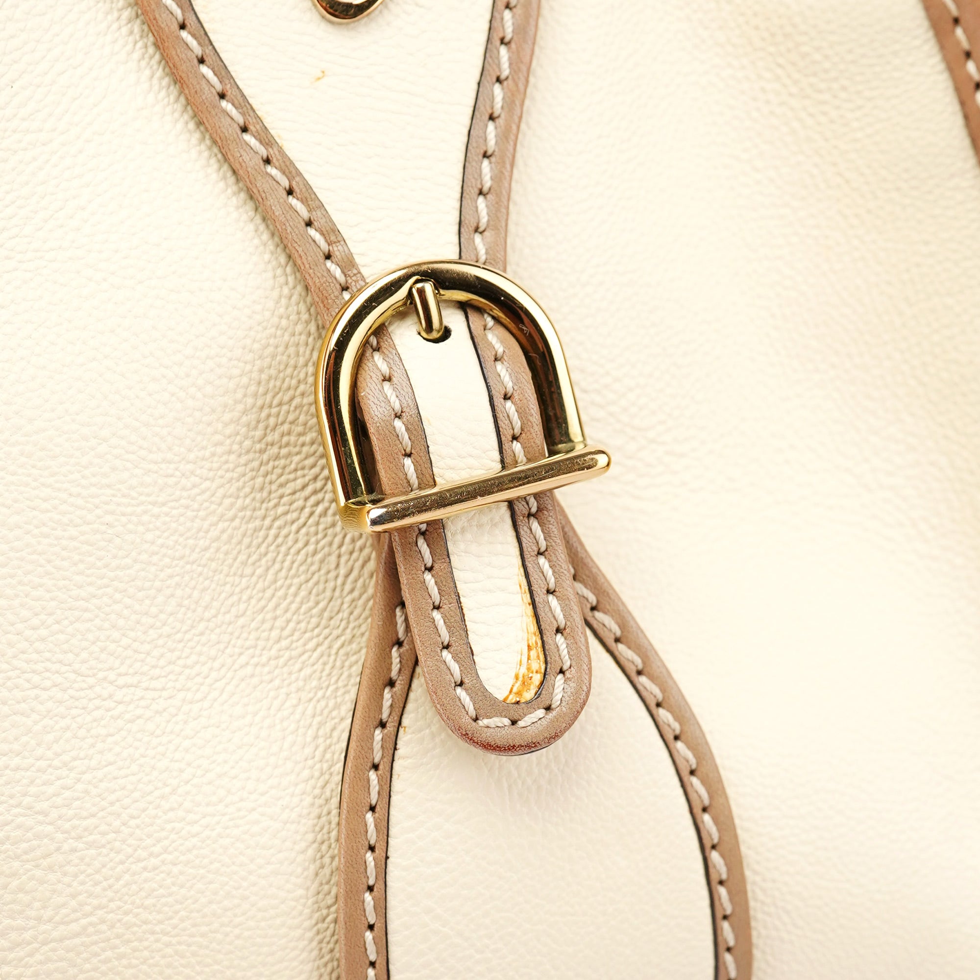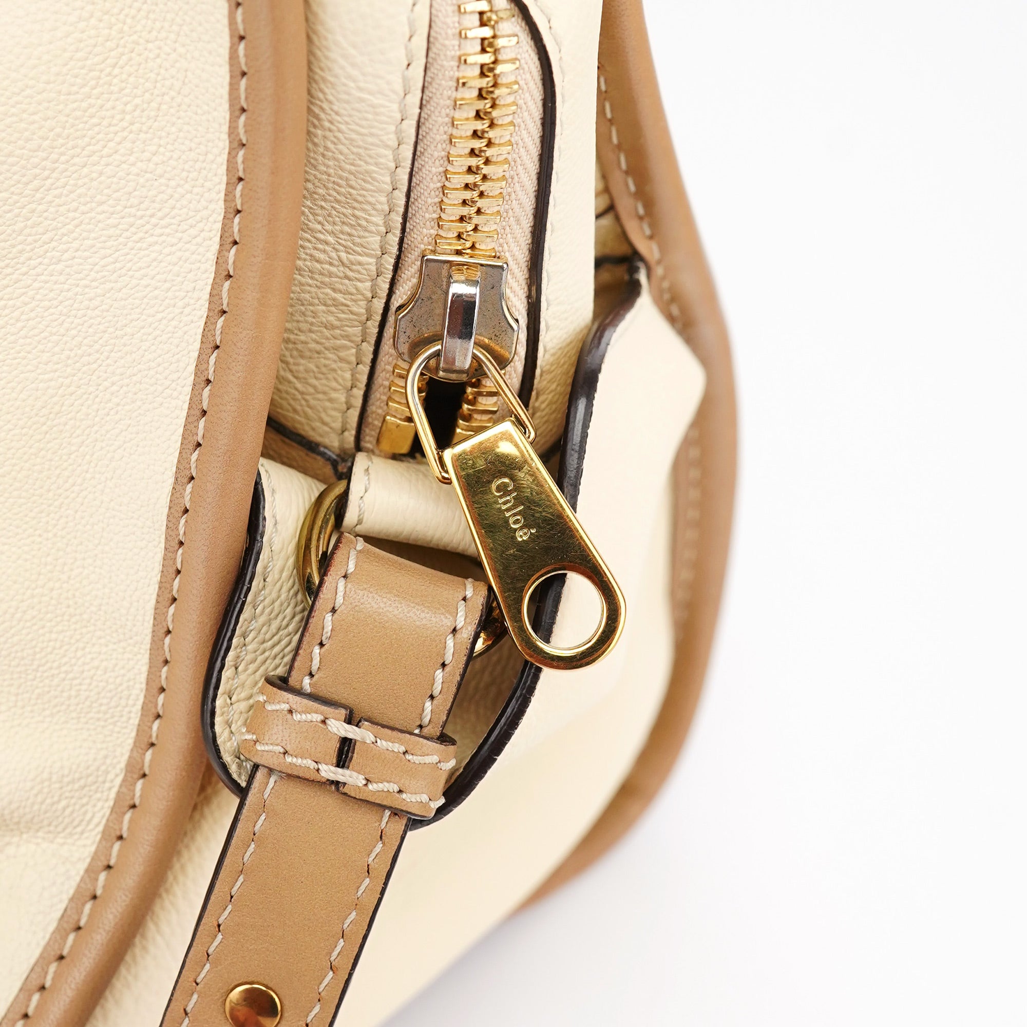 Designed in the early 2000s, this Chloé 2-way tote bag is crafted from cream leather with smooth tan trim and gold-tone hardware. The structured silhouette features double top handles, a detachable shoulder strap, and curved strap appliqués with small buckles. The interior is lined in beige fabric and includes a slip pocket with magnetic closure.