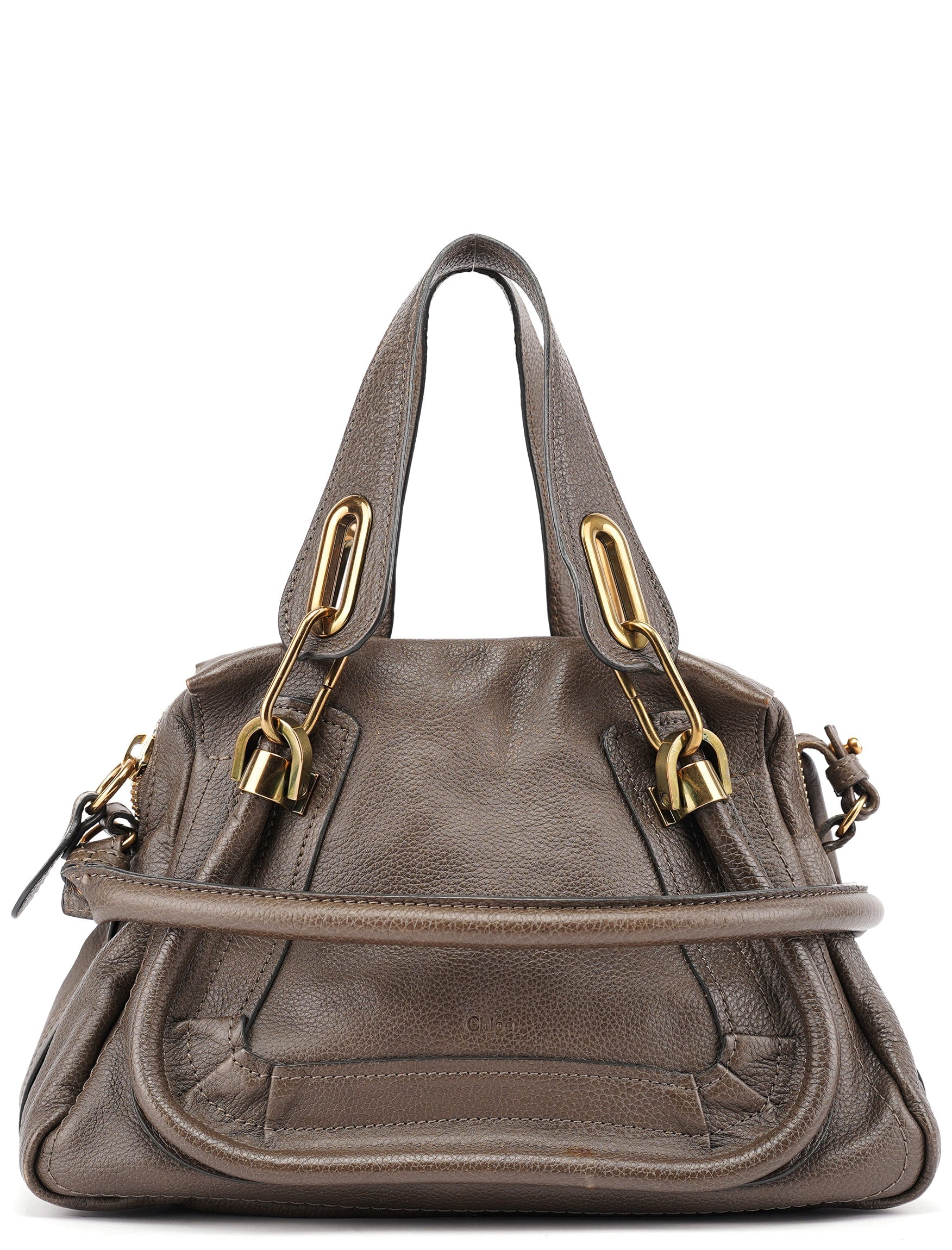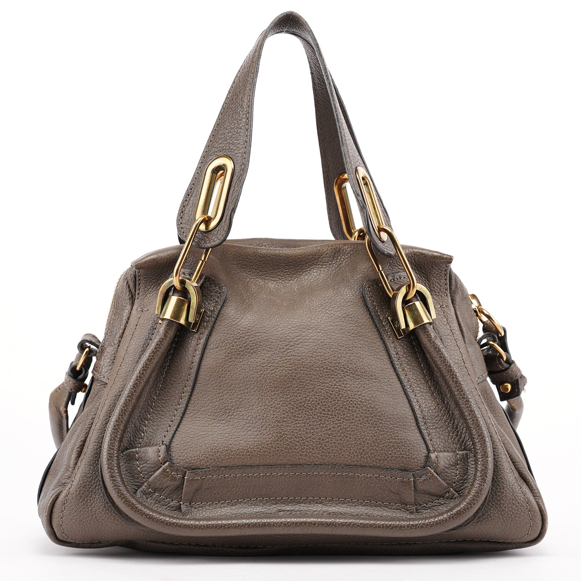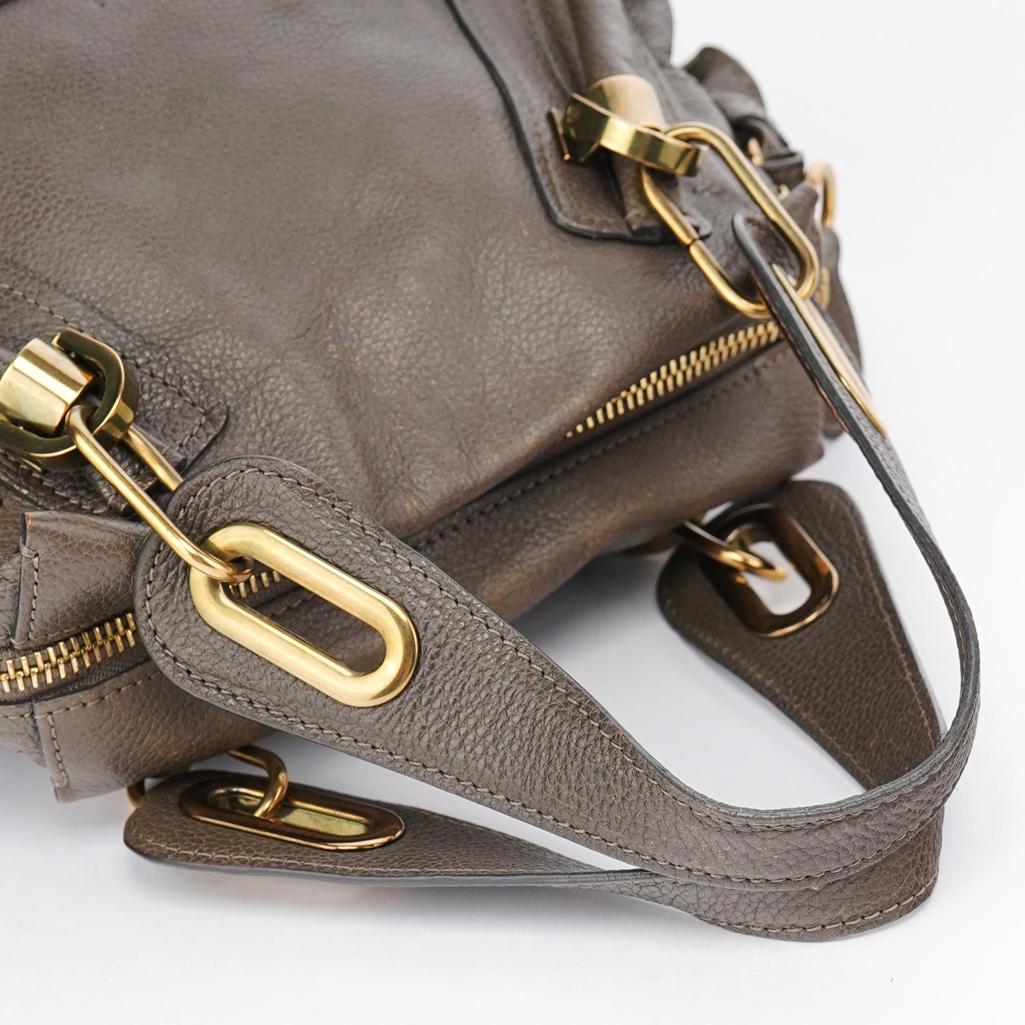 Designed in the mid-2000s by Phoebe Philo, the Chloé Paraty bag is crafted in dark grey pebbled leather with gold-tone hardware and a structured trapezoidal shape. It features the line’s signature double rolled handles, side strap loops, and rounded piping, along with a removable leather shoulder strap. The zip-top opens to a canvas-lined interior with a single zip pocket.