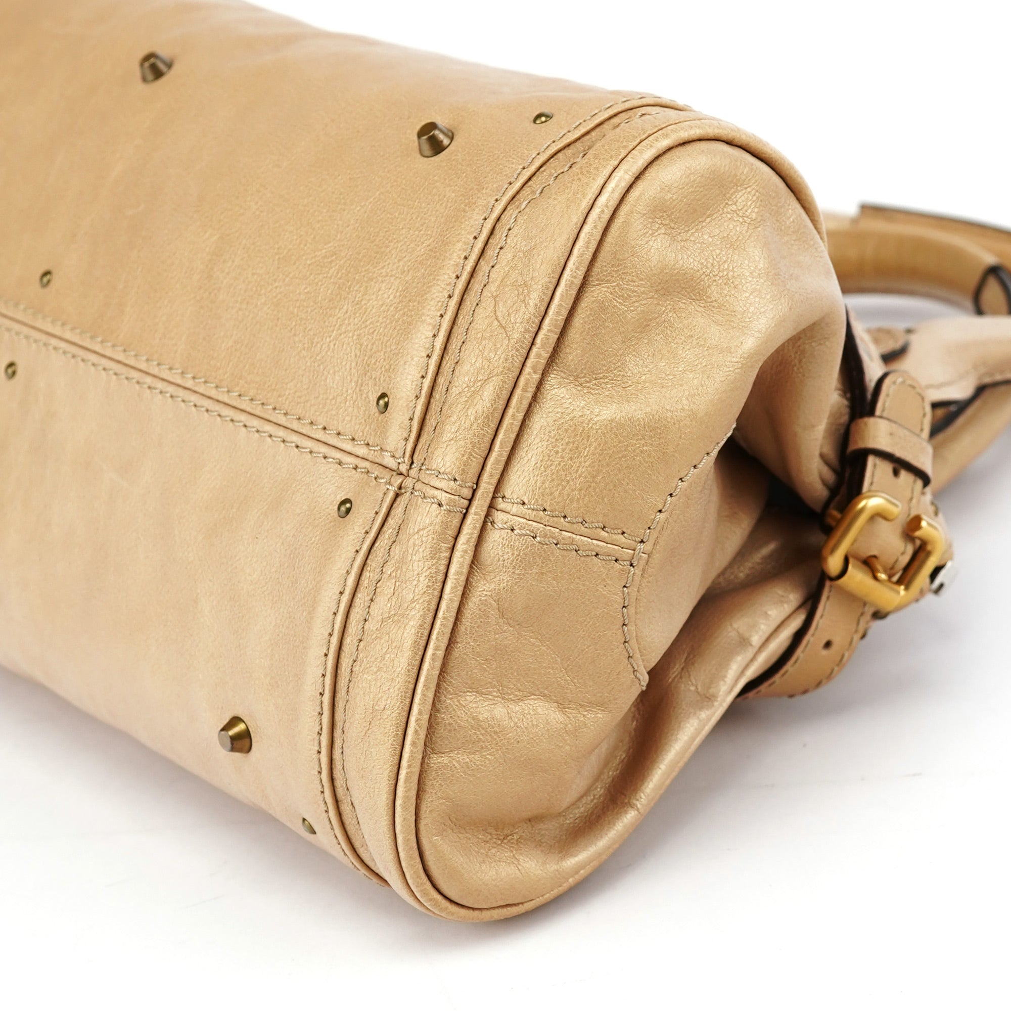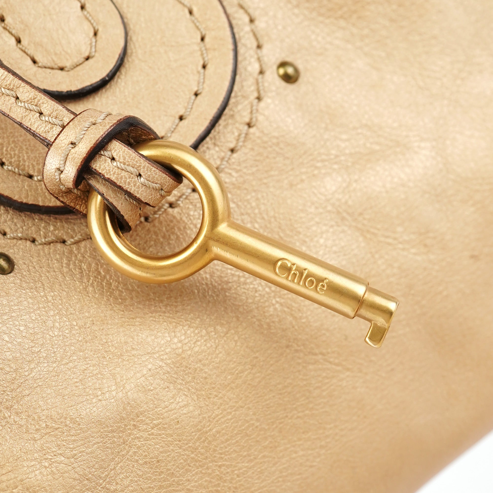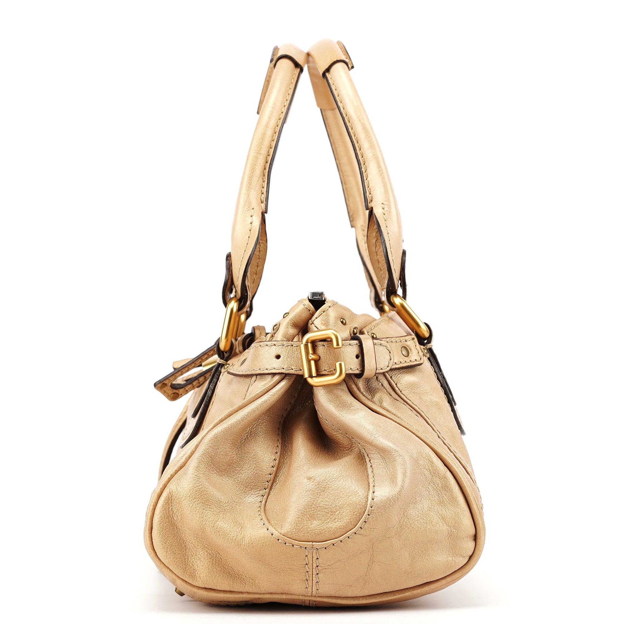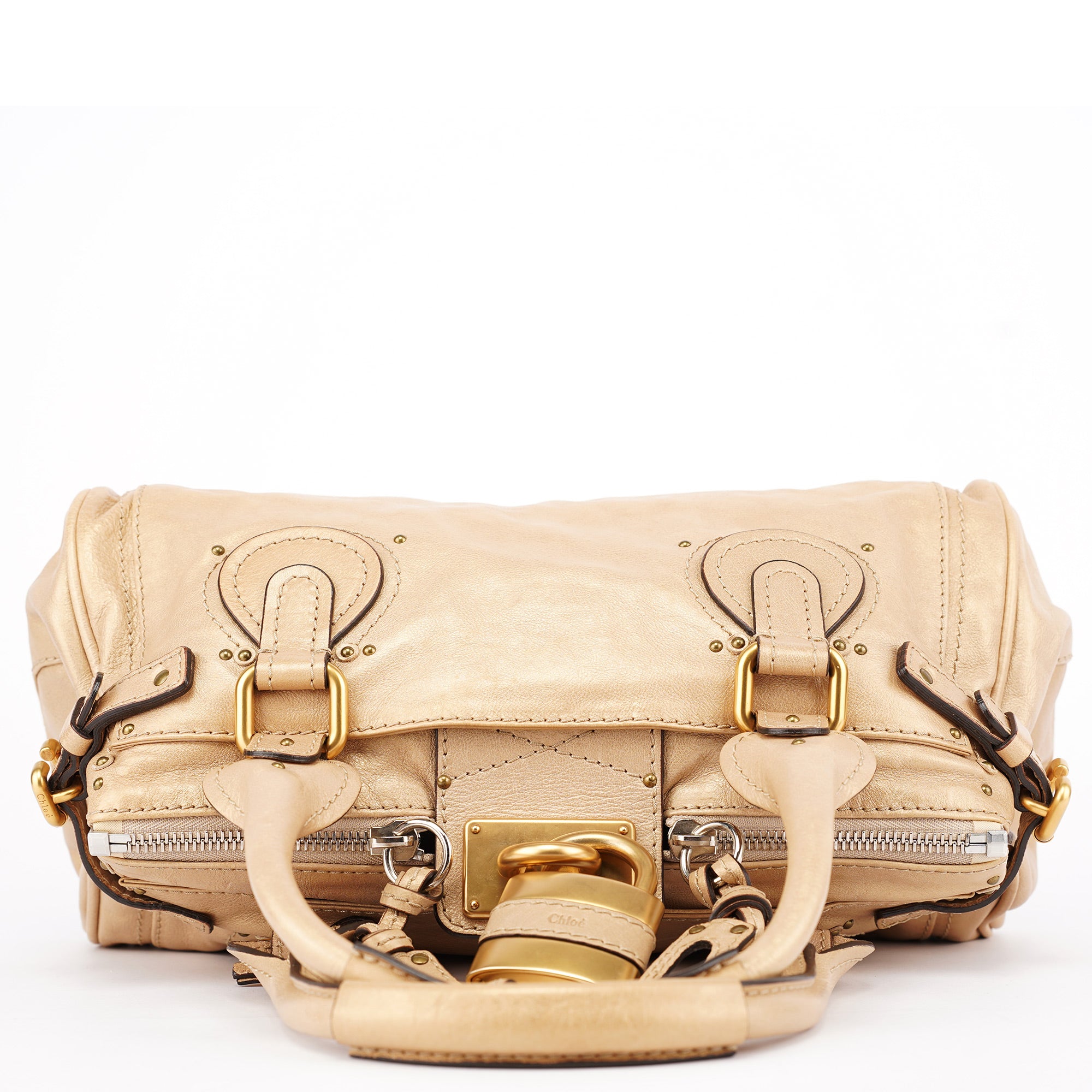 Designed in the early 2000s by Phoebe Philo, this Chloé Paddington bag is crafted from metallic gold leather with gold-tone hardware. The signature oversized padlock and key detail anchor the front, while rounded handles and stitched paneling complete the iconic silhouette. A zip closure opens to a canvas-lined interior with a slip pocket.