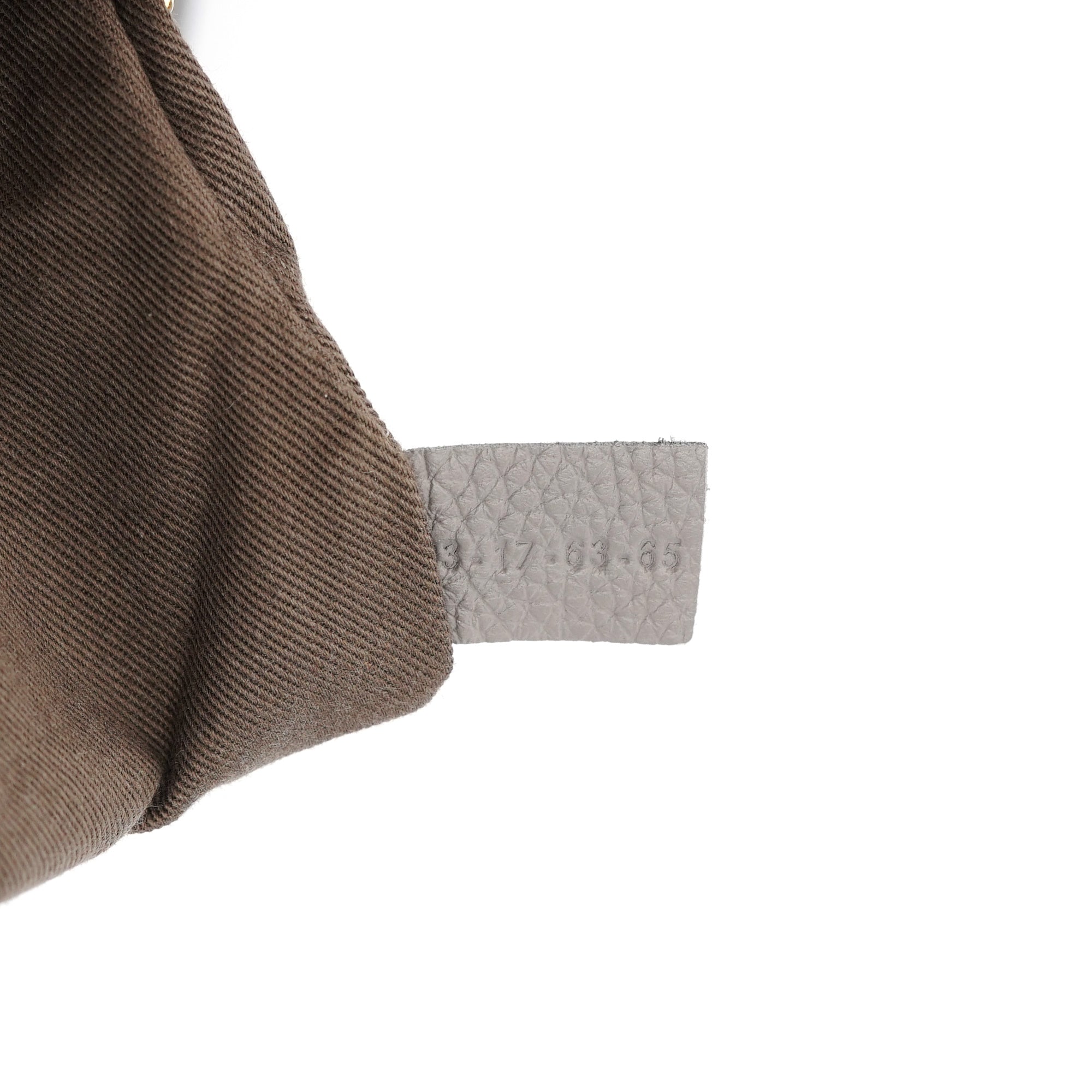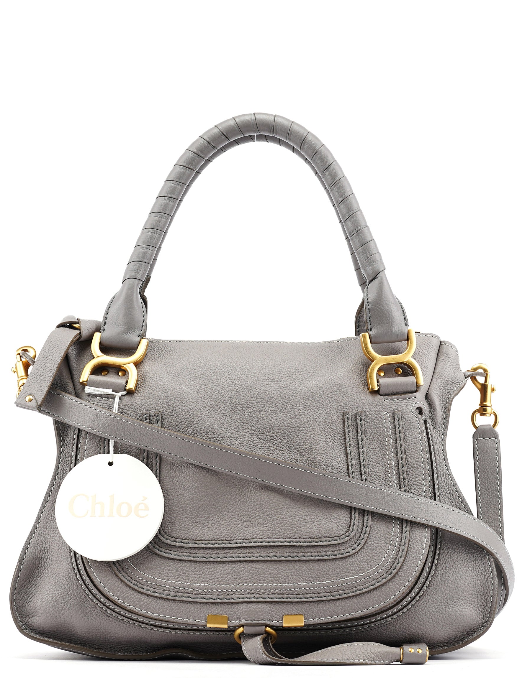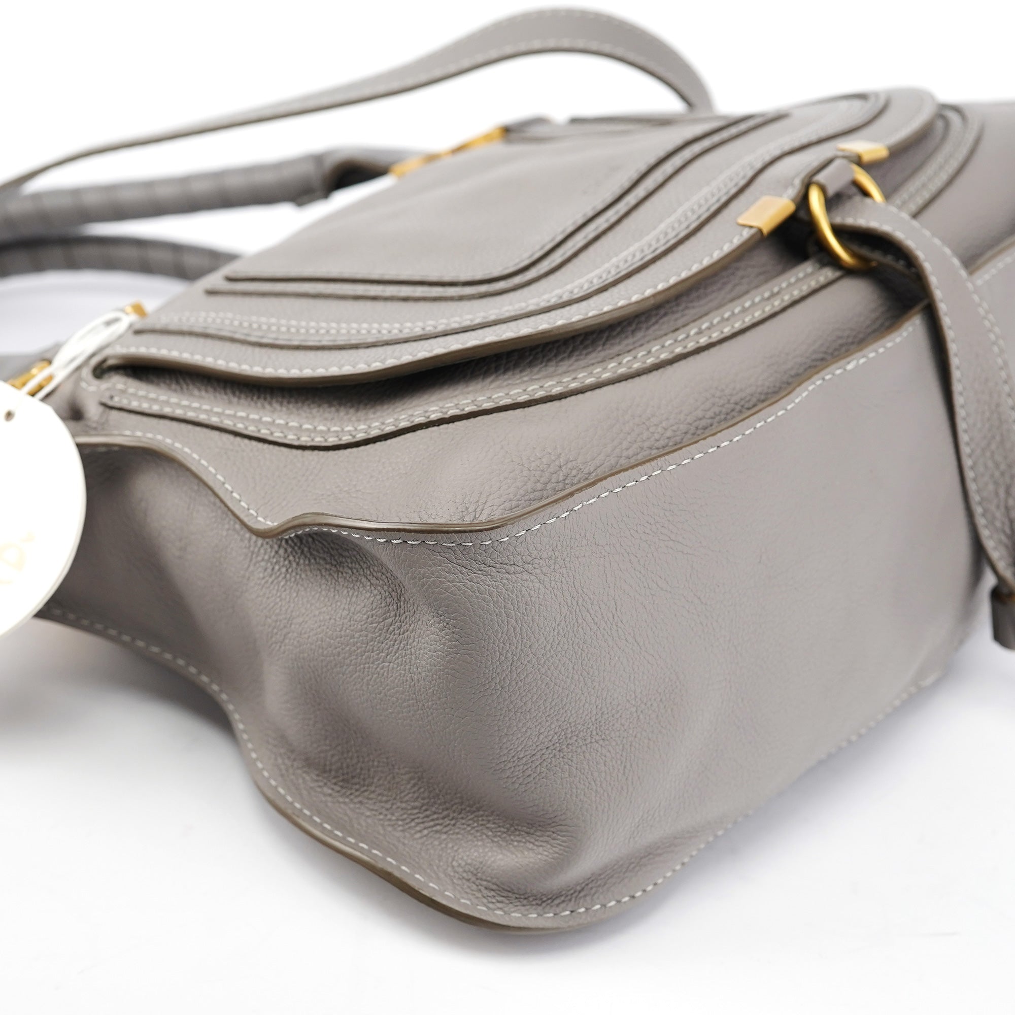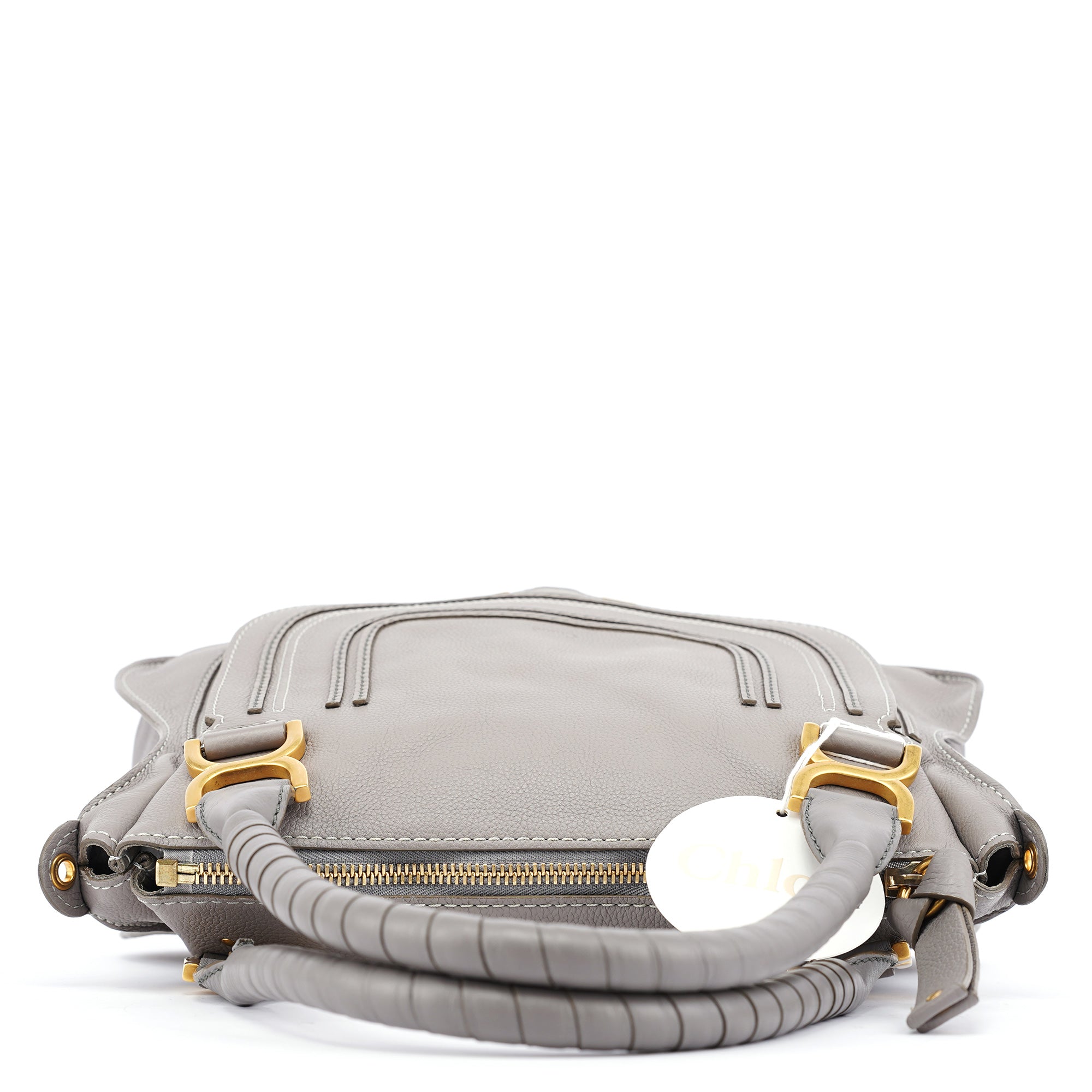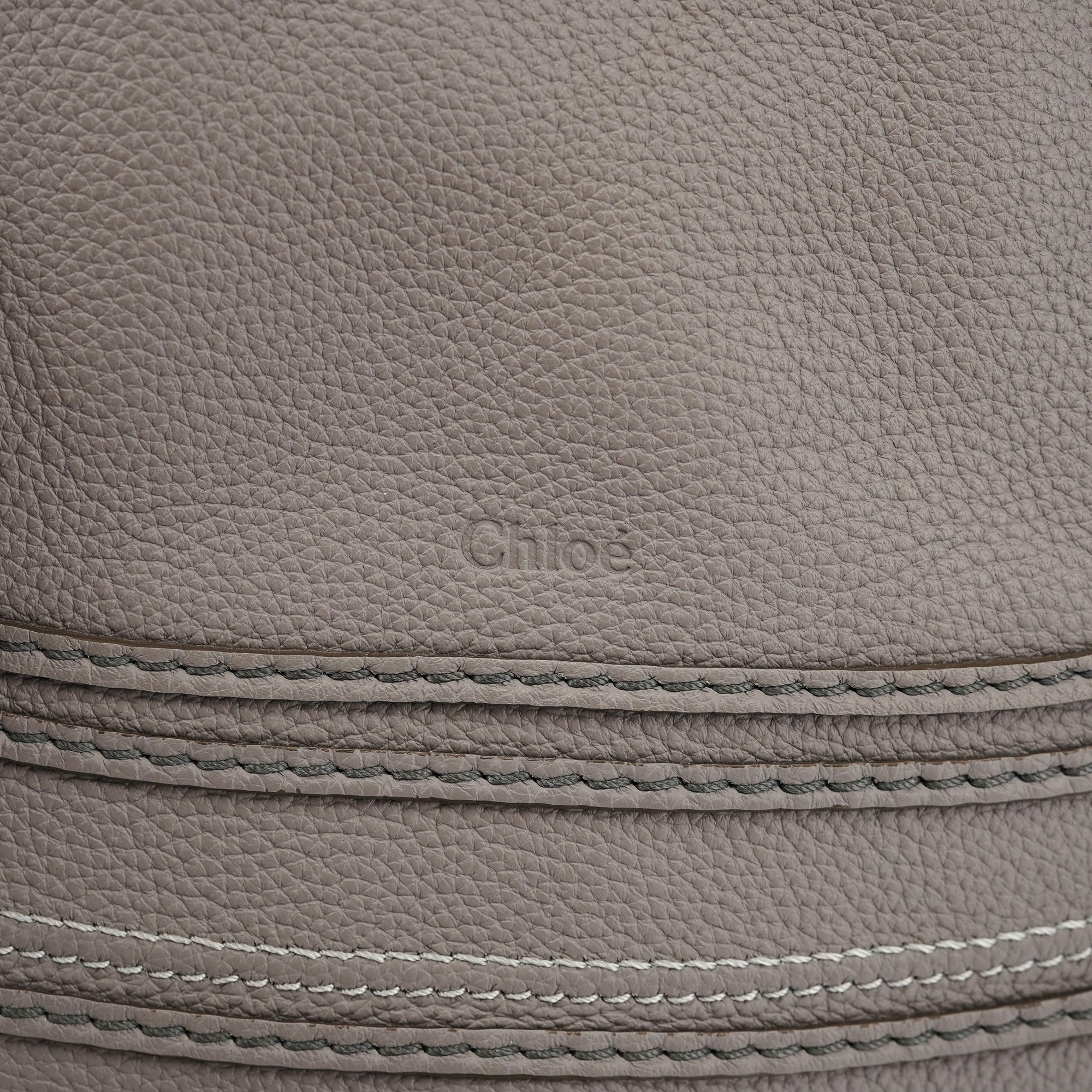 Designed in 2010 by Hannah McGibbon, this vintage Chloé Marcie bag features grey grained calfskin leather with signature topstitching detail. The saddle-shaped silhouette includes dual rolled leather handles with gold-tone hardware, a detachable shoulder strap for versatile carry, and an interior zip pocket. The front features the iconic Marcie ring detail.