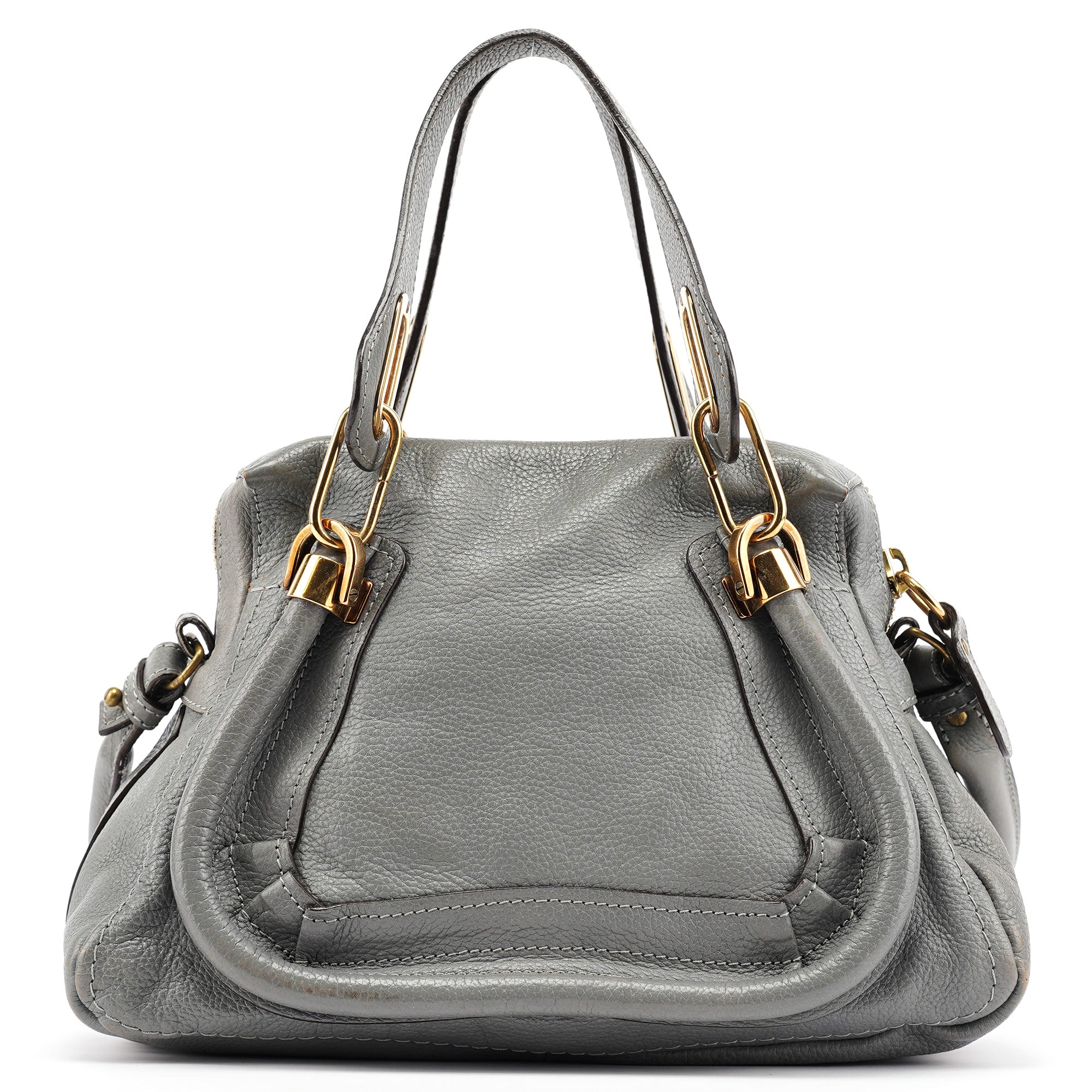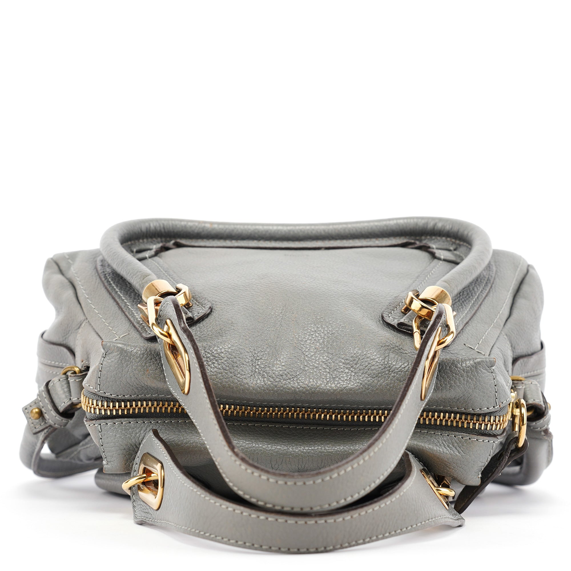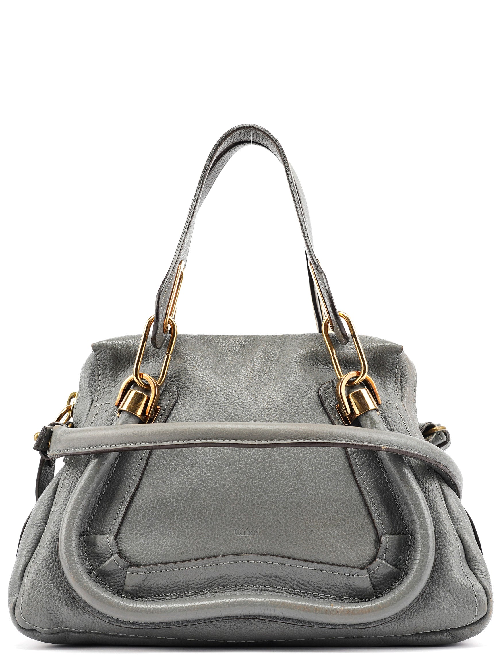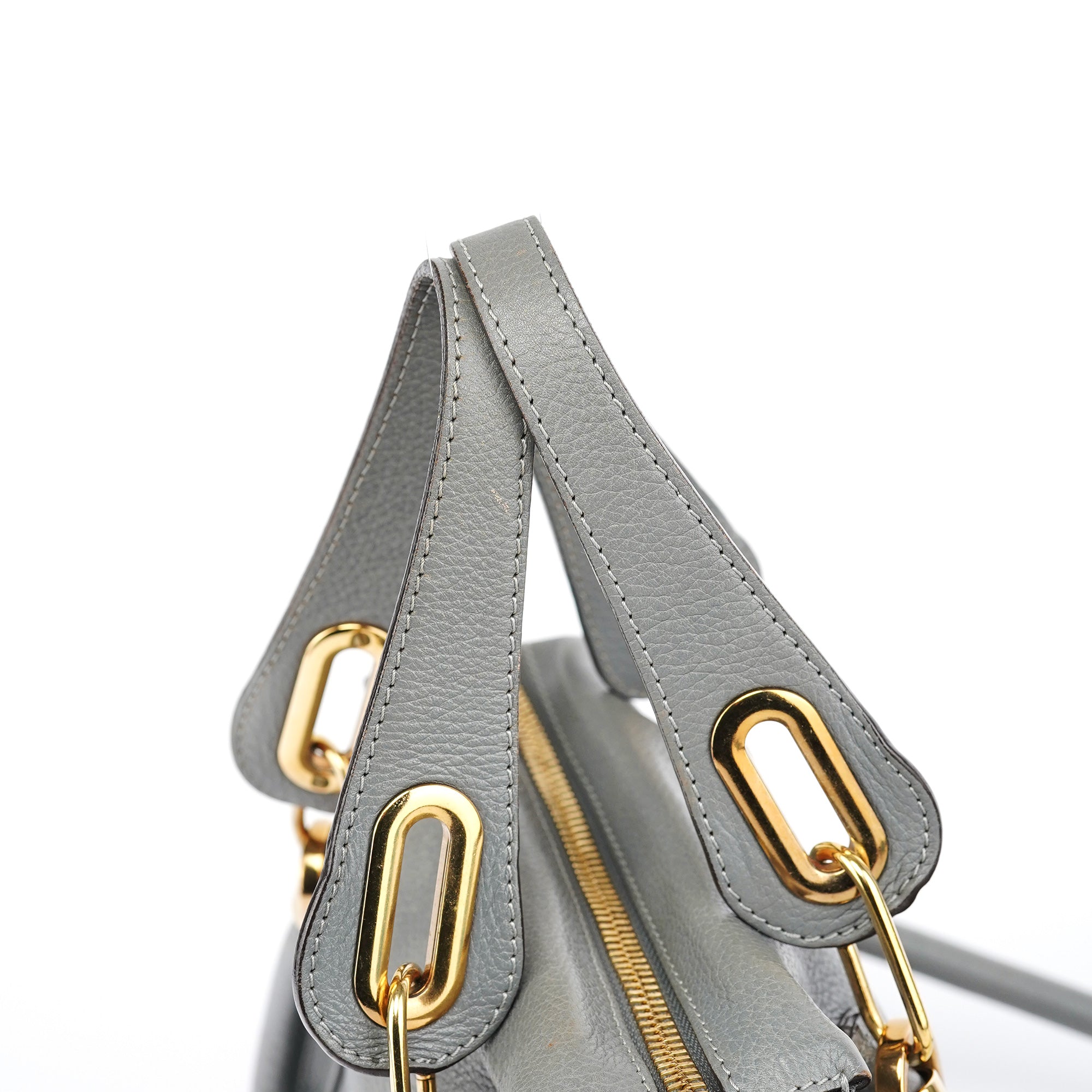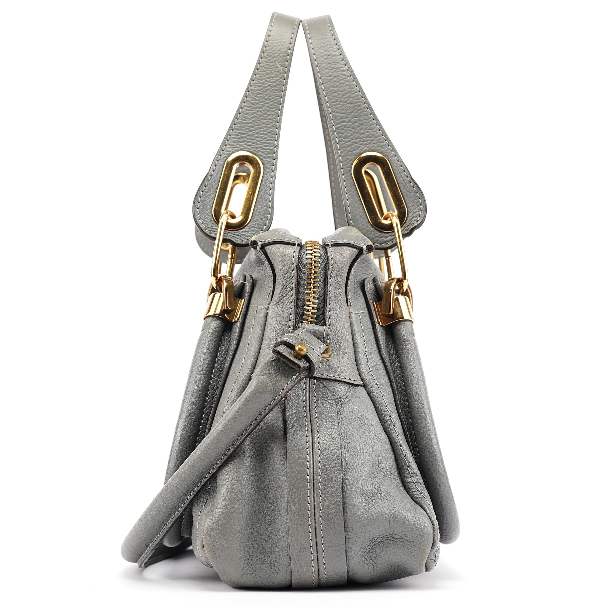 Designed in the late 2000s by Hannah MacGibbon, this vintage Chloé Paraty 2-way bag is crafted from supple grey leather with gold-tone hardware. The structured silhouette features dual rolled handles, a detachable crossbody strap, and signature curved zipper detailing that creates the bag's distinctive rounded corners. MacGibbon's design embodies Chloé's bohemian-luxe aesthetic with refined craftsmanship and versatile functionality.