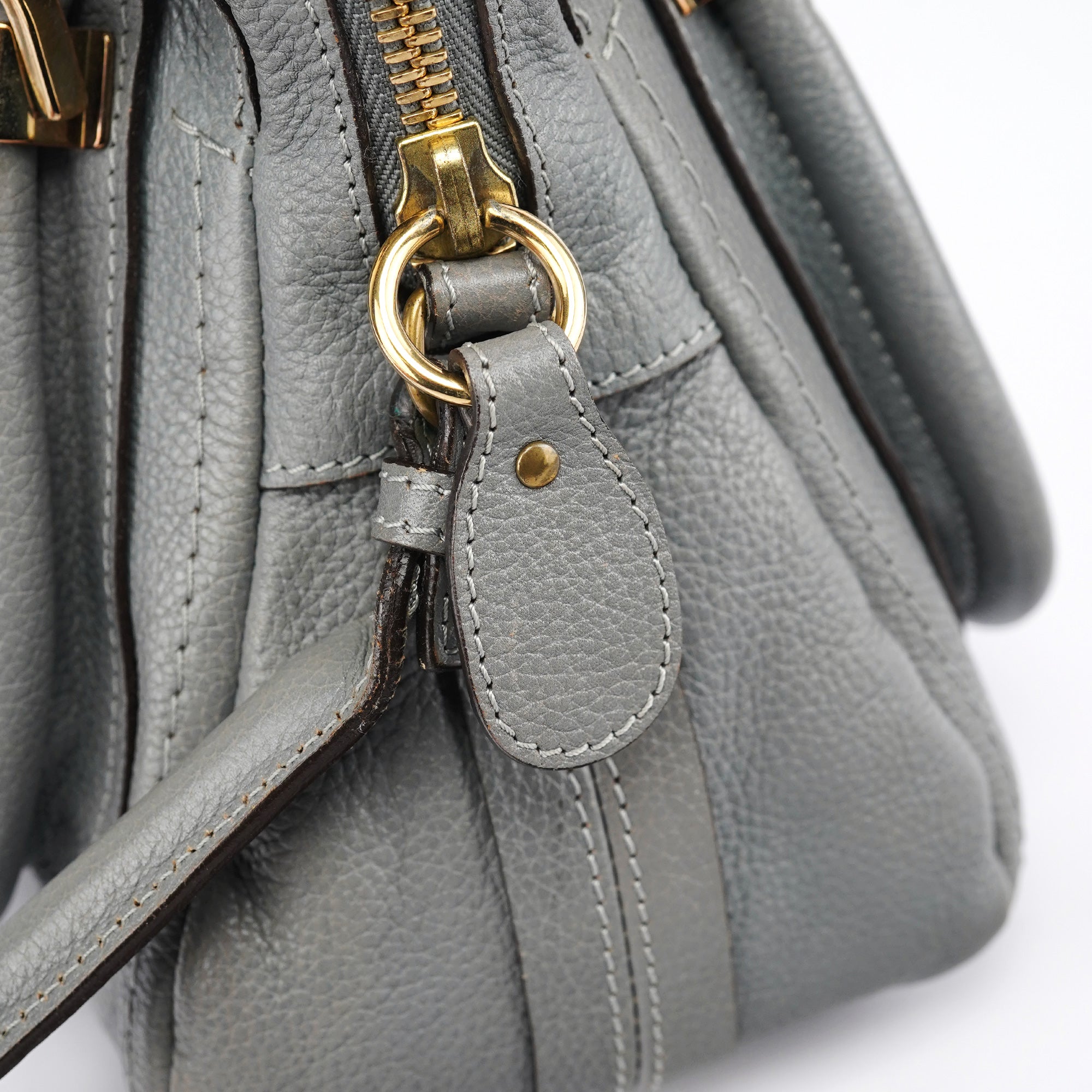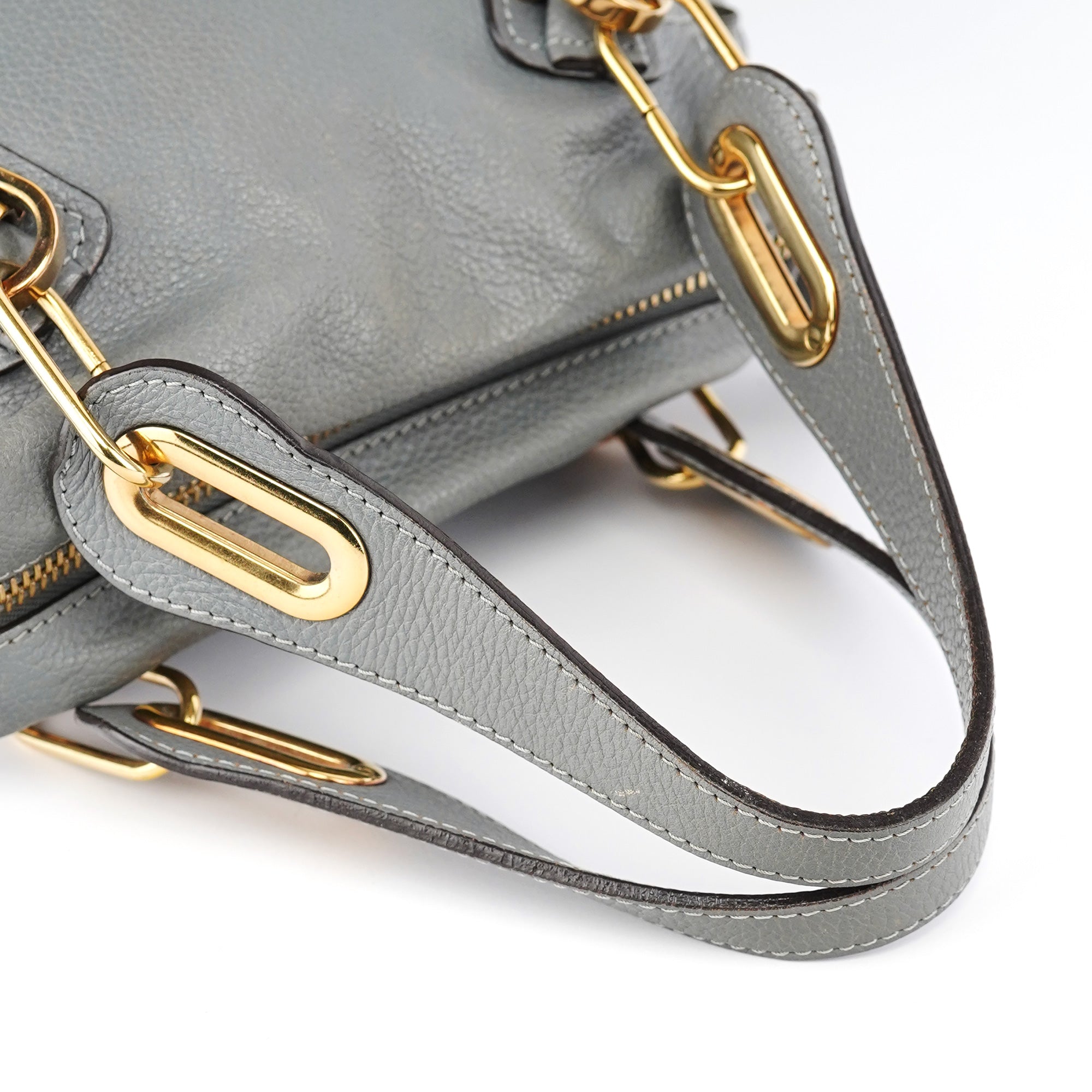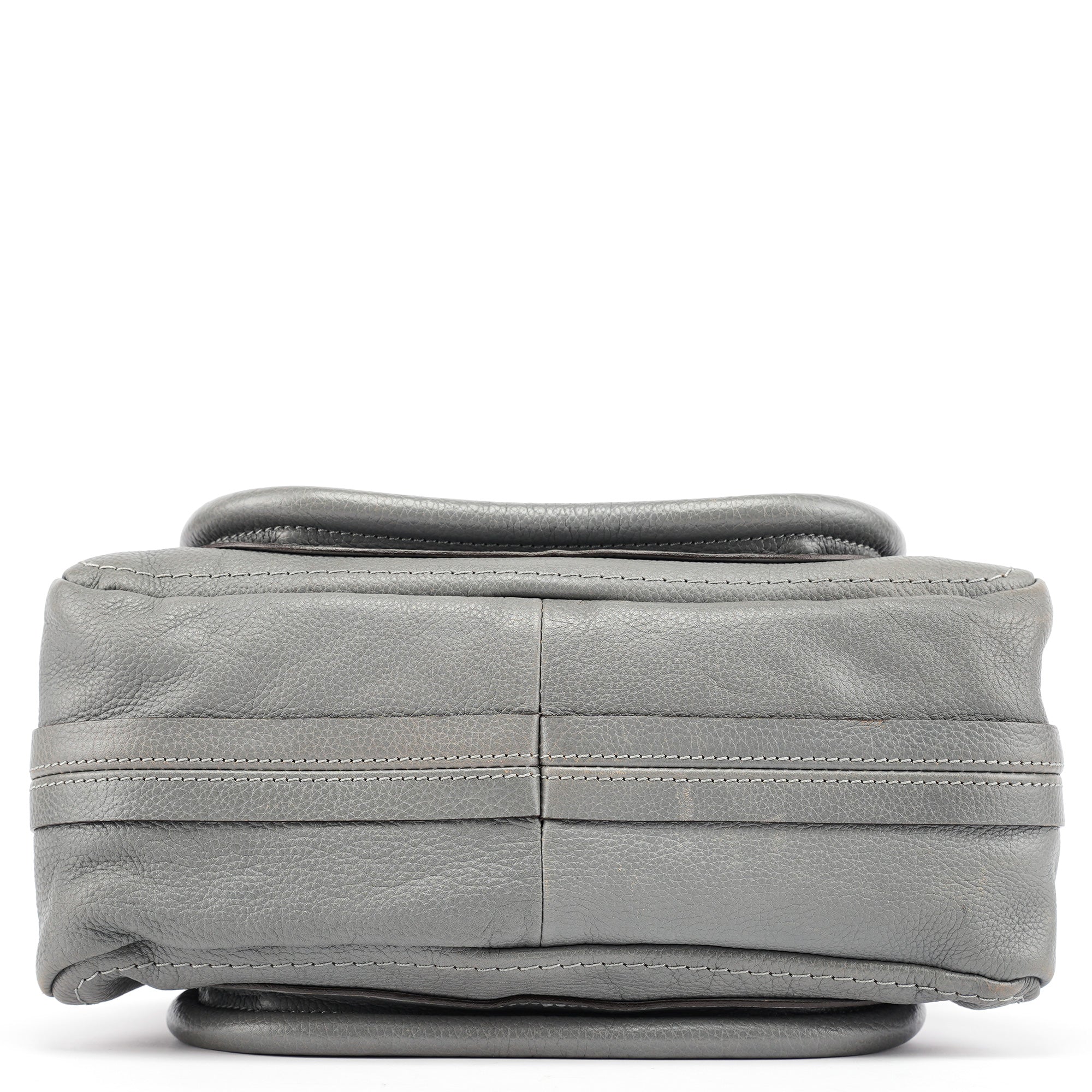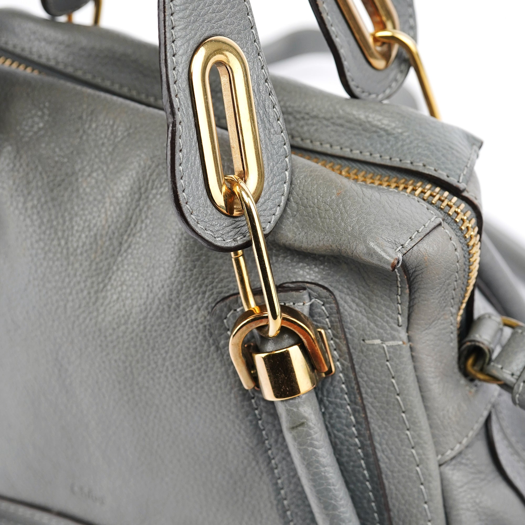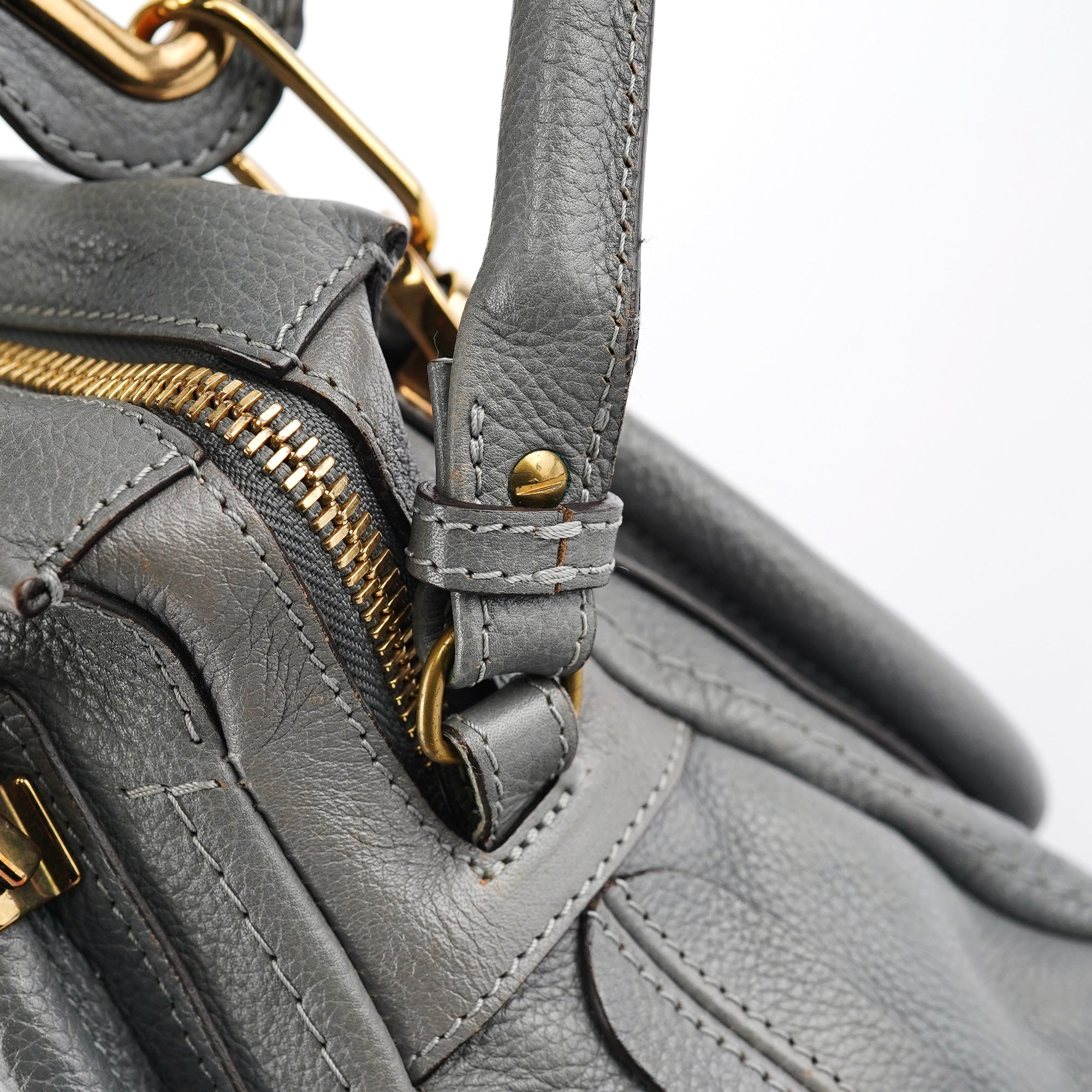 Designed in the late 2000s by Hannah MacGibbon, this vintage Chloé Paraty 2-way bag is crafted from supple grey leather with gold-tone hardware. The structured silhouette features dual rolled handles, a detachable crossbody strap, and signature curved zipper detailing that creates the bag's distinctive rounded corners. MacGibbon's design embodies Chloé's bohemian-luxe aesthetic with refined craftsmanship and versatile functionality.