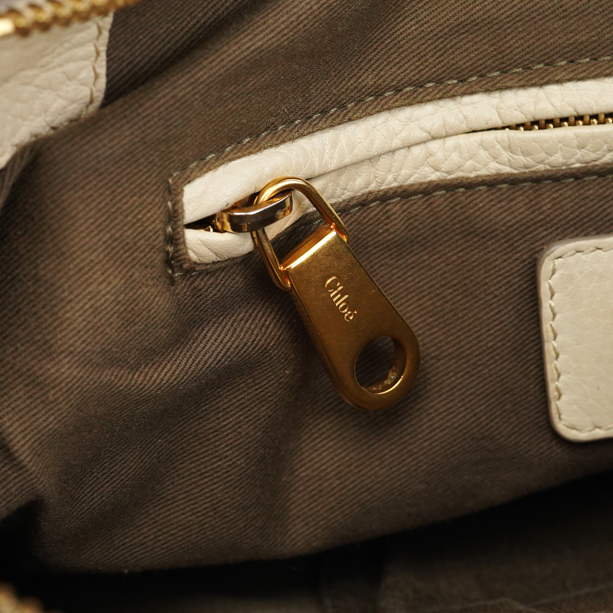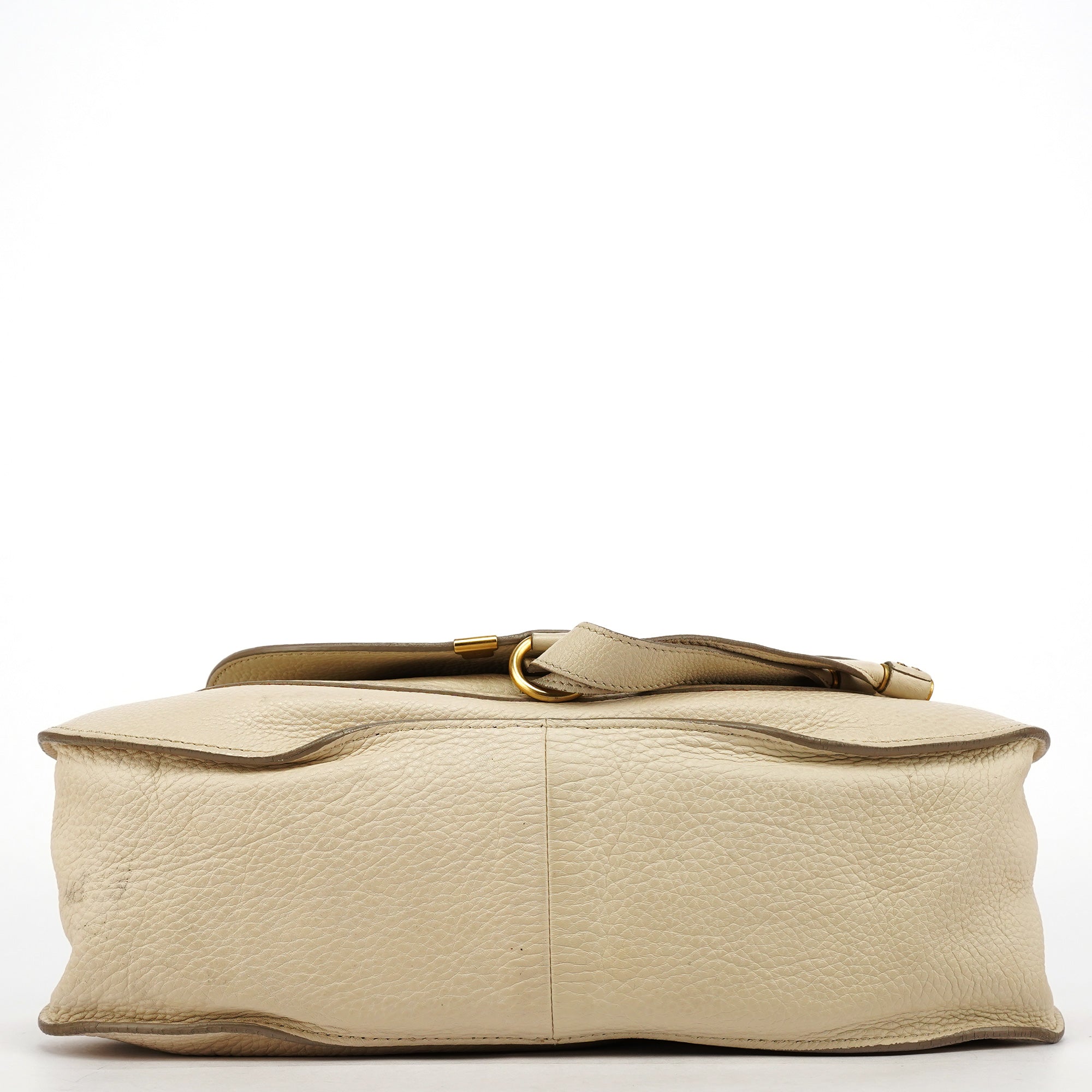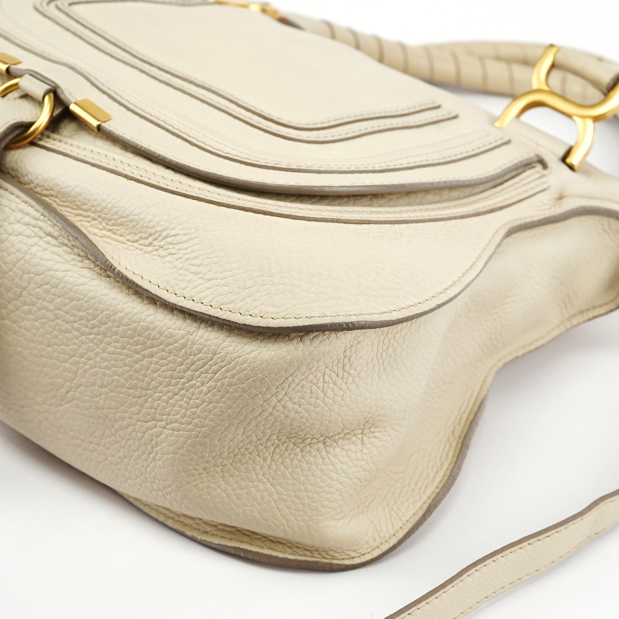 Designed in 2010 by Hannah MacGibbon, this Chloé Marcie shoulder bag is crafted from ivory-toned grained leather in a slouchy silhouette. It features decorative layered stitching details and signature wrapped leather top handles. The bag includes a detachable long strap, polished gold-tone hardware, and a single fabric-lined interior compartment with zipper pocket.