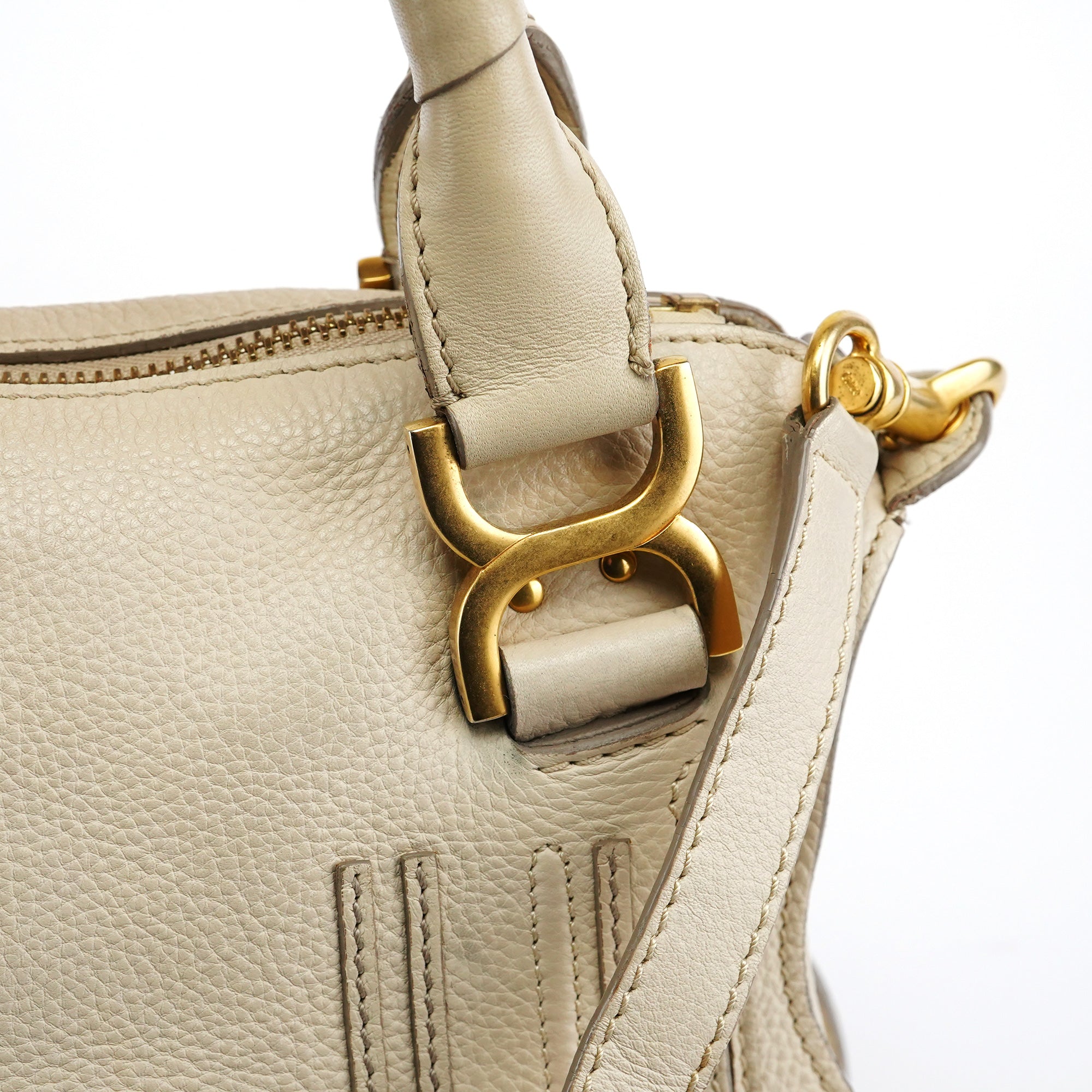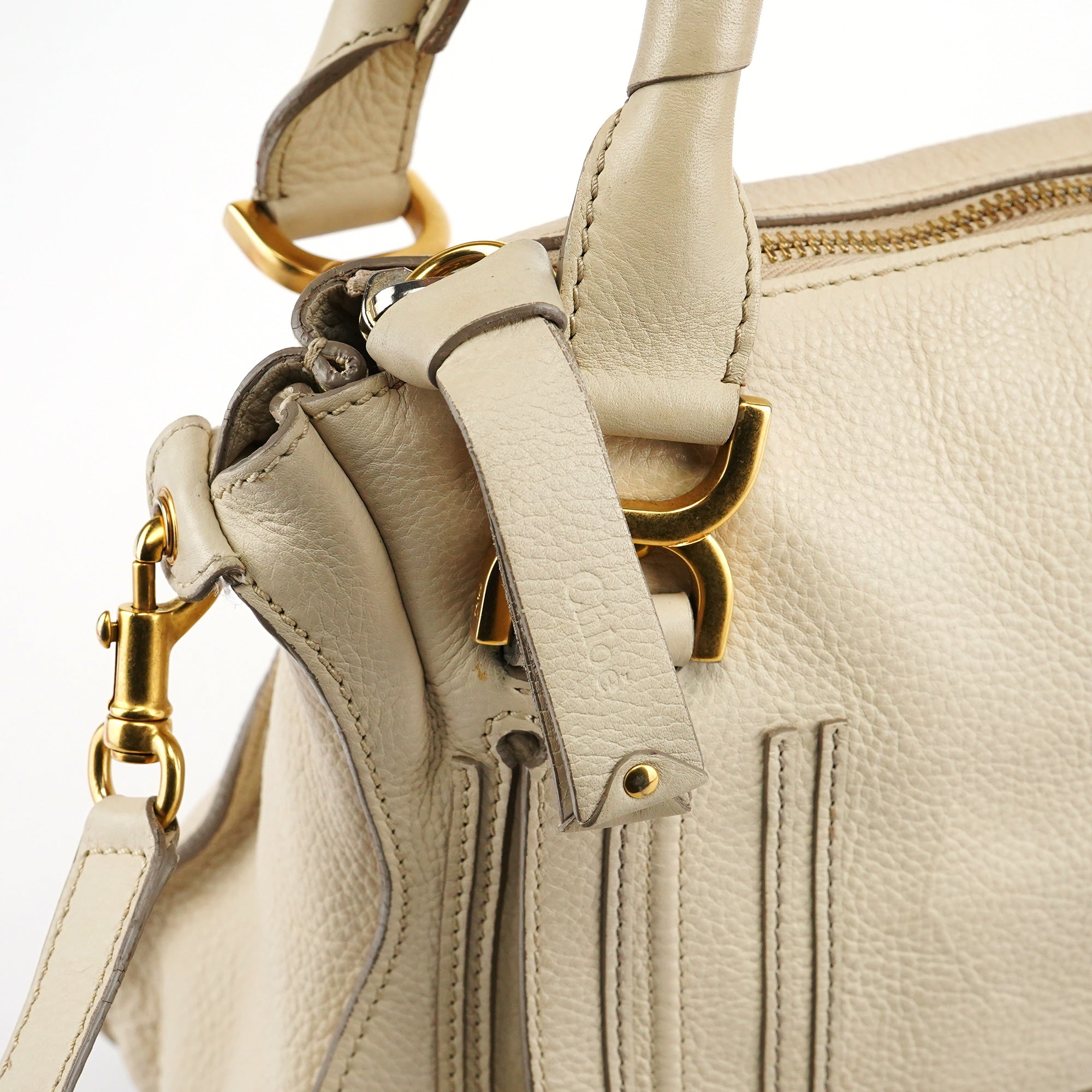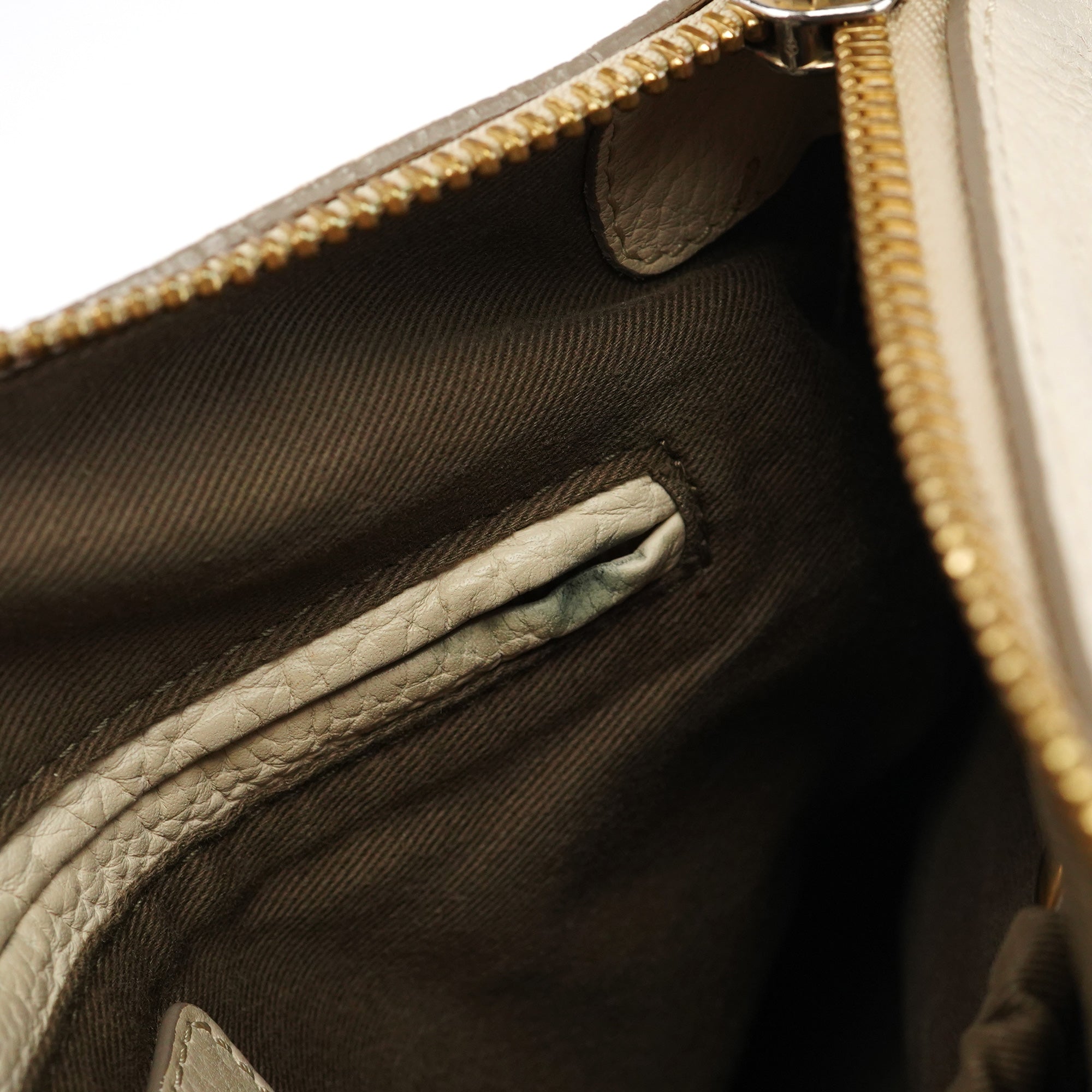 Designed in 2010 by Hannah MacGibbon, this Chloé Marcie shoulder bag is crafted from ivory-toned grained leather in a slouchy silhouette. It features decorative layered stitching details and signature wrapped leather top handles. The bag includes a detachable long strap, polished gold-tone hardware, and a single fabric-lined interior compartment with zipper pocket.