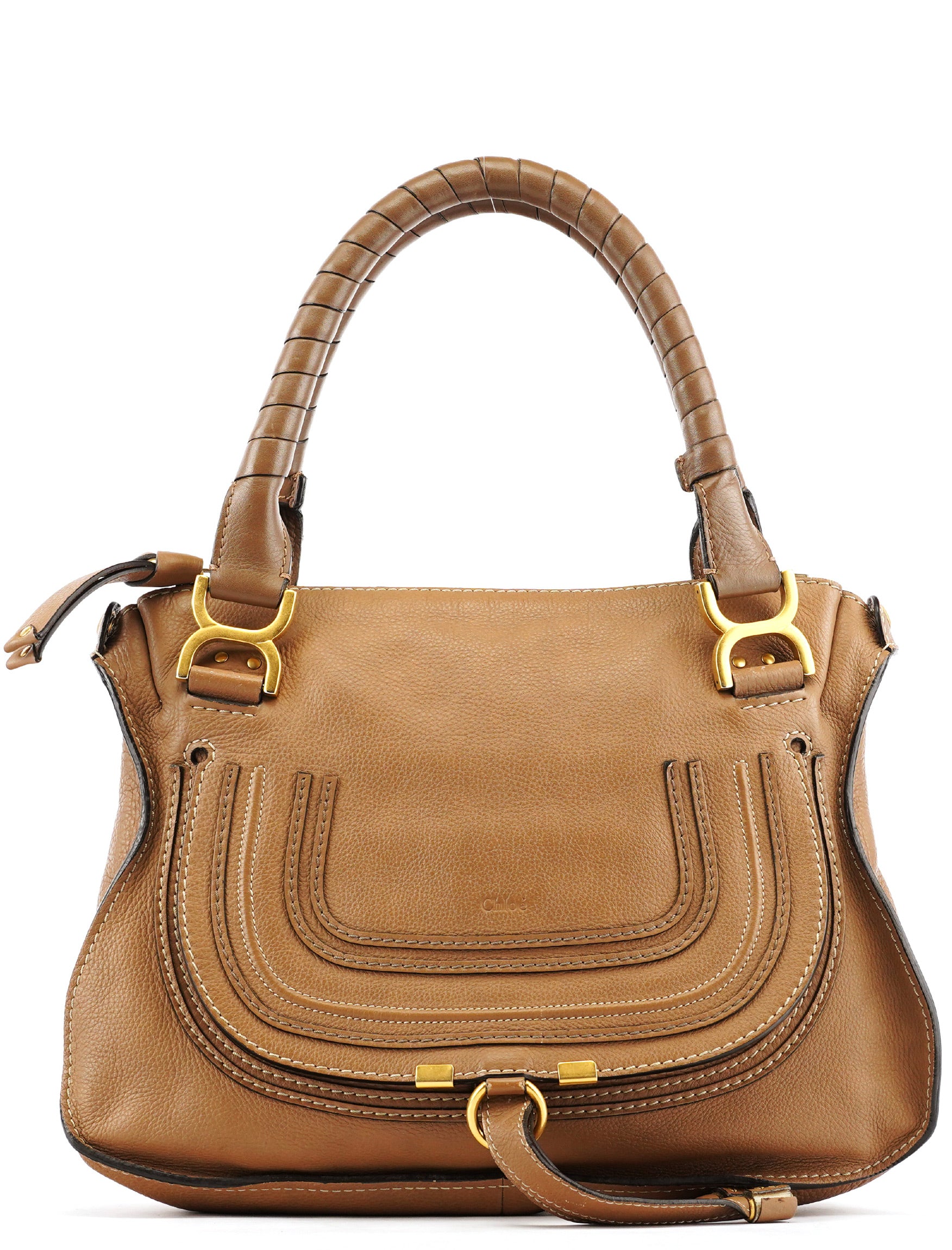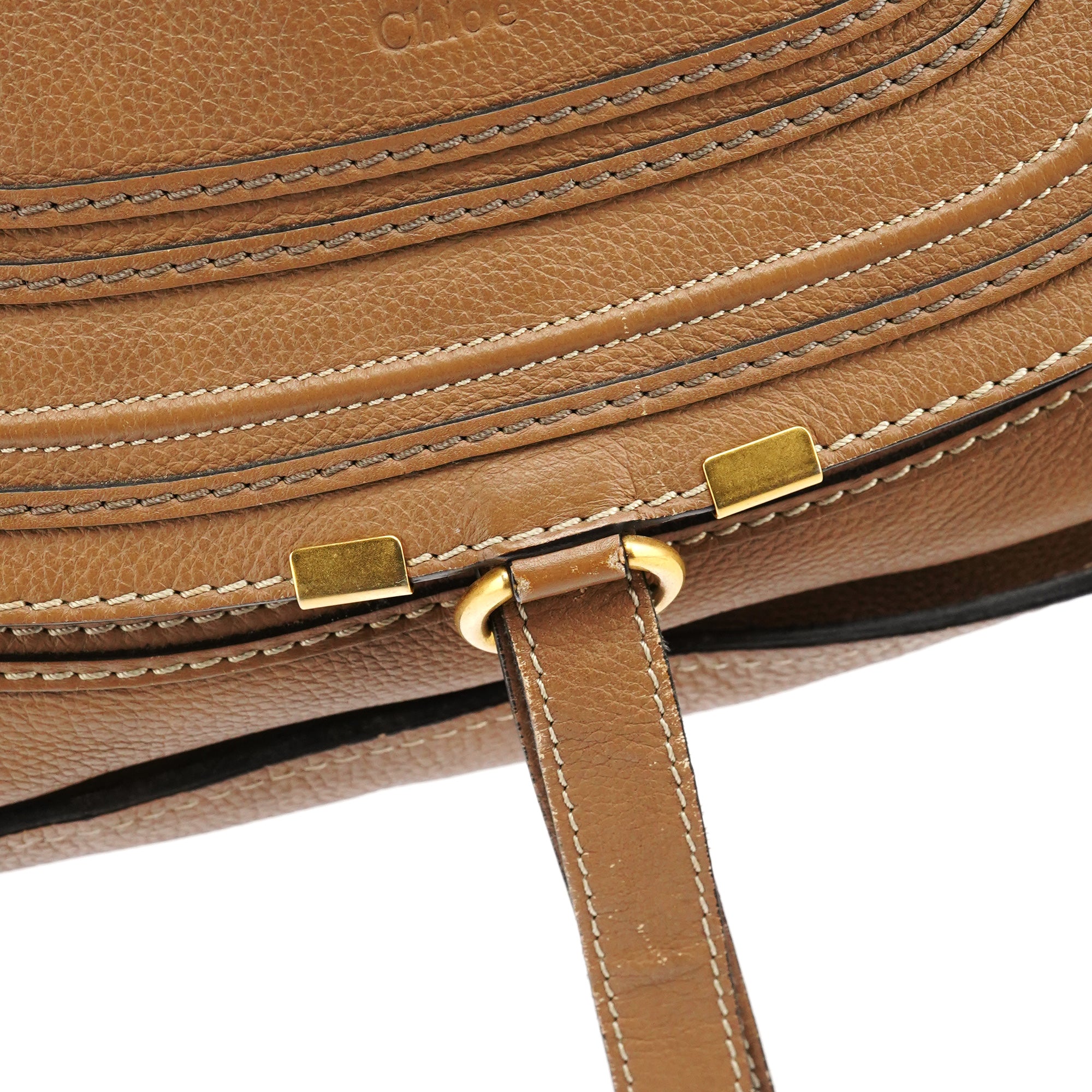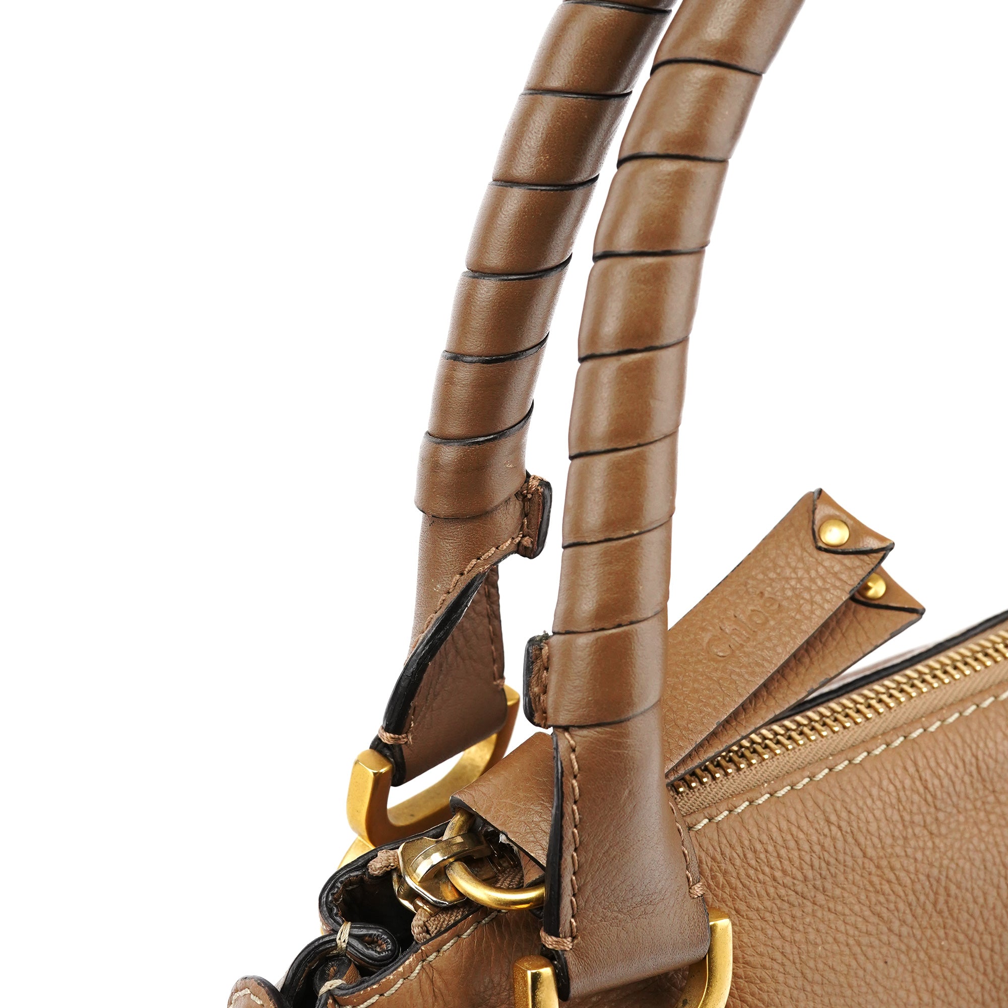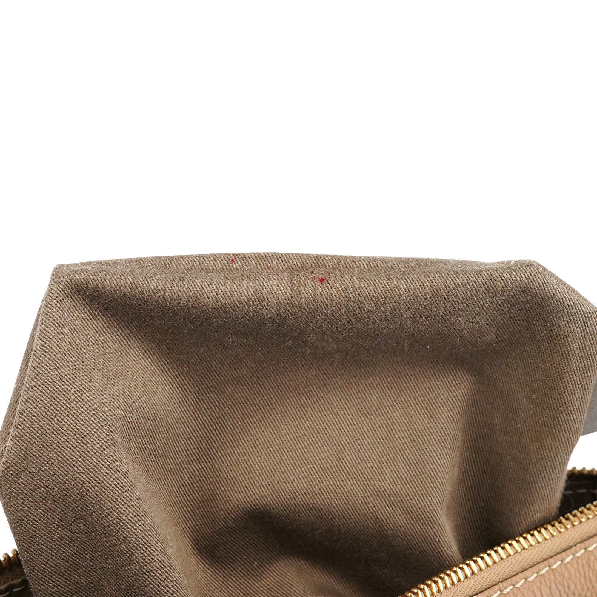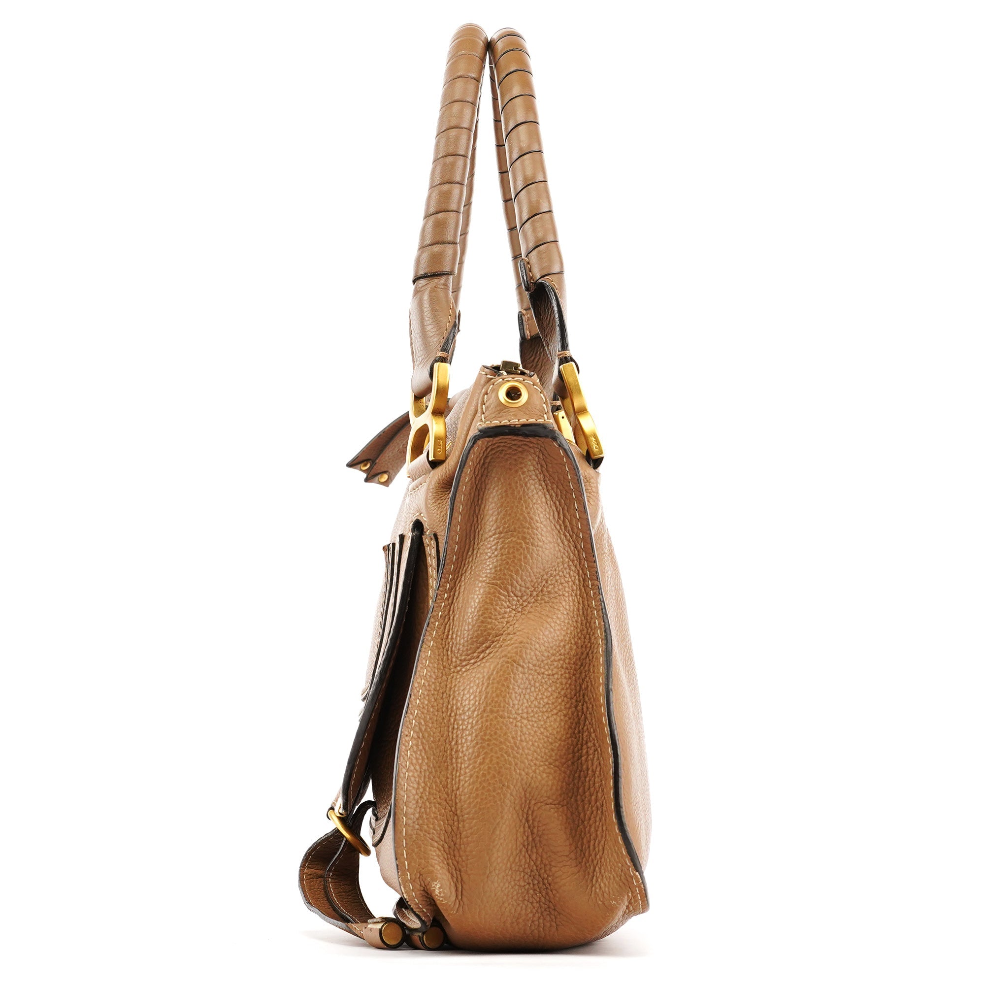 Designed in the 2010s by Hannah MacGibbon, this Chloé Marcie bag is crafted in light brown grained leather and detailed with signature stitched saddle paneling and brushed gold-tone hardware. Features include braided top handles, a front flap pocket with tassel accent, and a spacious zippered interior lined in tonal canvas.