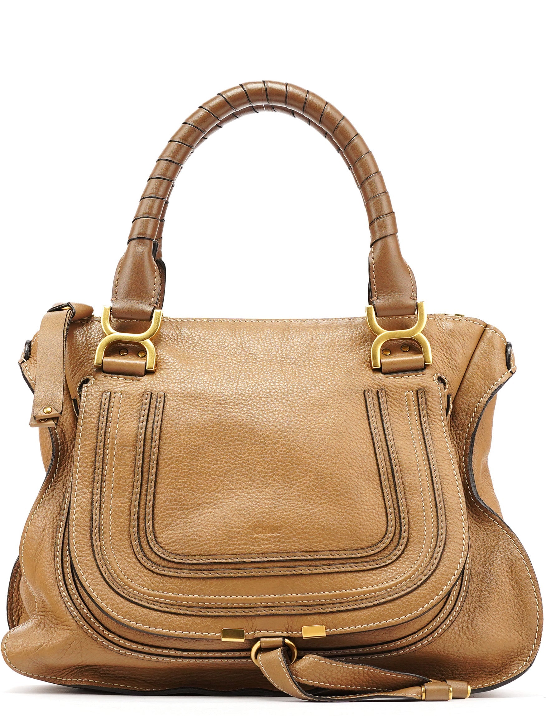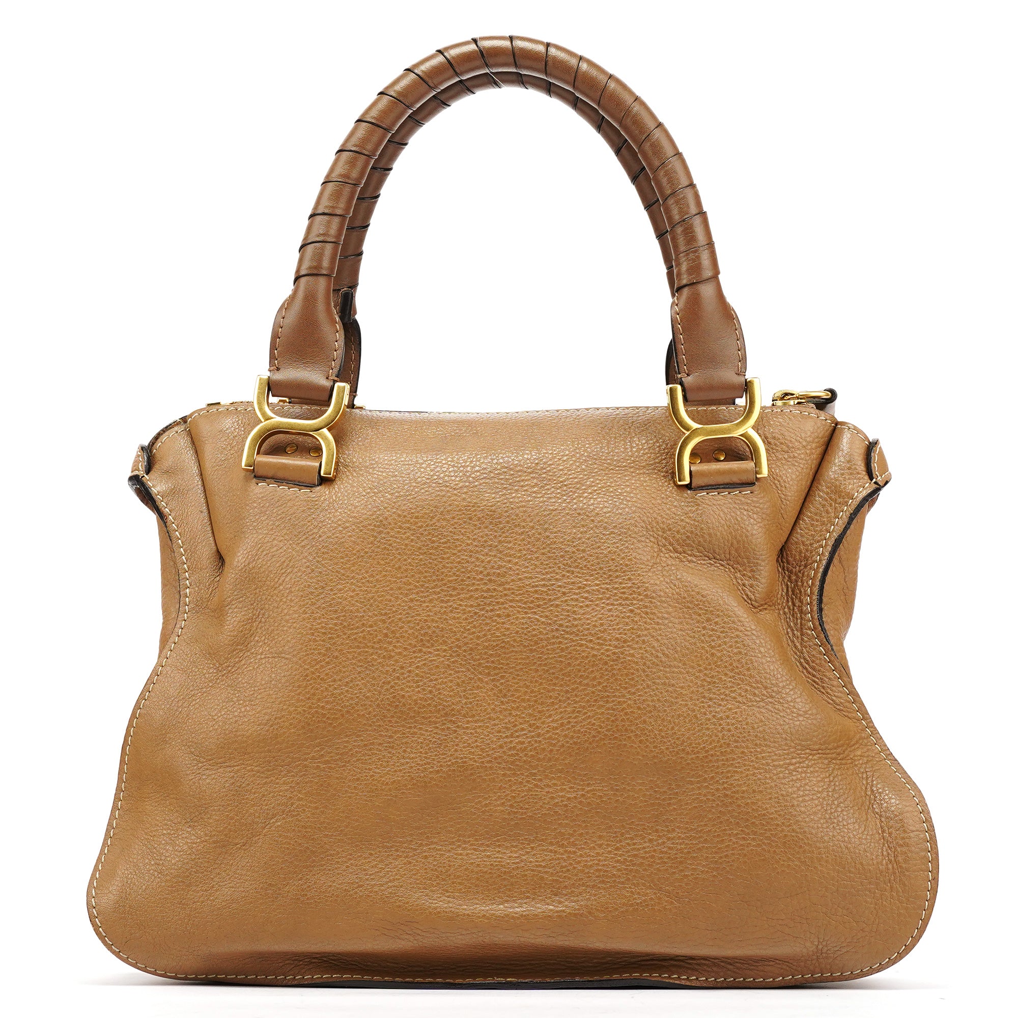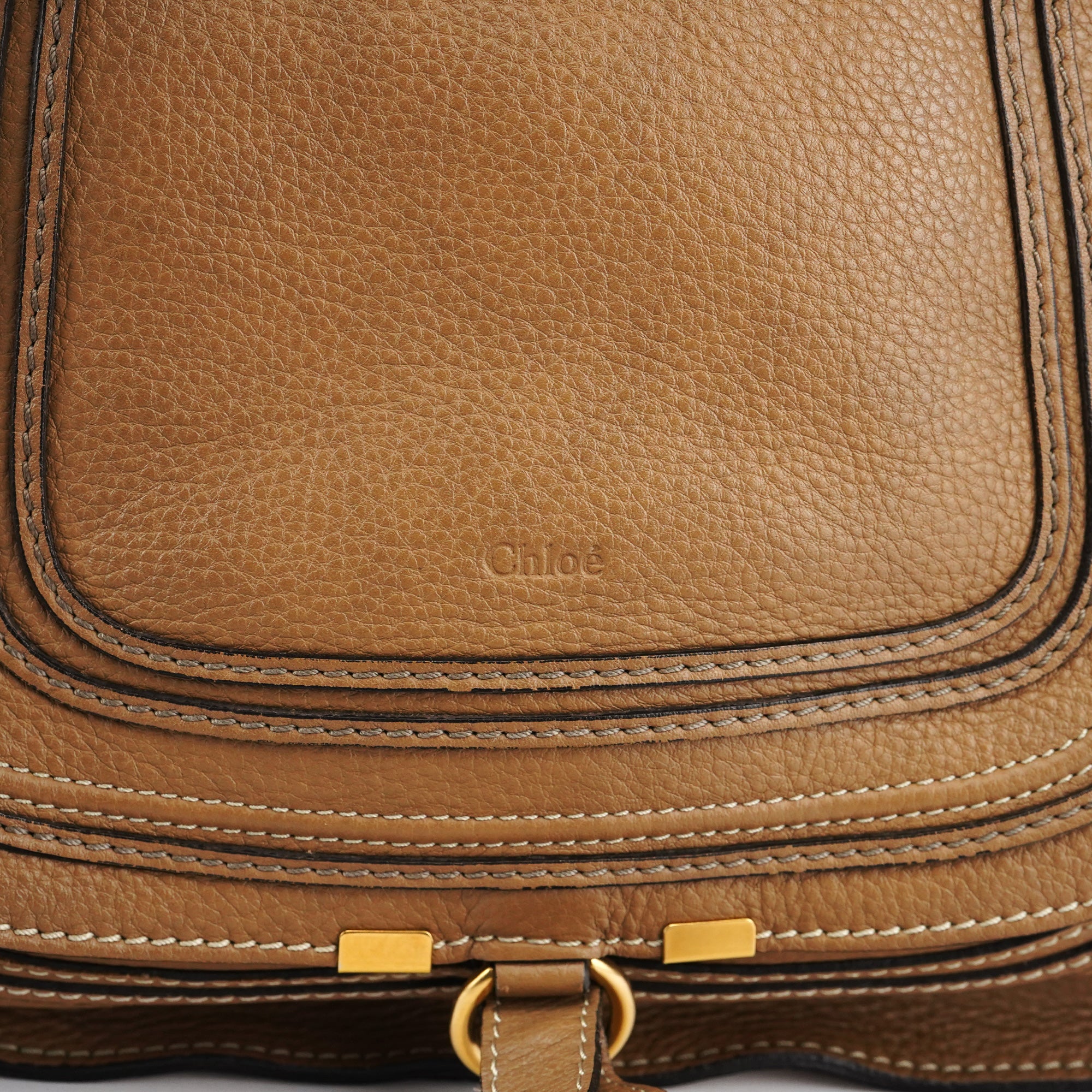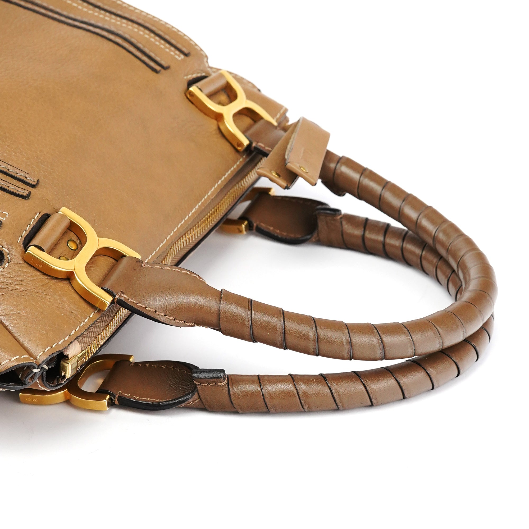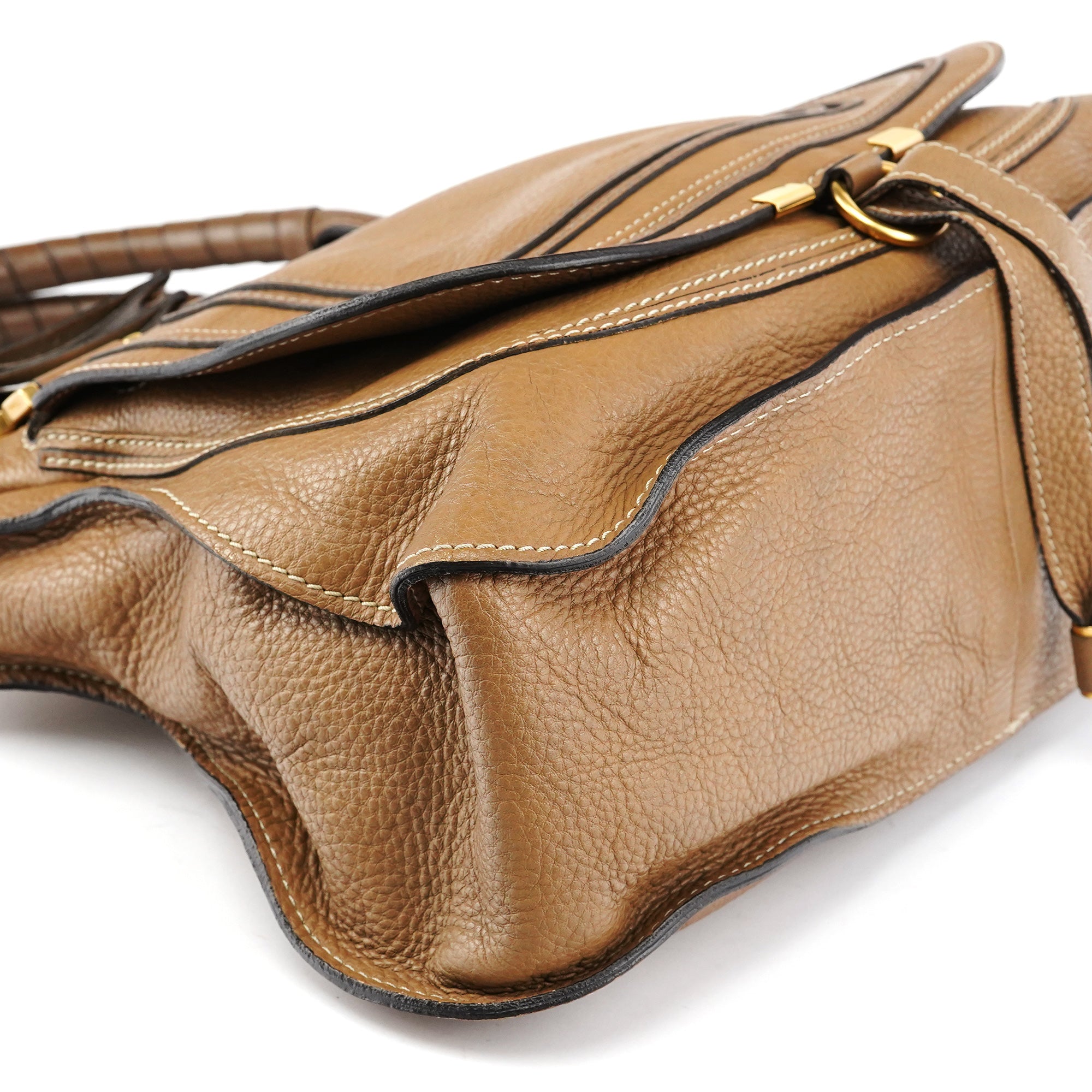 Designed in the 2010s by Hannah MacGibbon, this Chloé Marcie bag is crafted in light brown grained leather and detailed with signature stitched saddle paneling and brushed gold-tone hardware. Features include braided top handles, a front flap pocket with tassel accent, and a spacious zippered interior lined in tonal canvas.