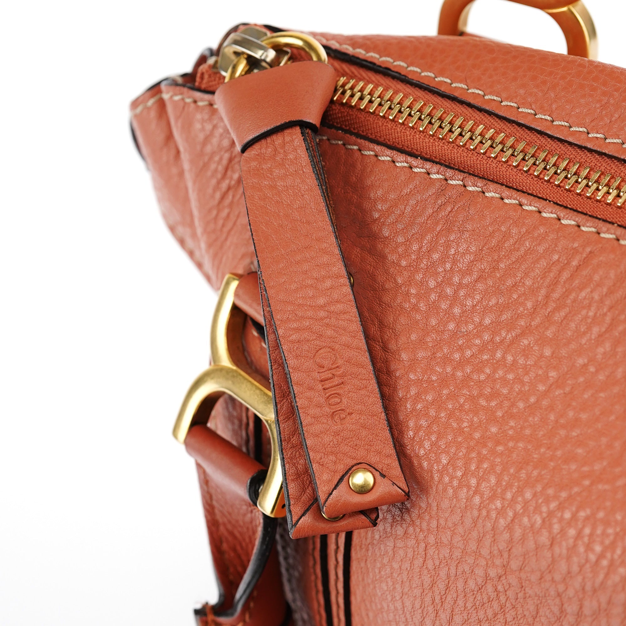 Designed in 2010 by Hannah MacGibbon, this Chloé Marcie large satchel is crafted from grained pale orange calfskin with hand-wrapped leather top handles and contrast white stitching. The front features the Marcie line’s iconic curved flap with layered saddle stitching and knotted leather tassel. Finished with a zip closure and antique brass hardware. Interior lined in brown cotton canvas with zip pocket.