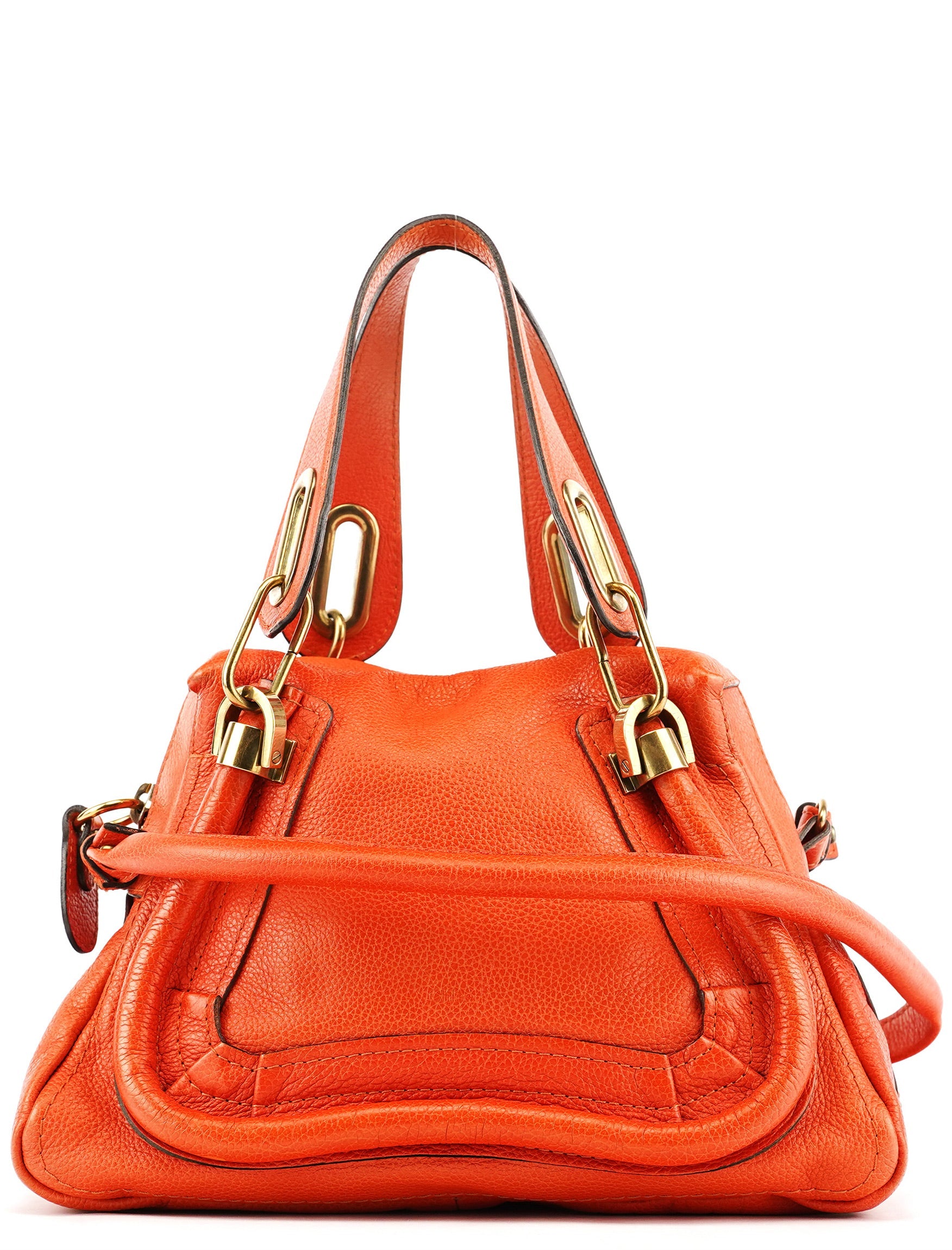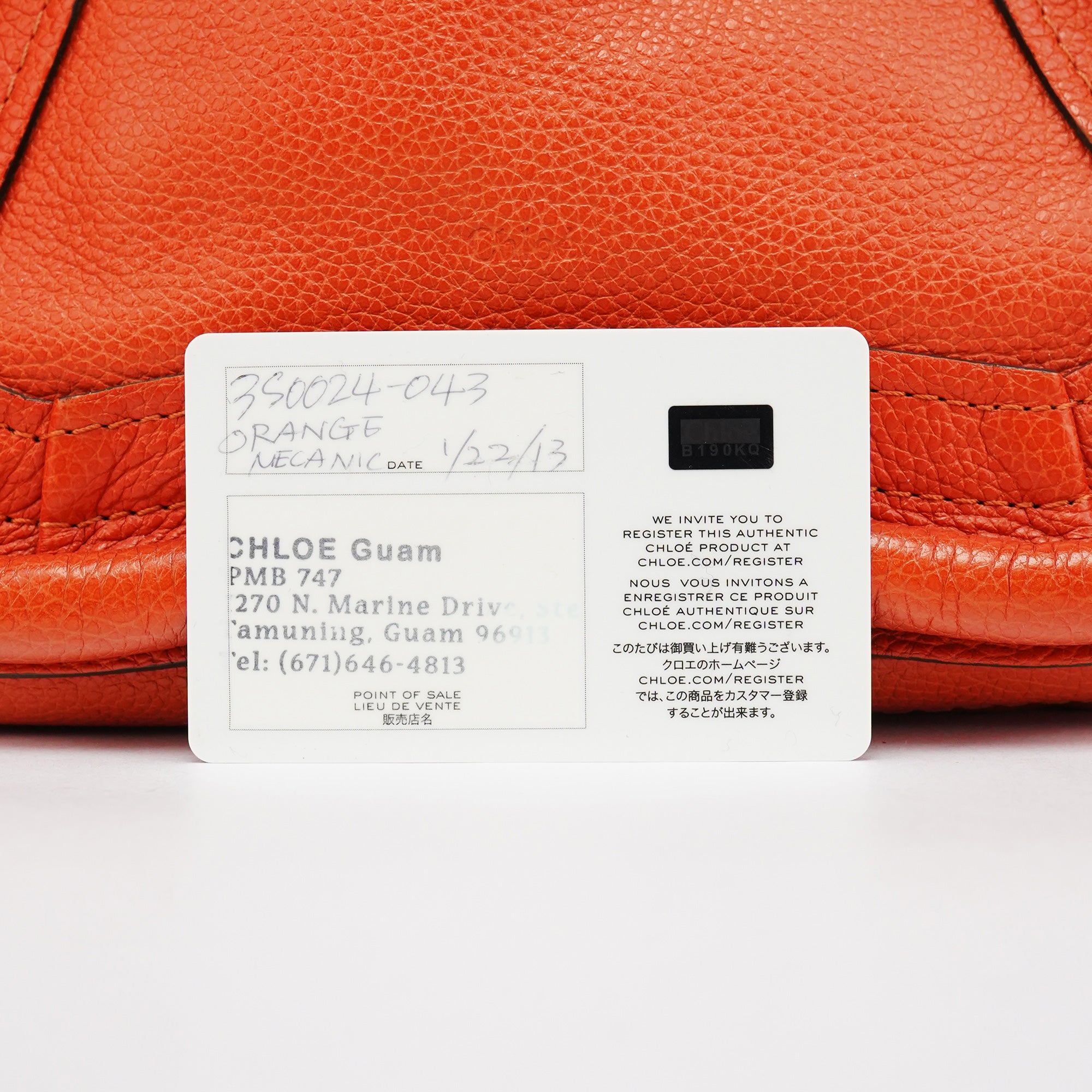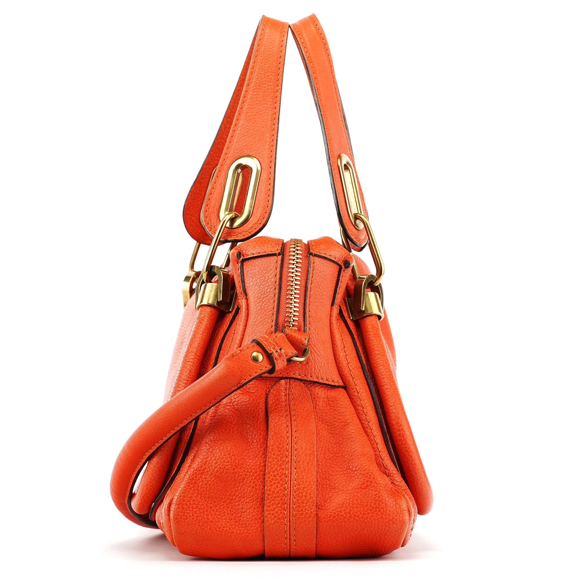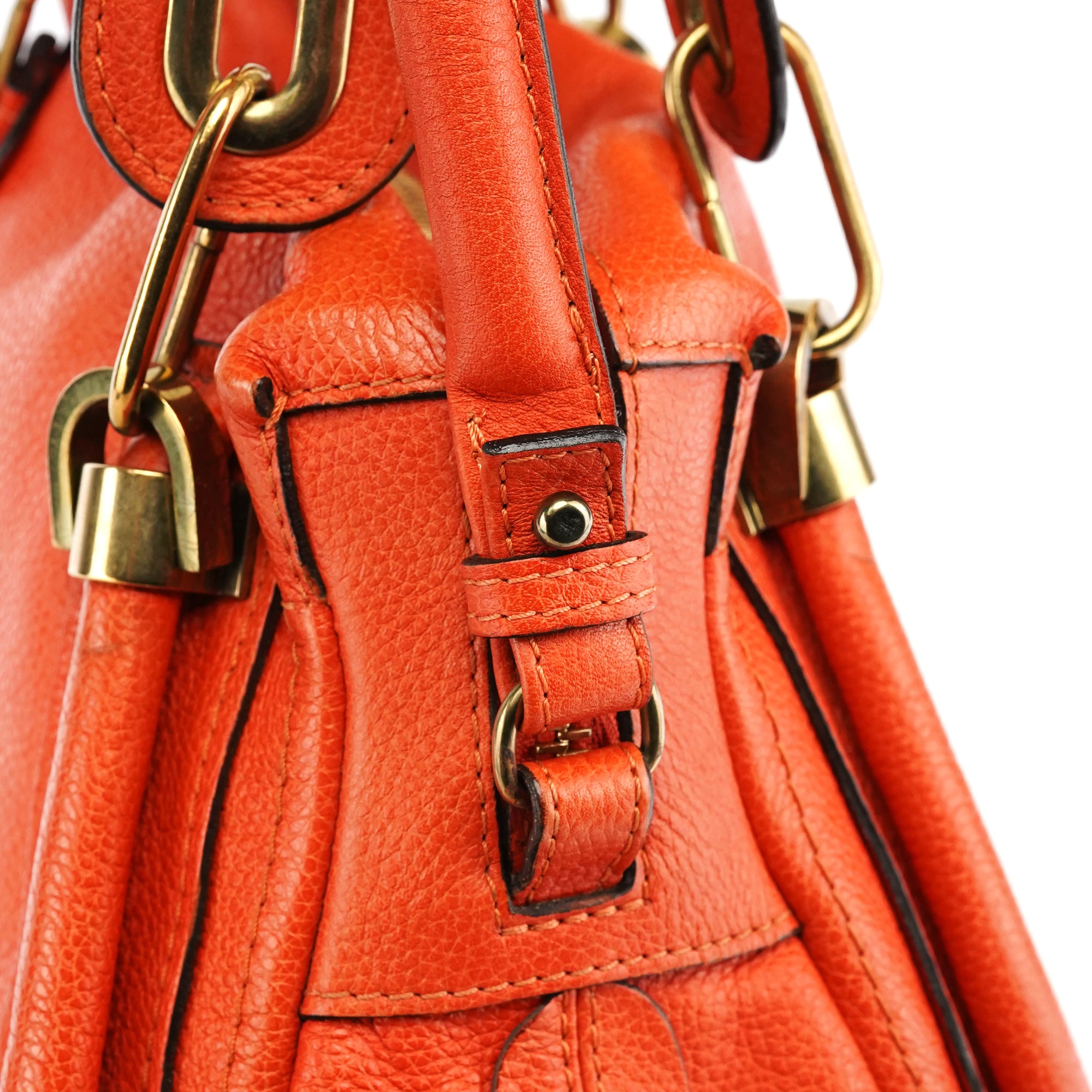 Designed in 2008 by Hannah MacGibbon, this Chloé Paraty bag is crafted from orange grained leather with tubular handles, leather-wrapped frame detailing and gold-tone hardware. The zip-top opens to a canvas interior with pockets.