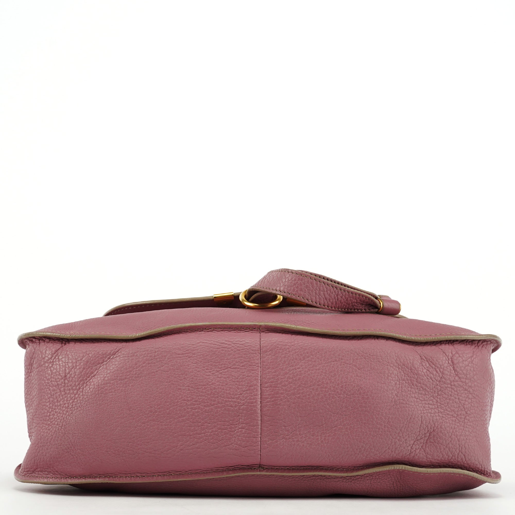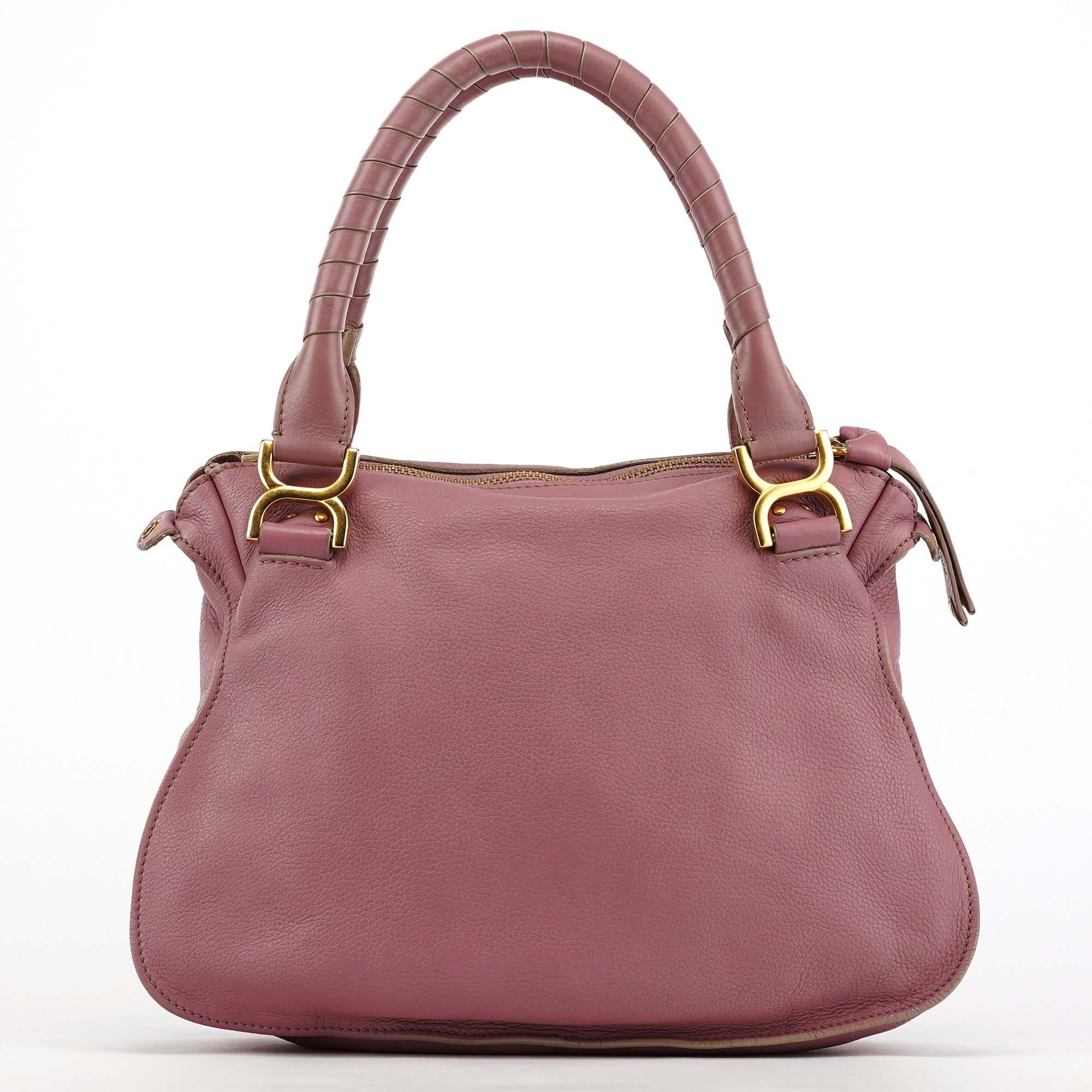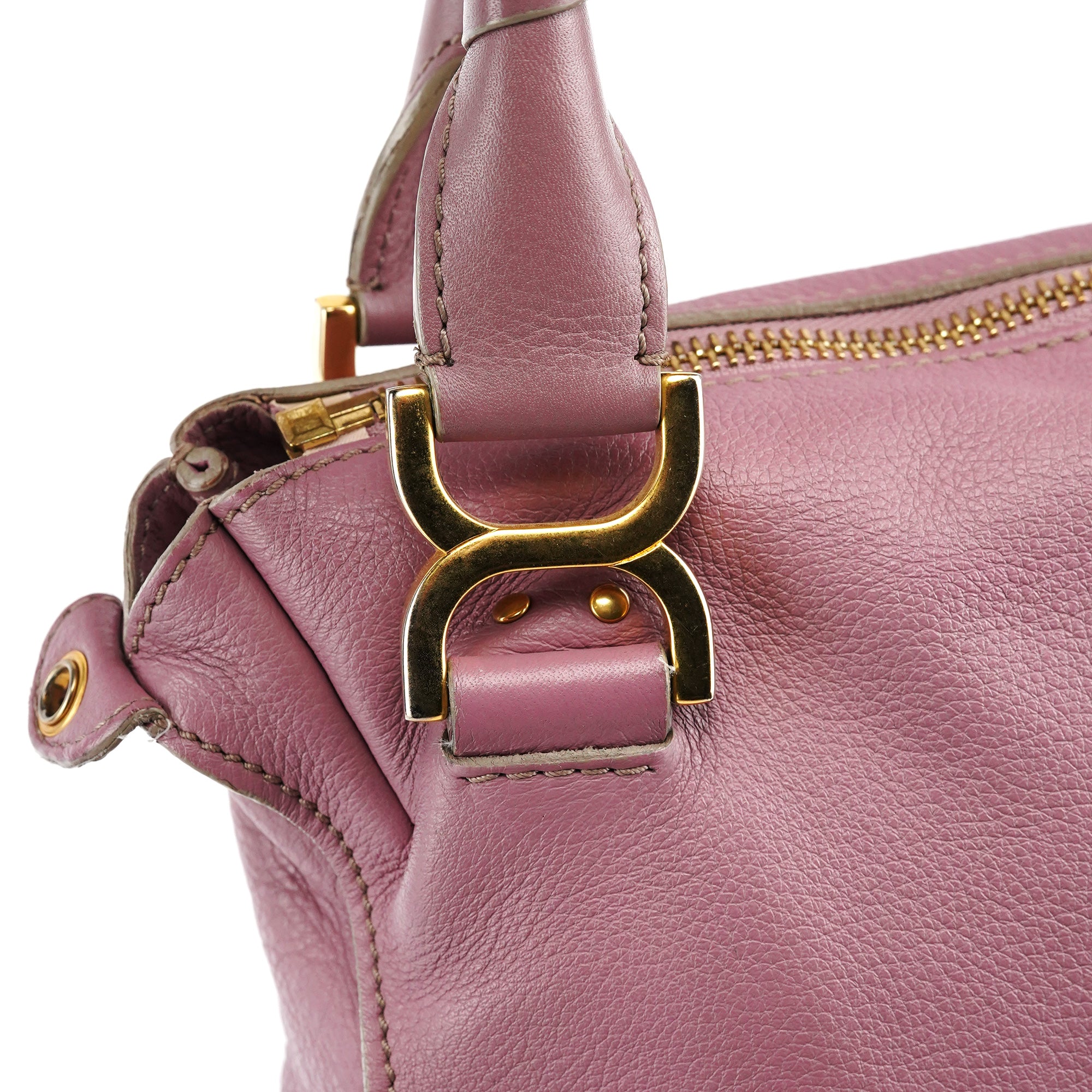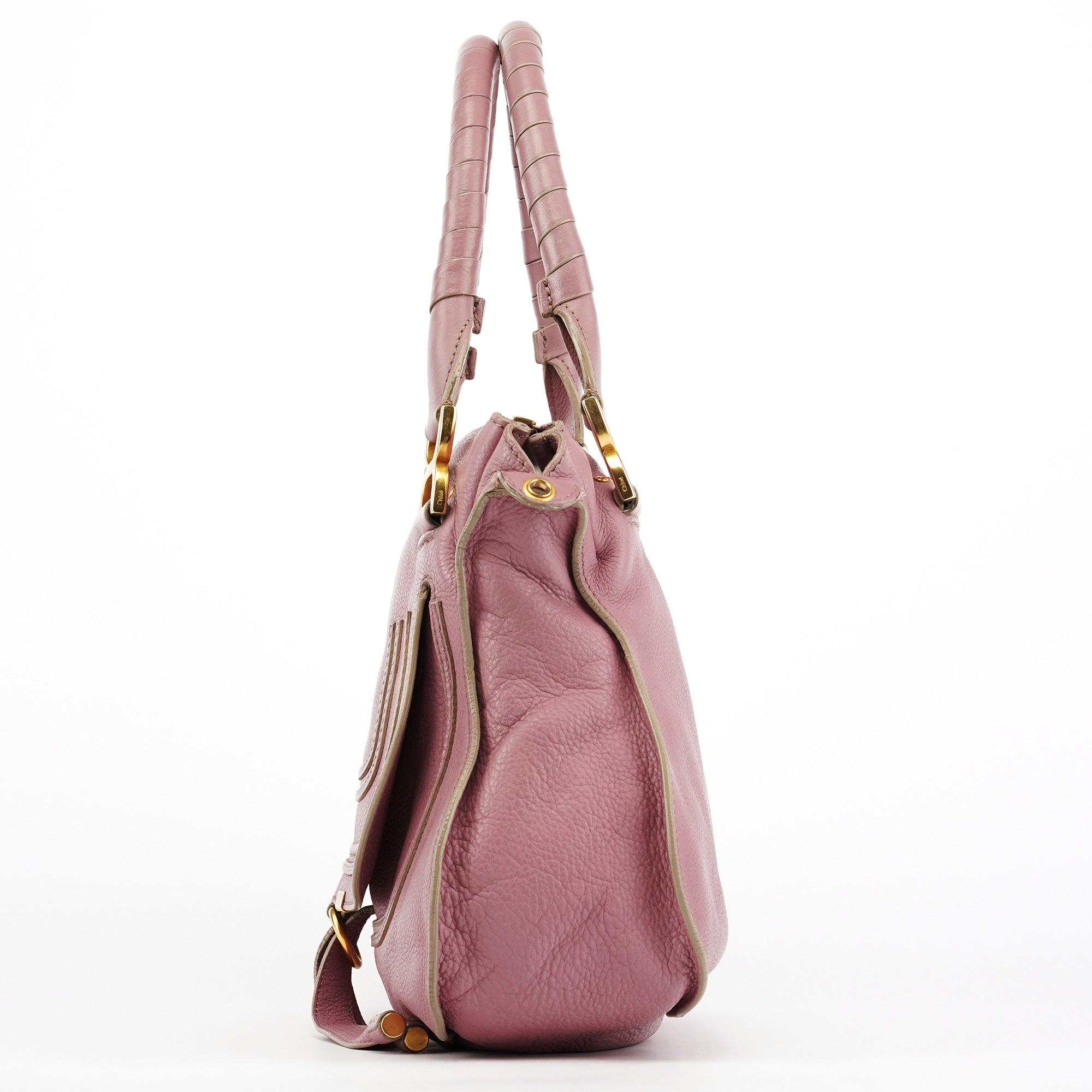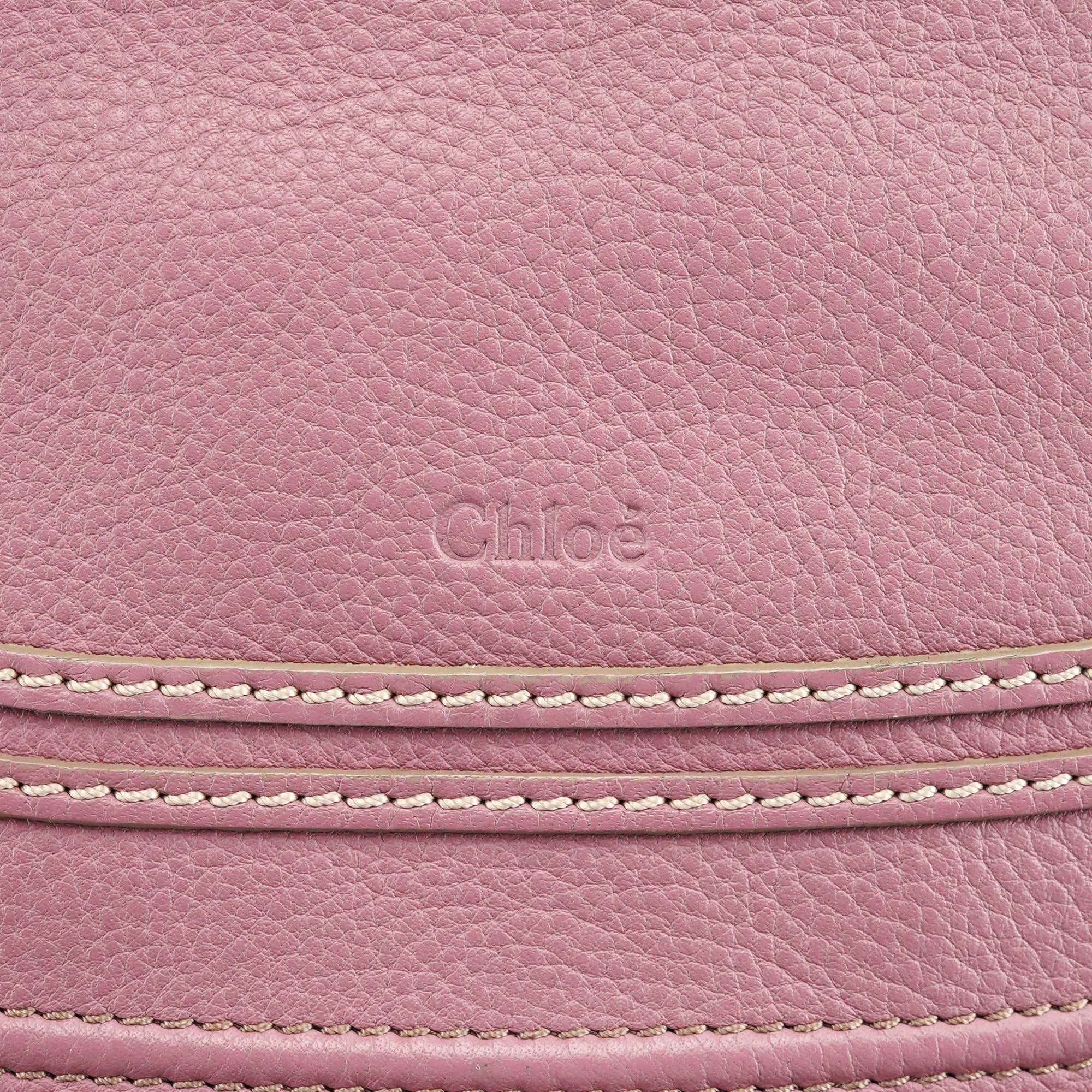 Designed in 2010 by Hannah MacGibbon, this vintage Chloé Marcie 2-way shoulder bag features pink pebbled leather with the model's signature saddle-stitch detailing and horseshoe-shaped front pocket. The wrapped leather handles, gold-tone hardware, and detachable shoulder strap offer versatile 2-way styling.