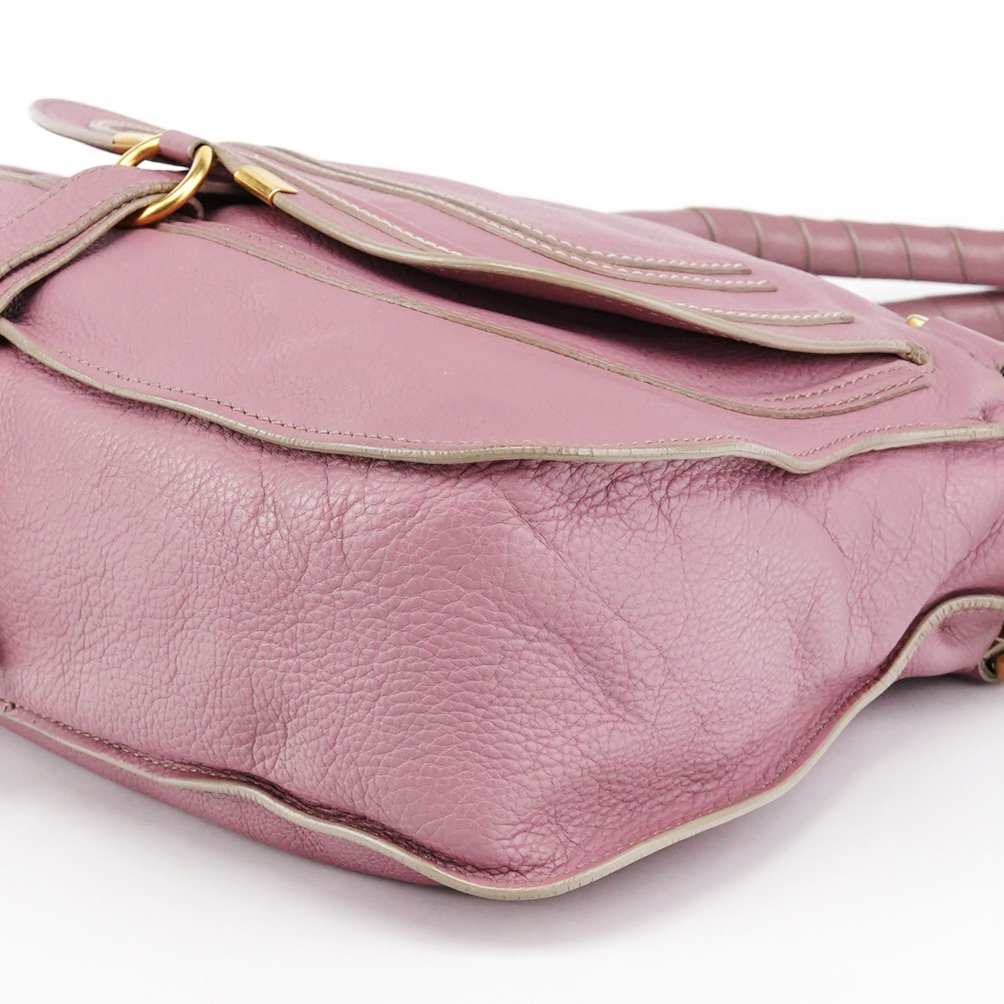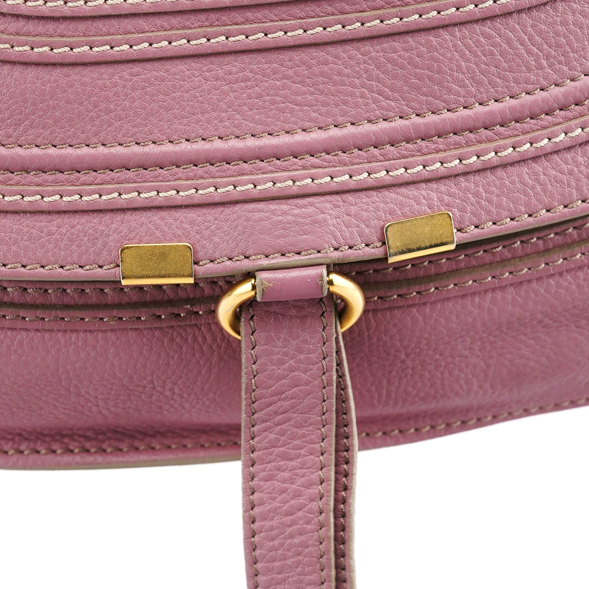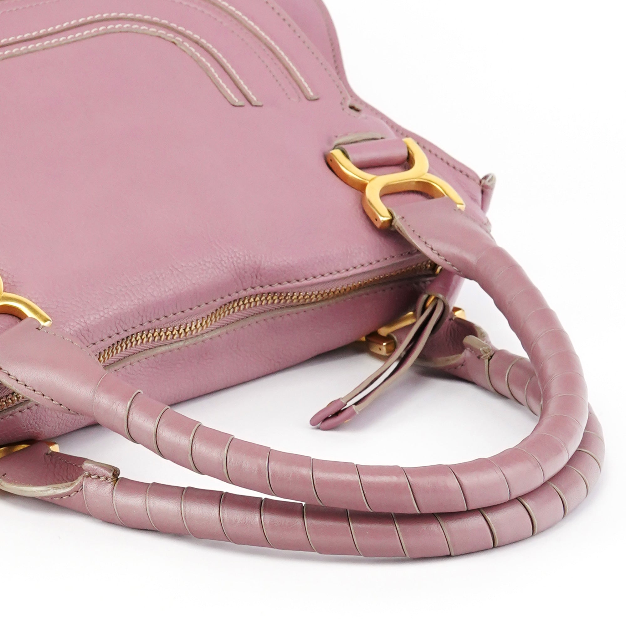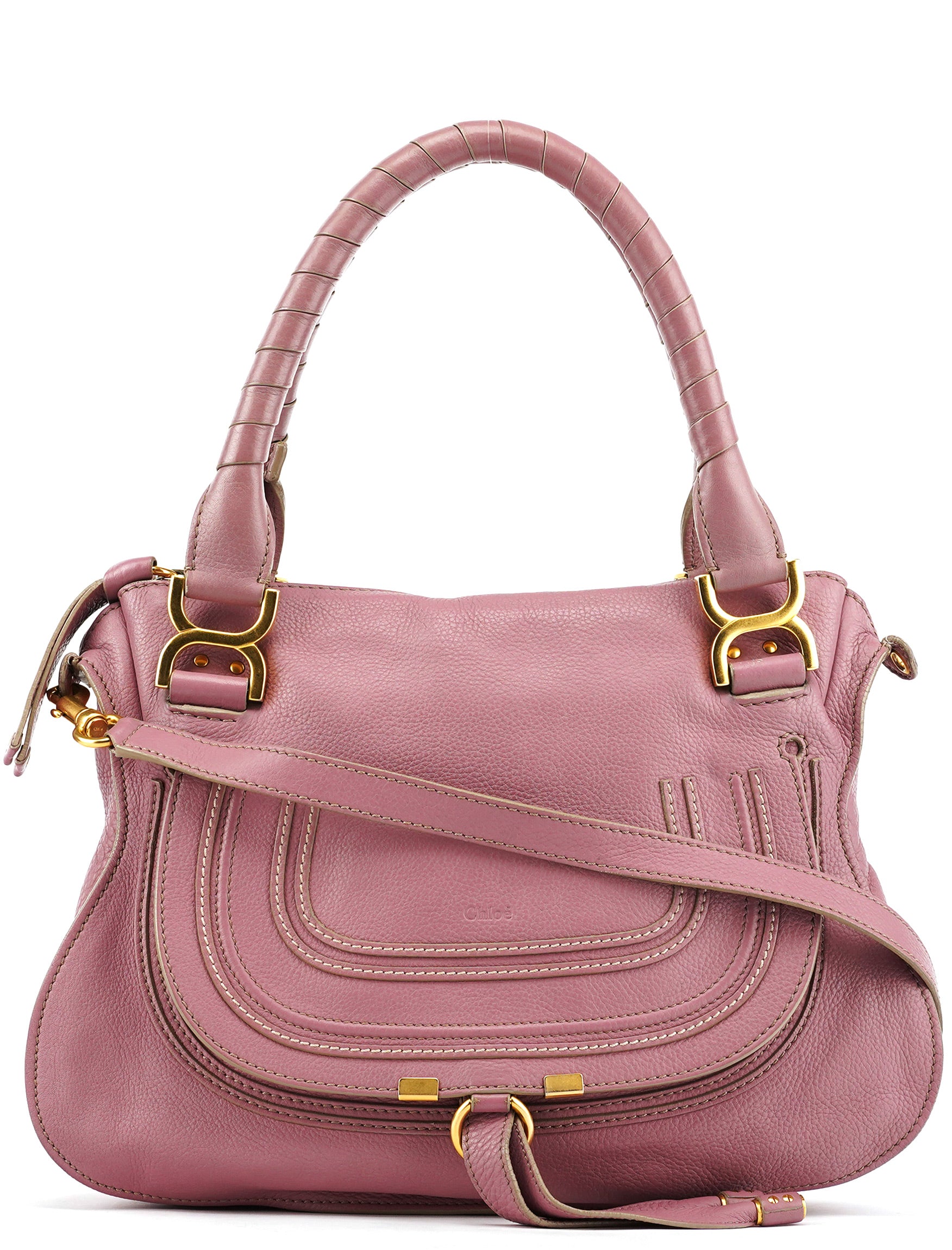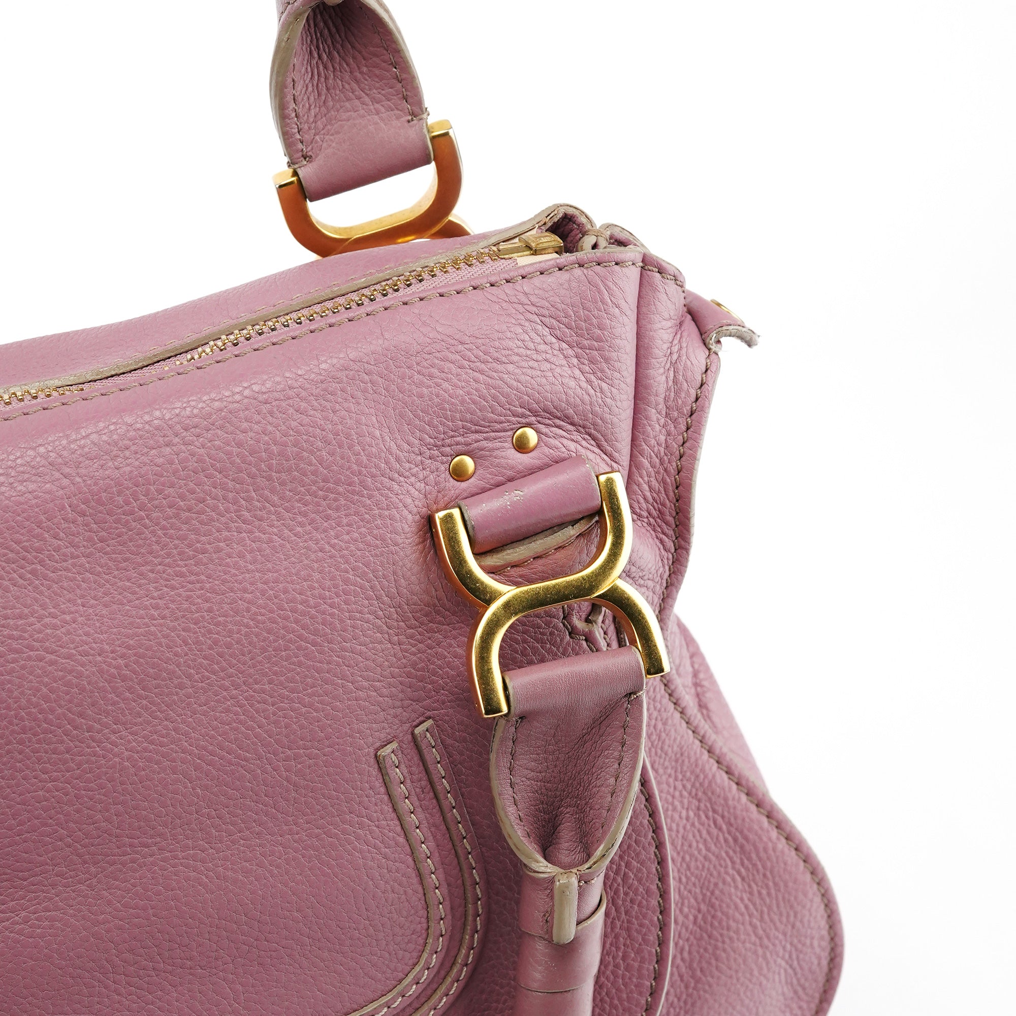 Designed in 2010 by Hannah MacGibbon, this vintage Chloé Marcie 2-way shoulder bag features pink pebbled leather with the model's signature saddle-stitch detailing and horseshoe-shaped front pocket. The wrapped leather handles, gold-tone hardware, and detachable shoulder strap offer versatile 2-way styling.