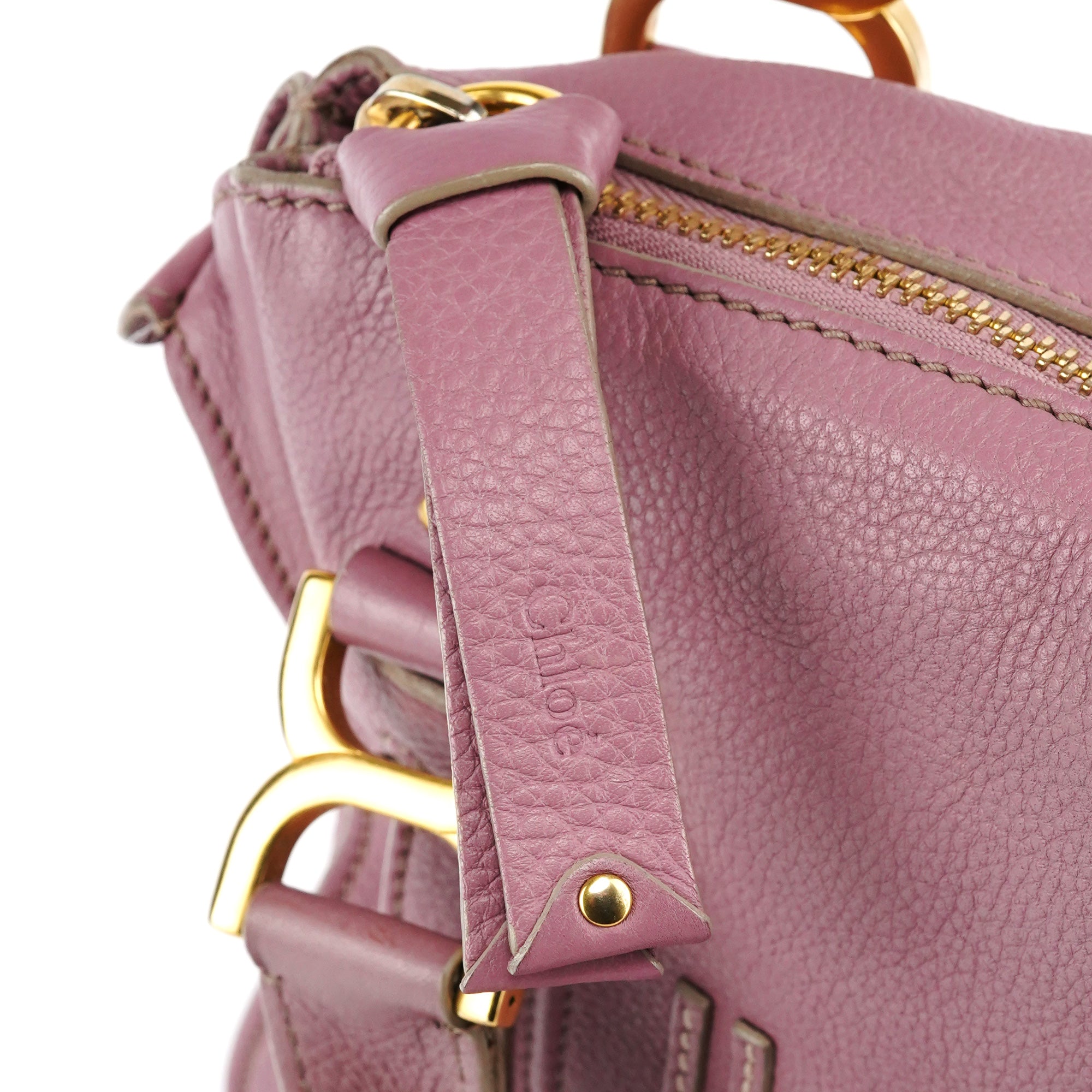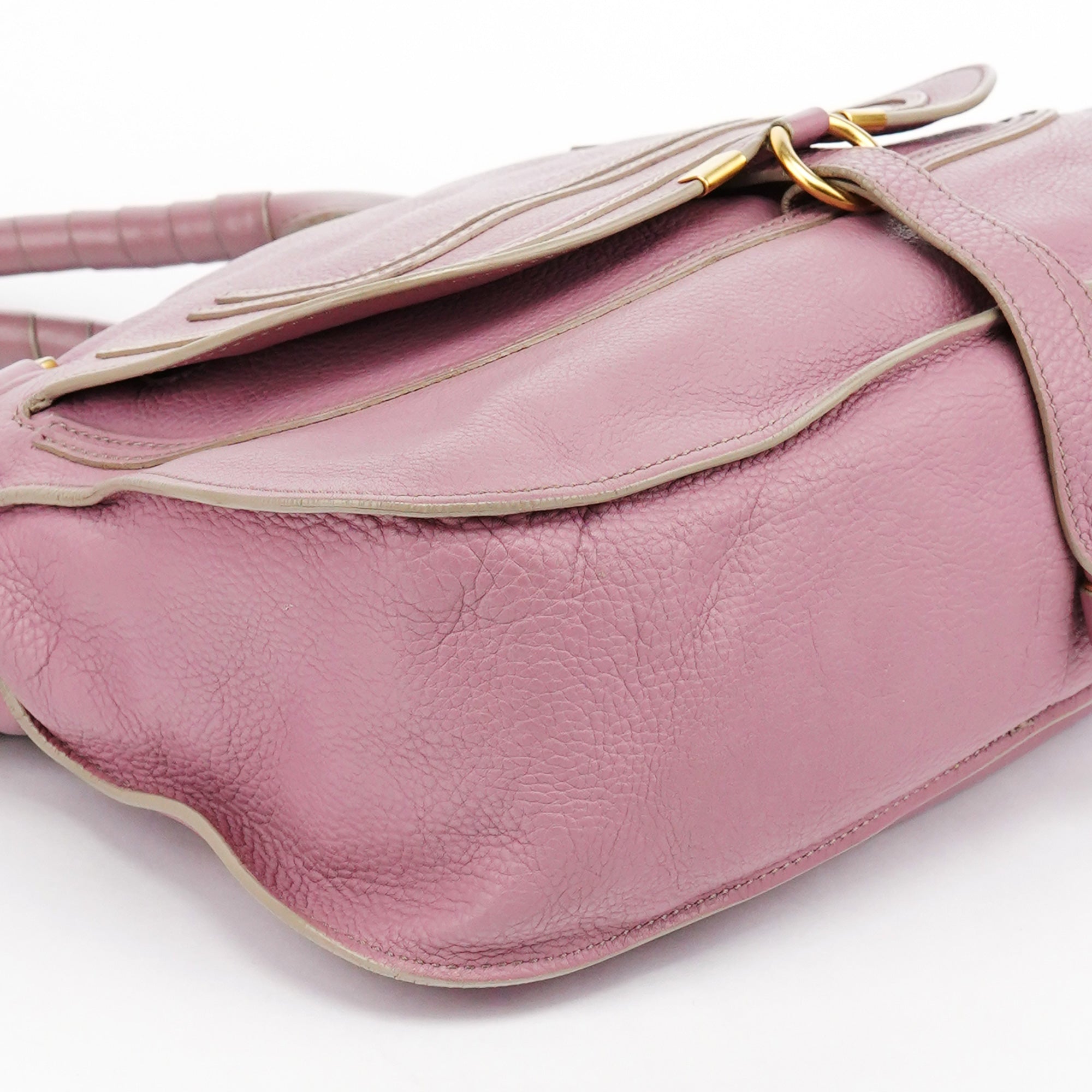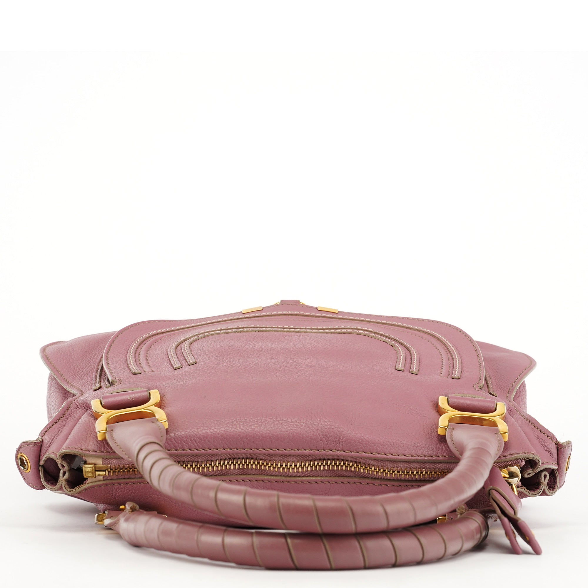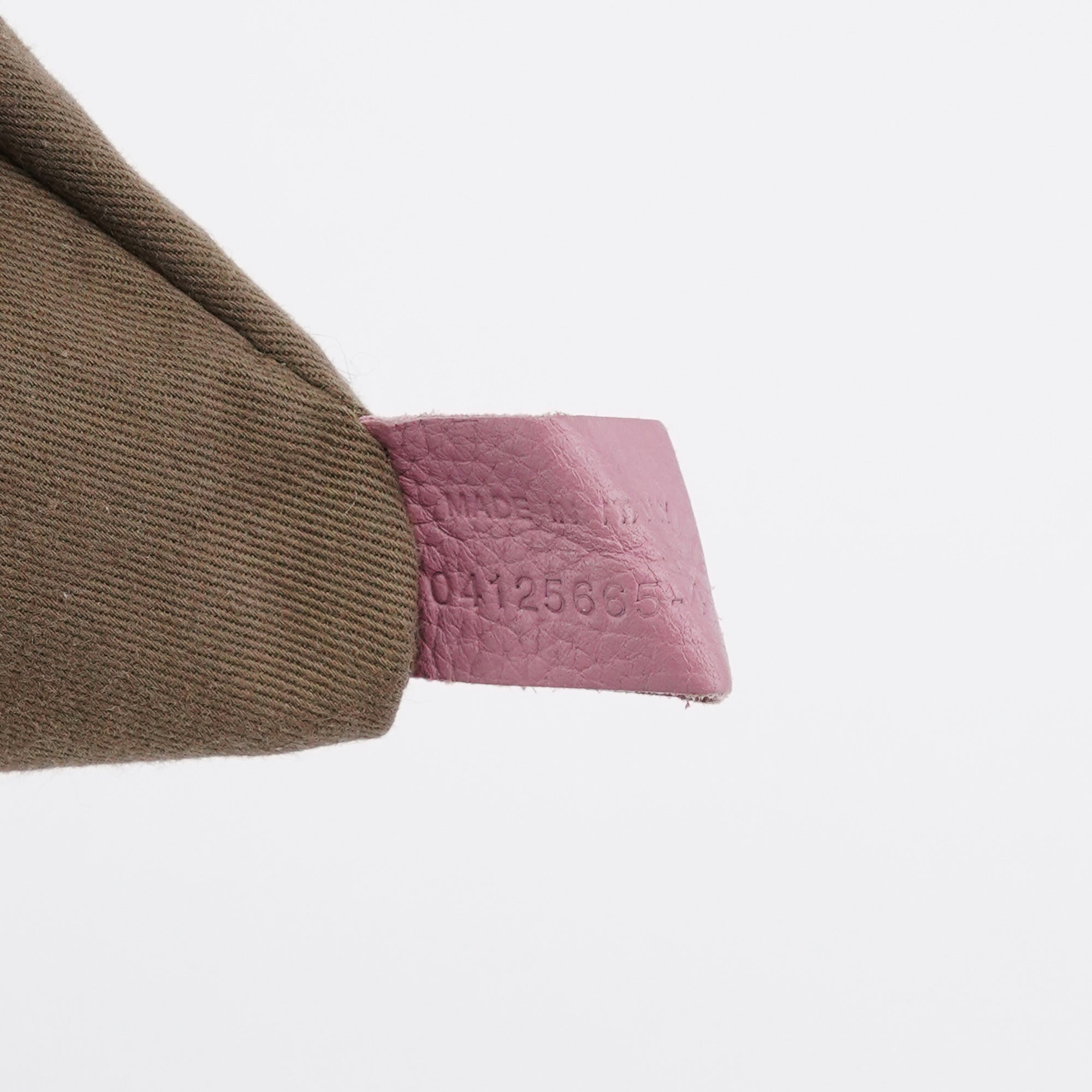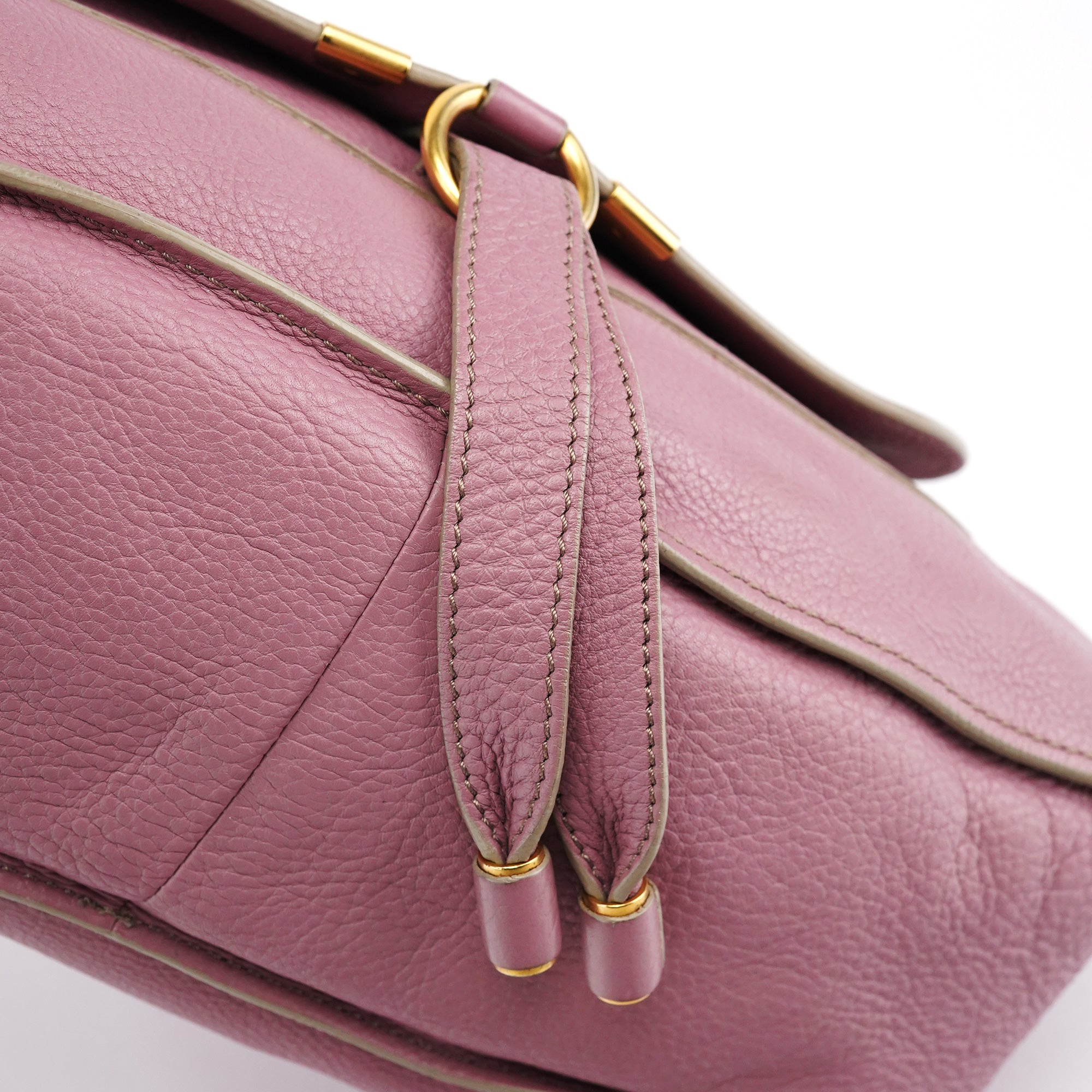 Designed in 2010 by Hannah MacGibbon, this vintage Chloé Marcie 2-way shoulder bag features pink pebbled leather with the model's signature saddle-stitch detailing and horseshoe-shaped front pocket. The wrapped leather handles, gold-tone hardware, and detachable shoulder strap offer versatile 2-way styling.