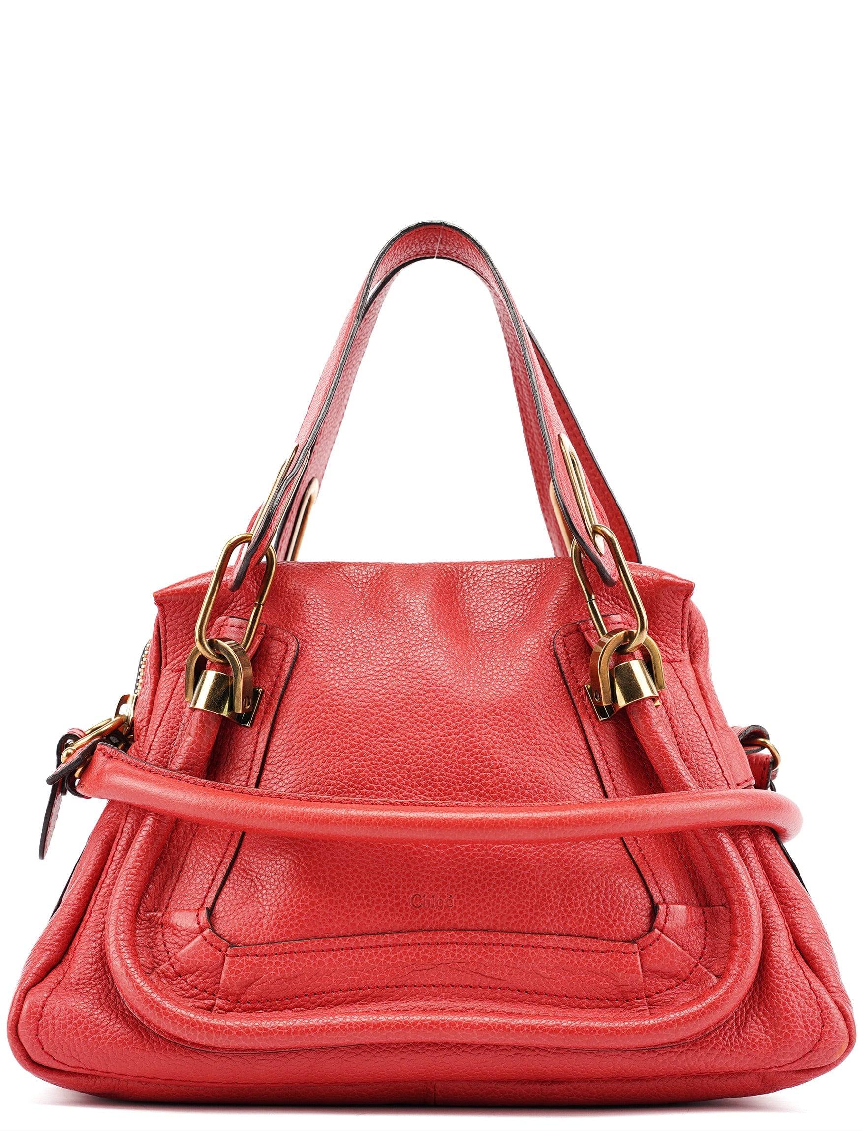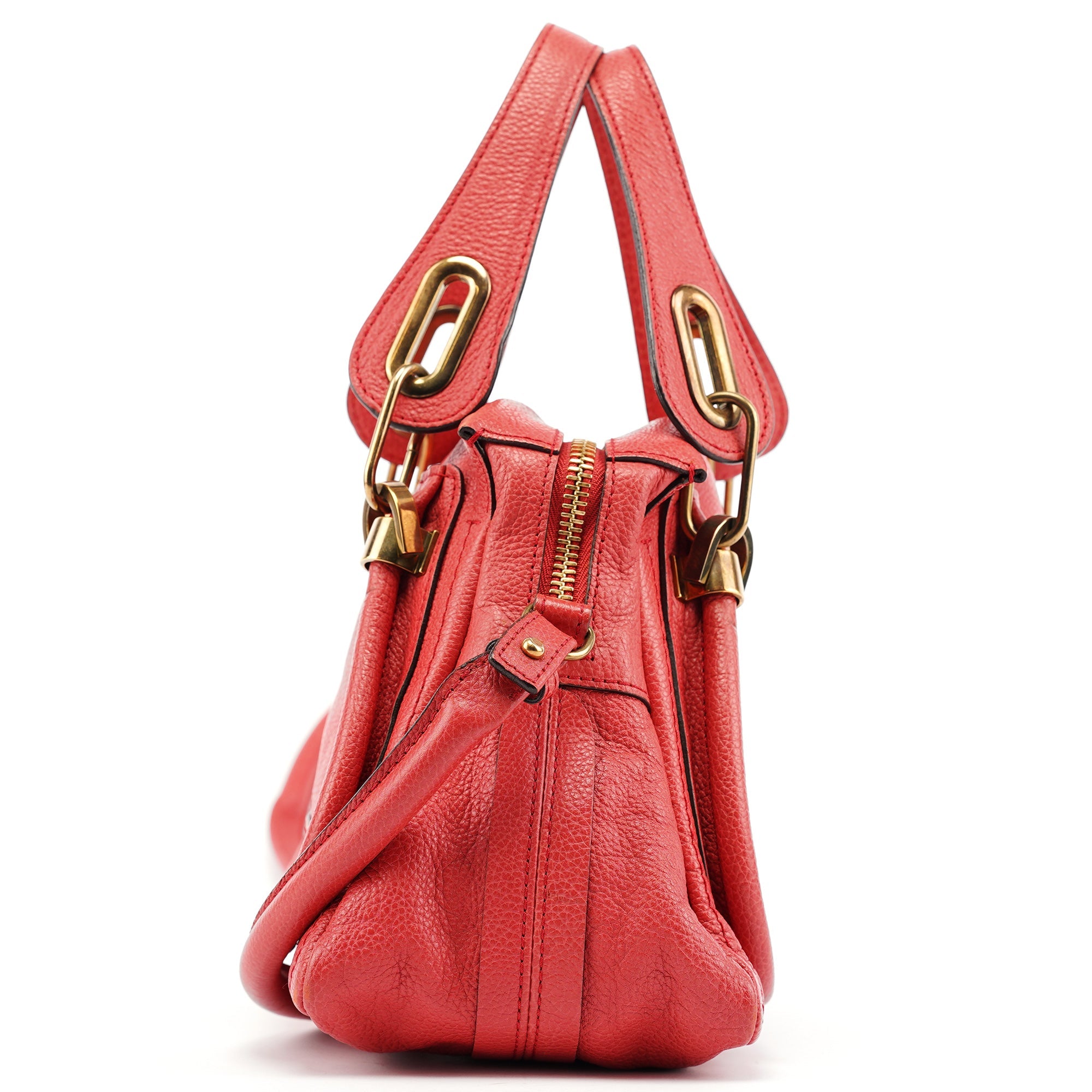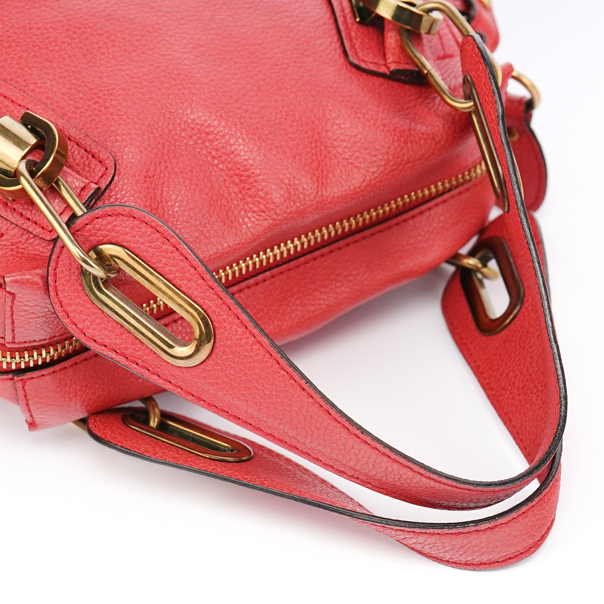 Designed in the late 2000s by Hannah McGibbon, this Chloé Paraty 2-way bag is crafted in pink leather with gold-tone hardware. Its signature triangular structure is accented by rolled handles, detachable shoulder strap, and decorative side loops. The interior is lined in fabric and includes a zip pocket and slip pocket.