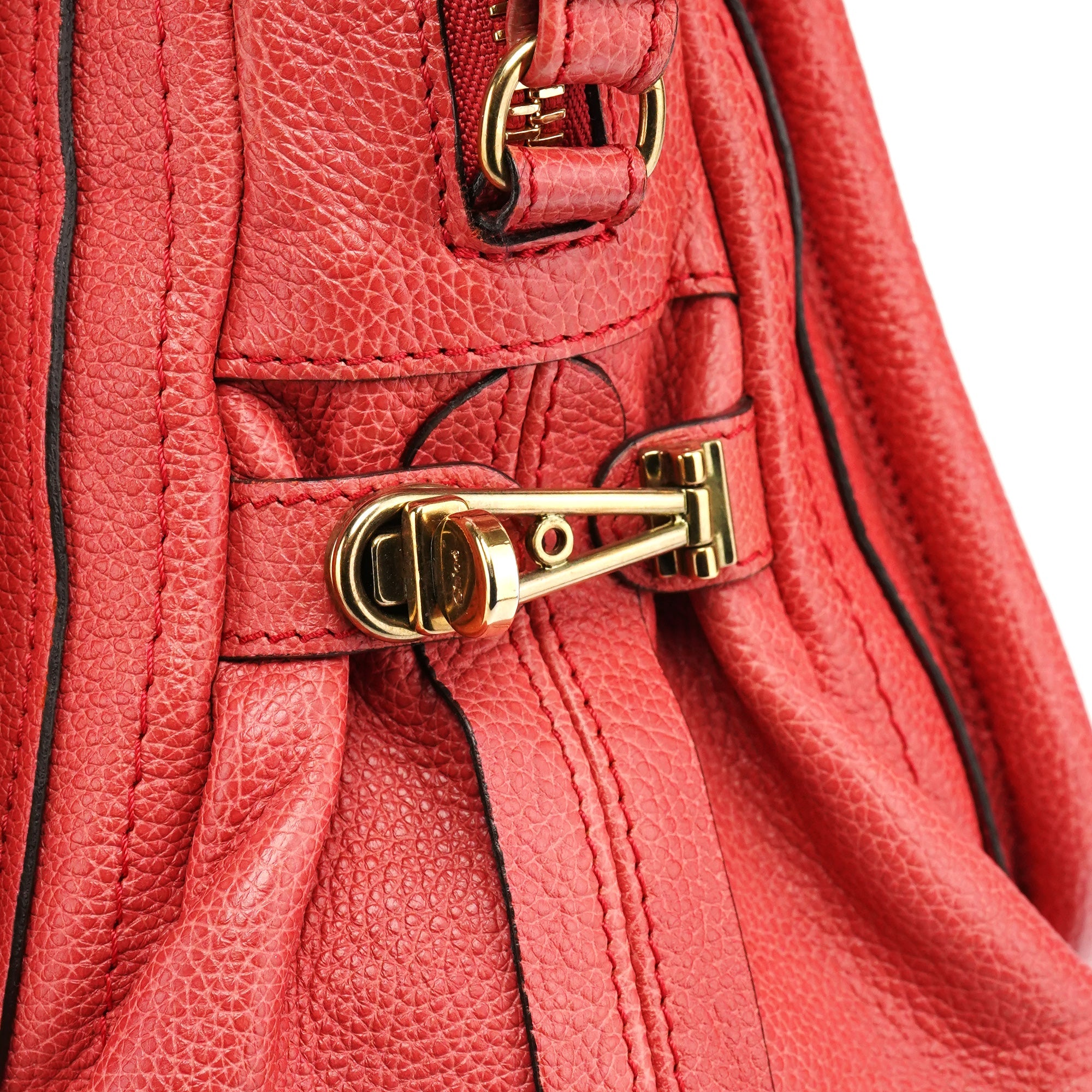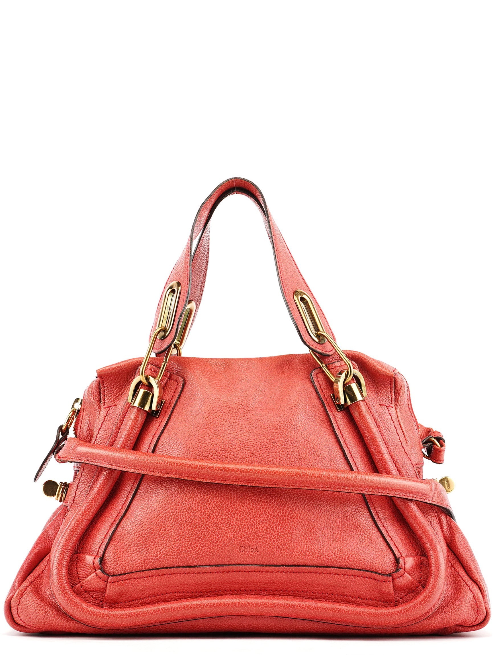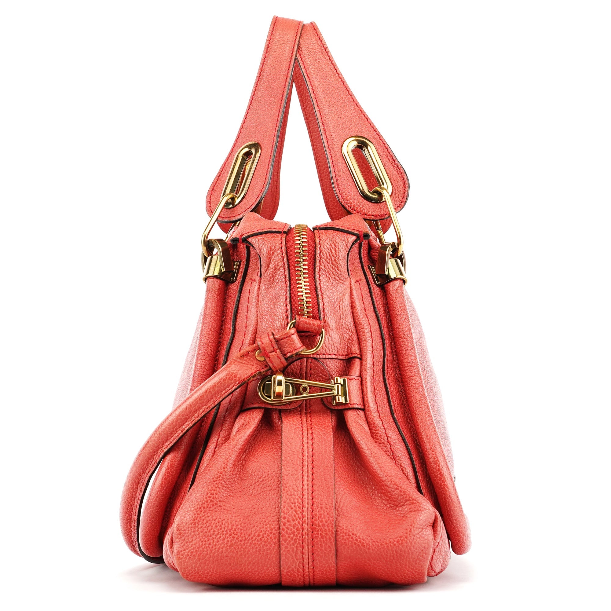 Designed in 2008 by Hannah MacGibbon, this pale red Chloé Paraty 2-way bag is crafted in grained leather with the style’s signature piped construction and gold-tone hardware. The silhouette features dual top handles, a detachable shoulder strap and a top zipper closure, while the interior is lined in beige twill with a zip pocket.