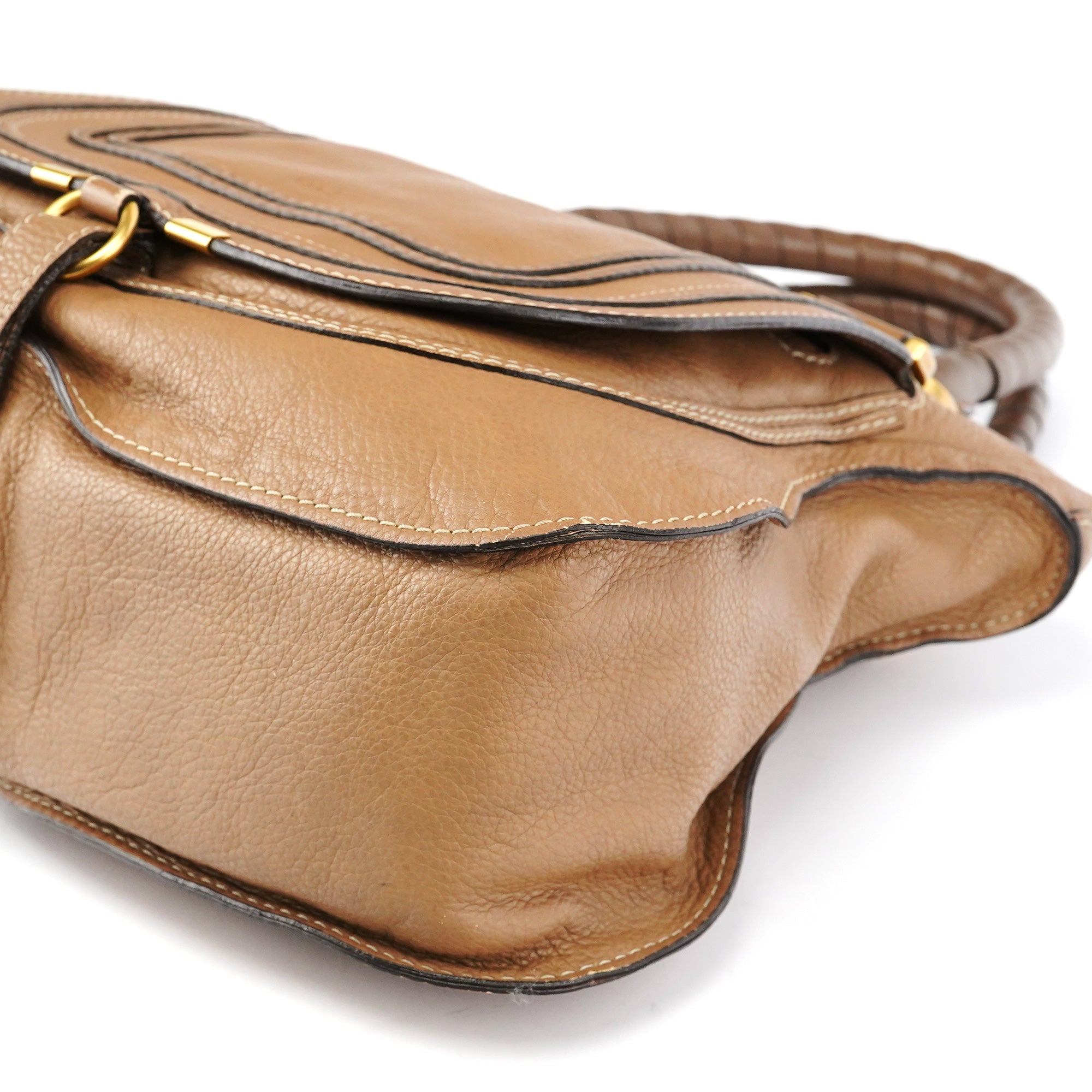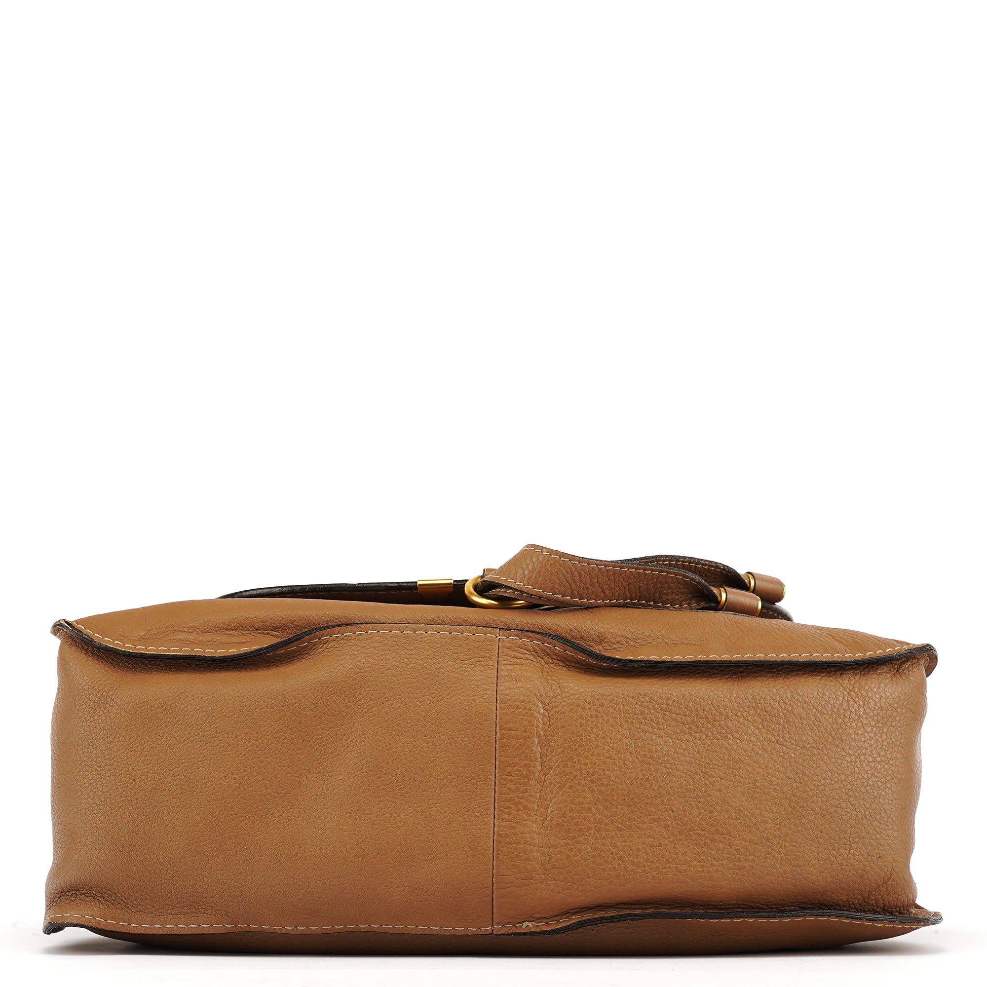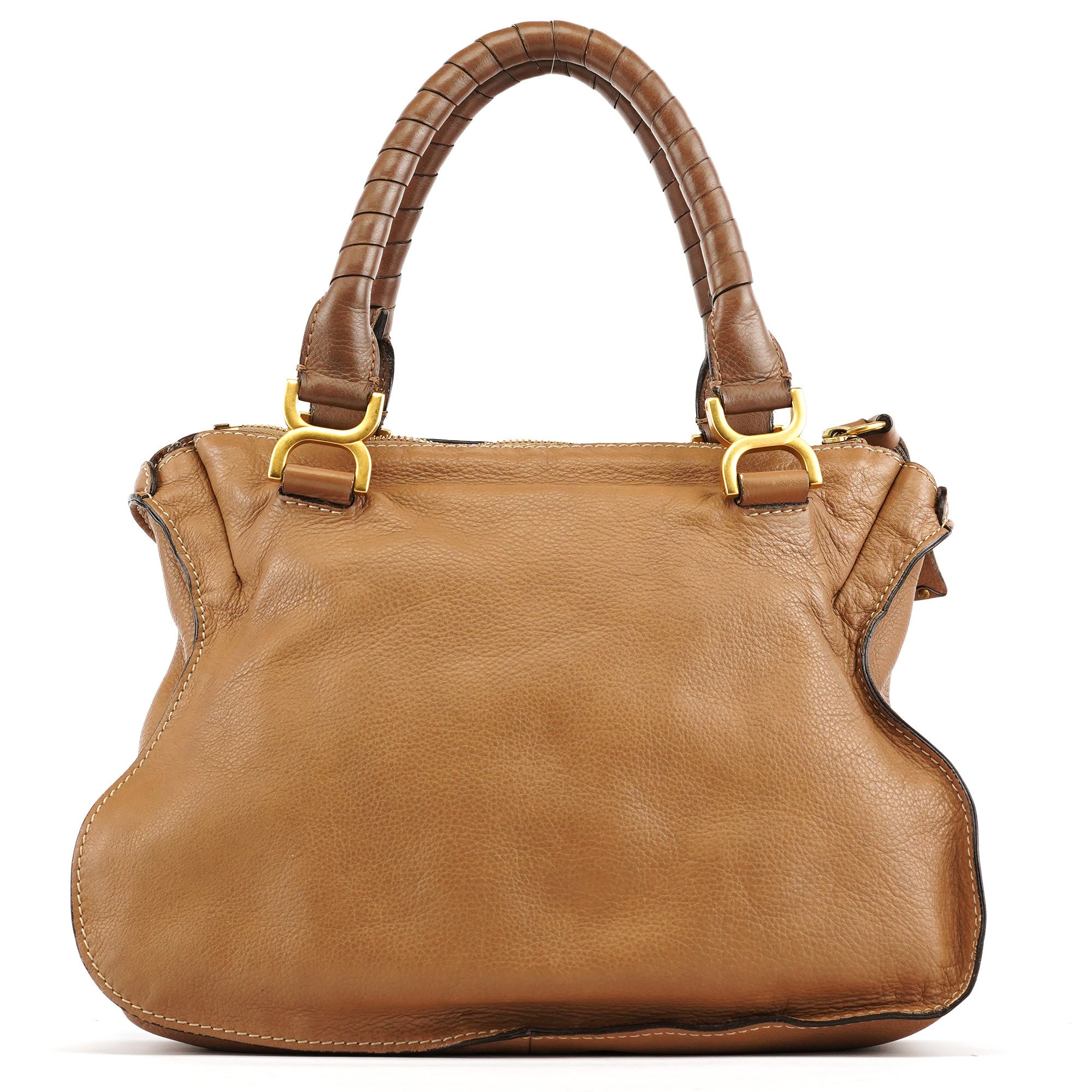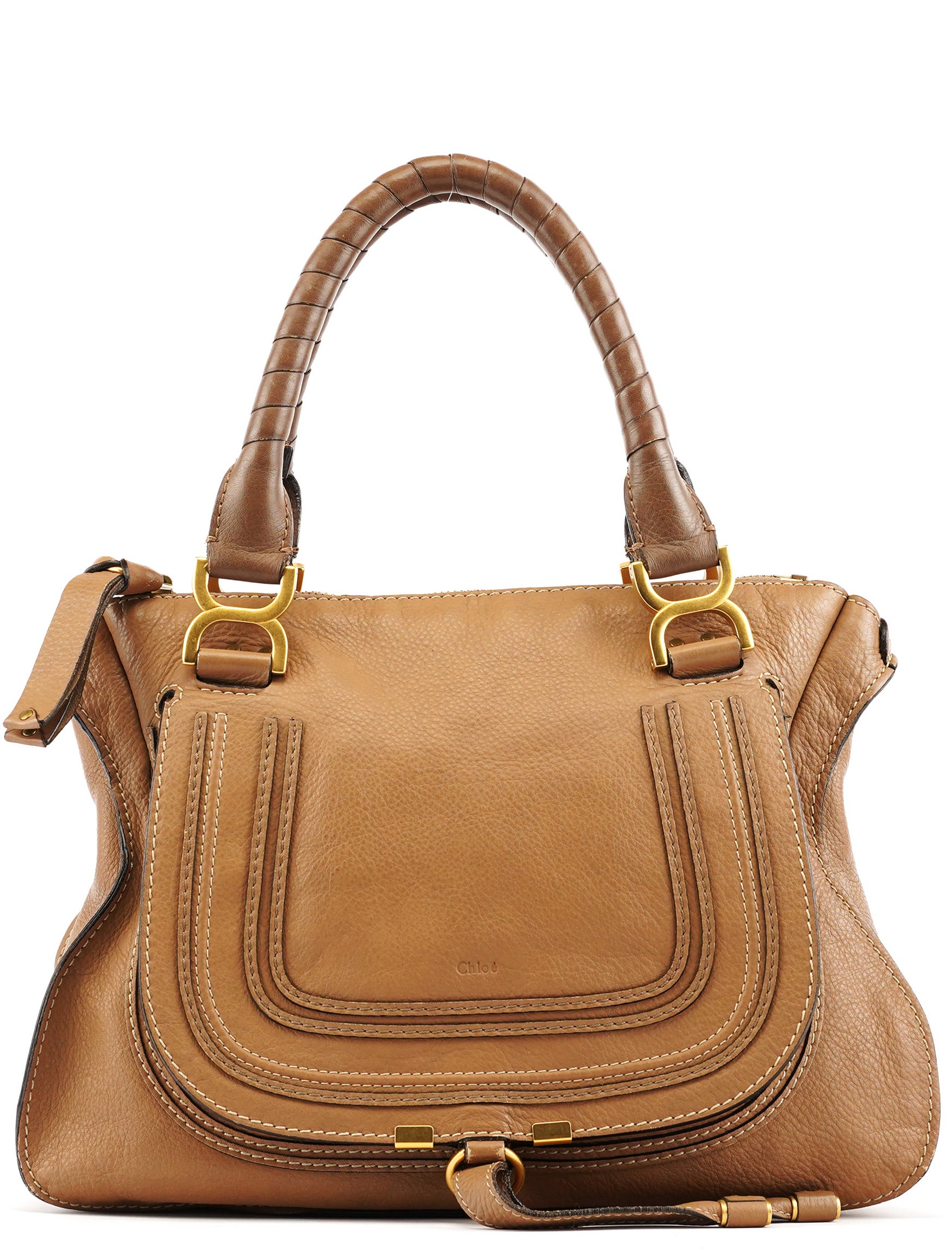 Designed in the 2010s by Hannah MacGibbon, this Chloé Marcie bag is crafted in light brown grained leather and detailed with signature stitched saddle paneling and brushed gold-tone hardware. Features include braided top handles, a front flap pocket with tassel accent, and a spacious zippered interior lined in tonal canvas.