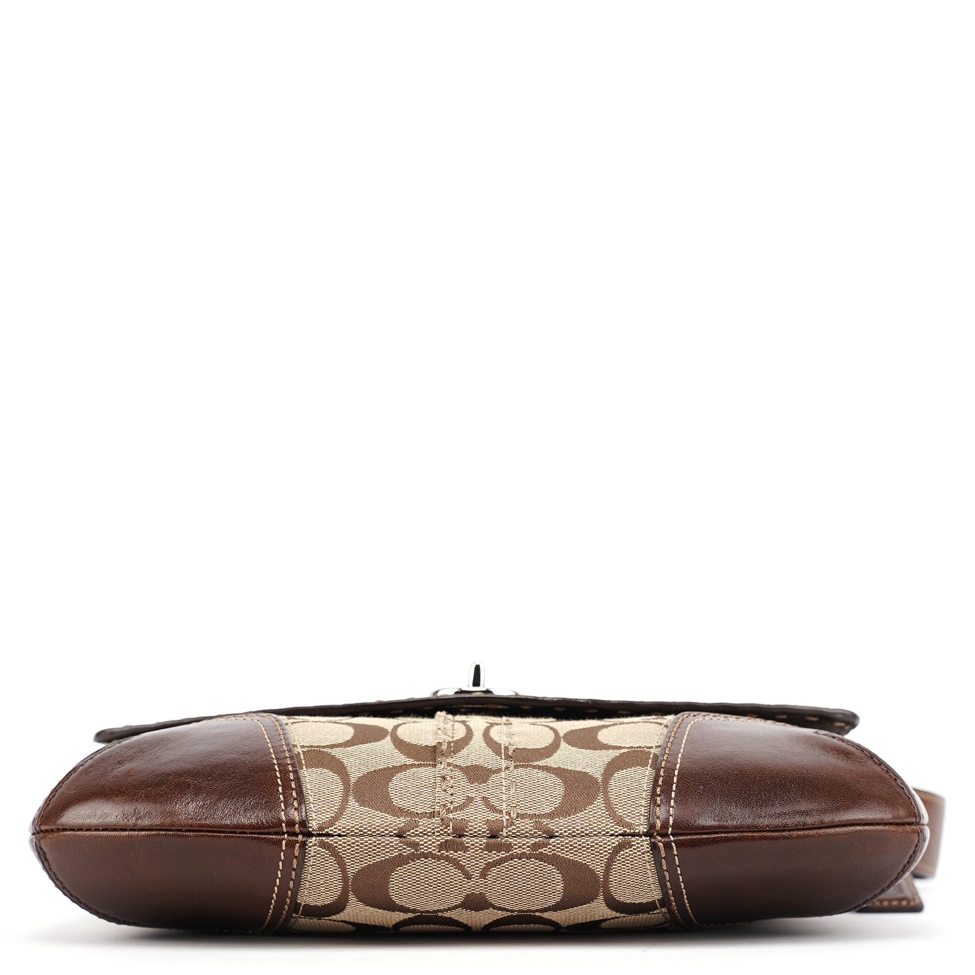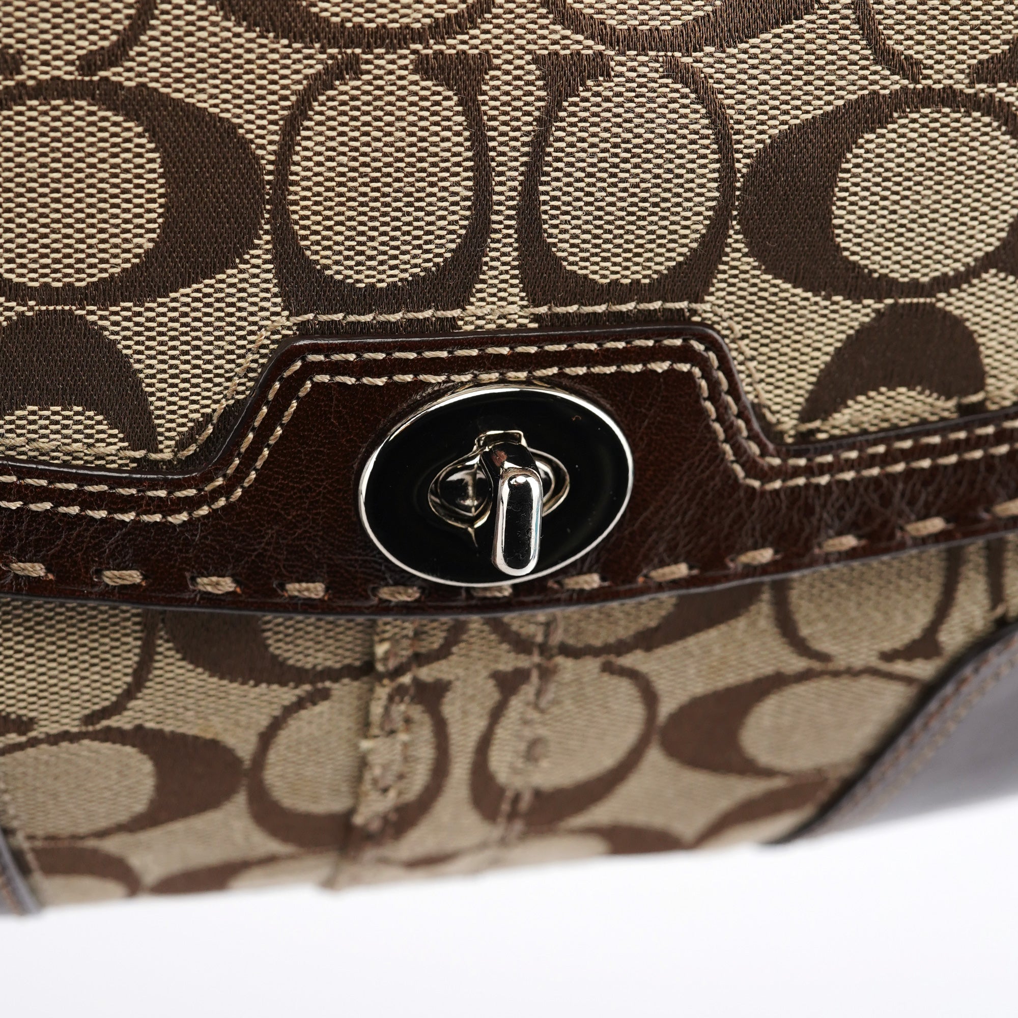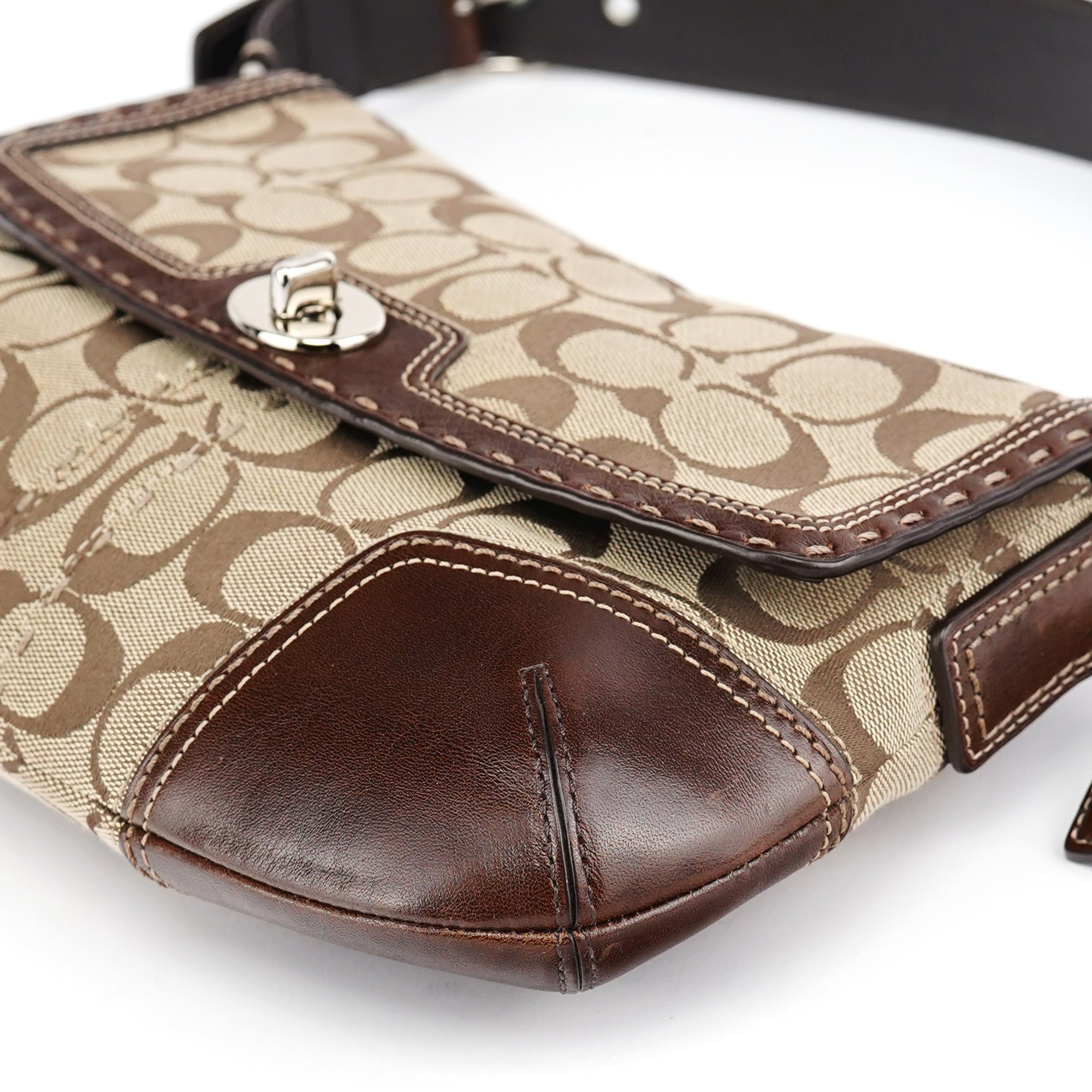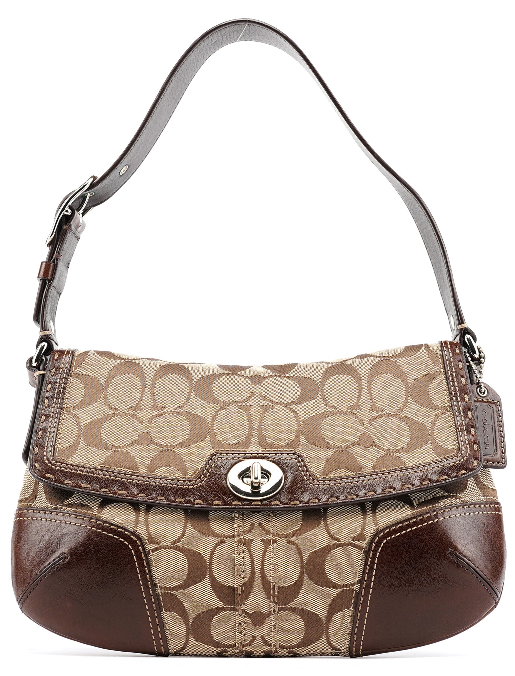 Designed in the early 2000's, this vintage Coach Turnlock shoulder bag features the signature jacquard canvas in beige with rich brown leather trim. The front flap showcases the iconic turnlock closure, while contrast stitching adds refined detail throughout. The adjustable shoulder strap offers comfortable wear, and the bag is lined with durable fabric. An exterior front pocket provides easy access to essentials.