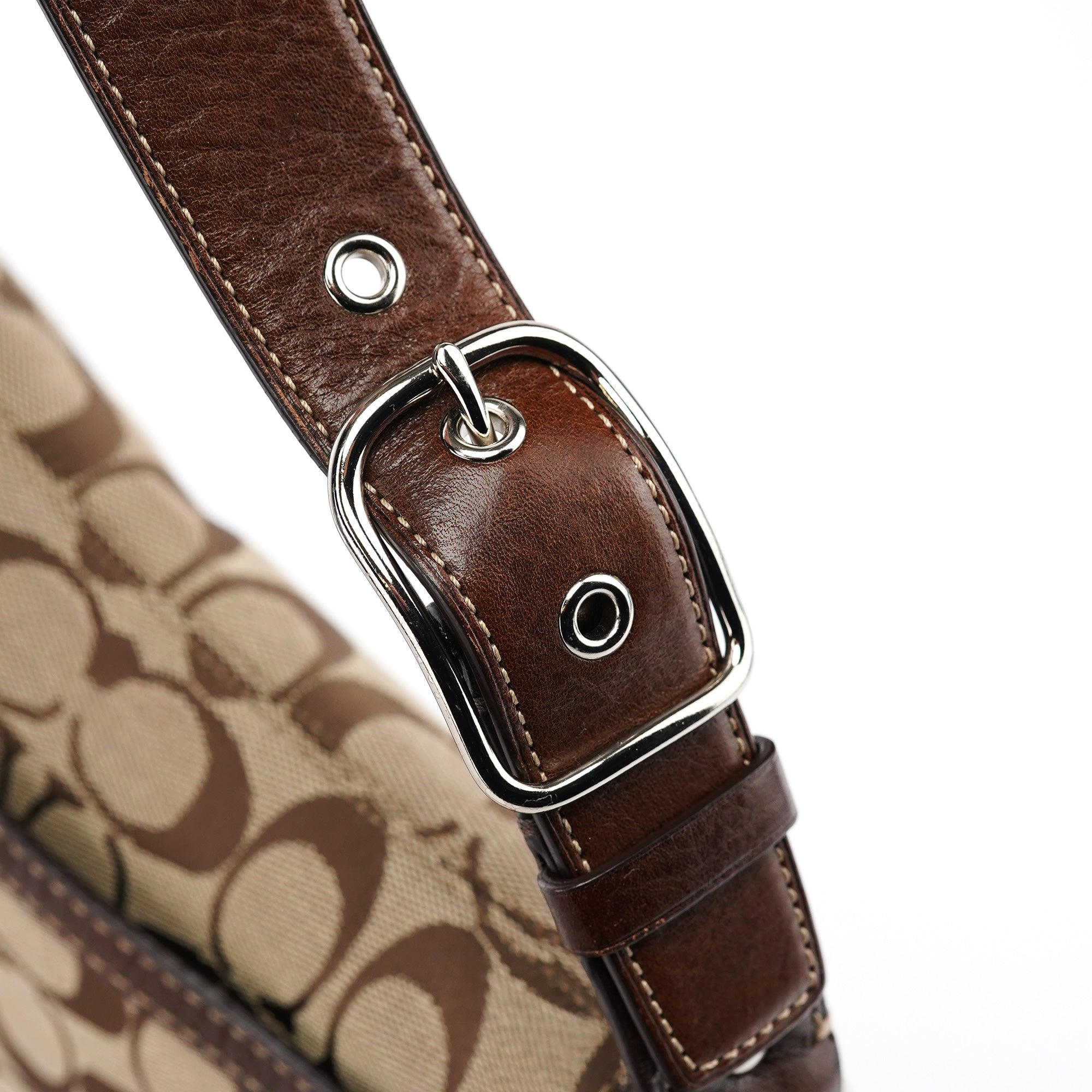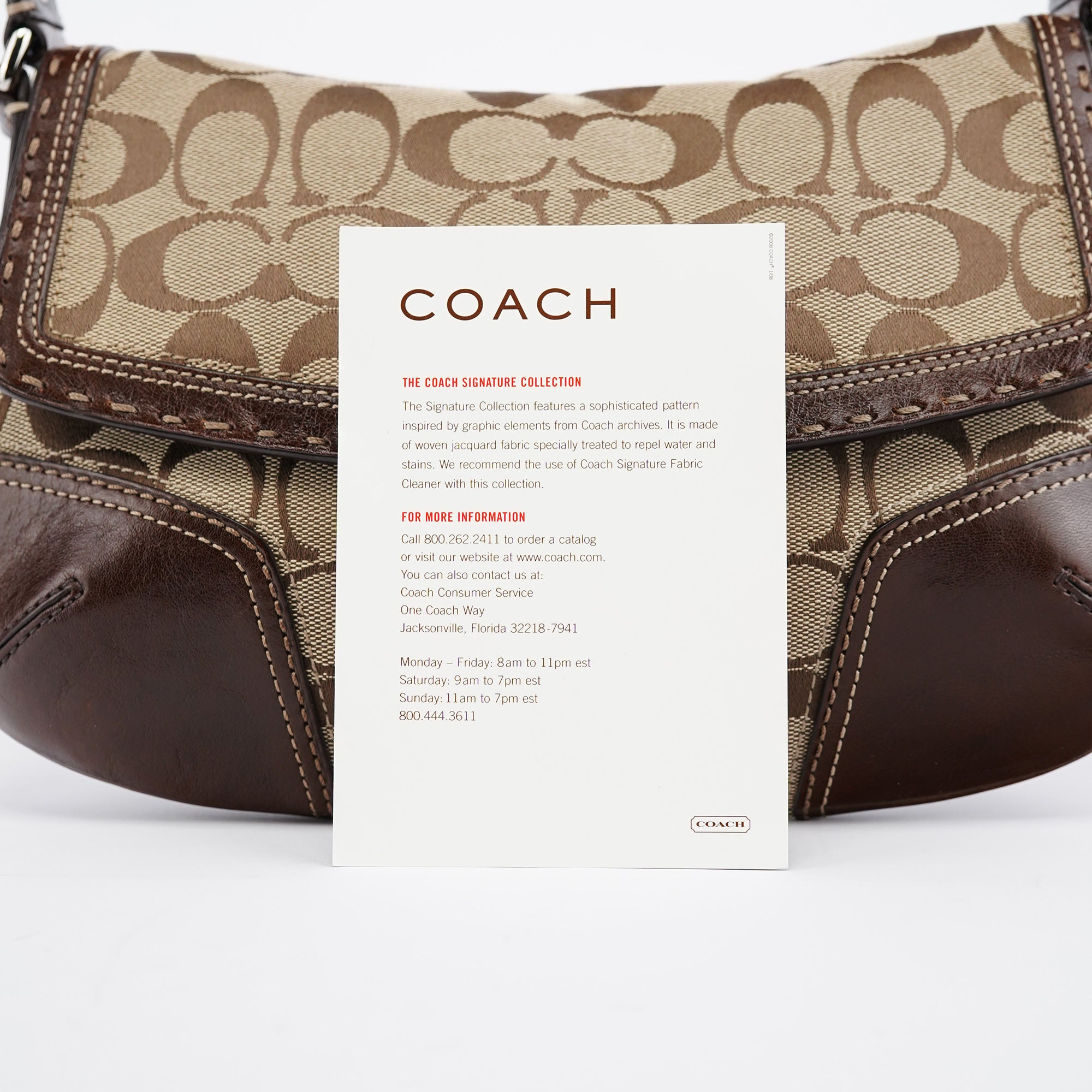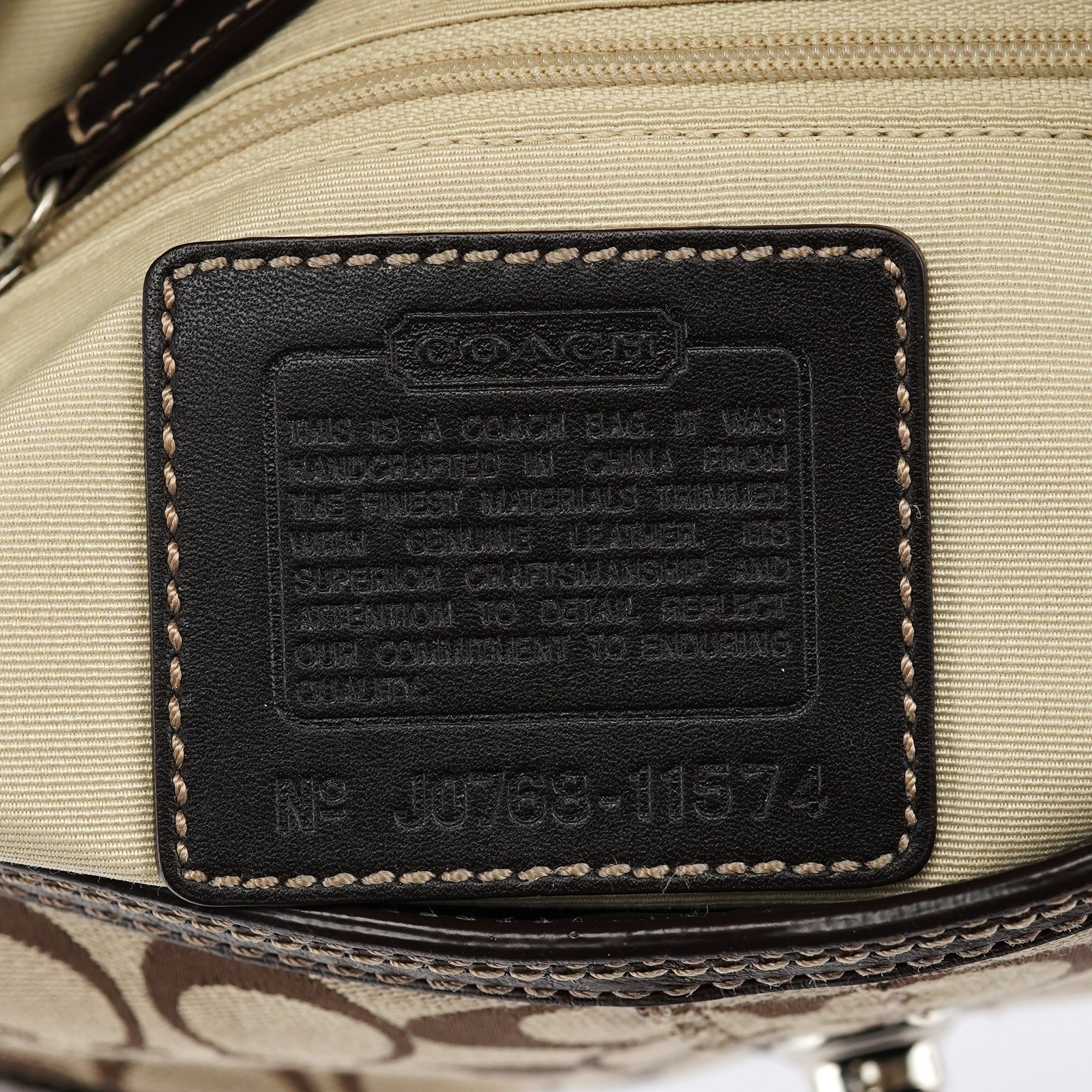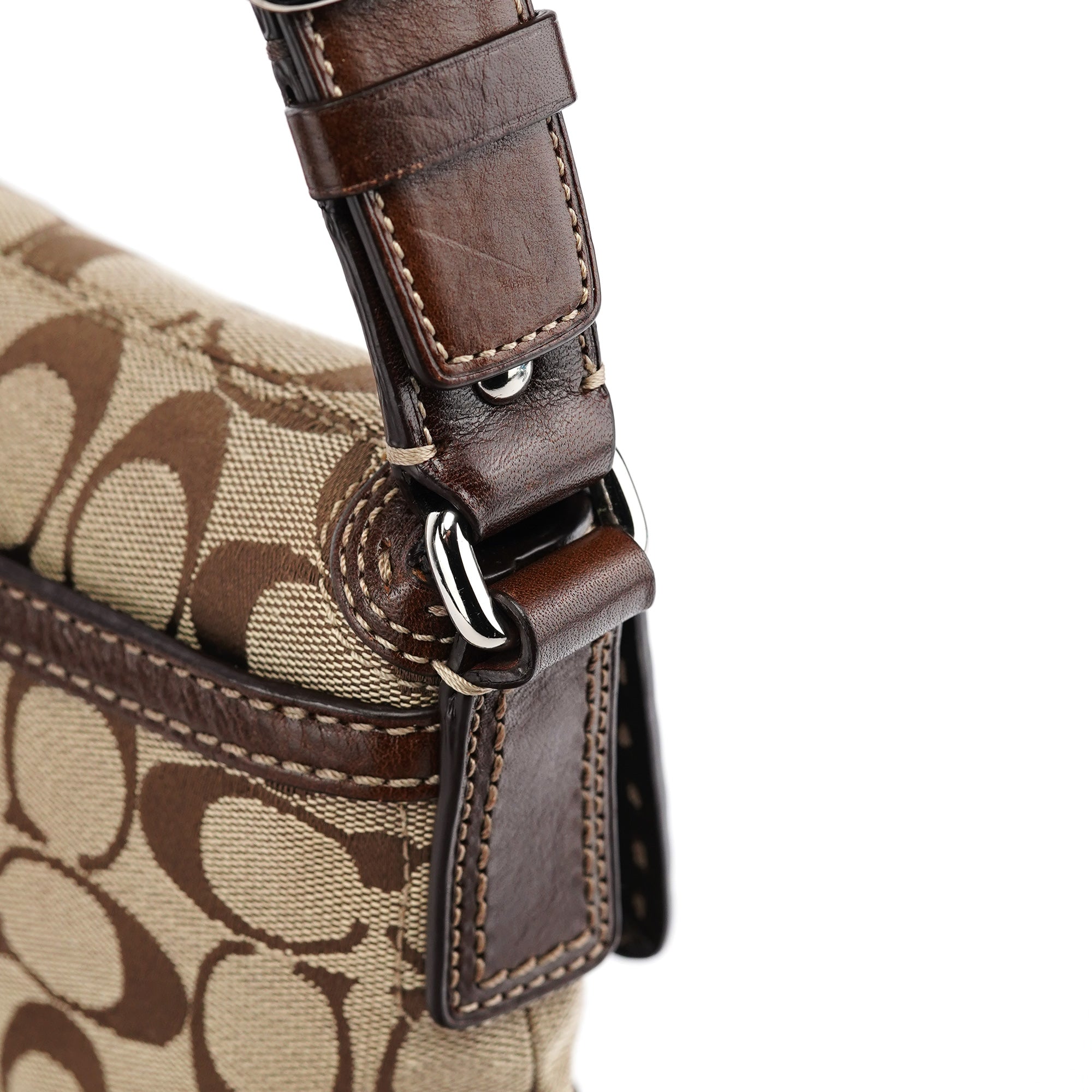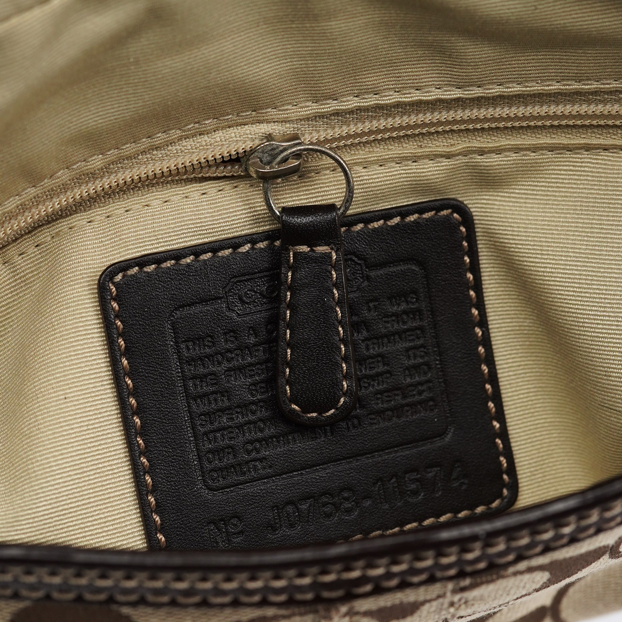 Designed in the early 2000's, this vintage Coach Turnlock shoulder bag features the signature jacquard canvas in beige with rich brown leather trim. The front flap showcases the iconic turnlock closure, while contrast stitching adds refined detail throughout. The adjustable shoulder strap offers comfortable wear, and the bag is lined with durable fabric. An exterior front pocket provides easy access to essentials.