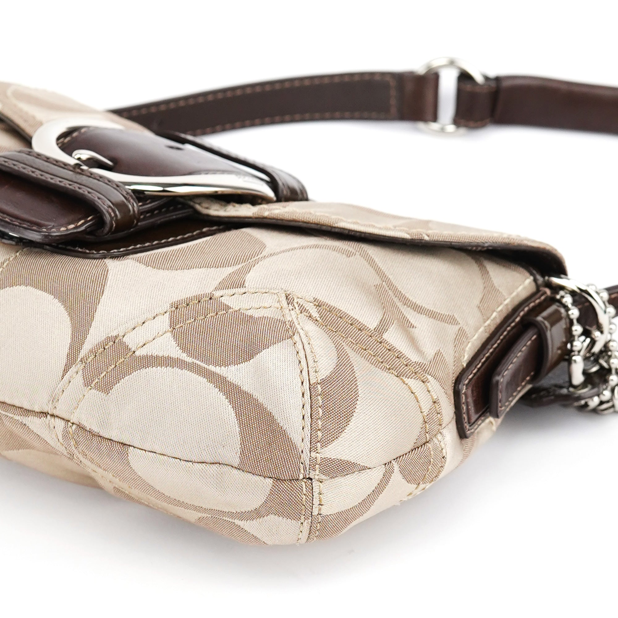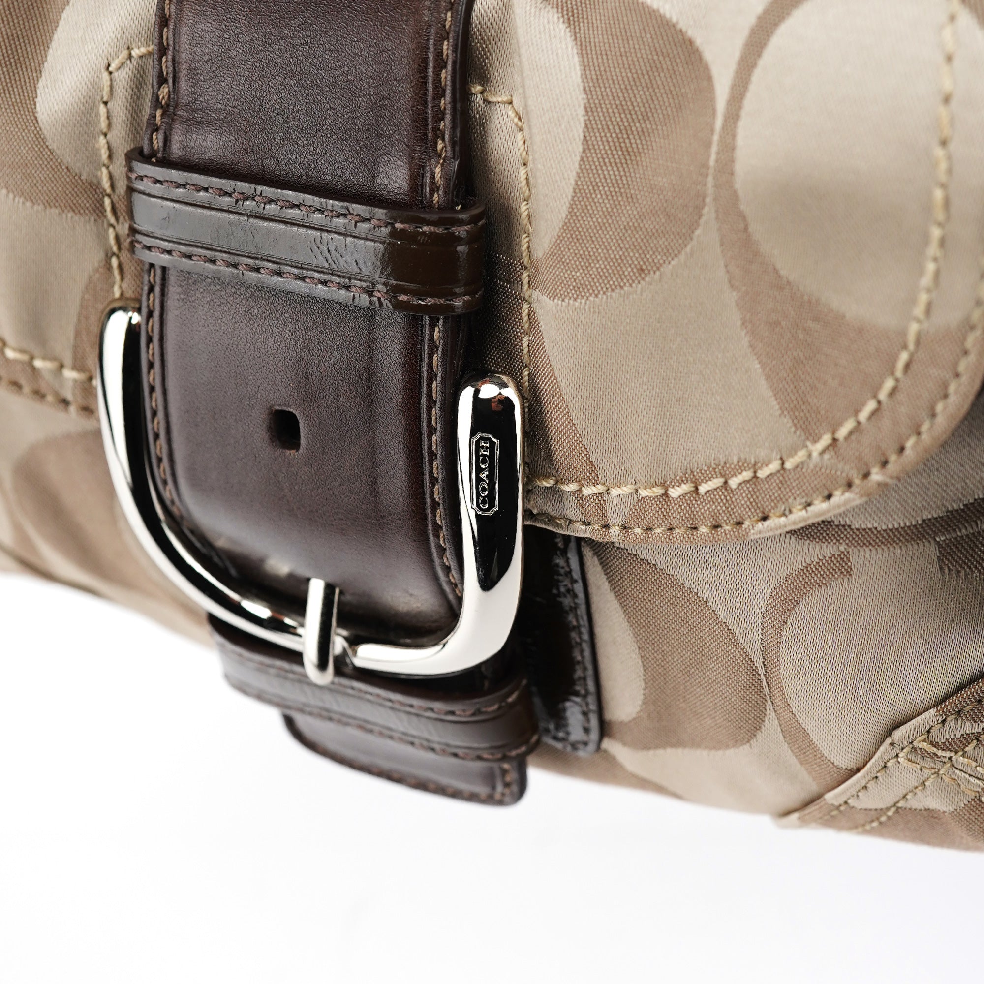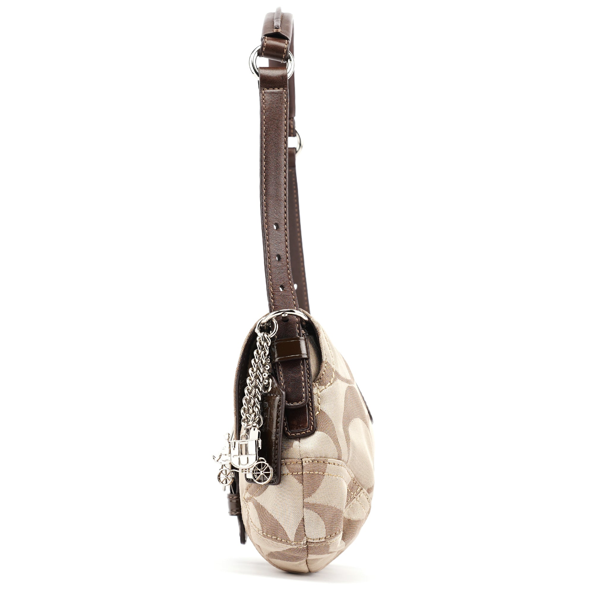 Designed in the early 2000s, this Coach Soho shoulder bag features the signature ‘C’ jacquard fabric in beige with chocolate leather trim and silver-tone buckle detail. The flap secures with a hidden magnetic closure, and the leather shoulder strap is adjustable. Includes original Coach carriage charm.