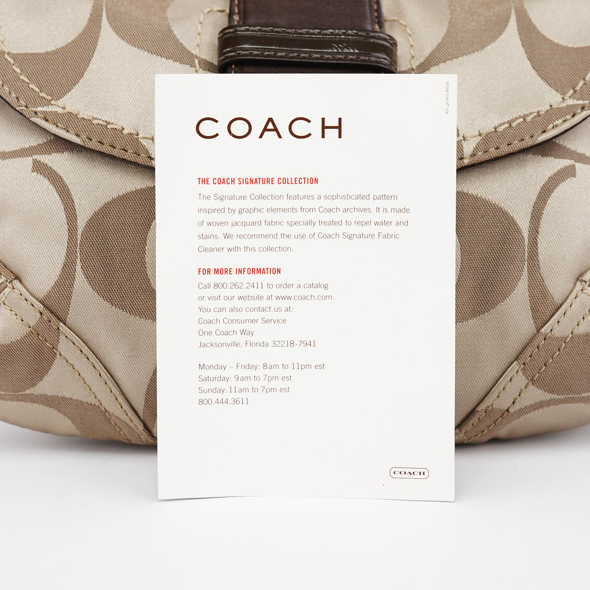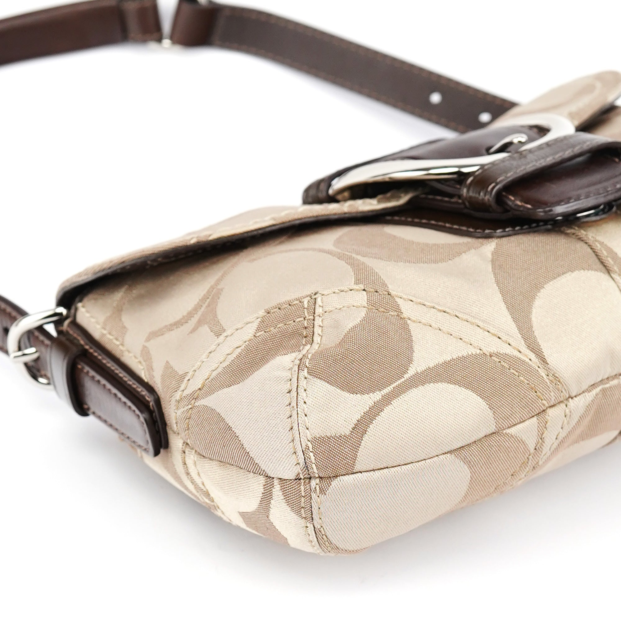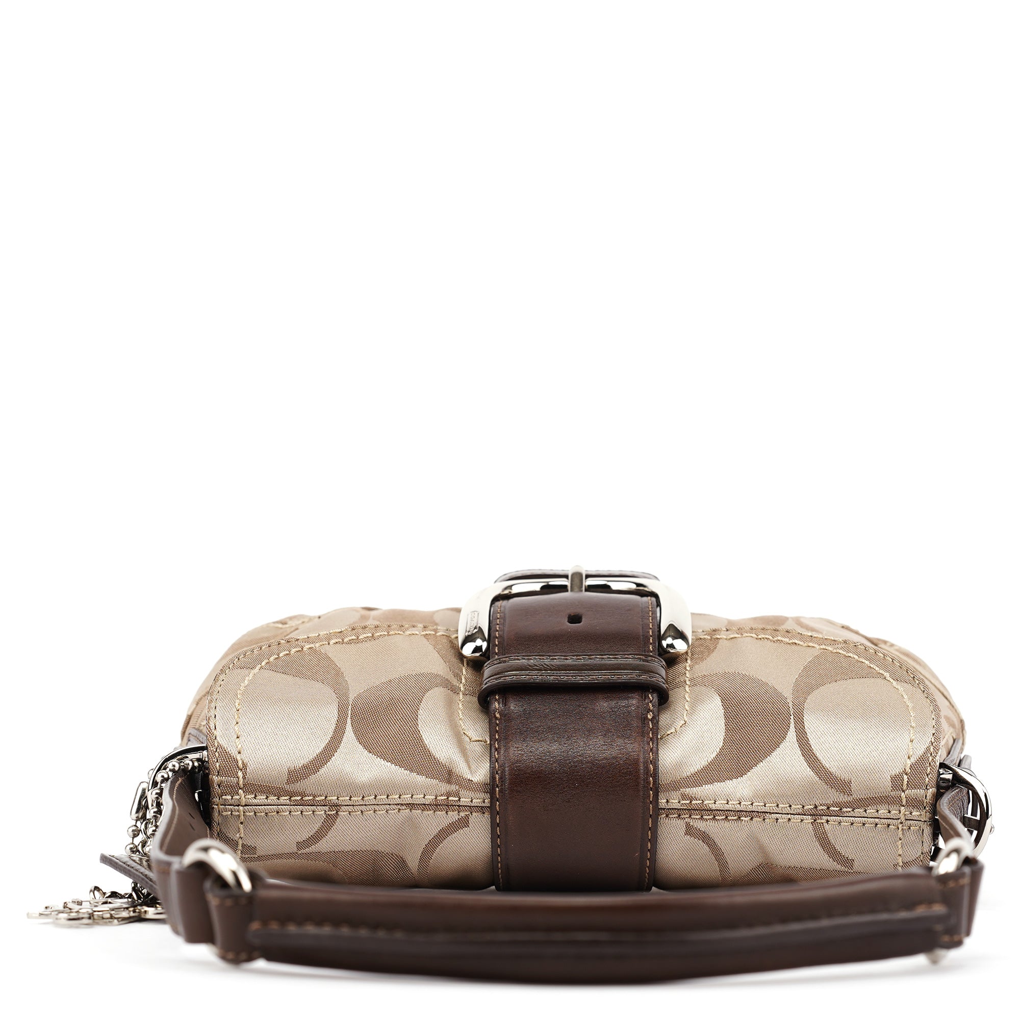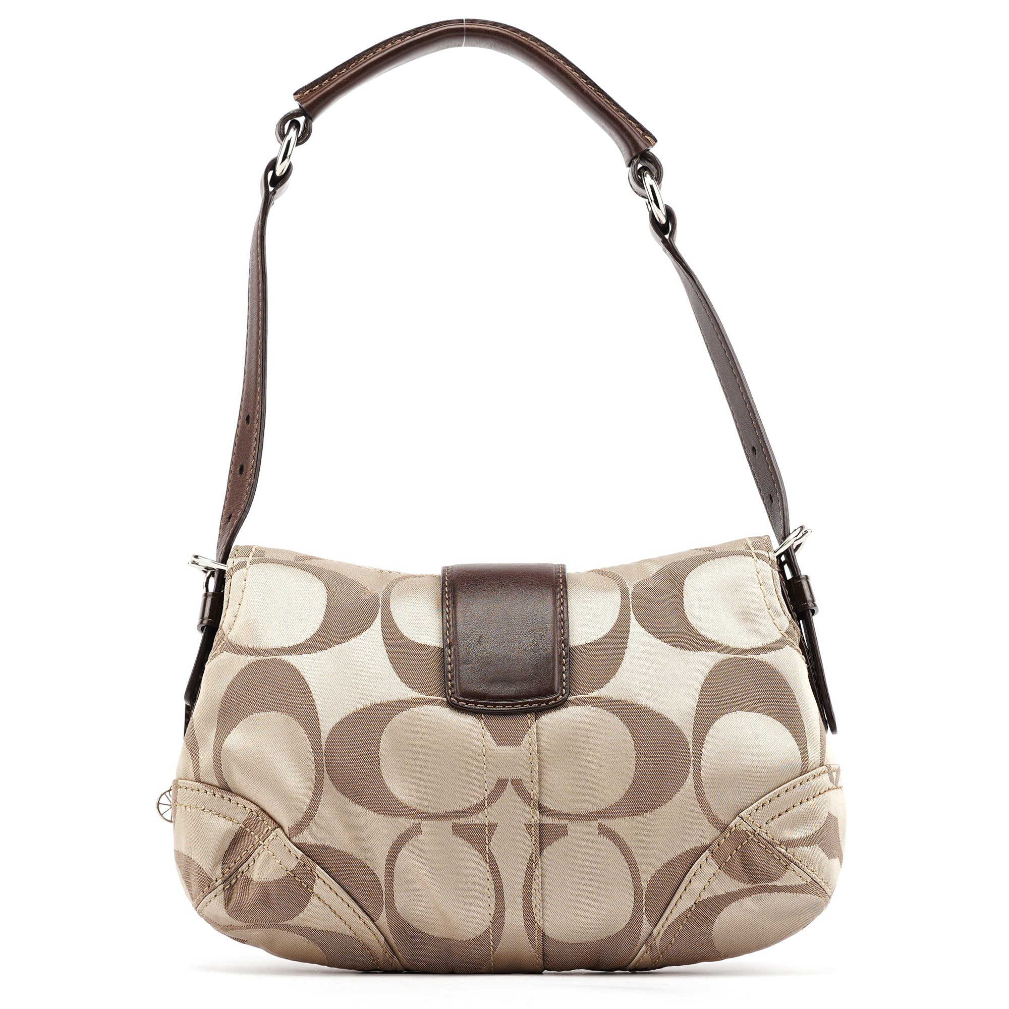 Designed in the early 2000s, this Coach Soho shoulder bag features the signature ‘C’ jacquard fabric in beige with chocolate leather trim and silver-tone buckle detail. The flap secures with a hidden magnetic closure, and the leather shoulder strap is adjustable. Includes original Coach carriage charm.