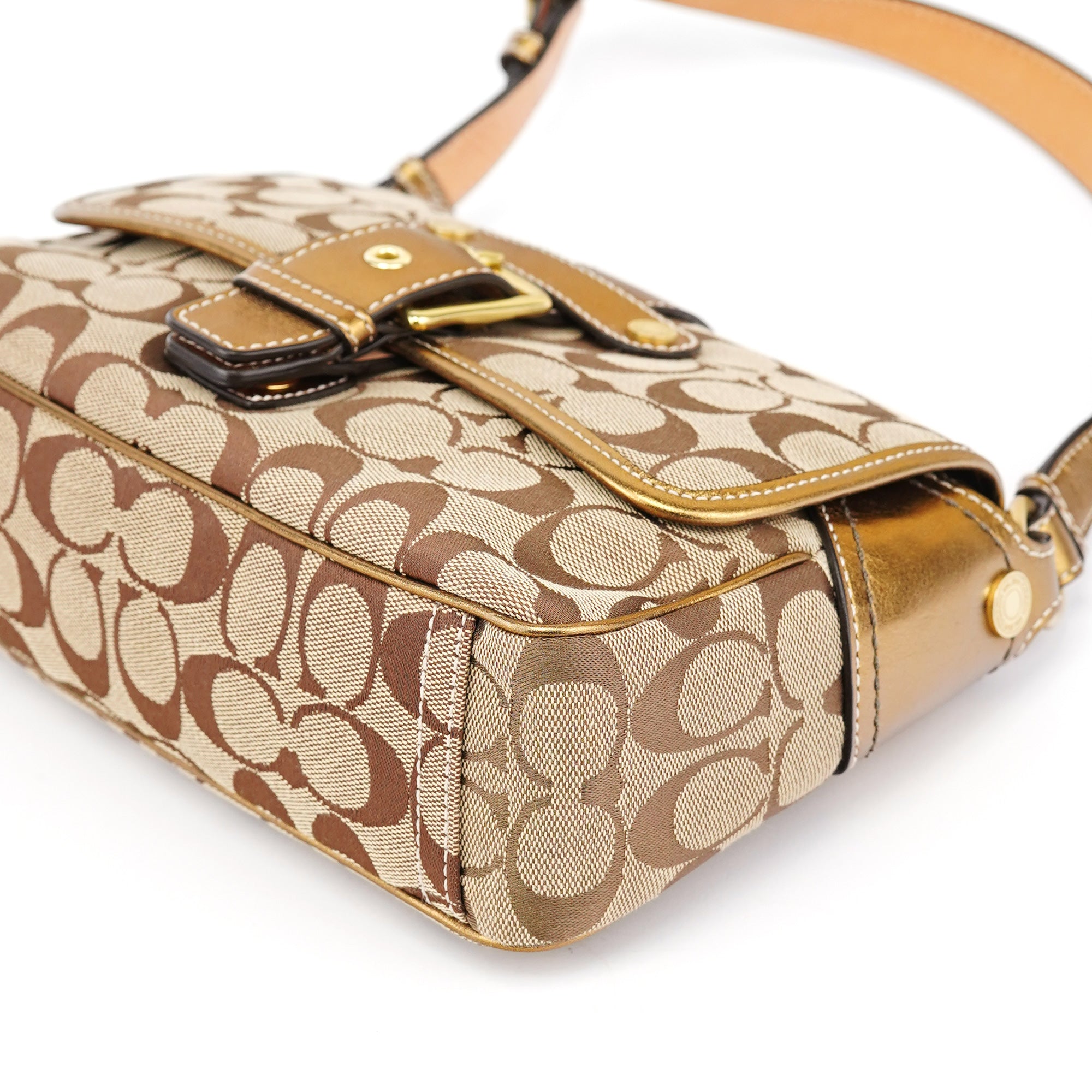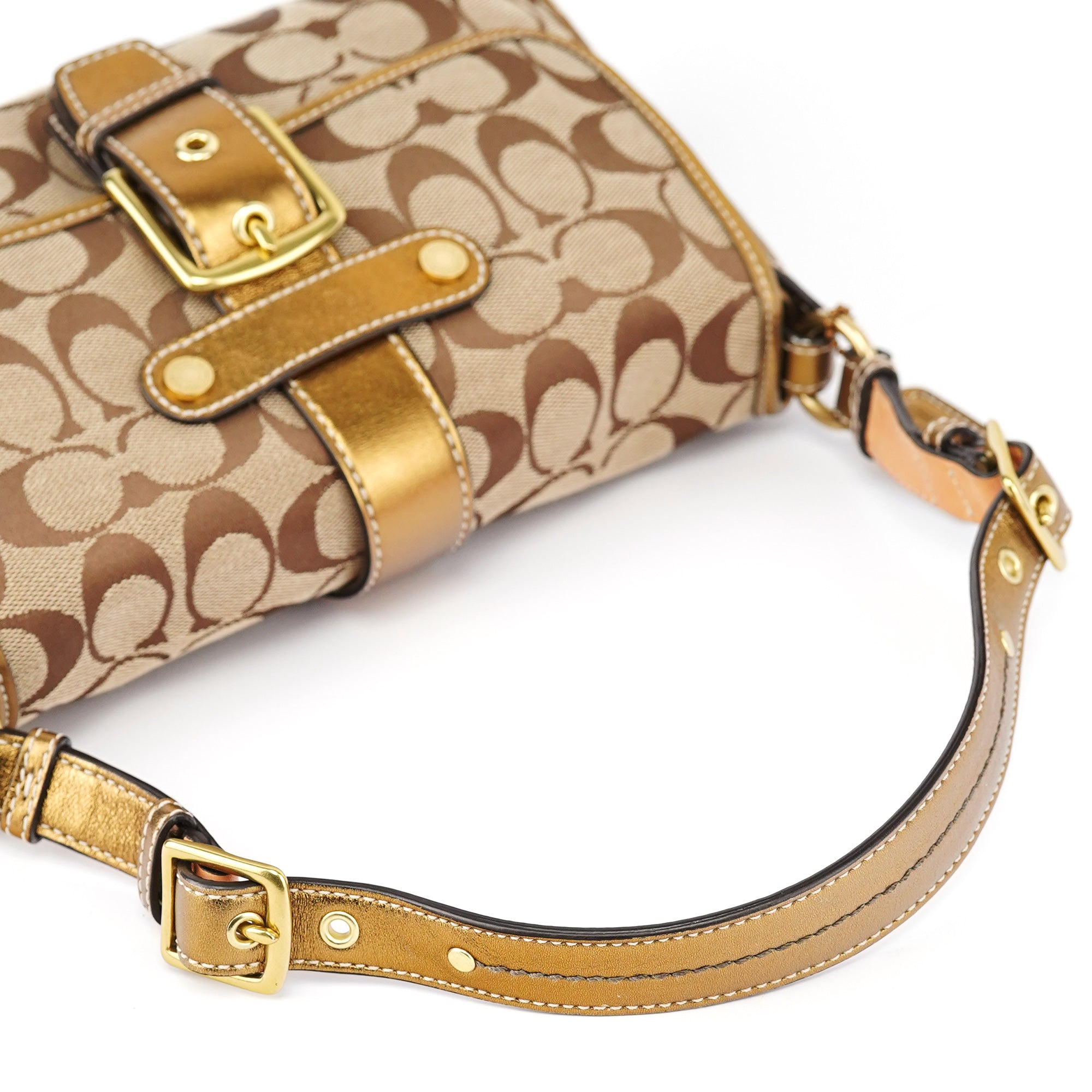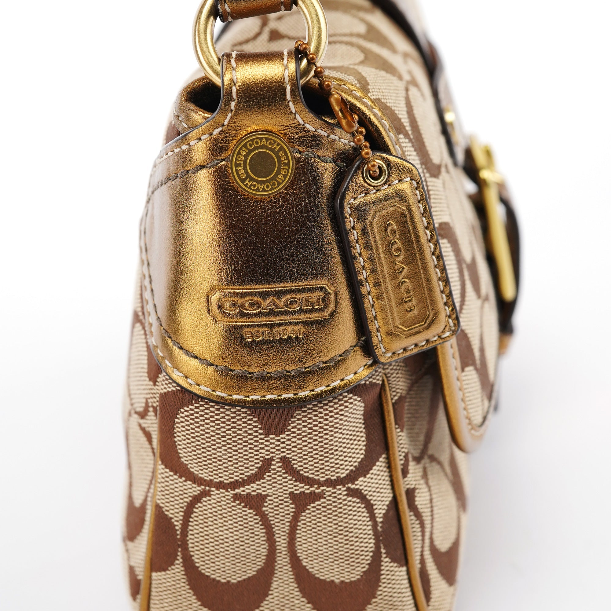 Designed in the early 2000s, this Coach Soho shoulder bag is crafted in beige signature canvas with metallic gold leather trim and a front buckle closure. The structured flap design opens to a fabric-lined interior with functional compartments, perfect for everyday use.