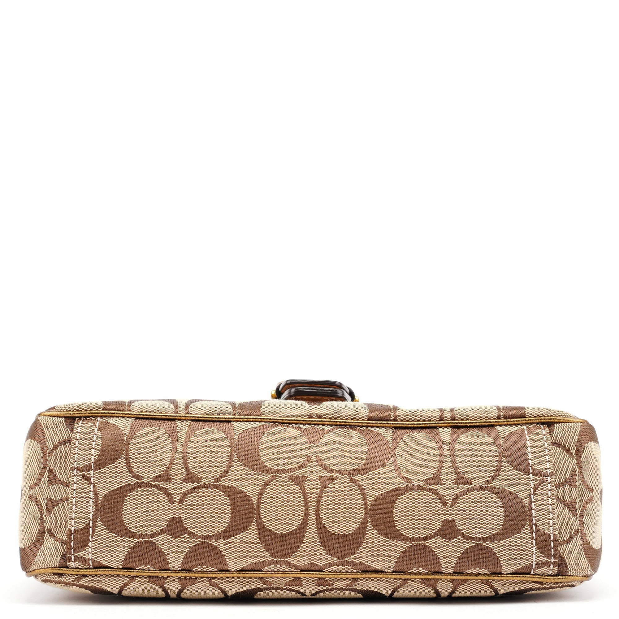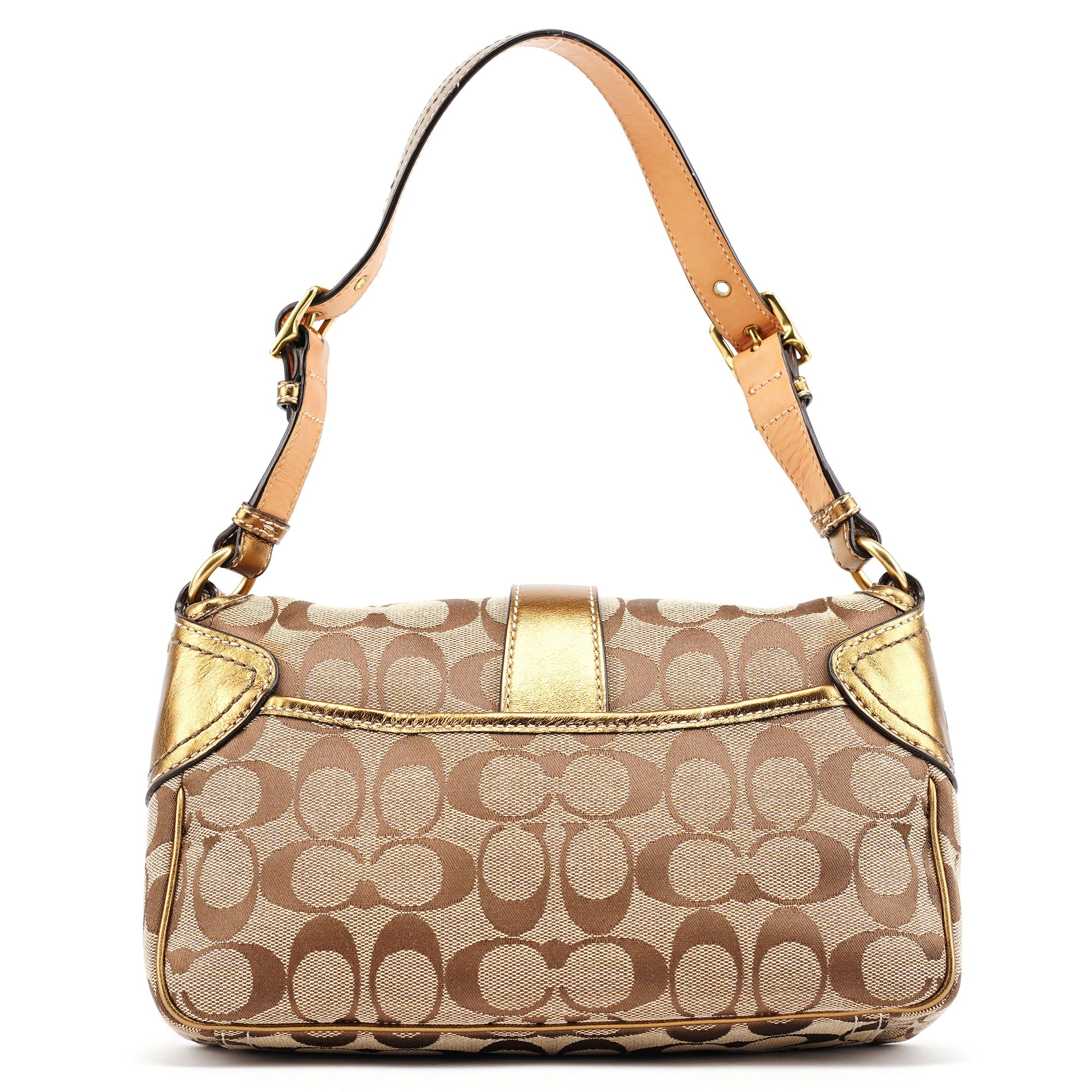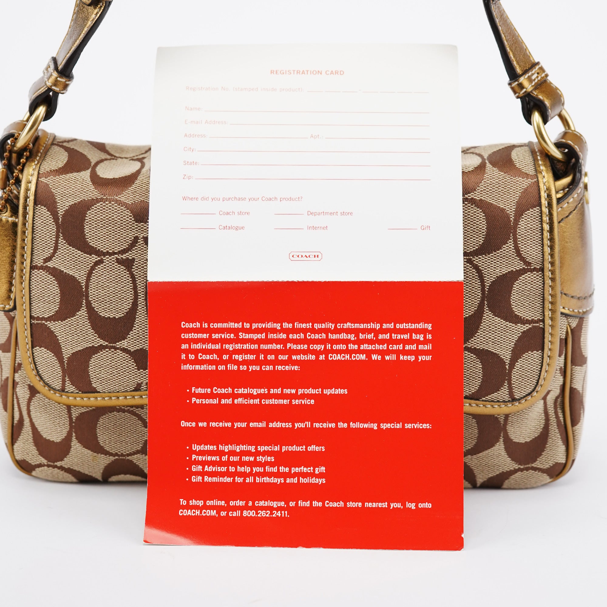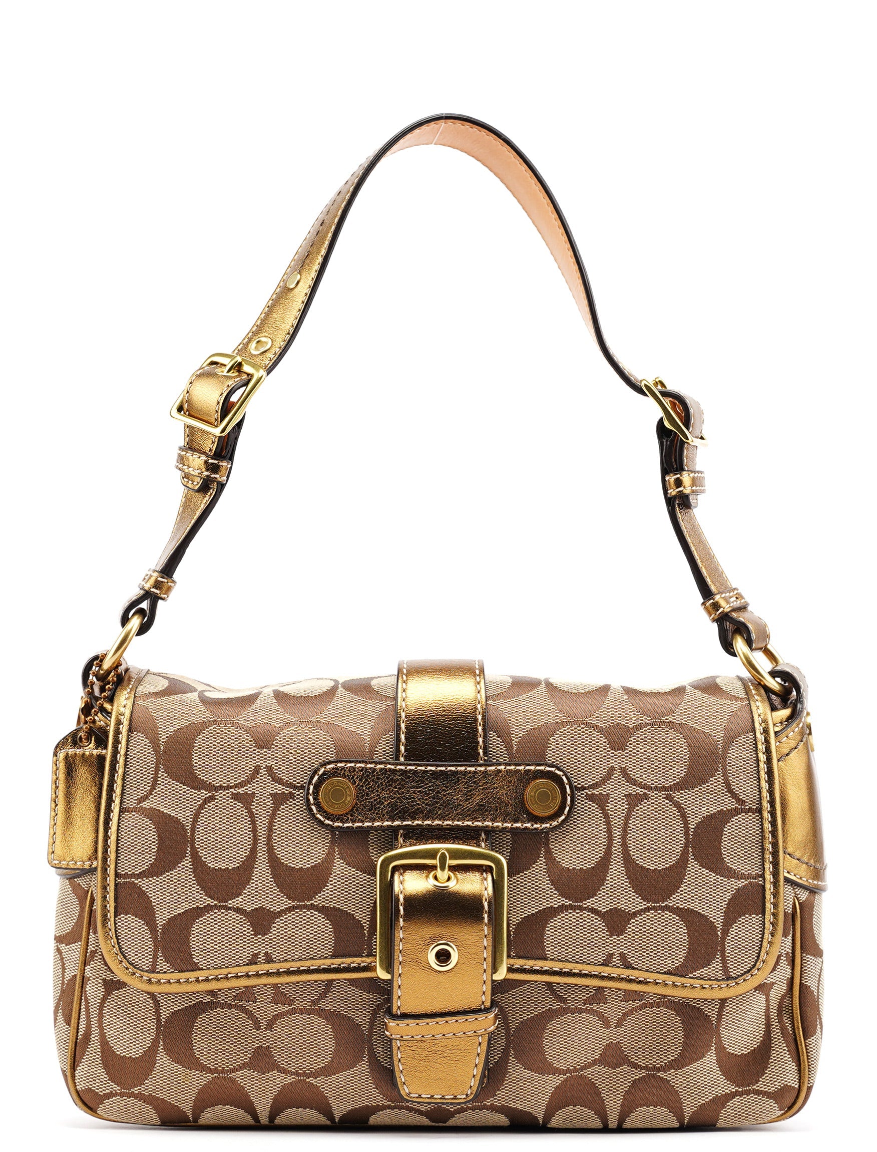 Designed in the early 2000s, this Coach Soho shoulder bag is crafted in beige signature canvas with metallic gold leather trim and a front buckle closure. The structured flap design opens to a fabric-lined interior with functional compartments, perfect for everyday use.