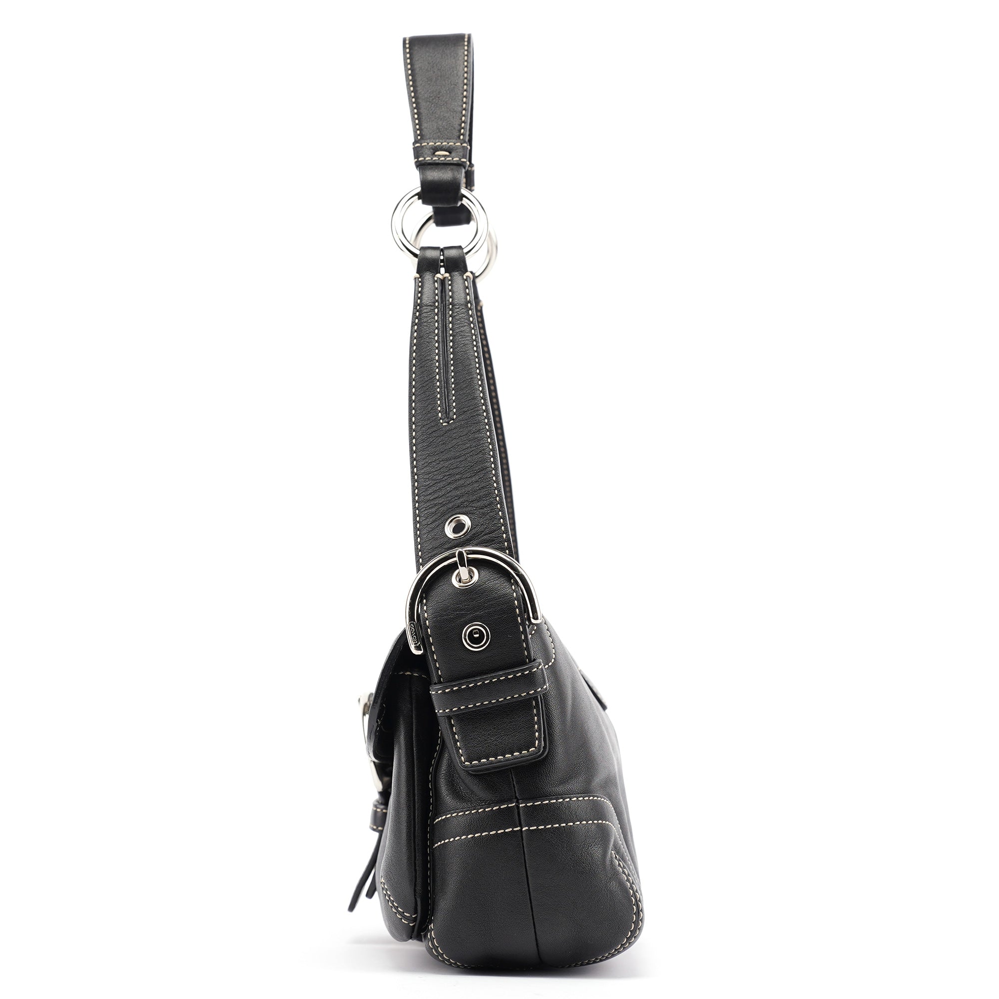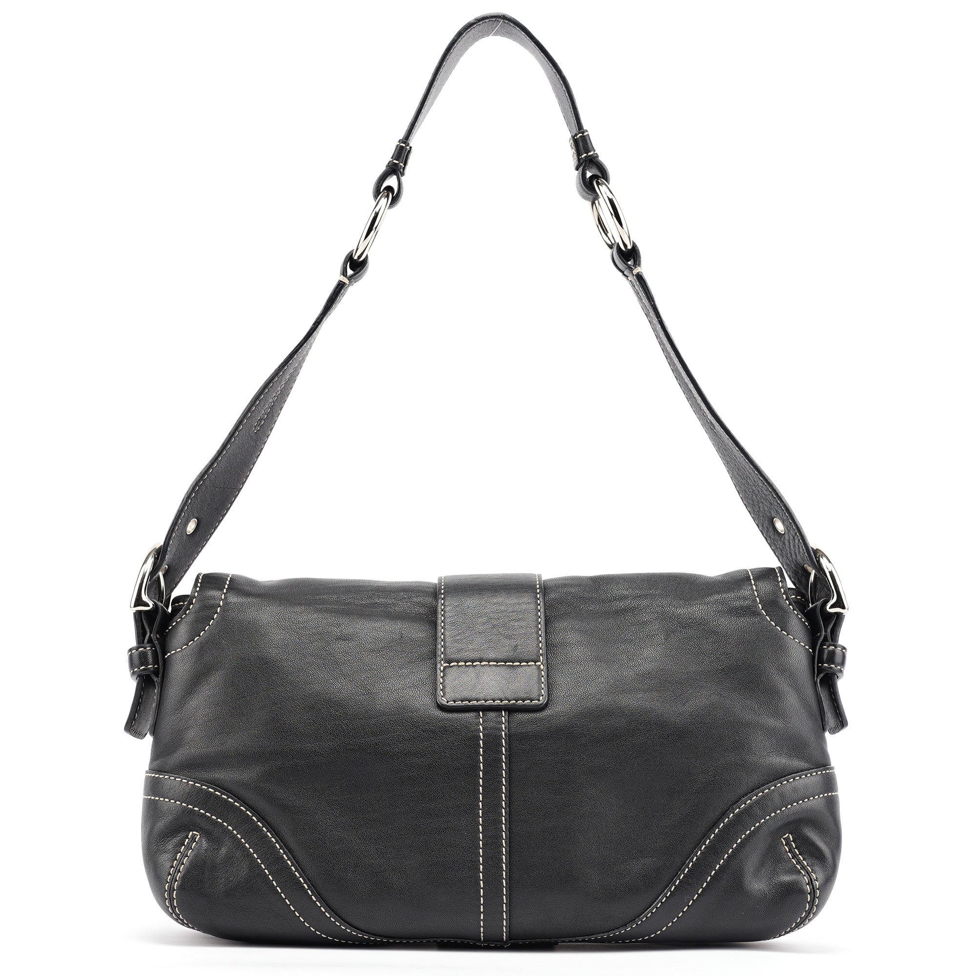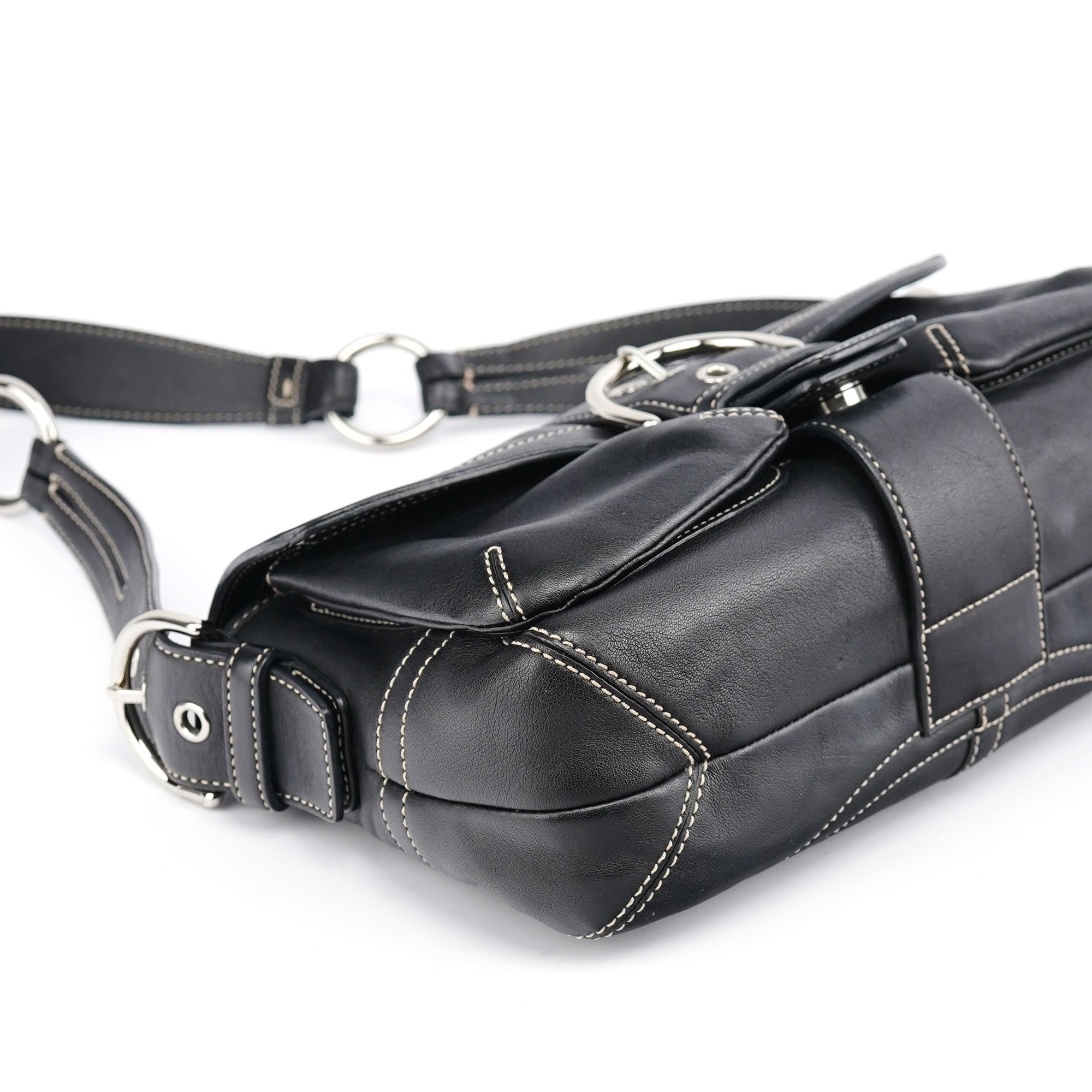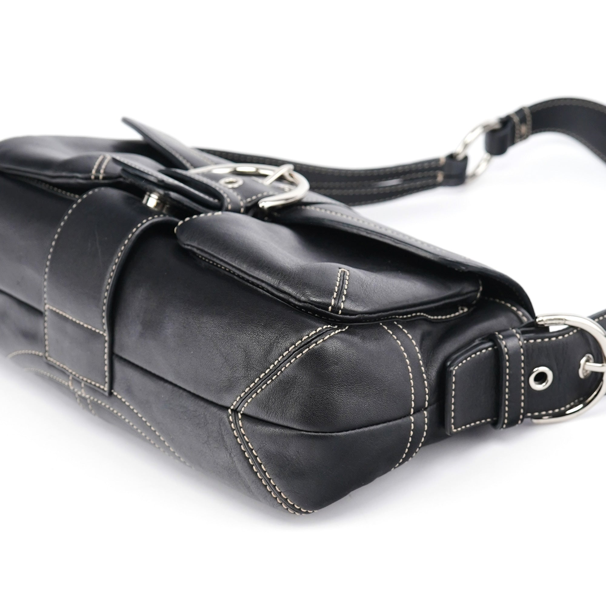 Designed in the early 2000s, this vintage Coach Soho shoulder bag is crafted from supple black leather with contrast white topstitching throughout. The classic flap-front design features silver-tone hardware including dual grommets and a signature buckle closure, with an adjustable shoulder strap for versatile wear. The streamlined silhouette represents Coach's modern American luxury aesthetic, offering both style and functionality with its spacious interior and exterior pocket.