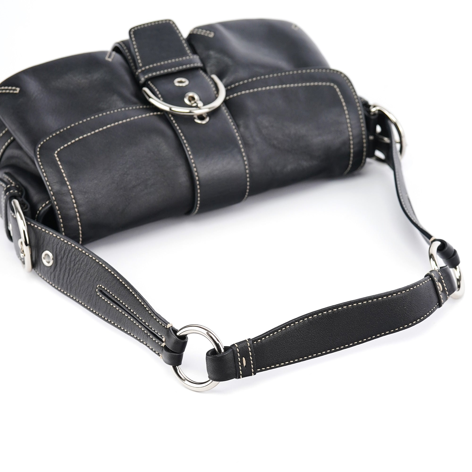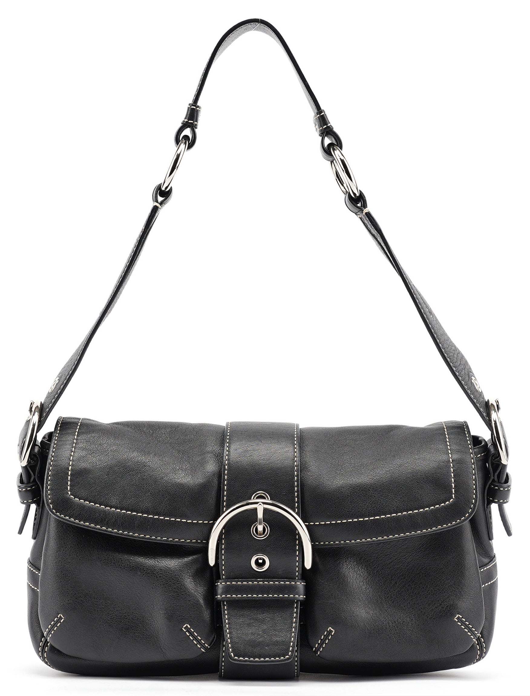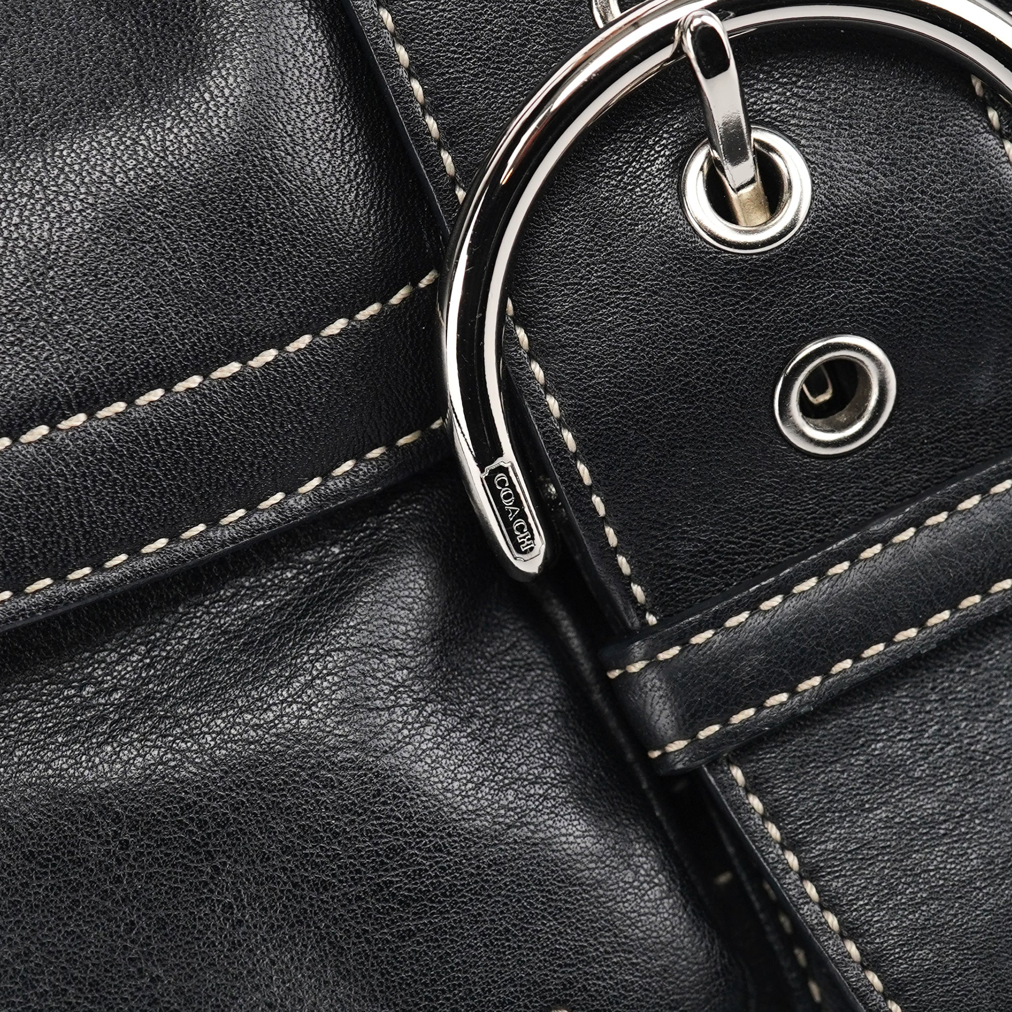 Designed in the early 2000s, this vintage Coach Soho shoulder bag is crafted from supple black leather with contrast white topstitching throughout. The classic flap-front design features silver-tone hardware including dual grommets and a signature buckle closure, with an adjustable shoulder strap for versatile wear. The streamlined silhouette represents Coach's modern American luxury aesthetic, offering both style and functionality with its spacious interior and exterior pocket.