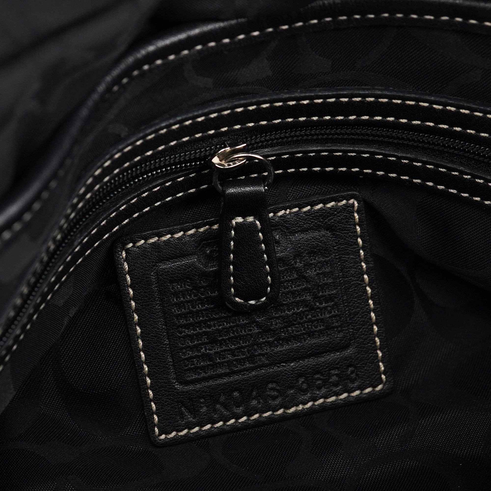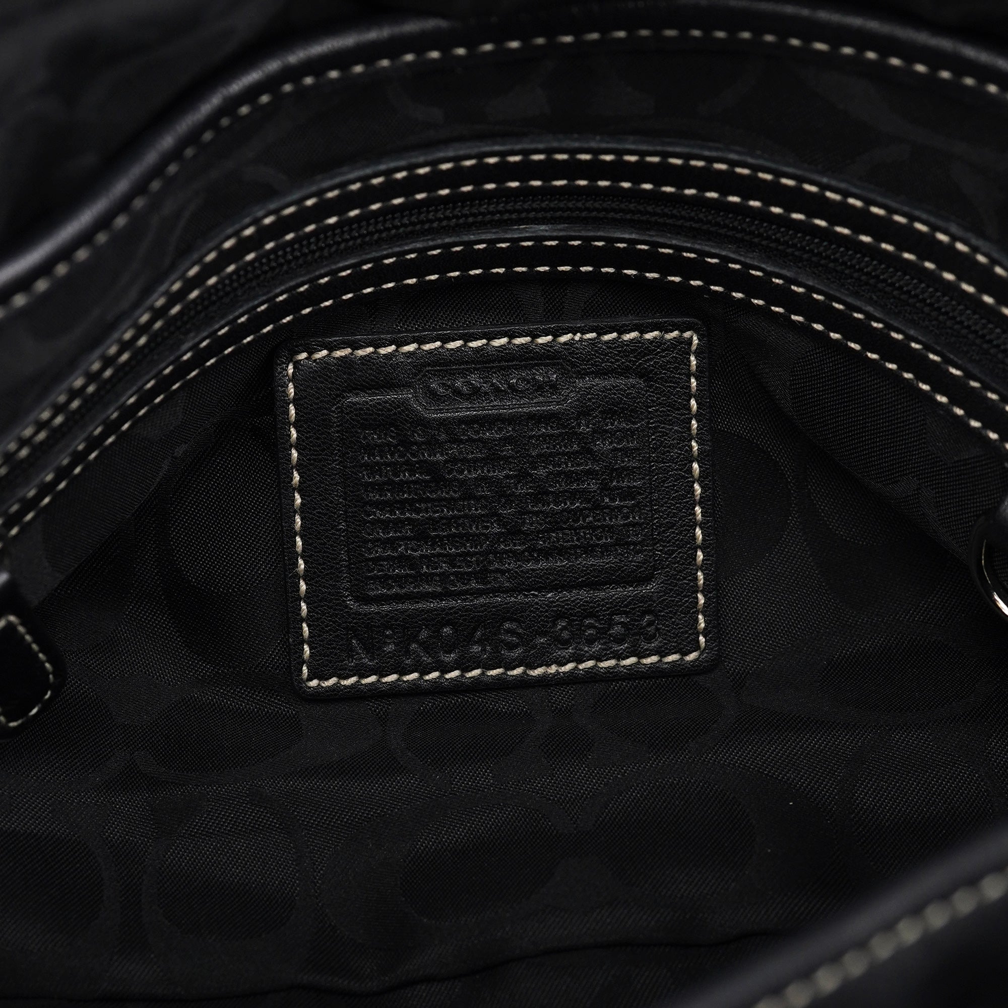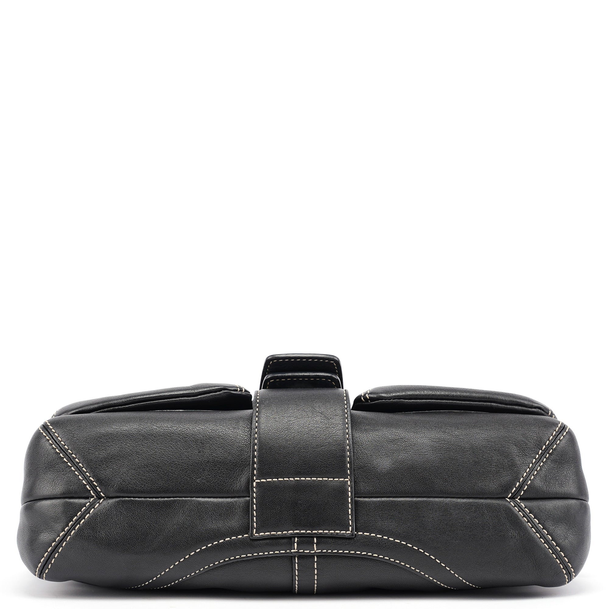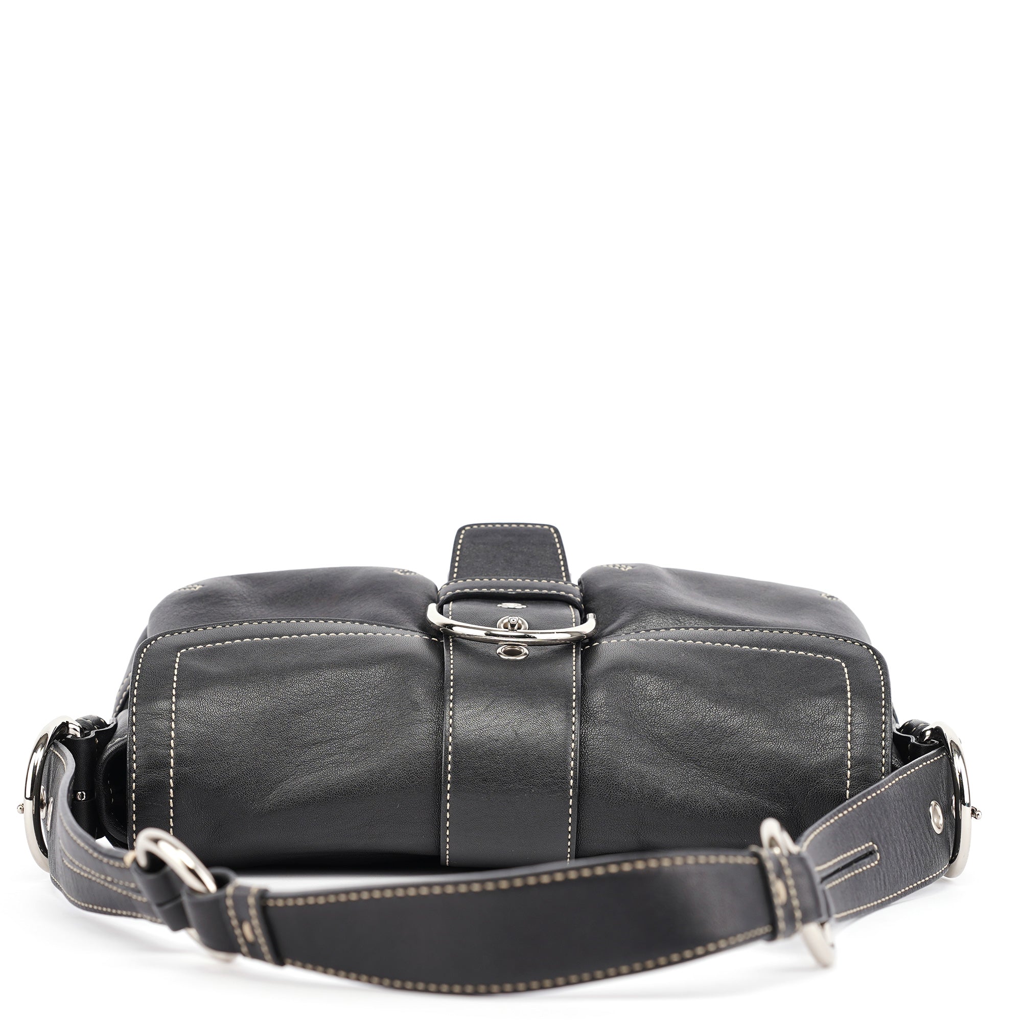 Designed in the early 2000s, this vintage Coach Soho shoulder bag is crafted from supple black leather with contrast white topstitching throughout. The classic flap-front design features silver-tone hardware including dual grommets and a signature buckle closure, with an adjustable shoulder strap for versatile wear. The streamlined silhouette represents Coach's modern American luxury aesthetic, offering both style and functionality with its spacious interior and exterior pocket.