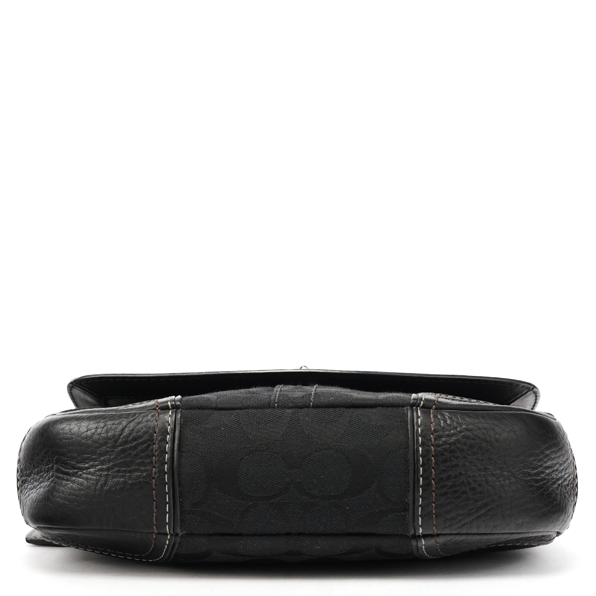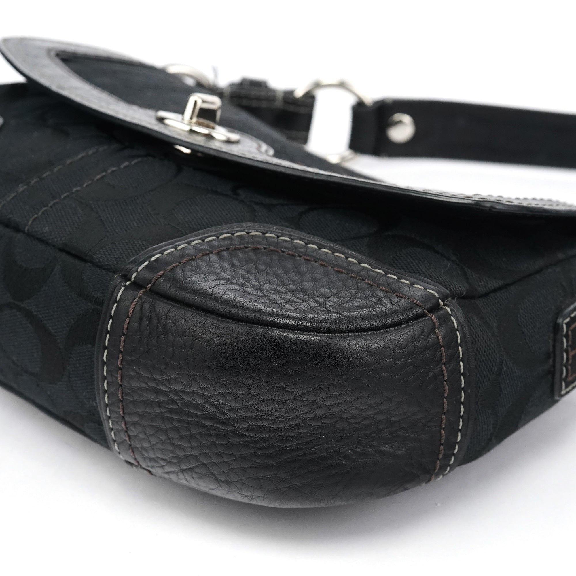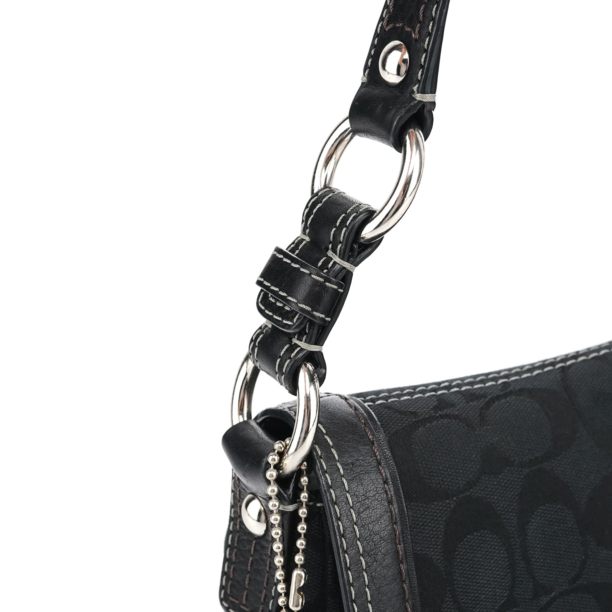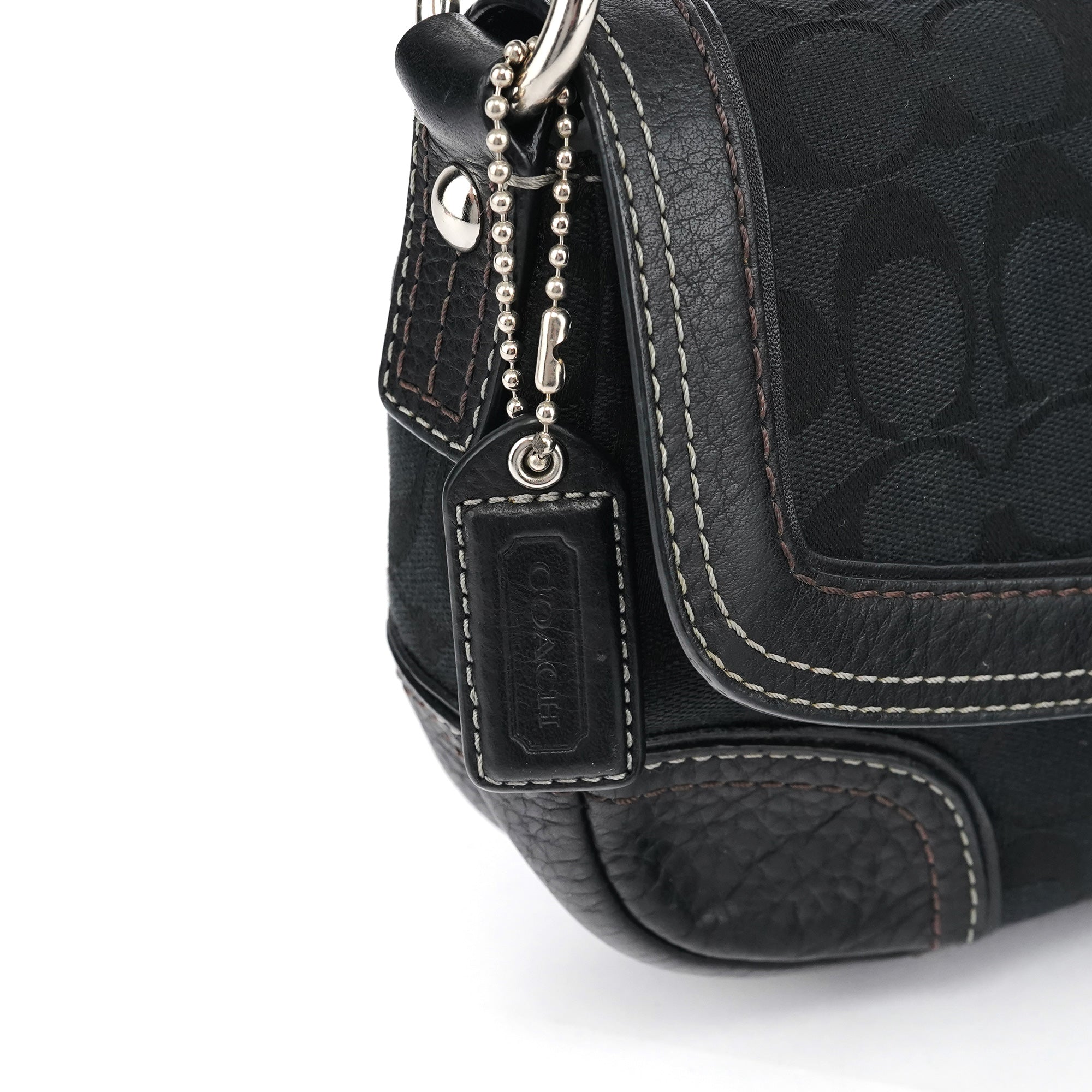 Designed in the early 2000s, this Coach Soho shoulder bag is crafted in black signature jacquard with leather trim and contrast stitching. It has a flap with turn-lock closure, silver-tone hardware, a short chain-accented strap, and a lined interior with a zip pocket.