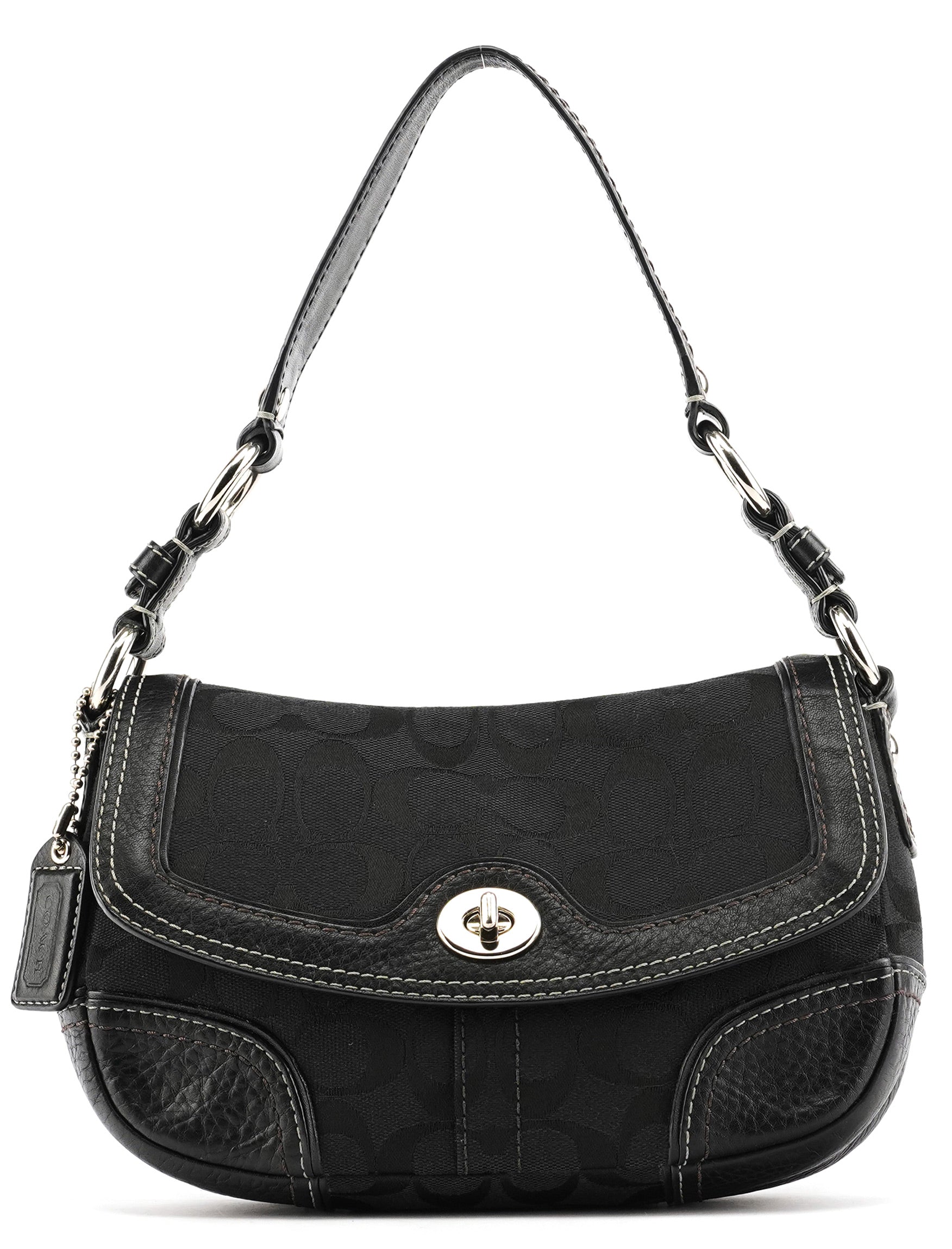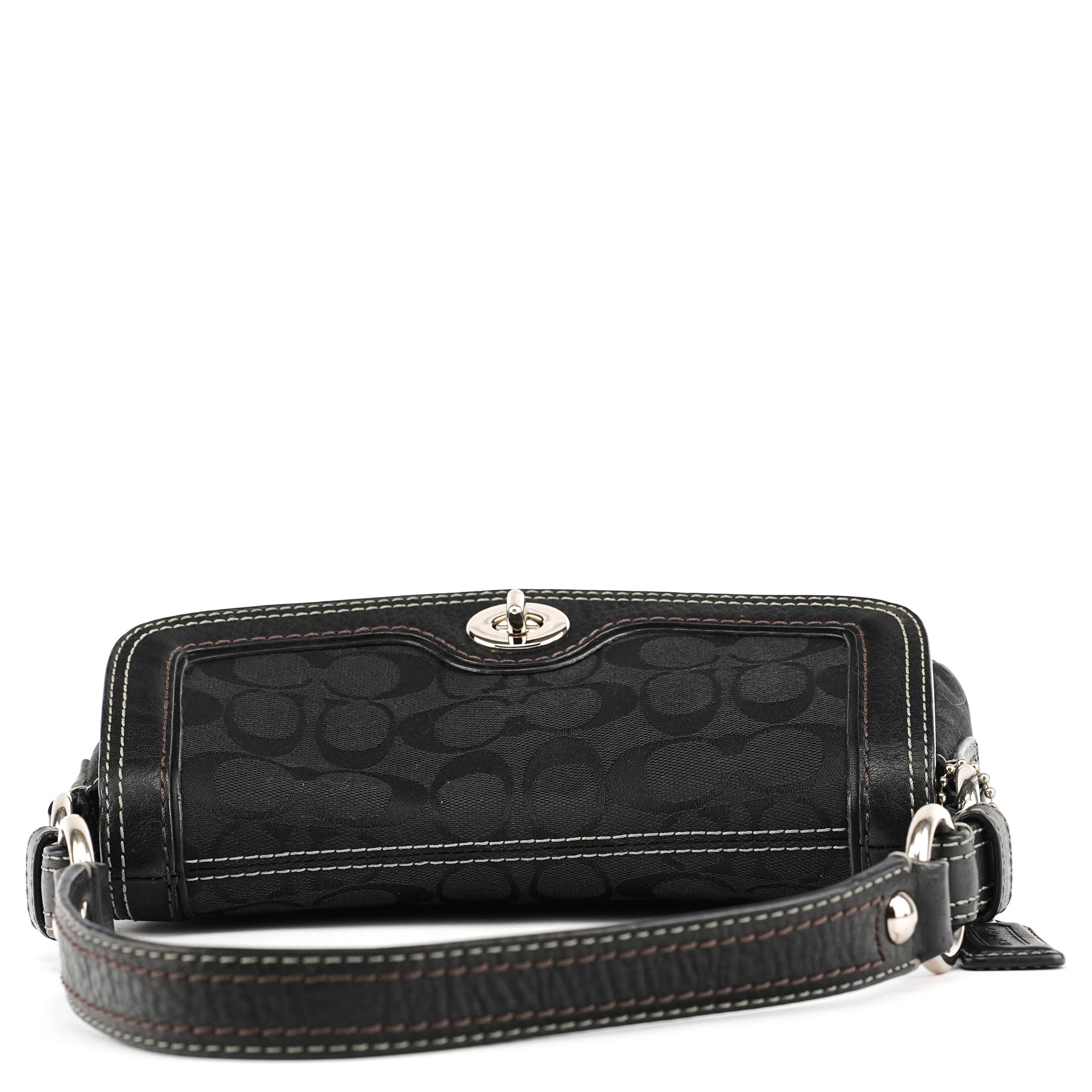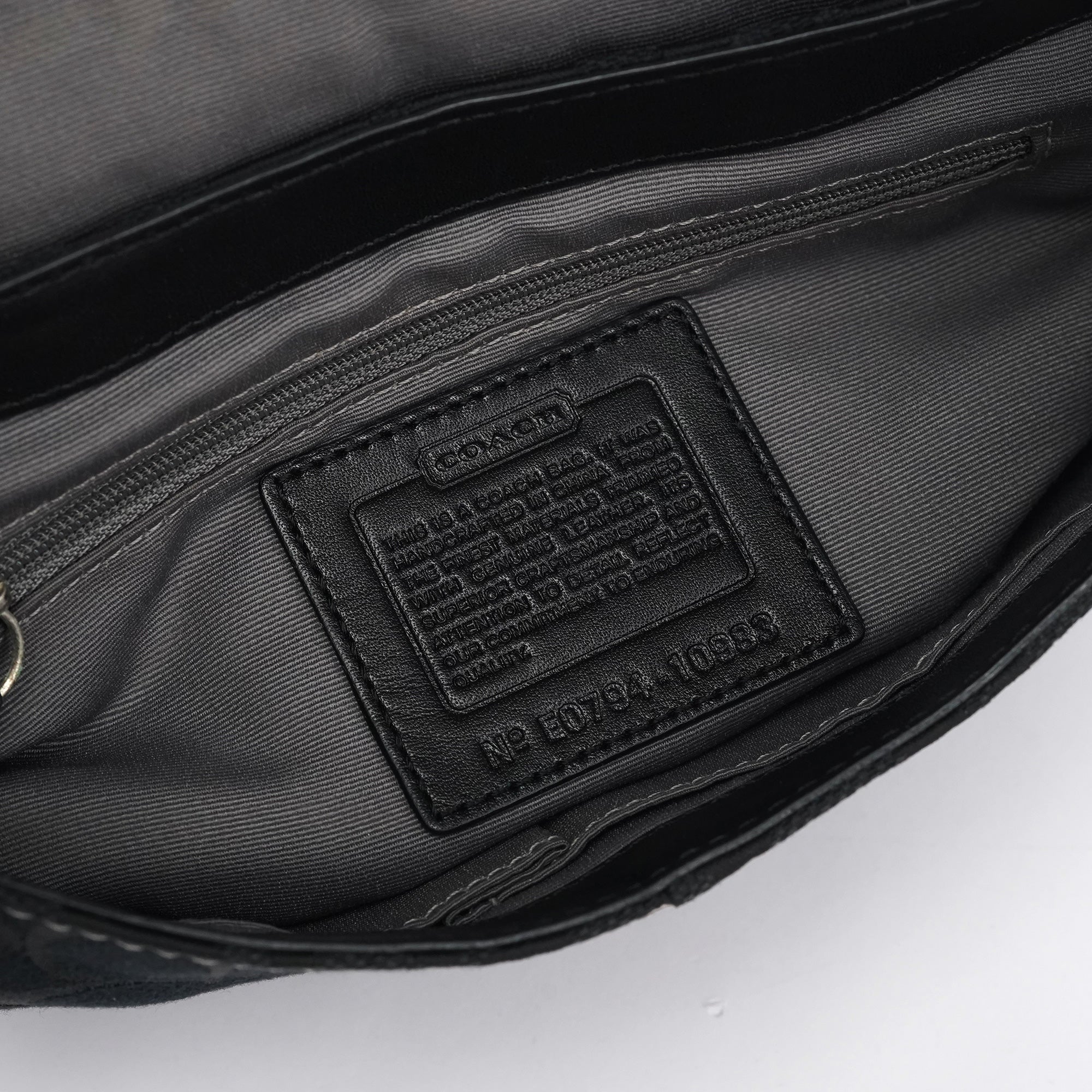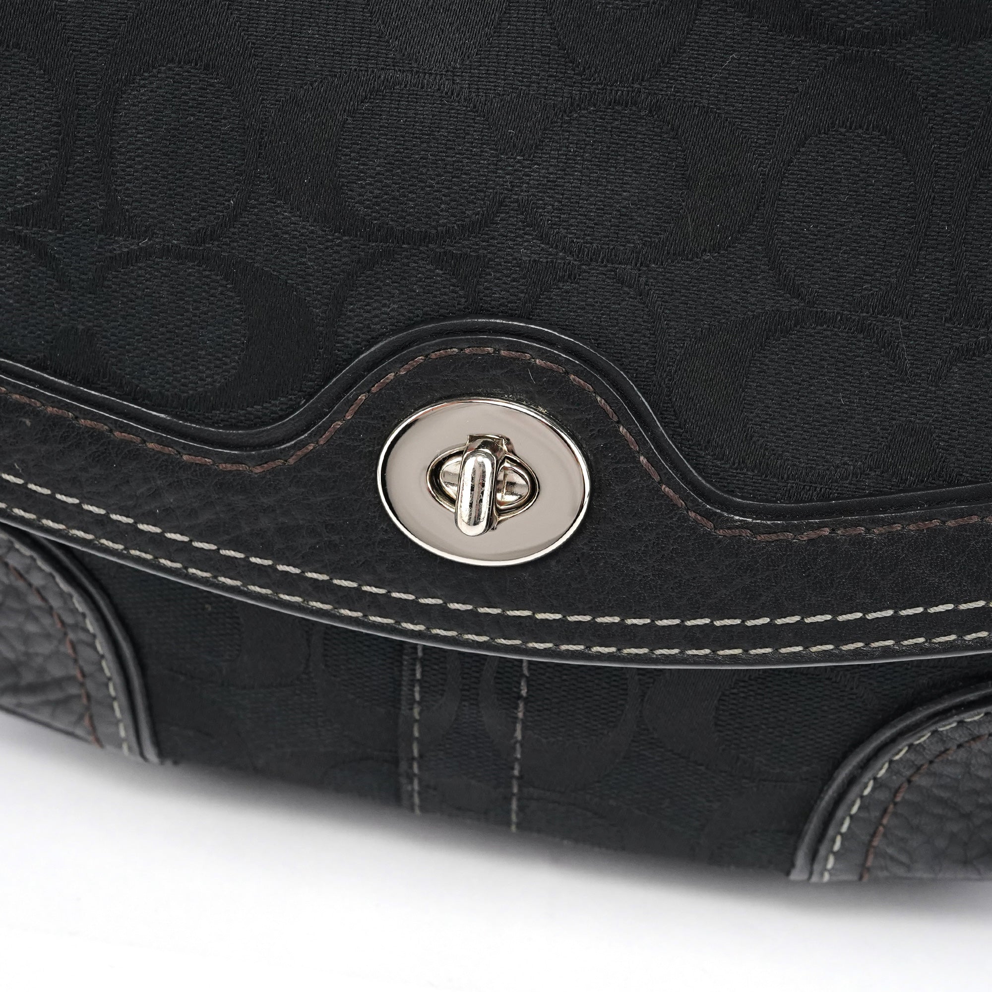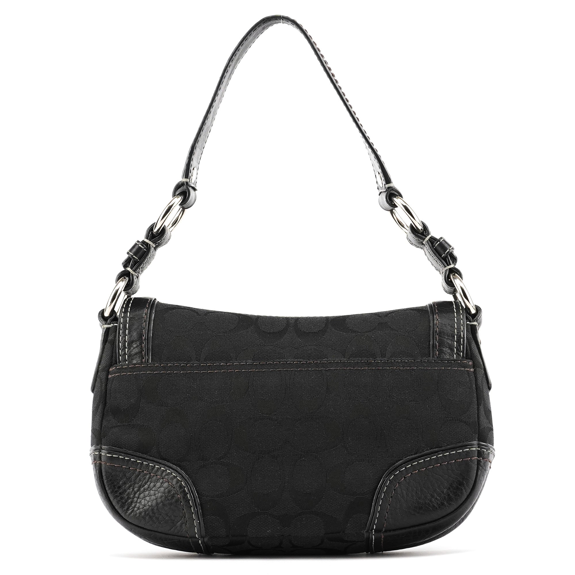 Designed in the early 2000s, this Coach Soho shoulder bag is crafted in black signature jacquard with leather trim and contrast stitching. It has a flap with turn-lock closure, silver-tone hardware, a short chain-accented strap, and a lined interior with a zip pocket.