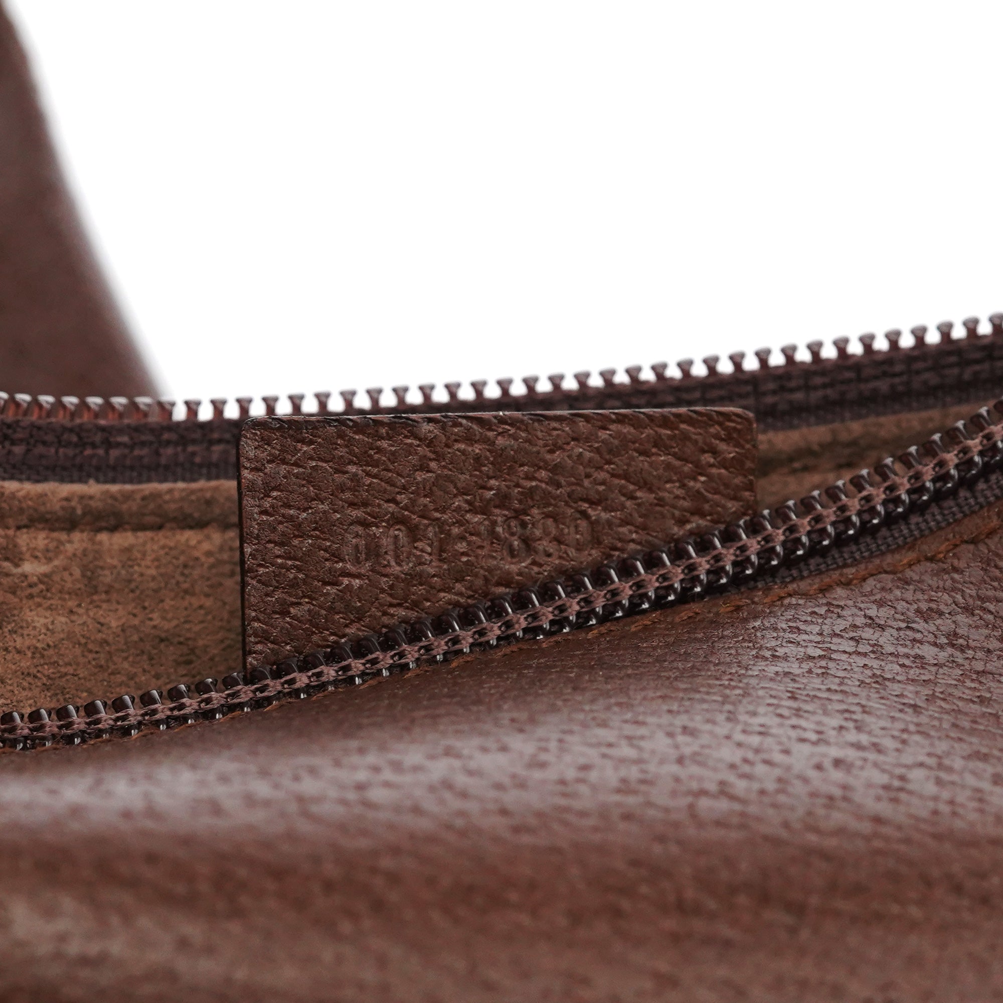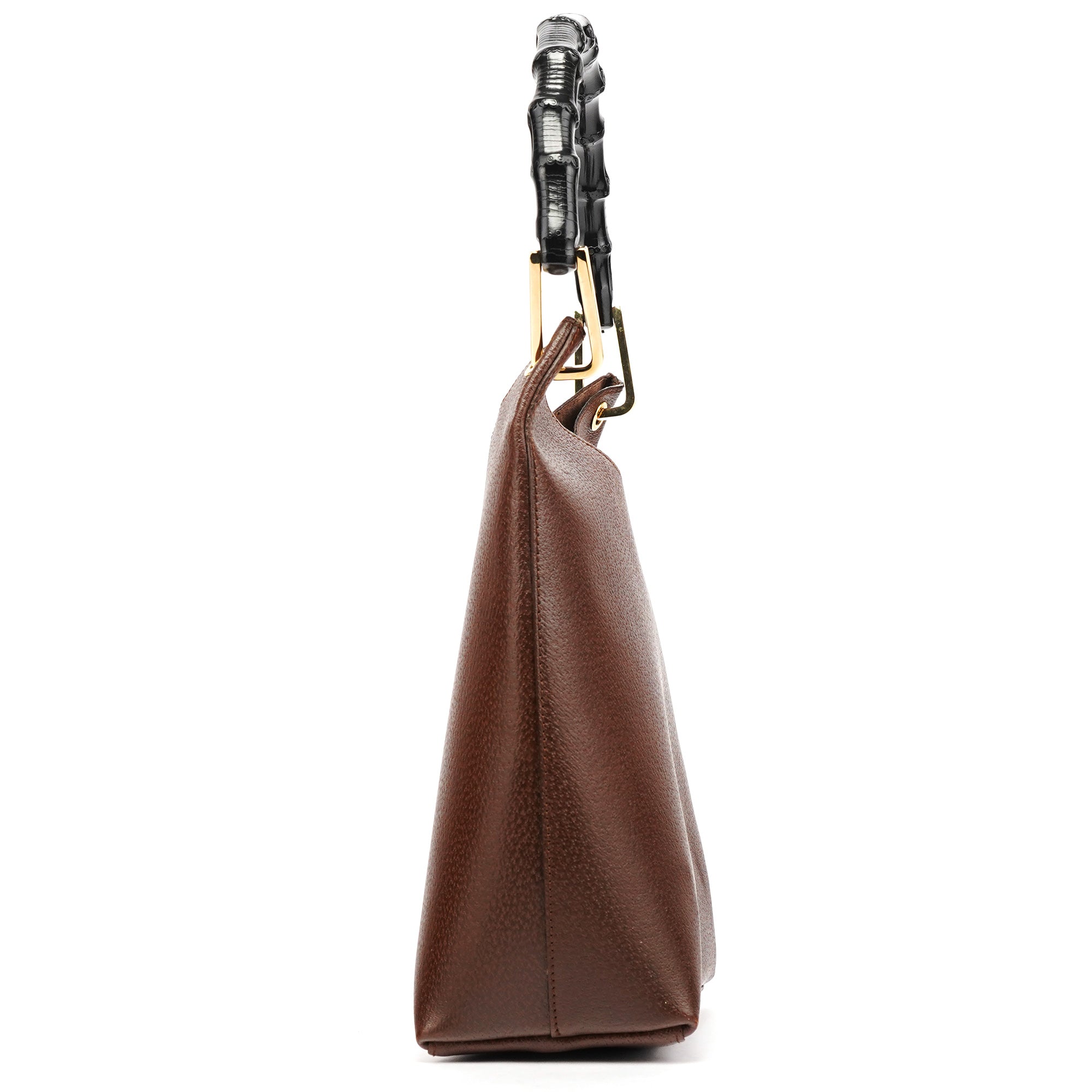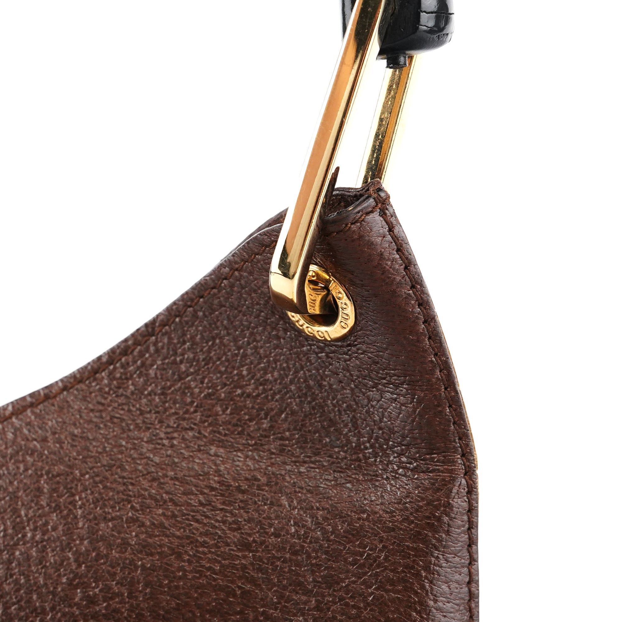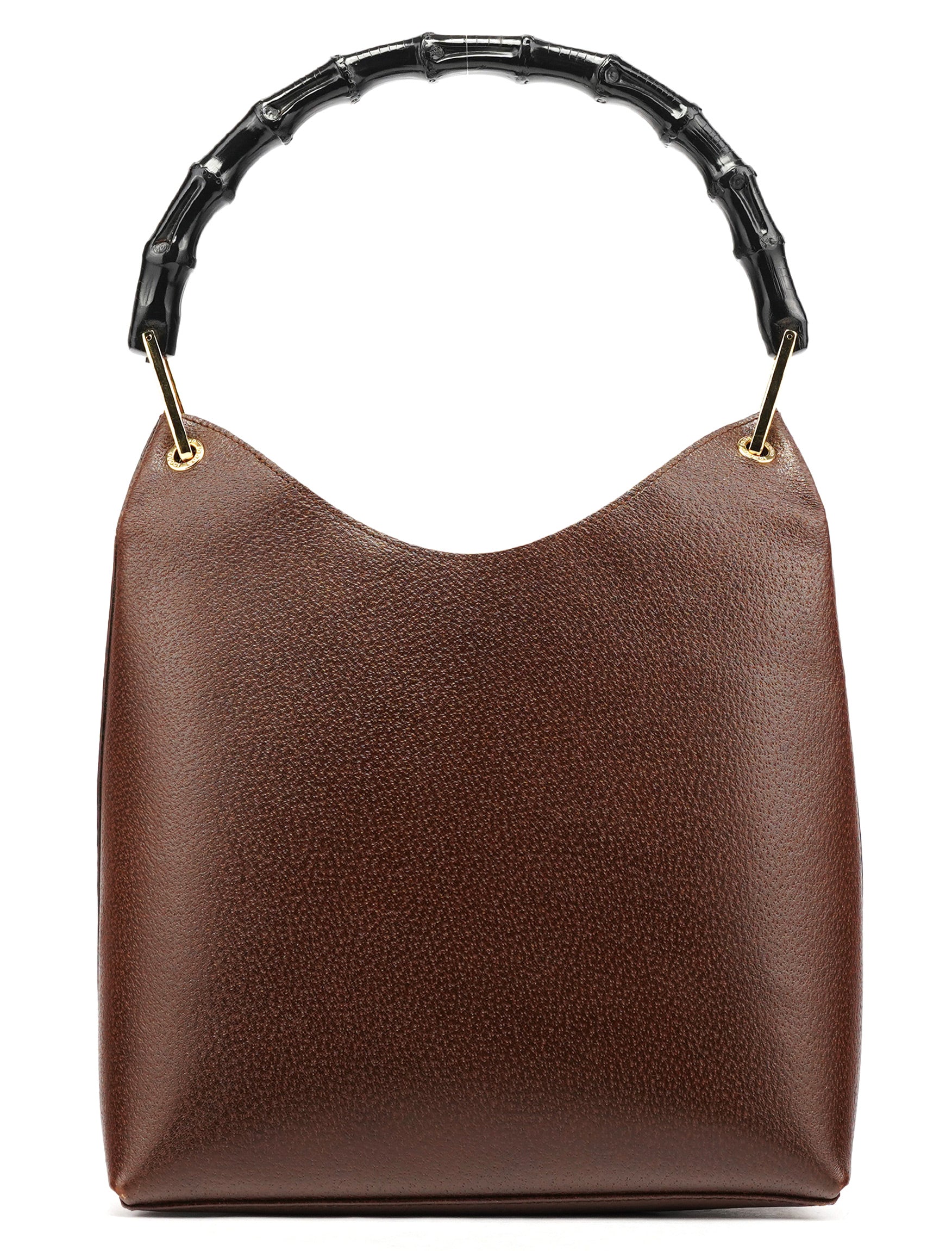 Designed in the late 1990s by Tom Ford, this Gucci Bamboo hobo is crafted from dark brown, richly textured leather with a curved open top. It features a black lacquered bamboo top handle and gold-tone hardware. The interior is lined in suede, secured by a top zipper closure, and includes a detachable leather pouch.
