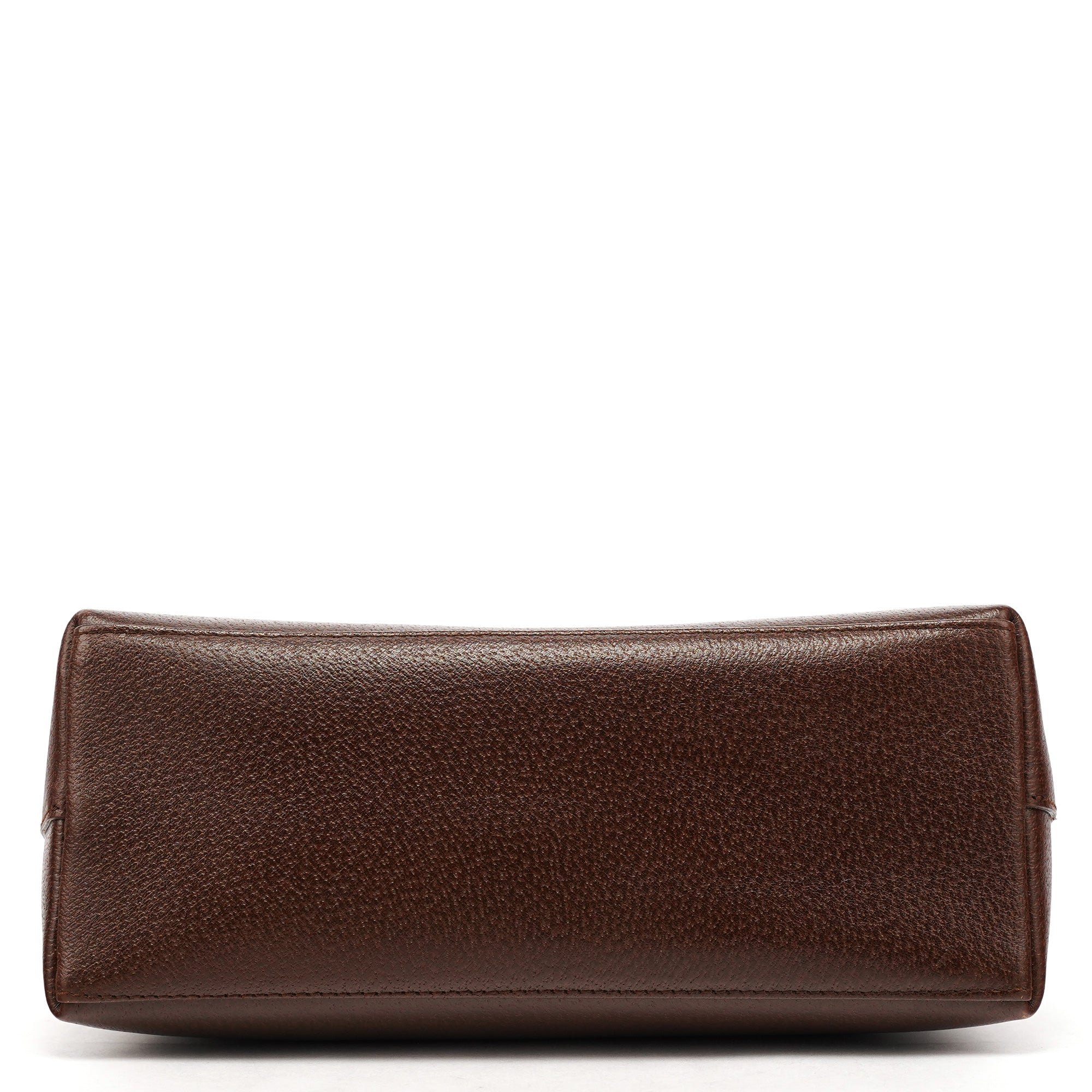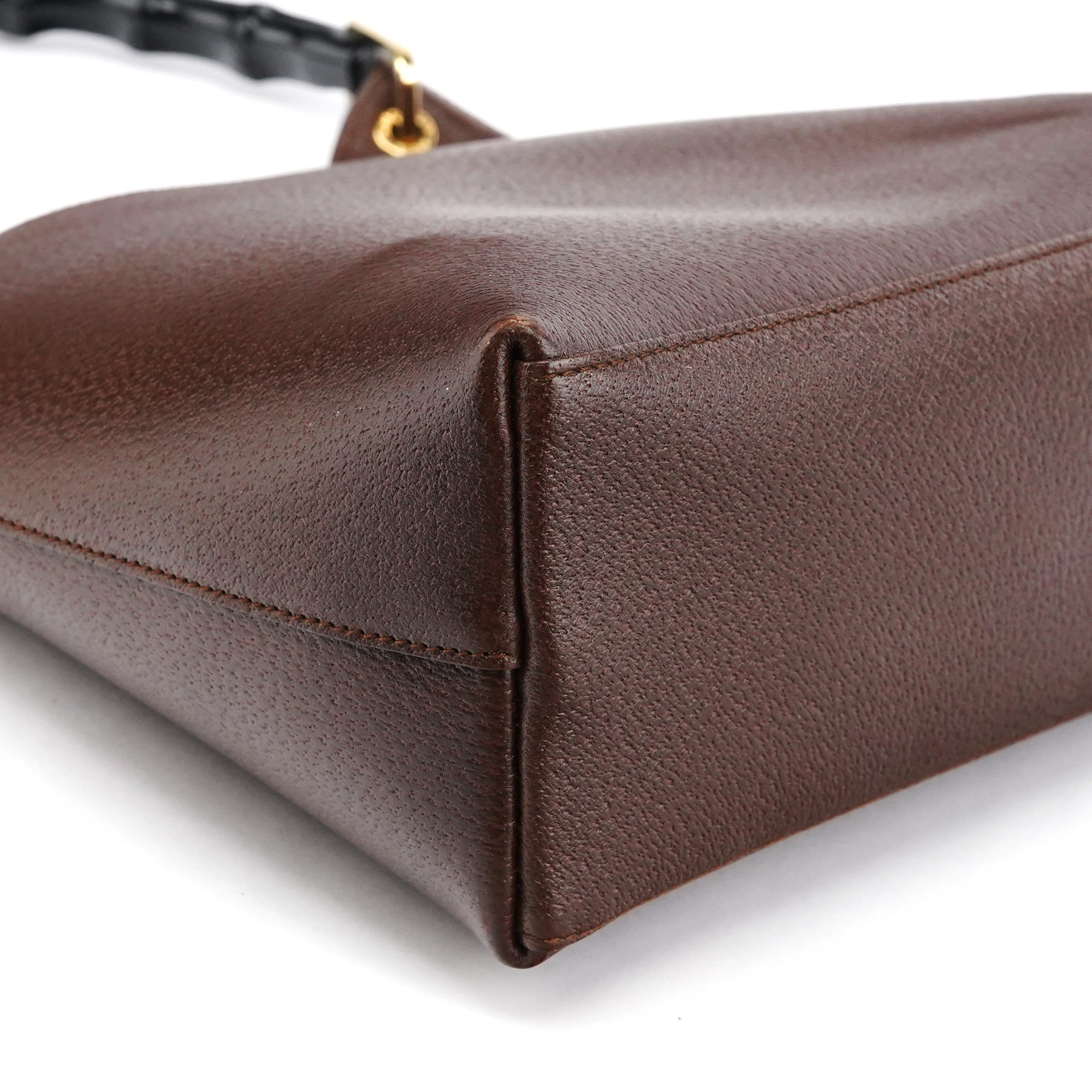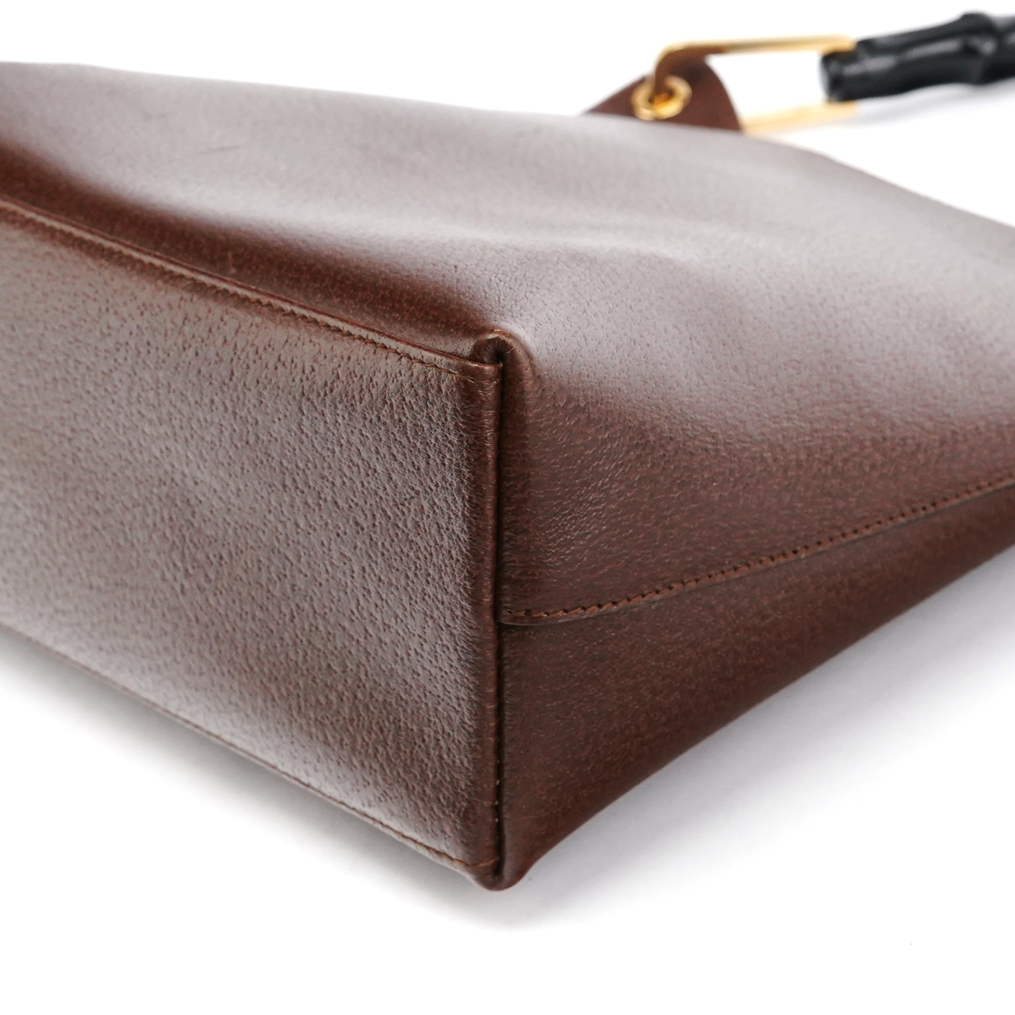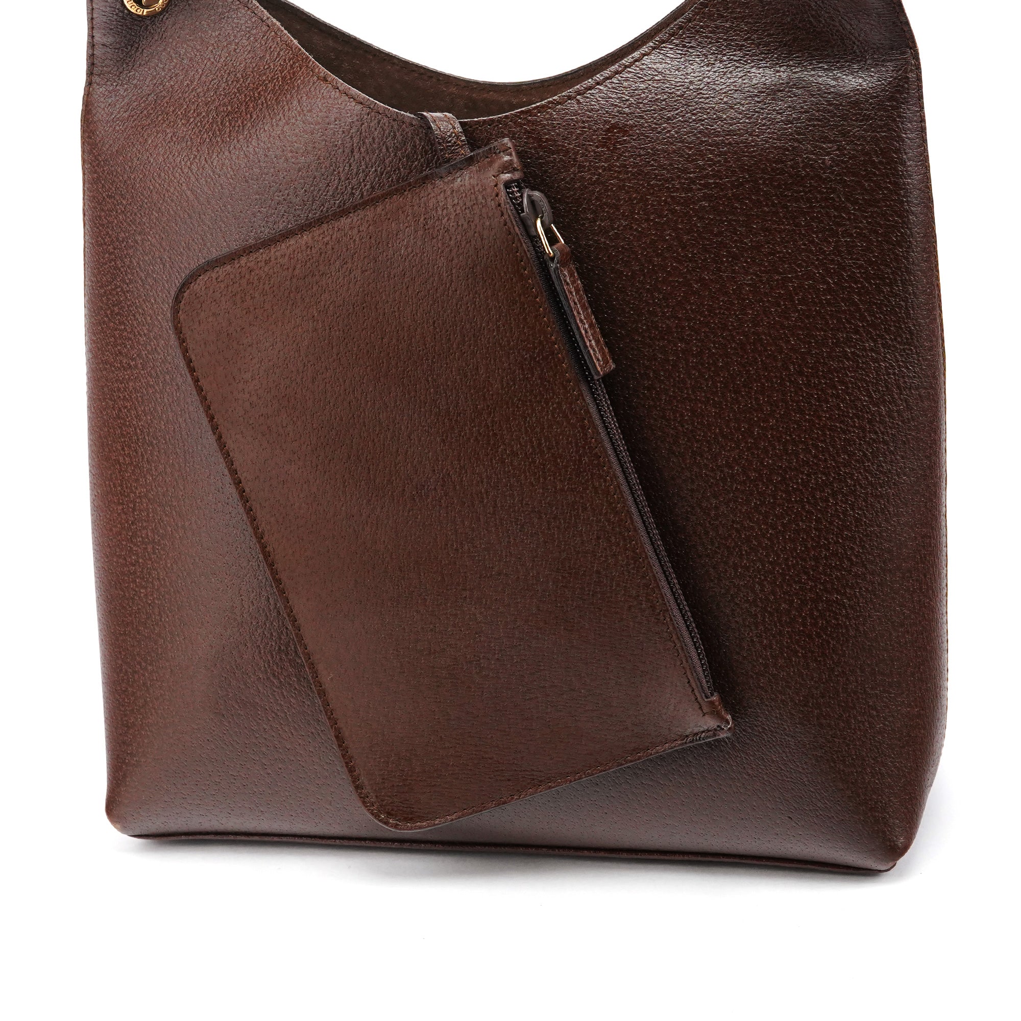 Designed in the late 1990s by Tom Ford, this Gucci Bamboo hobo is crafted from dark brown, richly textured leather with a curved open top. It features a black lacquered bamboo top handle and gold-tone hardware. The interior is lined in suede, secured by a top zipper closure, and includes a detachable leather pouch.