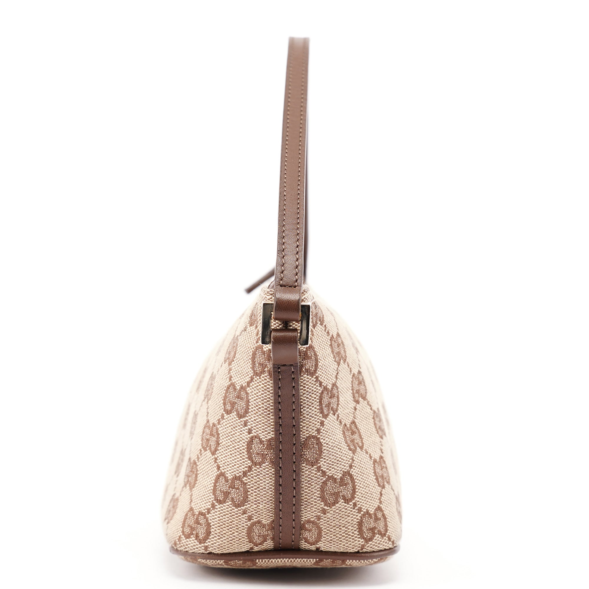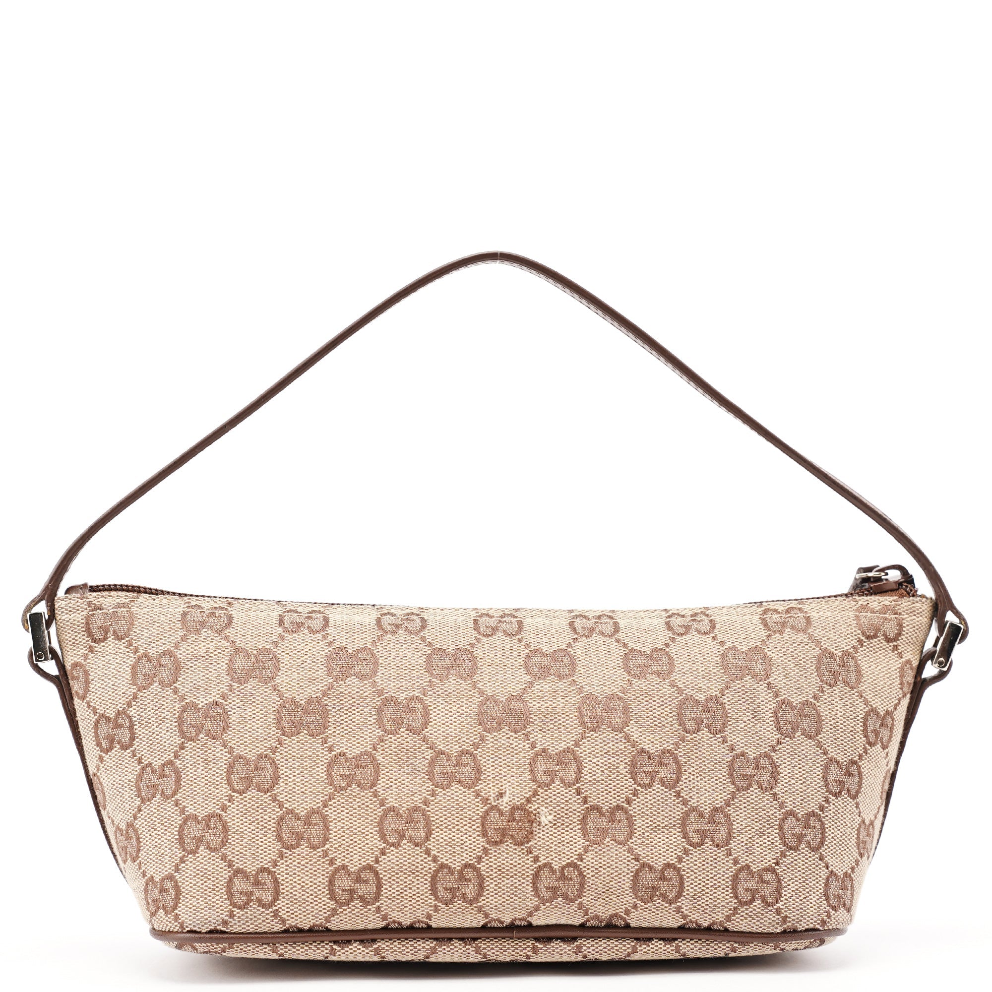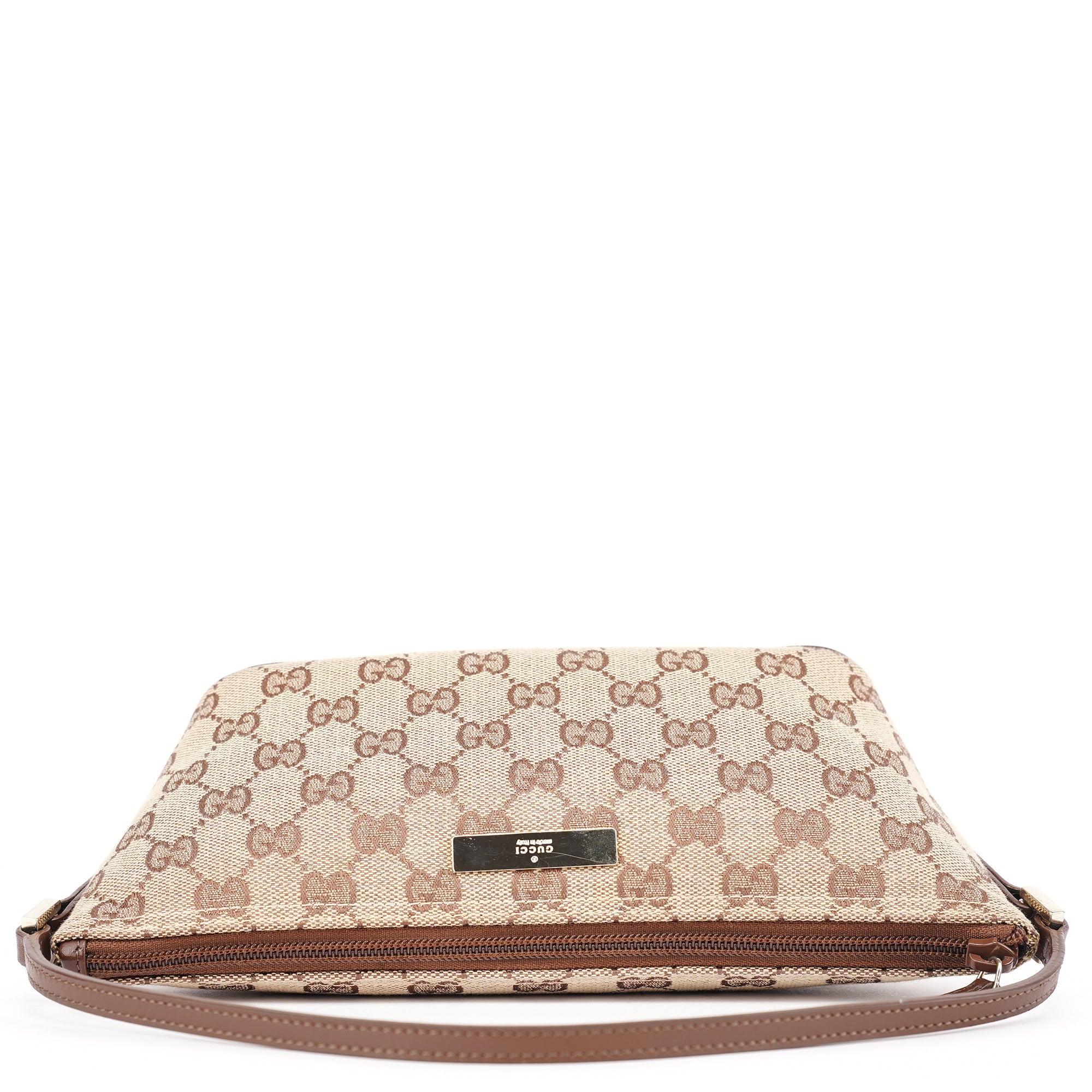 Designed in the late 1990s by Tom Ford, this Gucci GG Boat Pochette is crafted in beige GG monogram canvas with smooth brown leather trim and a tapered silhouette. The bag features a top zip closure with a silver-tone logo plaque and a structured leather shoulder strap. Lined in durable brown canvas, the interior includes a slip pocket for essentials.