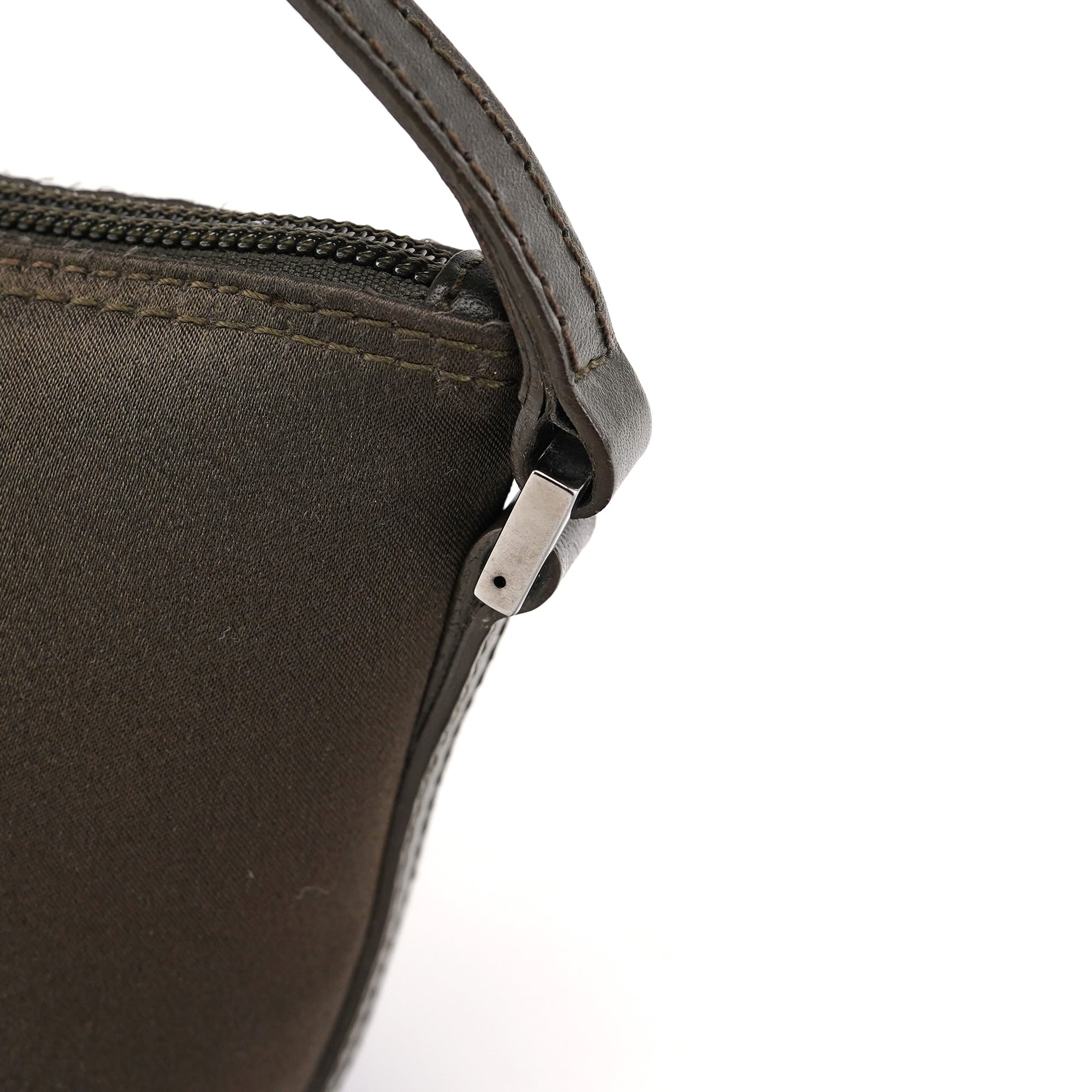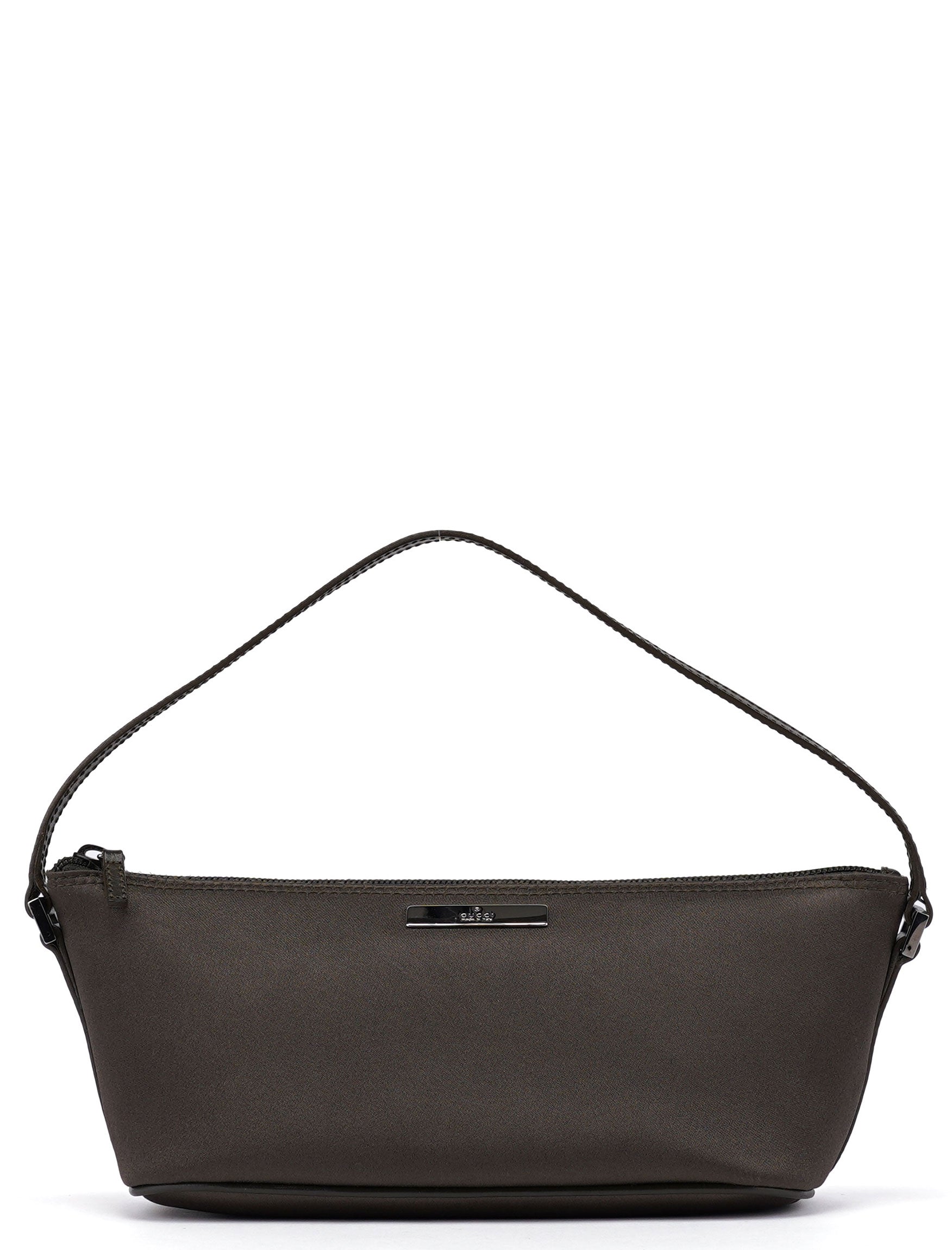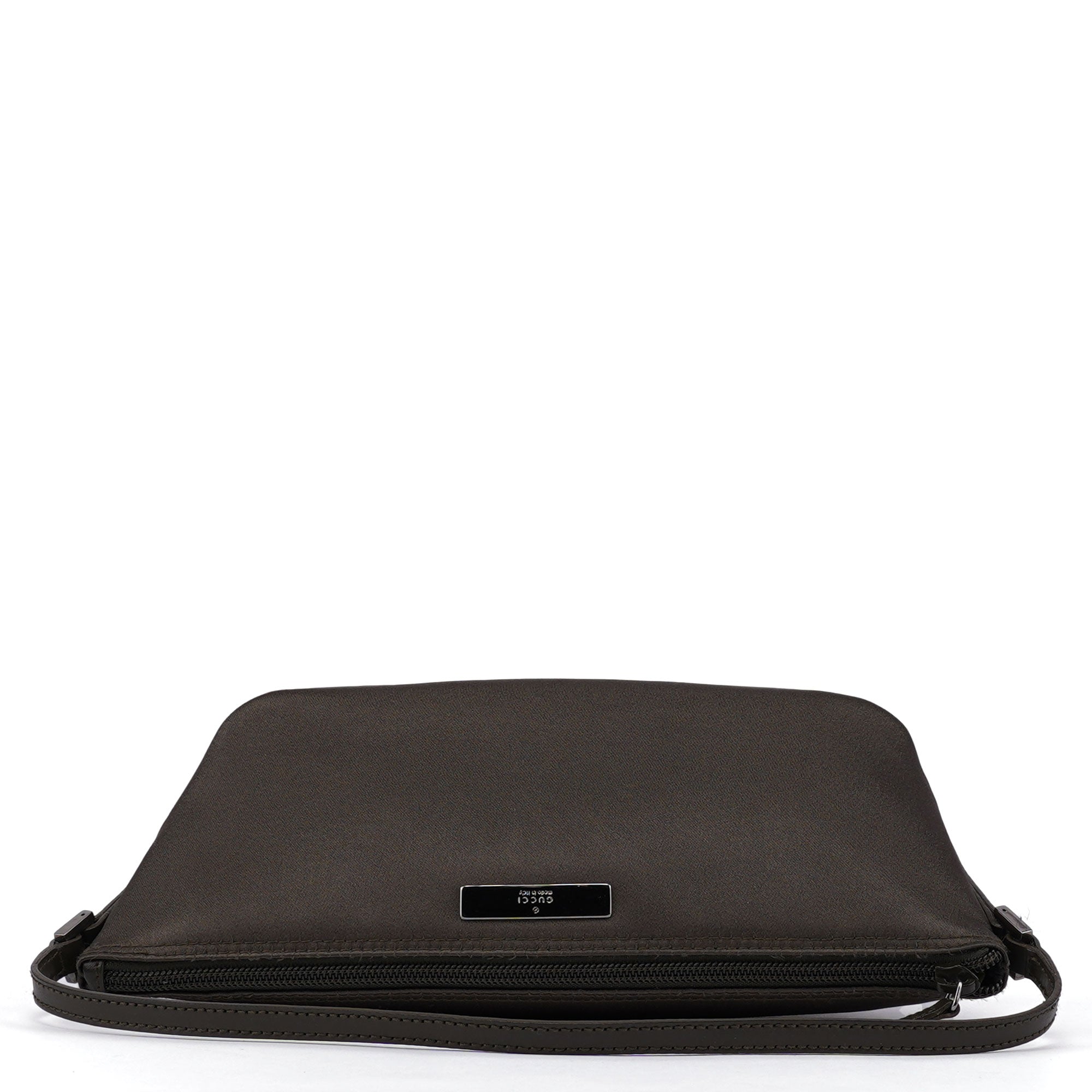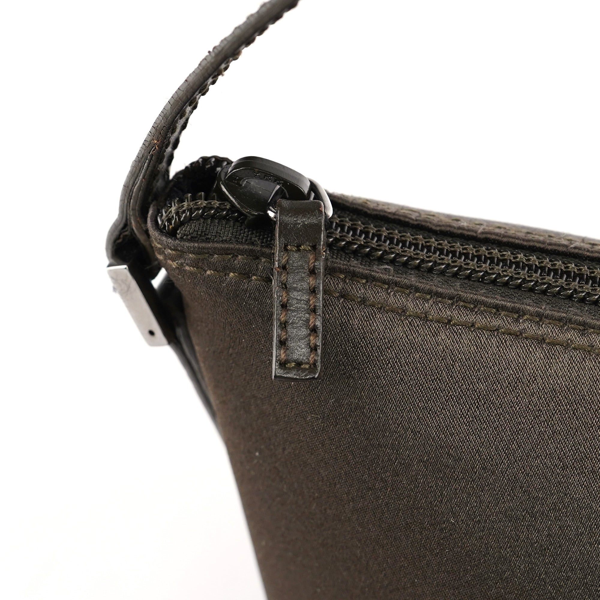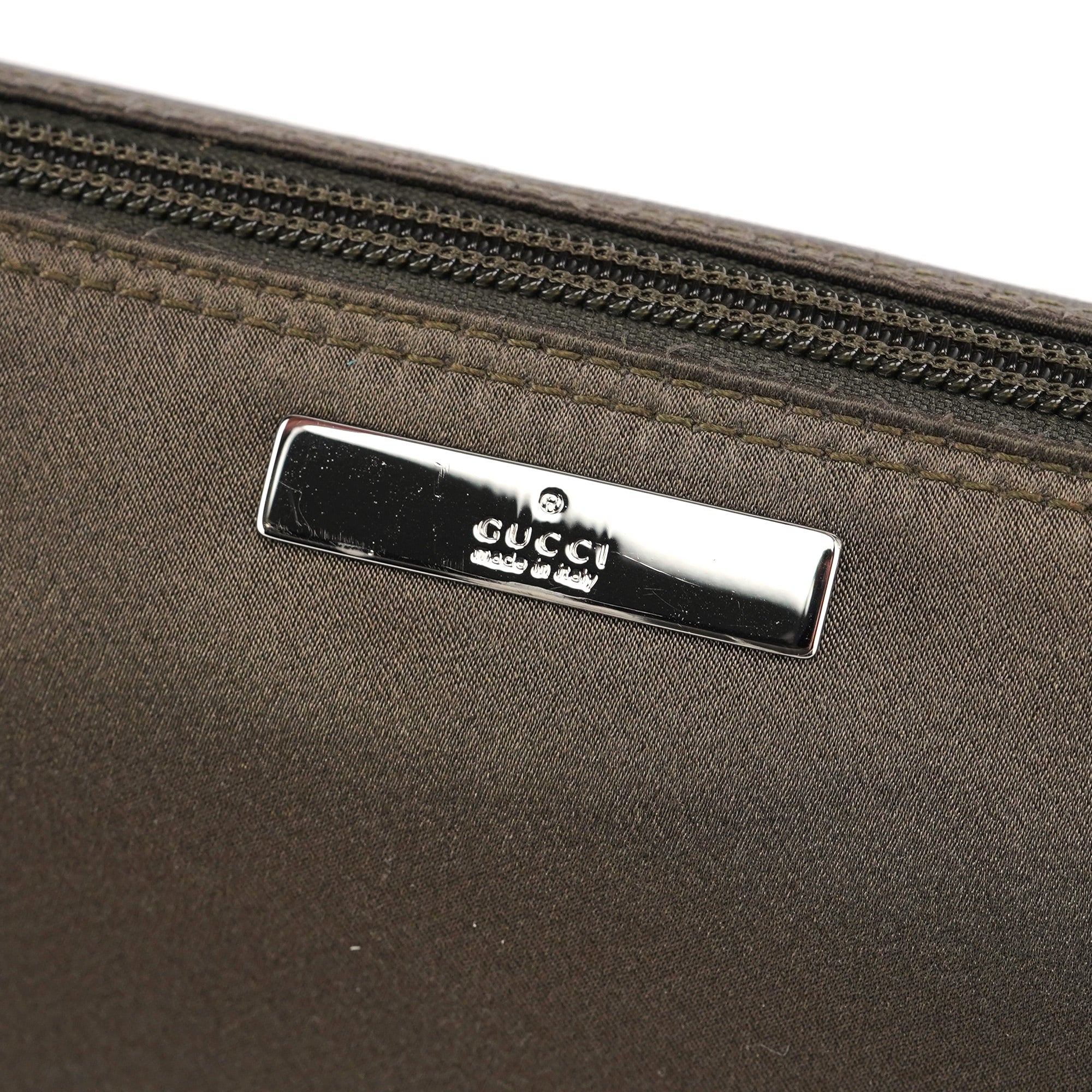 Explore timeless elegance with the Gucci boat pochette by Tom Ford, circa late 1990s. This exquisite piece combines olive green satin with tonal calfskin leather trim and silver-tone hardware. Its secure zip closure and satin-lined interior offer luxury and practicality, while the subtle Gucci plaque adds a touch of heritage. A perfect blend of vintage charm and sophistication.
