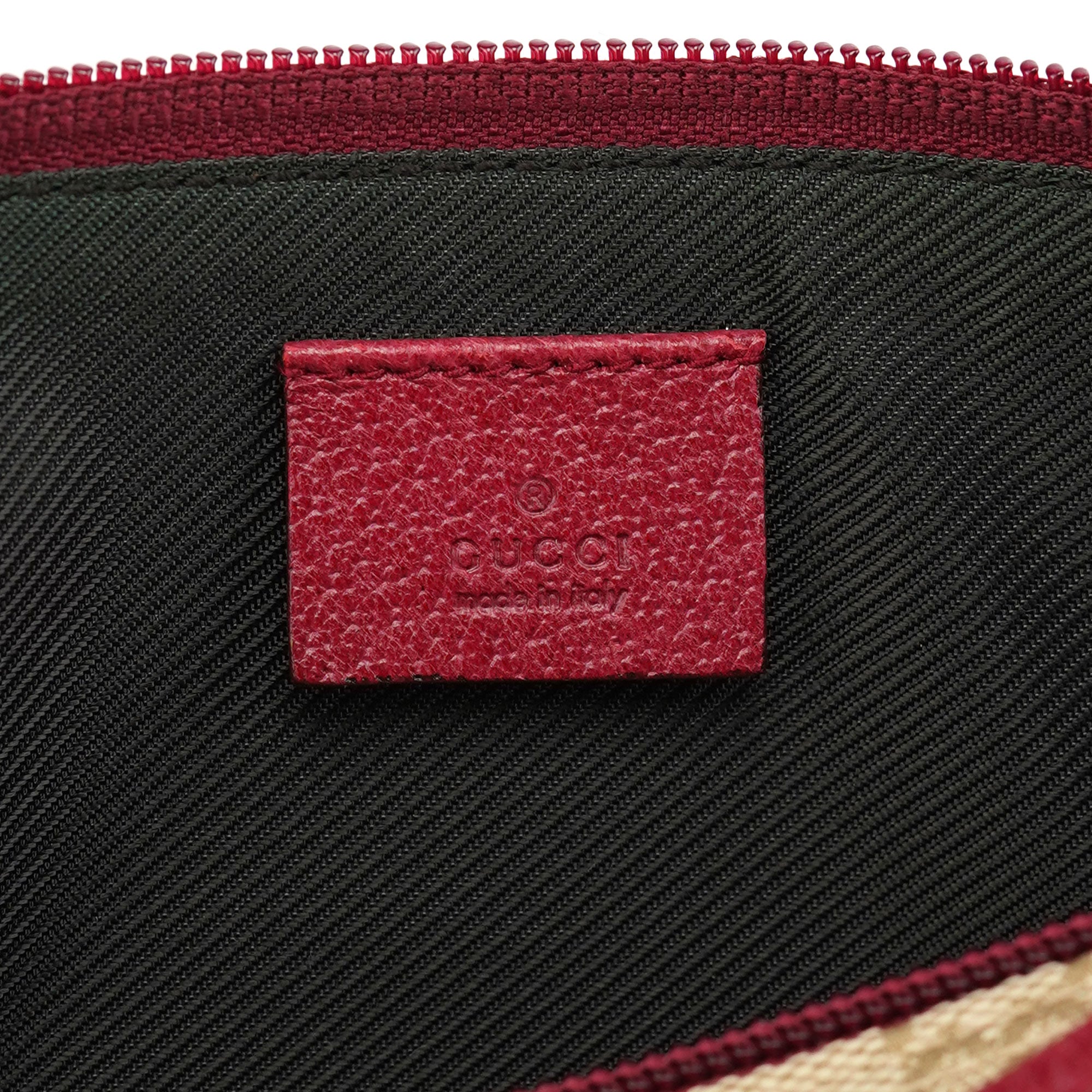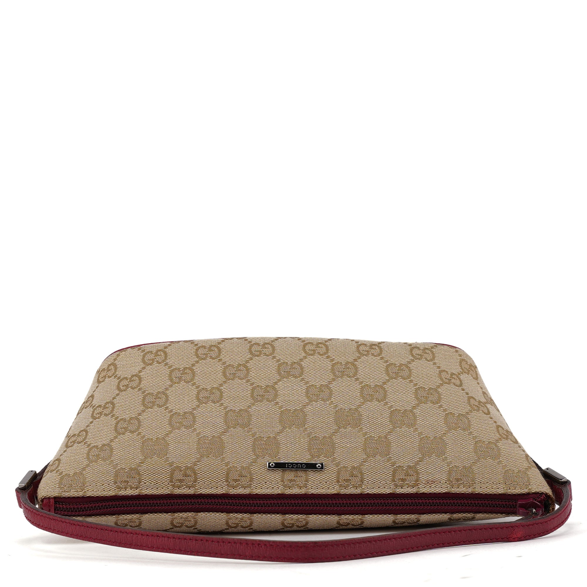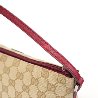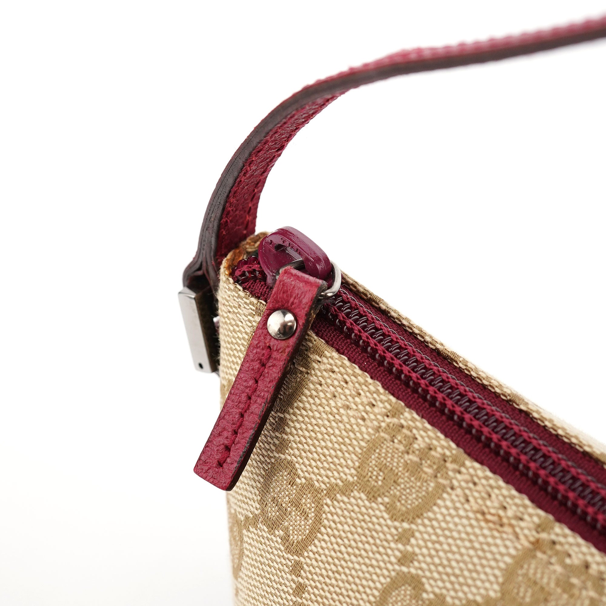 Explore timeless elegance with the Gucci GG Boat Pochette by Tom Ford, circa late 1990s. This exquisite piece combines beige GG canvas with red leather trim and silver-tone hardware. Its secure zip closure and satin-lined interior offer luxury and practicality, while the subtle Gucci plaque adds a touch of heritage.