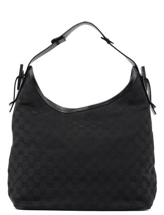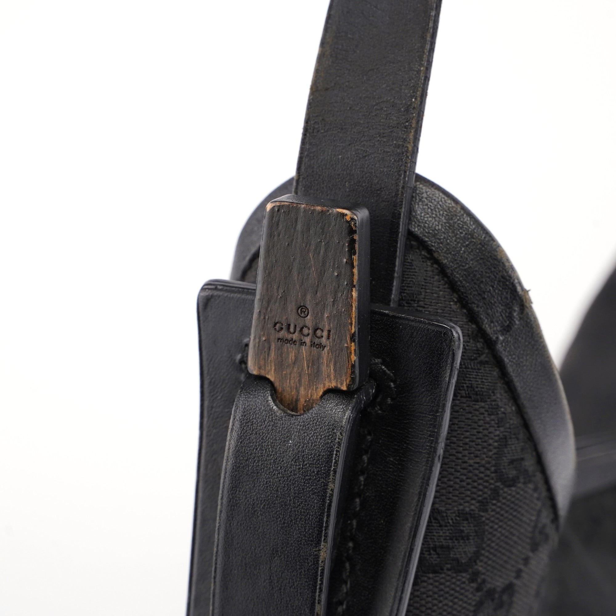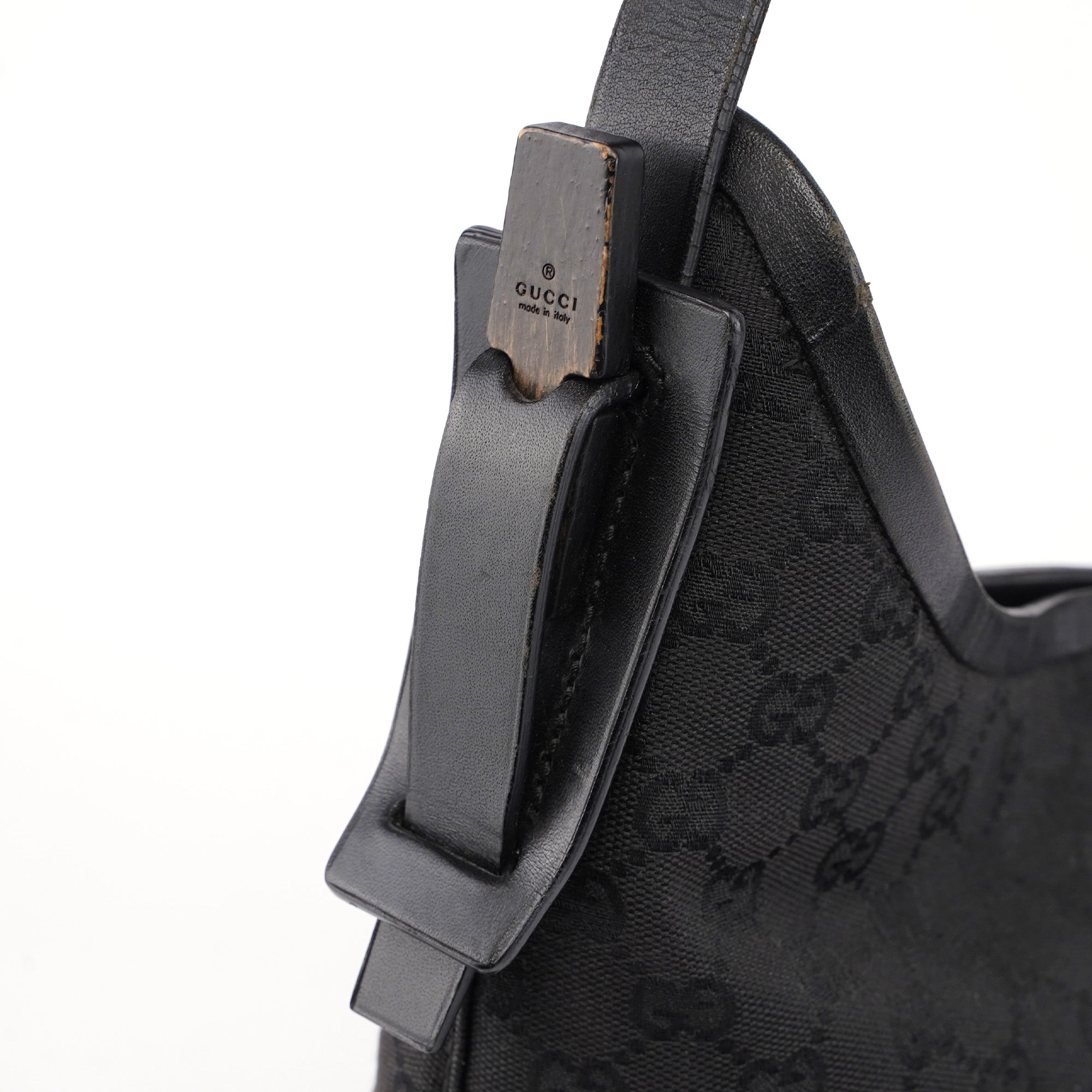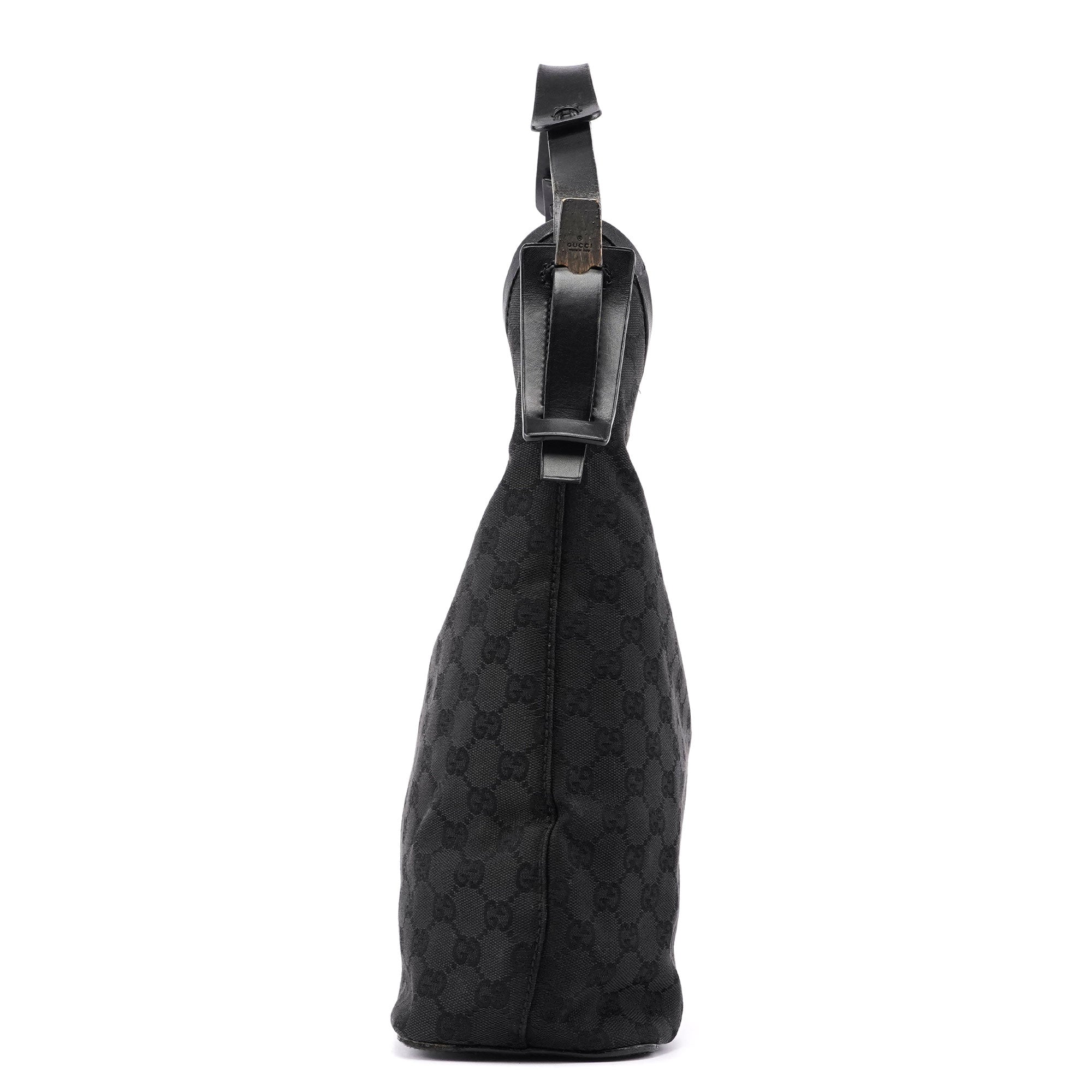 Designed by Tom Ford in the mid 1990s, this Gucci GG hobo shoulder bag is handcrafted in black GG monogram canvas with tonal leather trim. It features a wooden detail with Gucci logo engraving. The cotton-lined interior features a convenient zipper pocket and magnetic closure.