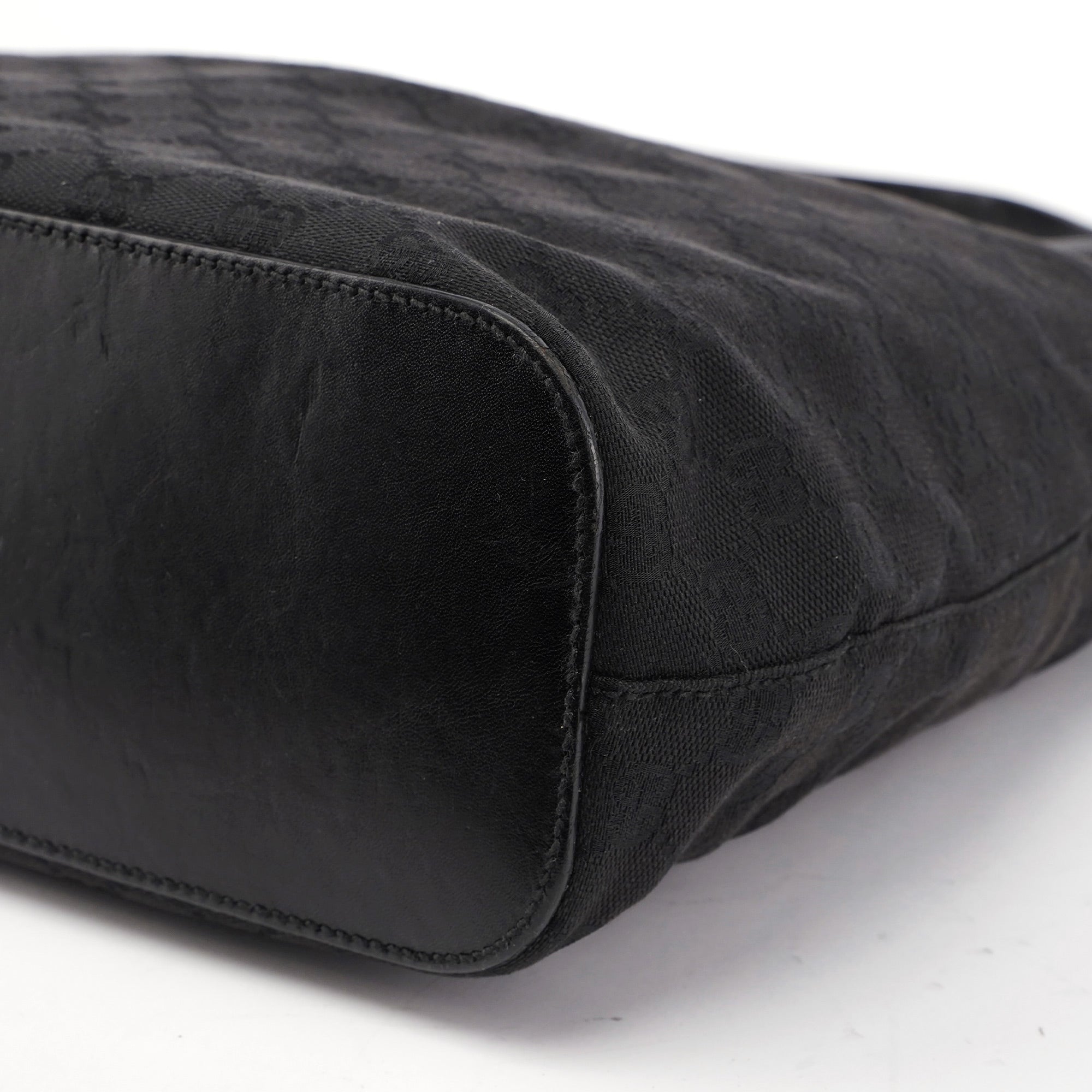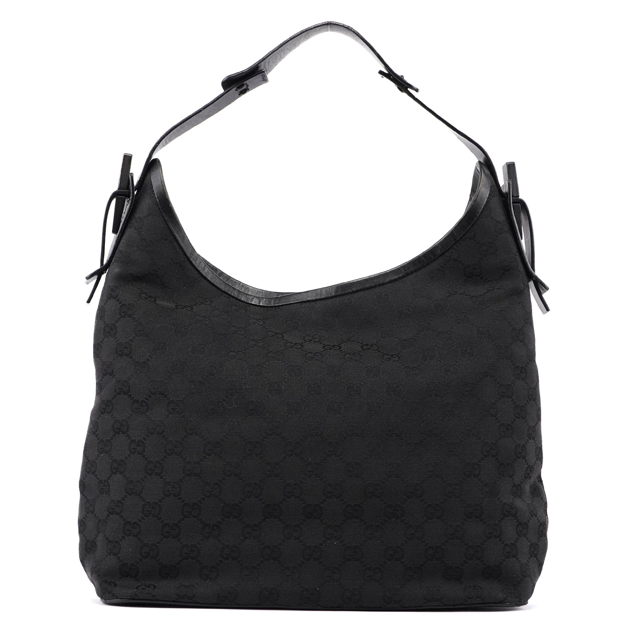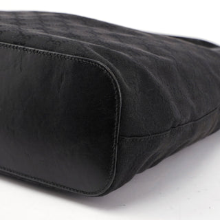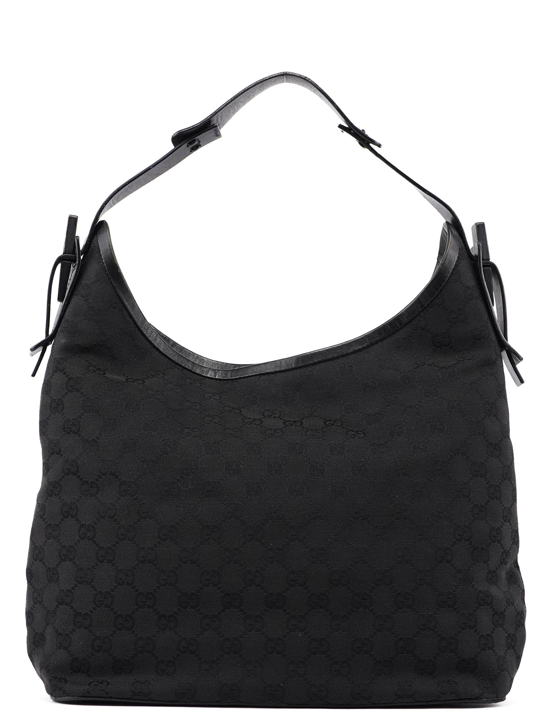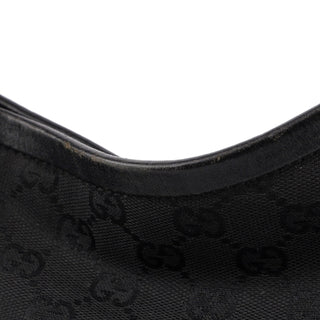 Designed by Tom Ford in the mid 1990s, this Gucci GG hobo shoulder bag is handcrafted in black GG monogram canvas with tonal leather trim. It features a wooden detail with Gucci logo engraving. The cotton-lined interior features a convenient zipper pocket and magnetic closure.