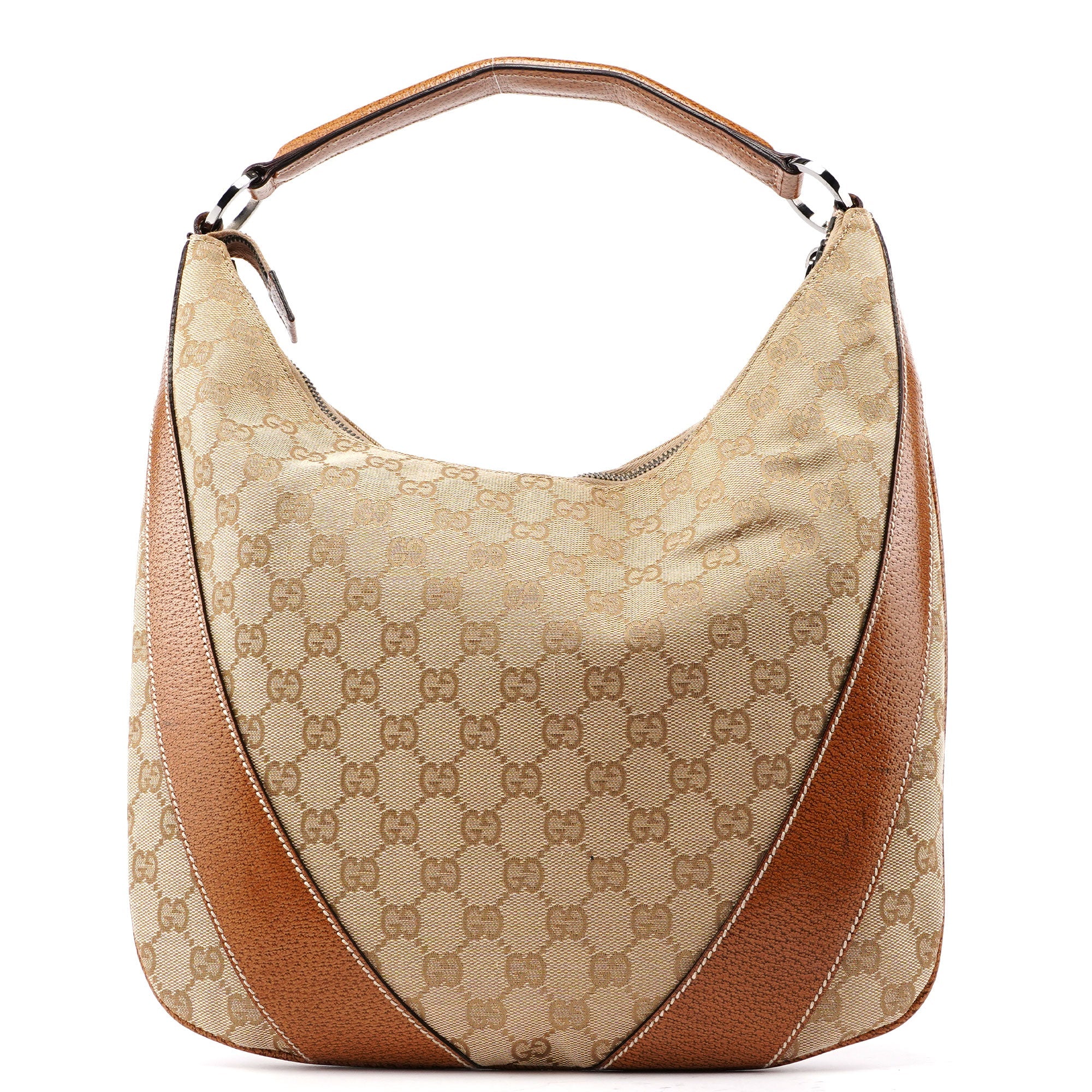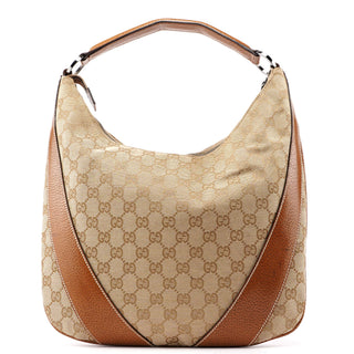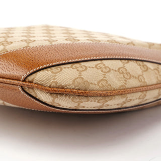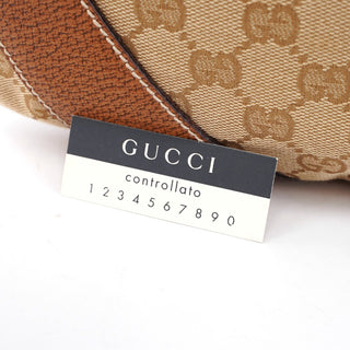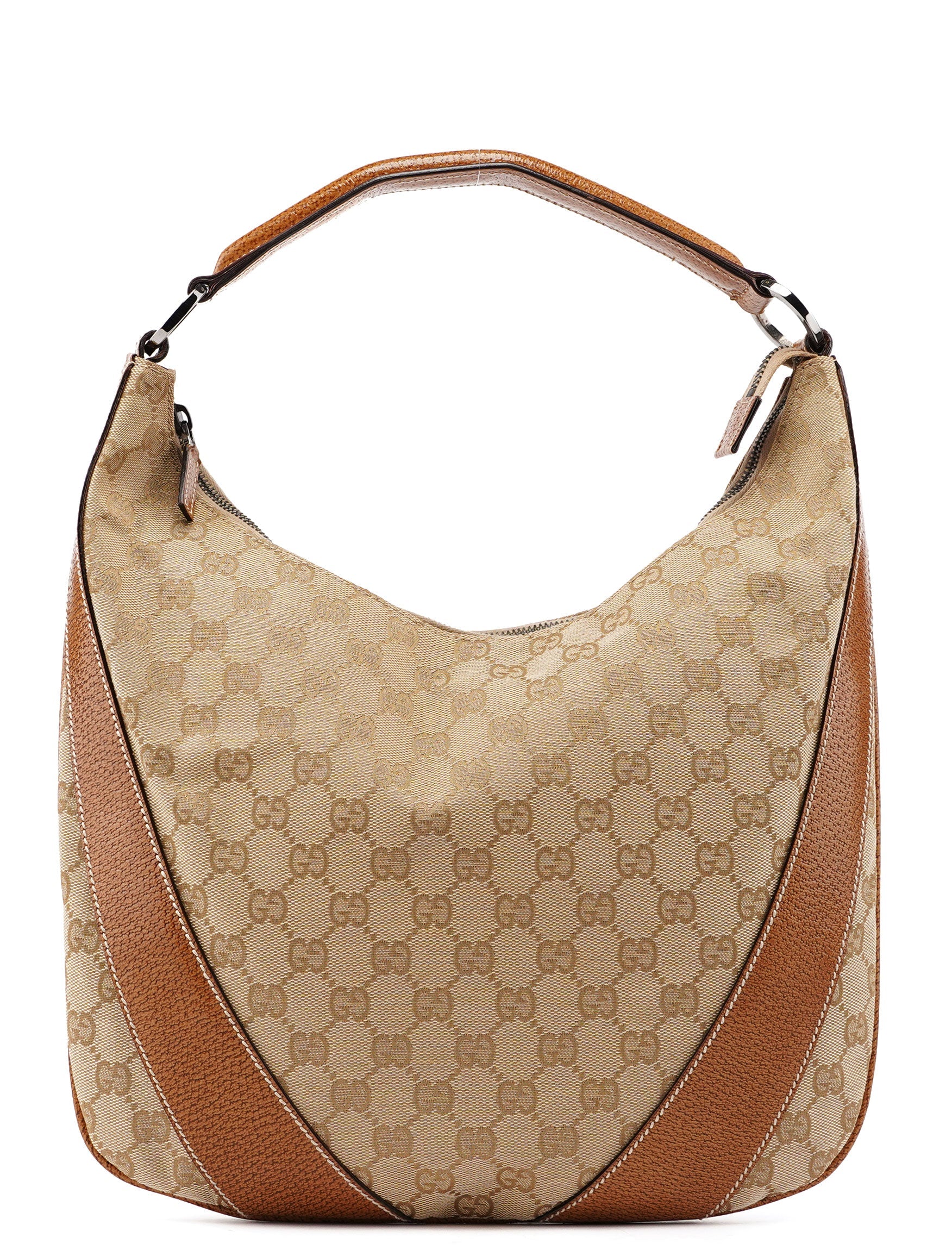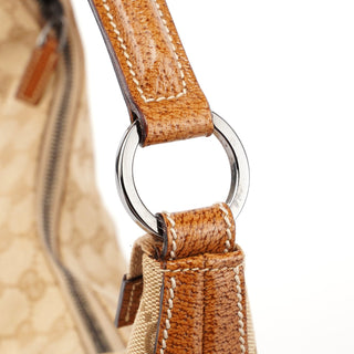 Designed by Tom Ford in the late 1990s, the Gucci GG Hobo shoulder bag is handcrafted from beige GG monogram canvas with light brown leather trim and white contrast stitching. It features silver-tone hardware, a zipper closure, and a satin-lined interior with an interior zipper pocket, showcasing timeless elegance.