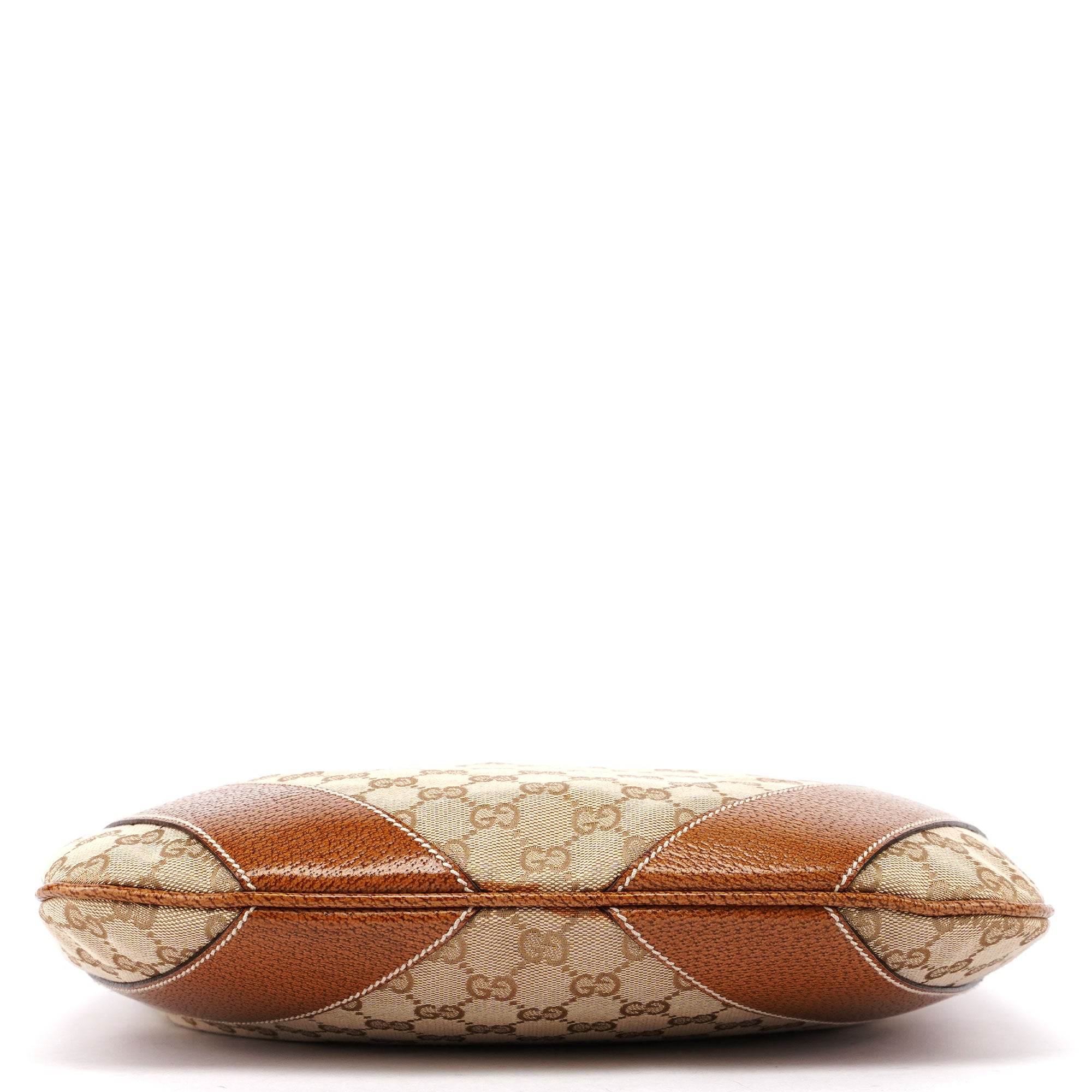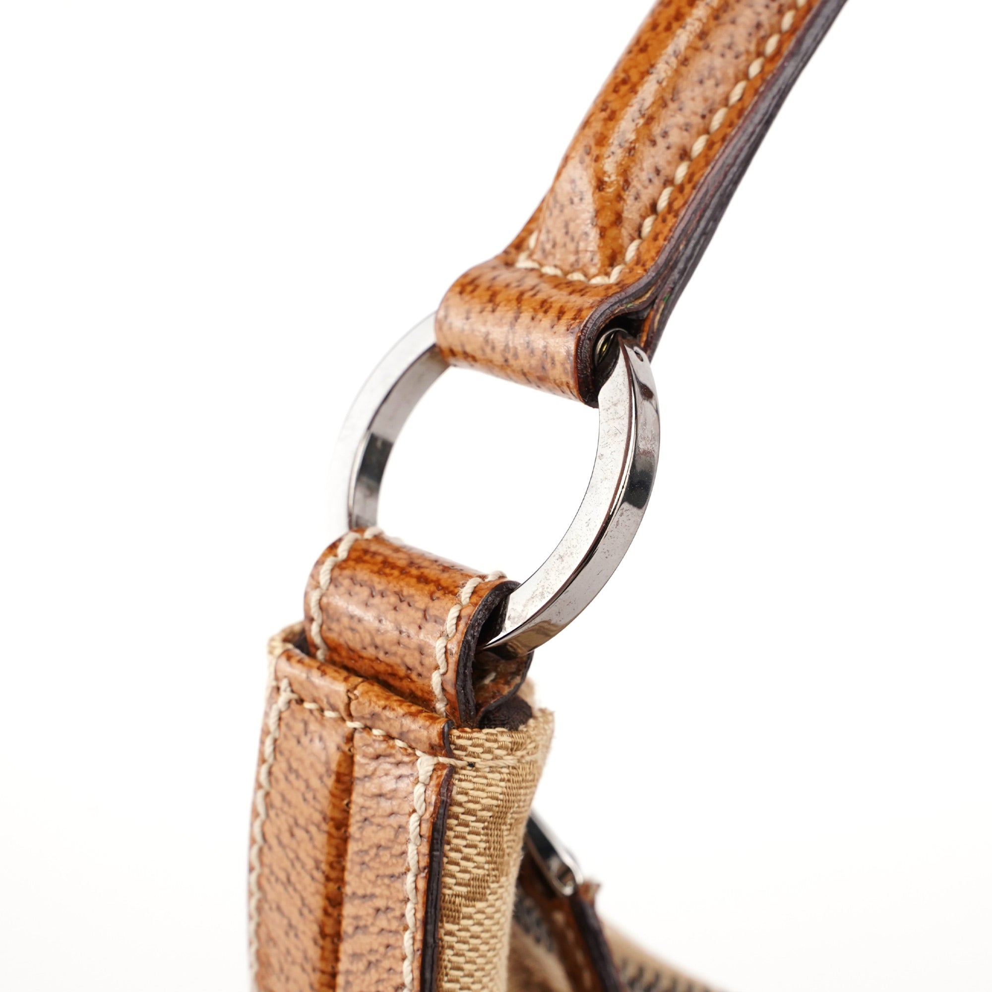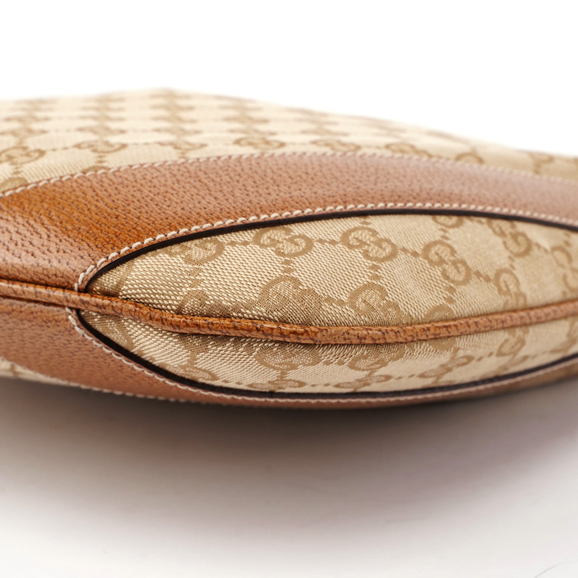 Designed by Tom Ford in the late 1990s, the Gucci GG Hobo shoulder bag is handcrafted from beige GG monogram canvas with light brown leather trim and white contrast stitching. It features silver-tone hardware, a zipper closure, and a satin-lined interior with an interior zipper pocket, showcasing timeless elegance.