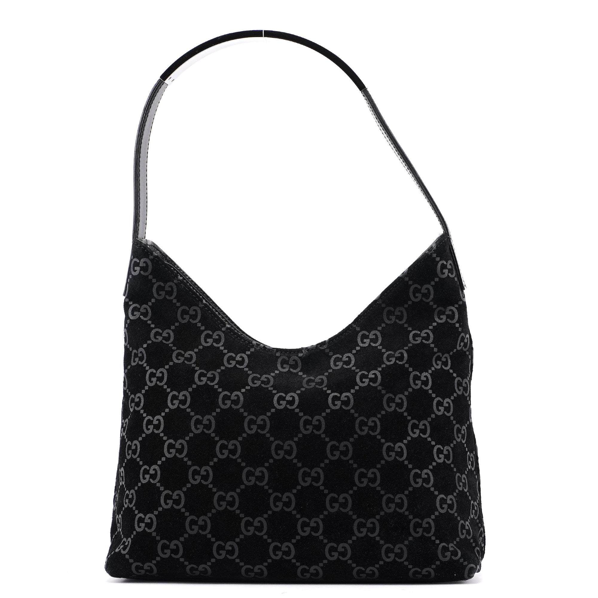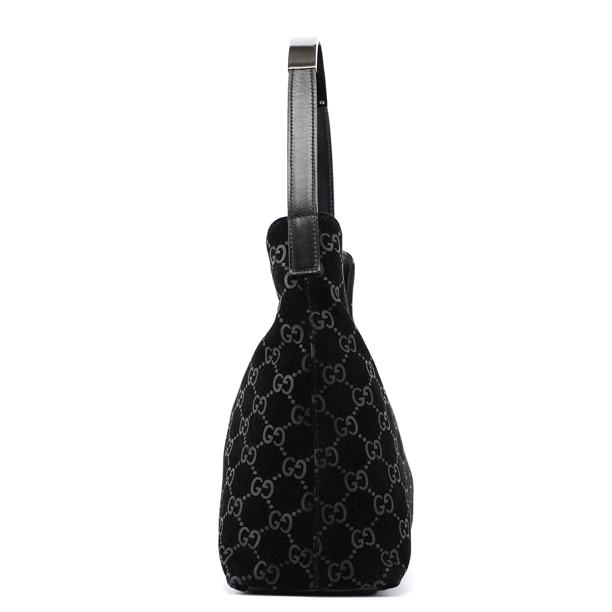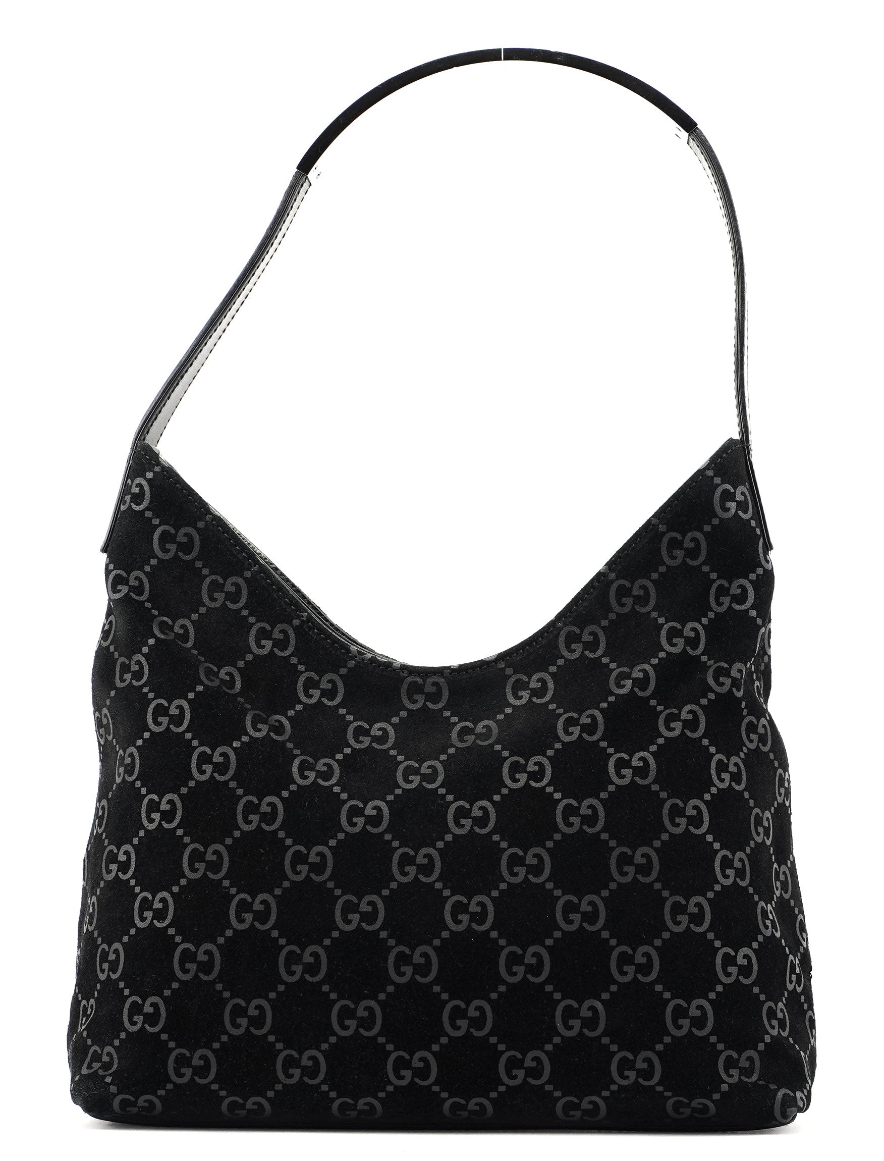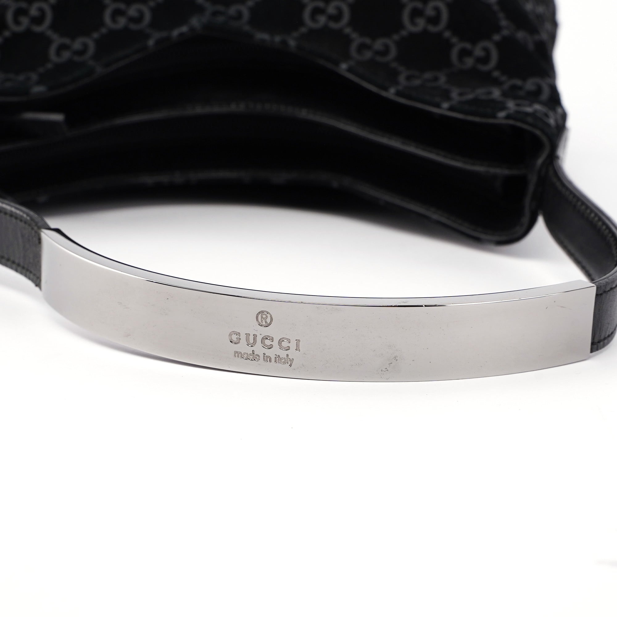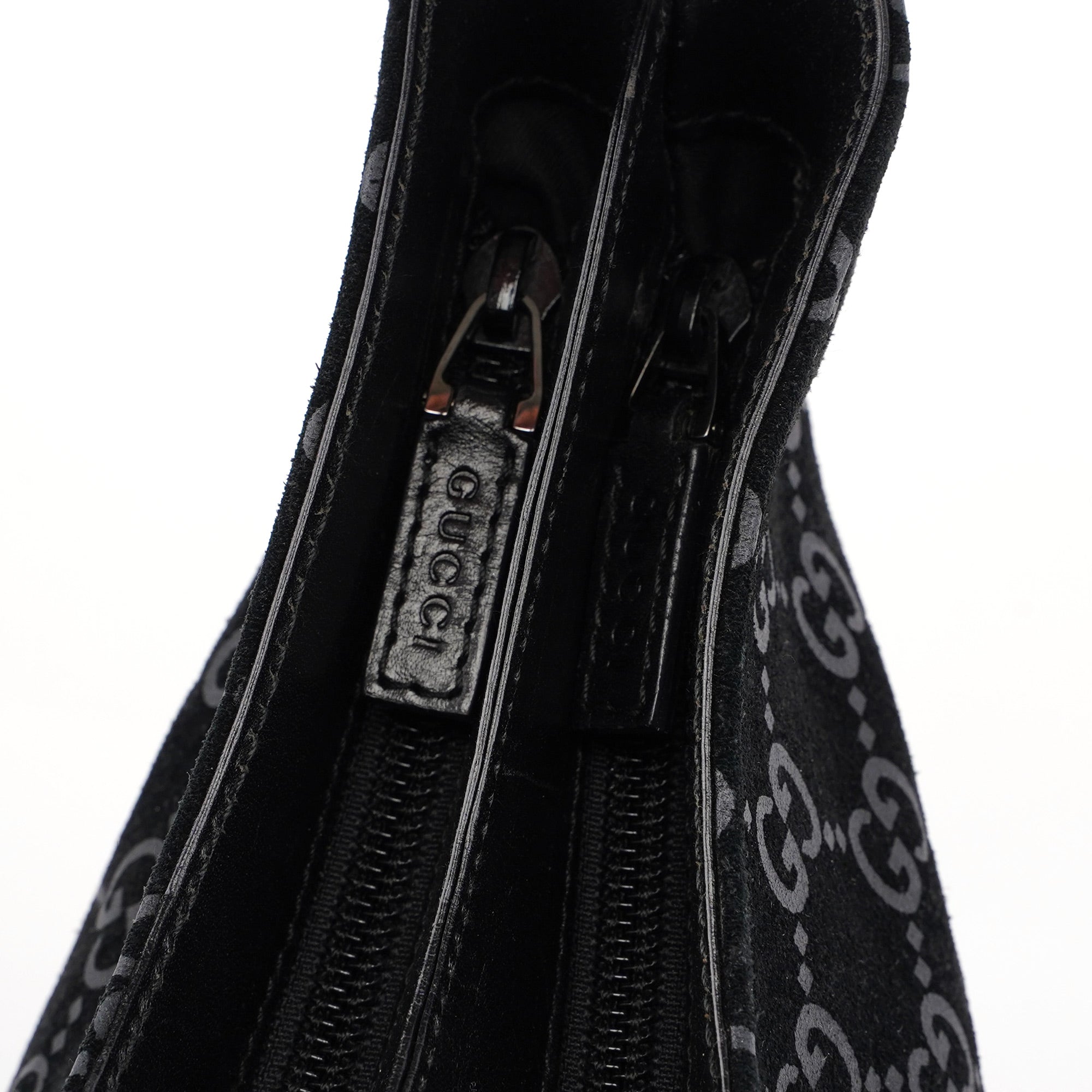 Unveil the elegance of the Gucci GG suede shoulder bag, designed by Tom Ford in 1997. This luxurious piece features silver-tone hardware with engraved Gucci logo, complemented by black calfskin leather trim. The two interior compartments are lined in satin, featuring two convenient zipper pockets.