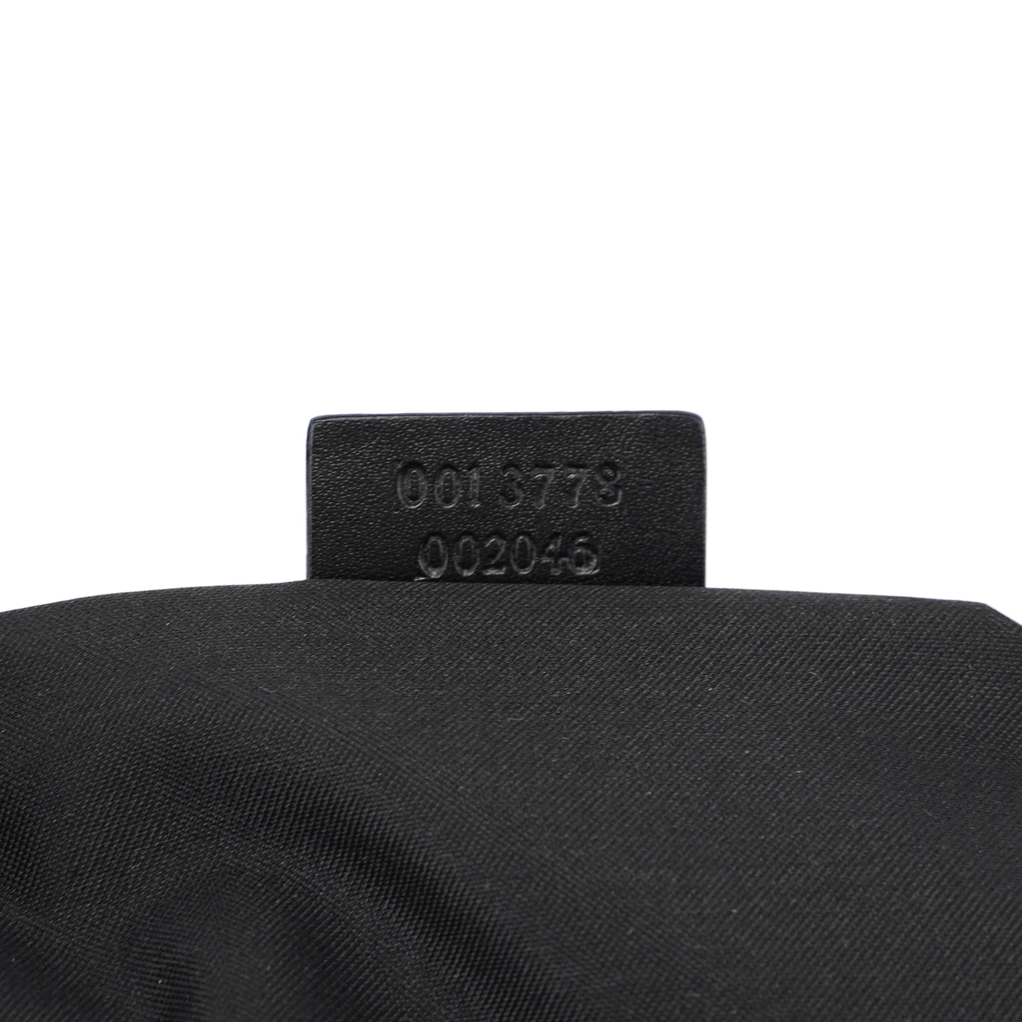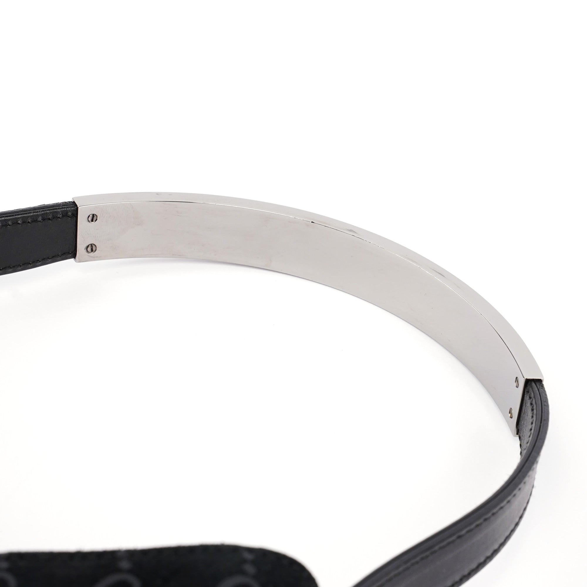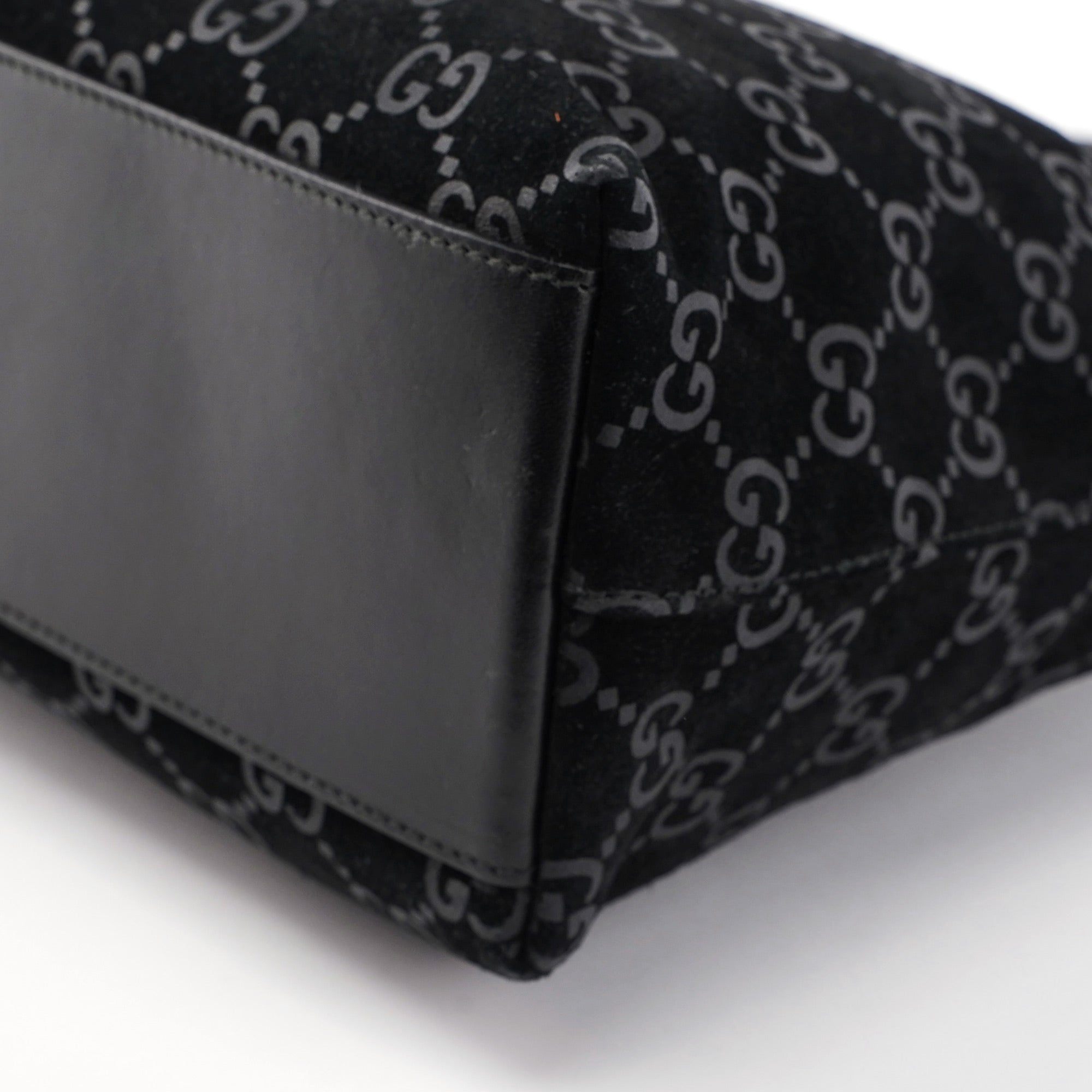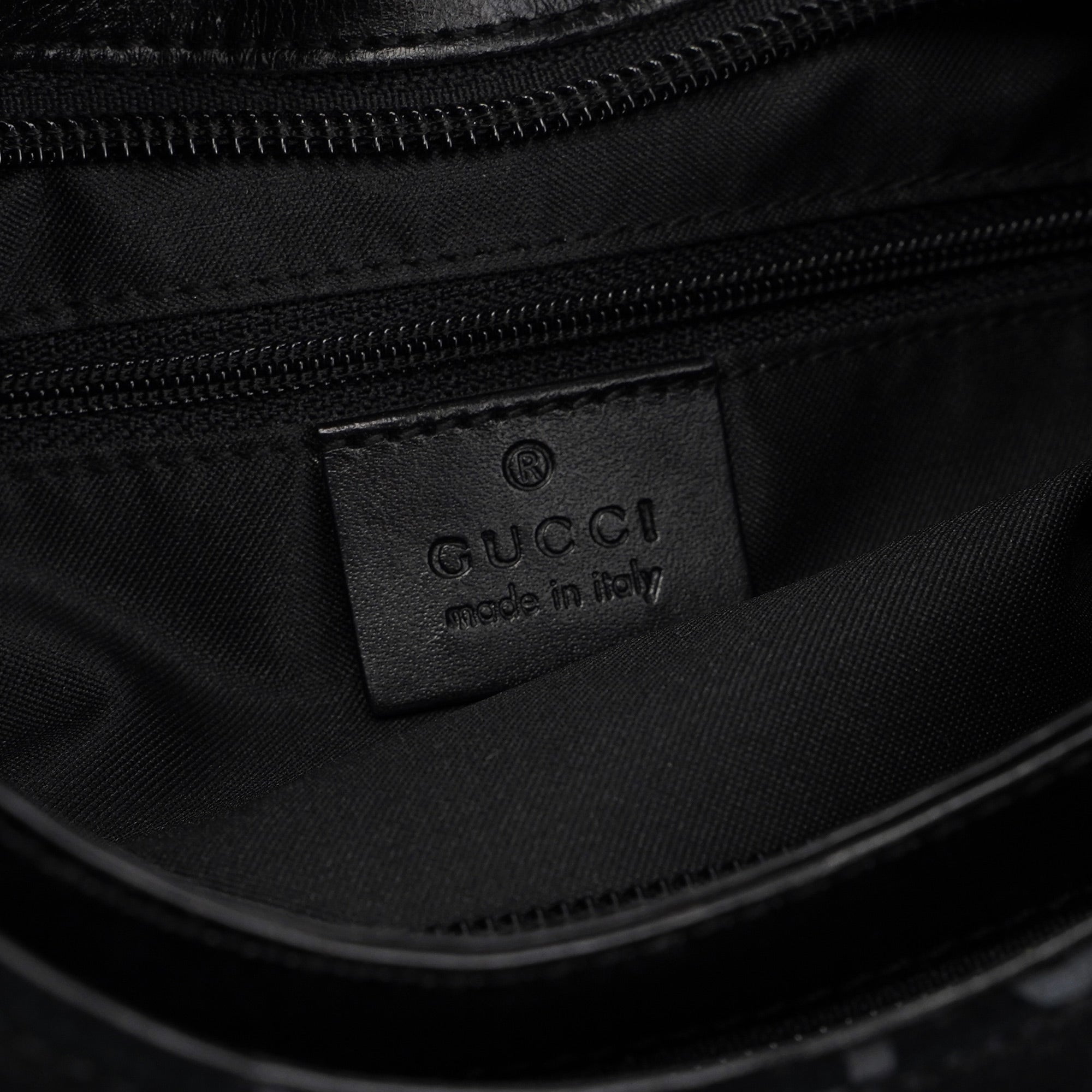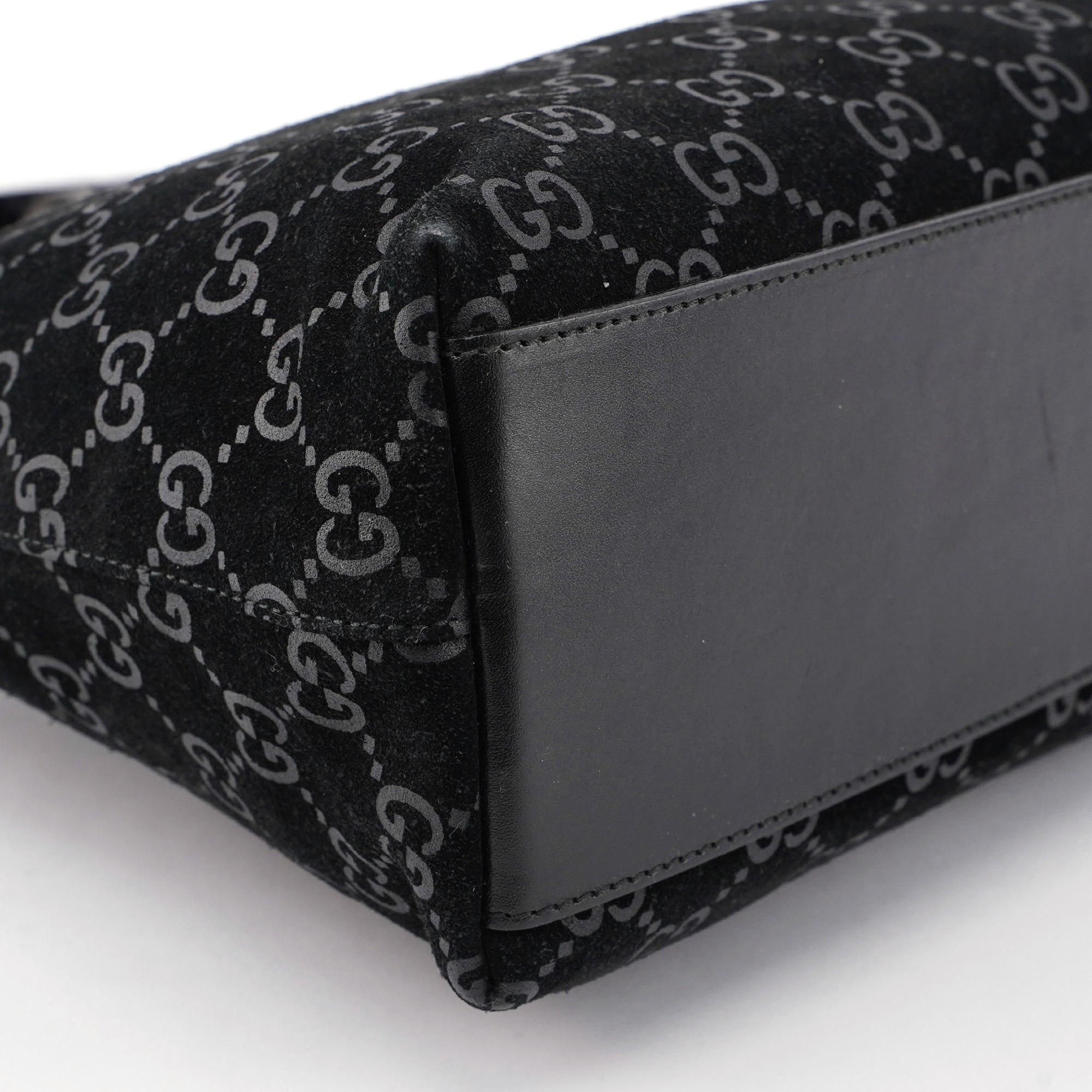Unveil the elegance of the Gucci GG suede shoulder bag, designed by Tom Ford in 1997. This luxurious piece features silver-tone hardware with engraved Gucci logo, complemented by black calfskin leather trim. The two interior compartments are lined in satin, featuring two convenient zipper pockets.