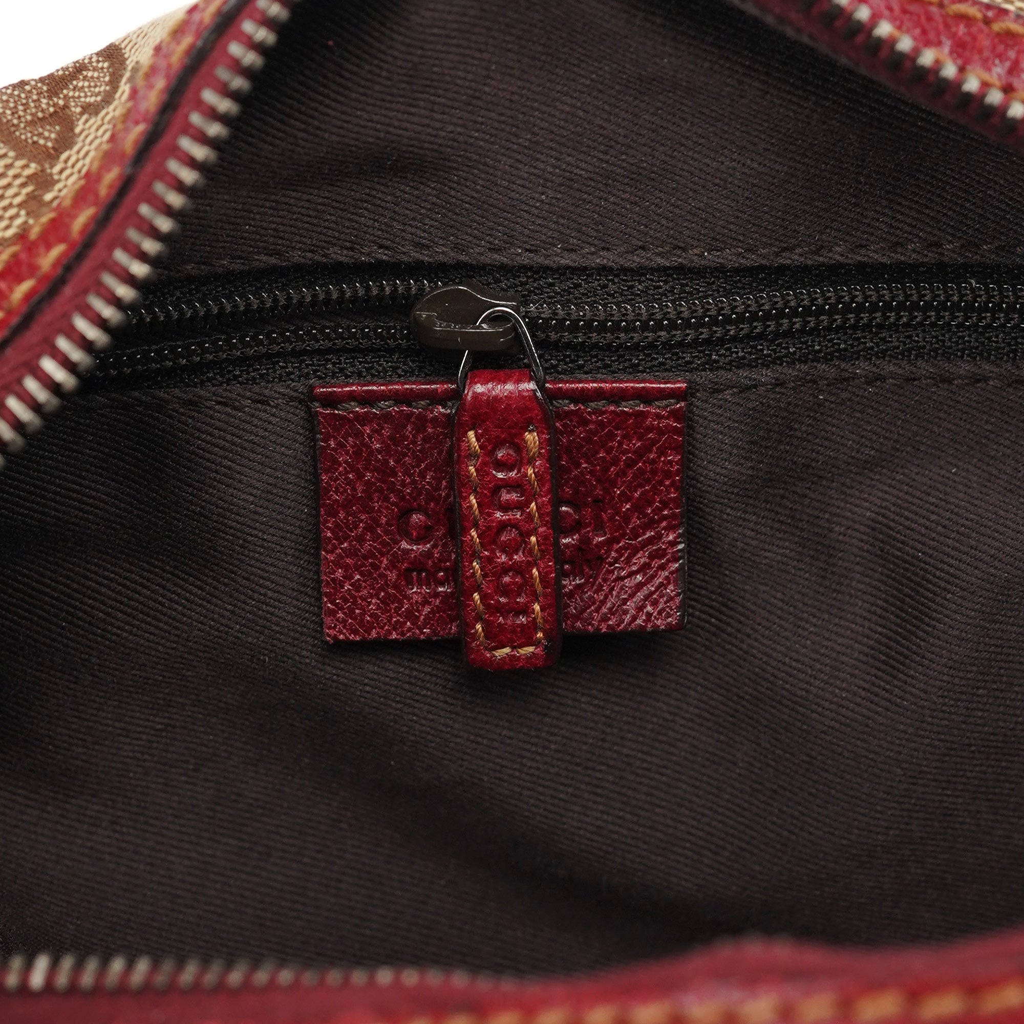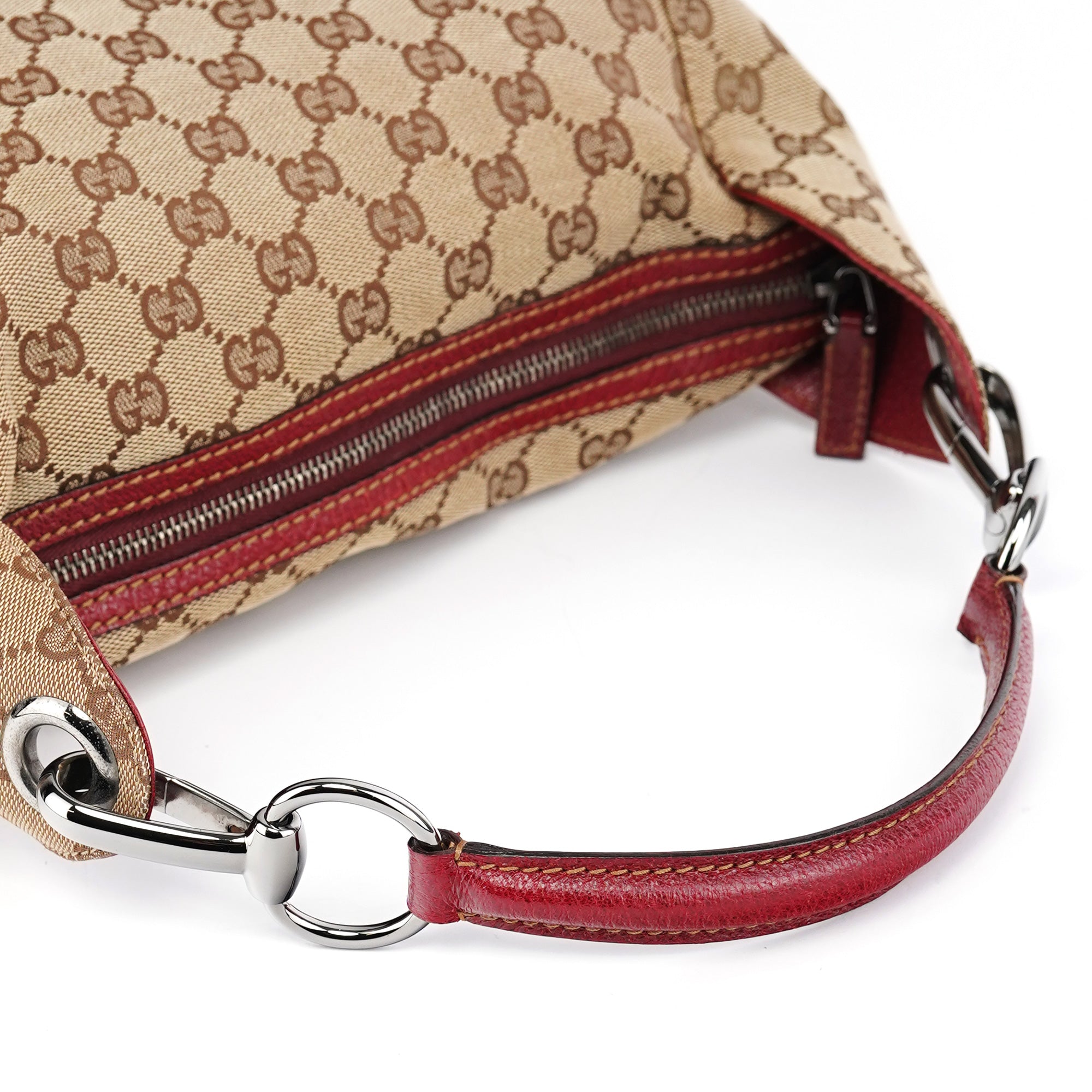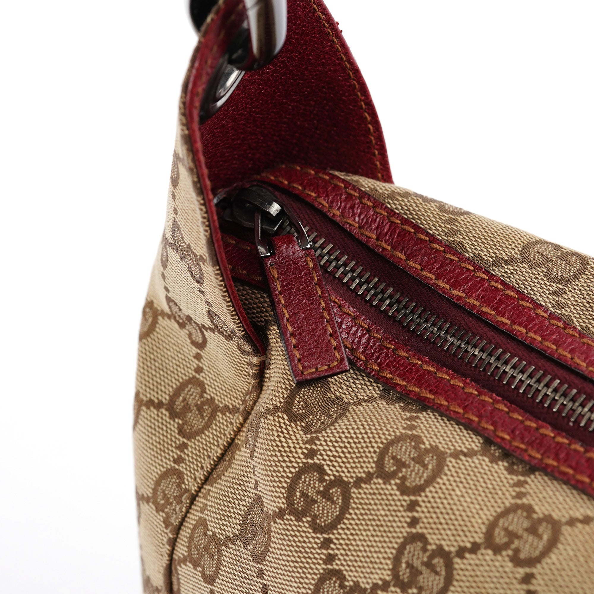 Designed in the early 2000's by Tom Ford, this vintage Gucci GG shoulder bag features the signature GG canvas in beige with burgundy leather trim and silver-tone hardware. The hobo silhouette offers a single shoulder strap for comfortable carry, while the bag secures with a top zipper closure. The interior is lined with durable fabric and includes an interior zipper pocket.