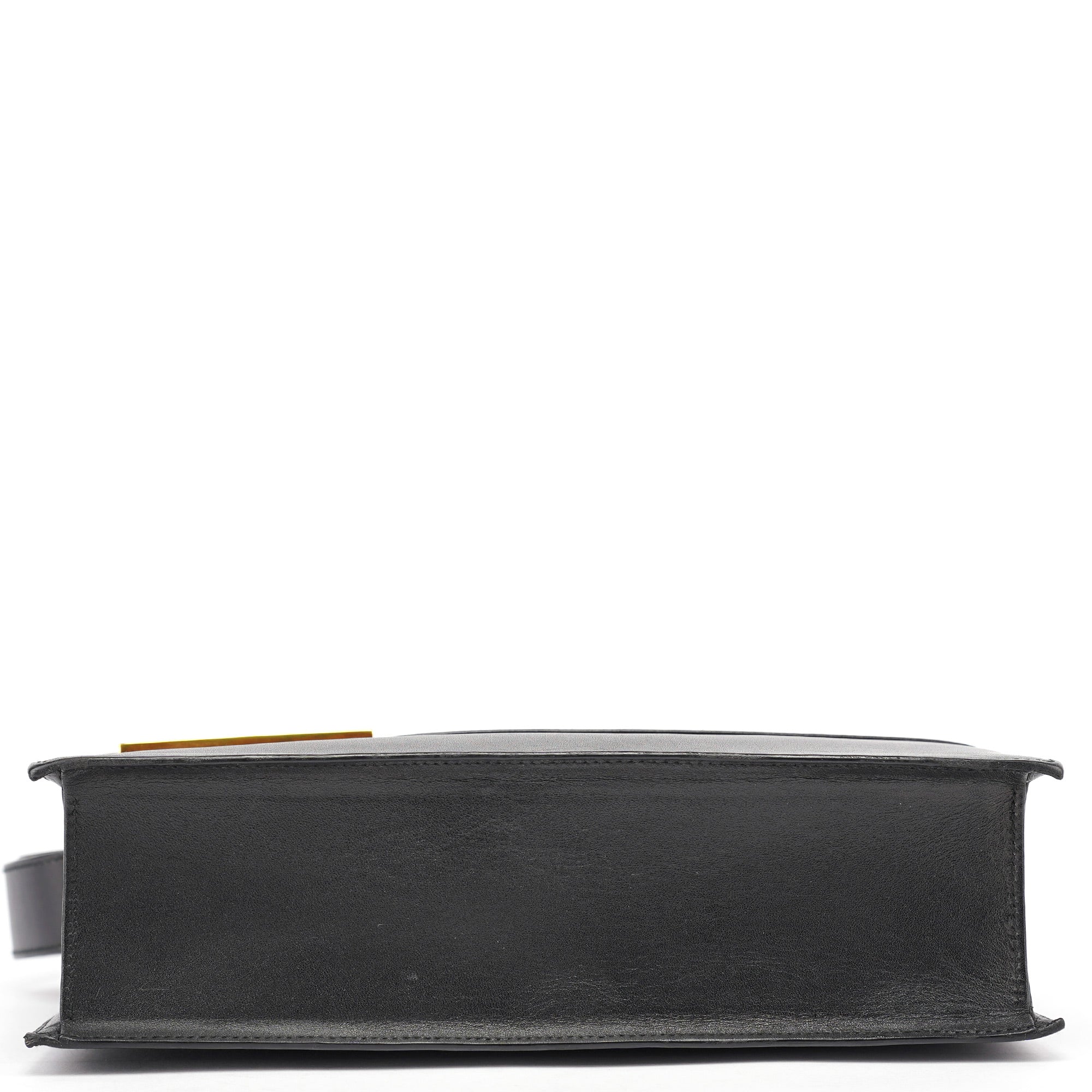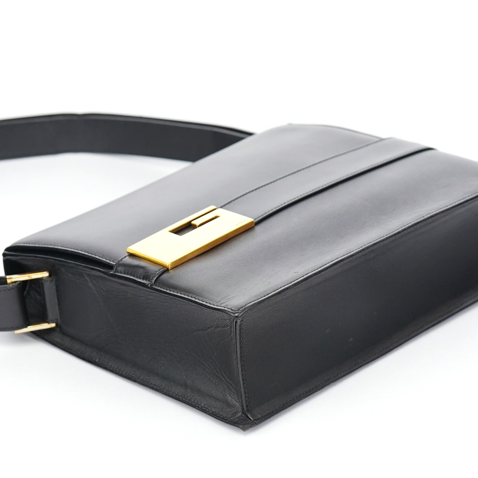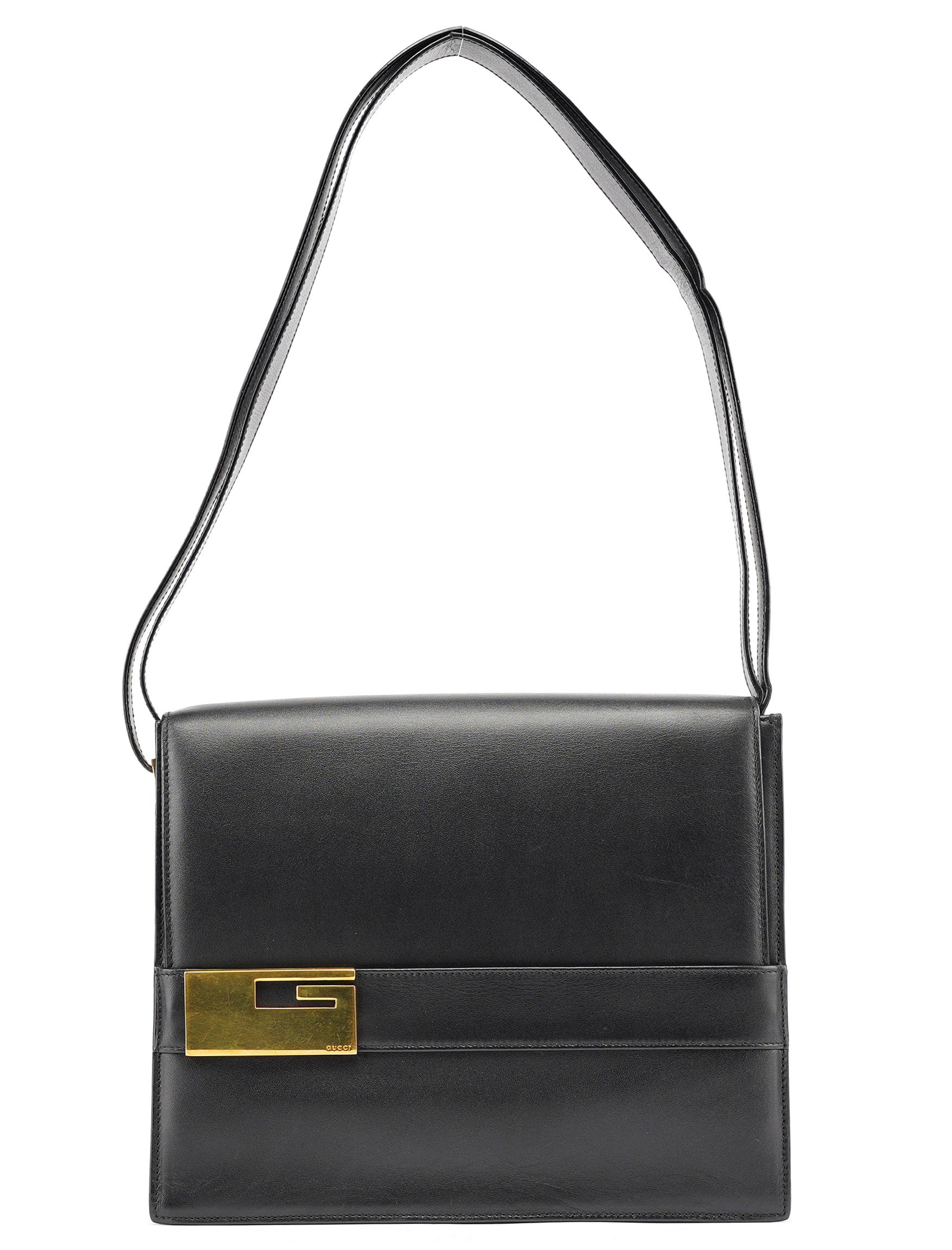 Designed in the late 1990s under Tom Ford, this Gucci shoulder bag is crafted from smooth black calfskin with a structured rectangular silhouette and signature gold-tone Square G clasp. The flap opens to a black leather interior with a slim compartment and slip pocket, while the wide shoulder strap offers a secure, balanced fit. A sleek archival piece from Ford’s minimalist era.