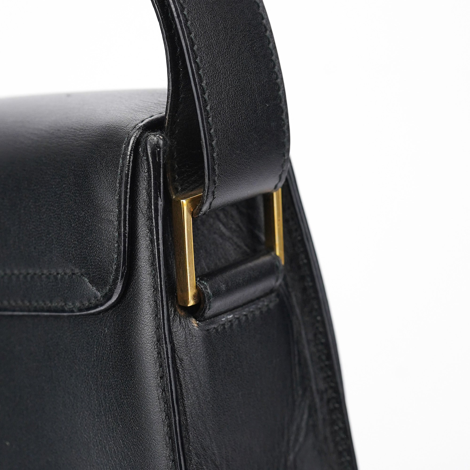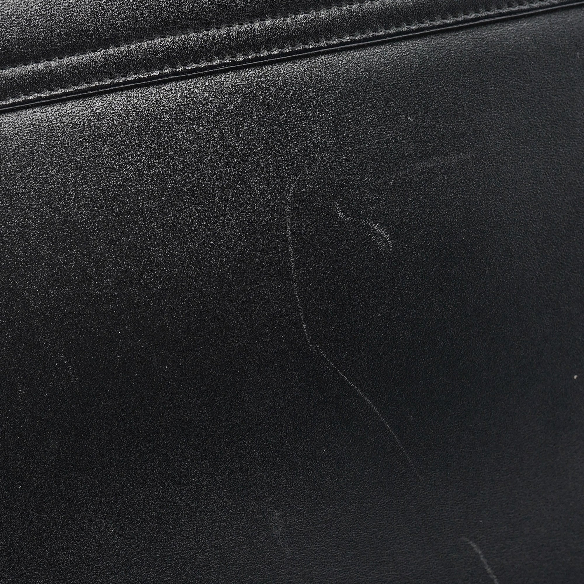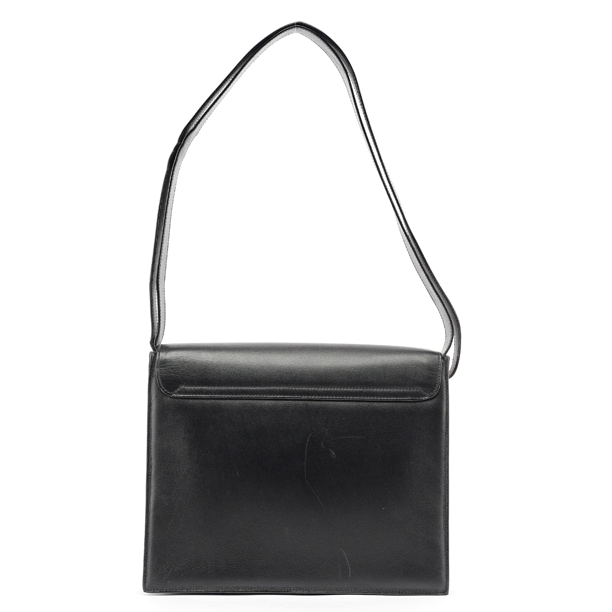 Designed in the late 1990s under Tom Ford, this Gucci shoulder bag is crafted from smooth black calfskin with a structured rectangular silhouette and signature gold-tone Square G clasp. The flap opens to a black leather interior with a slim compartment and slip pocket, while the wide shoulder strap offers a secure, balanced fit. A sleek archival piece from Ford’s minimalist era.