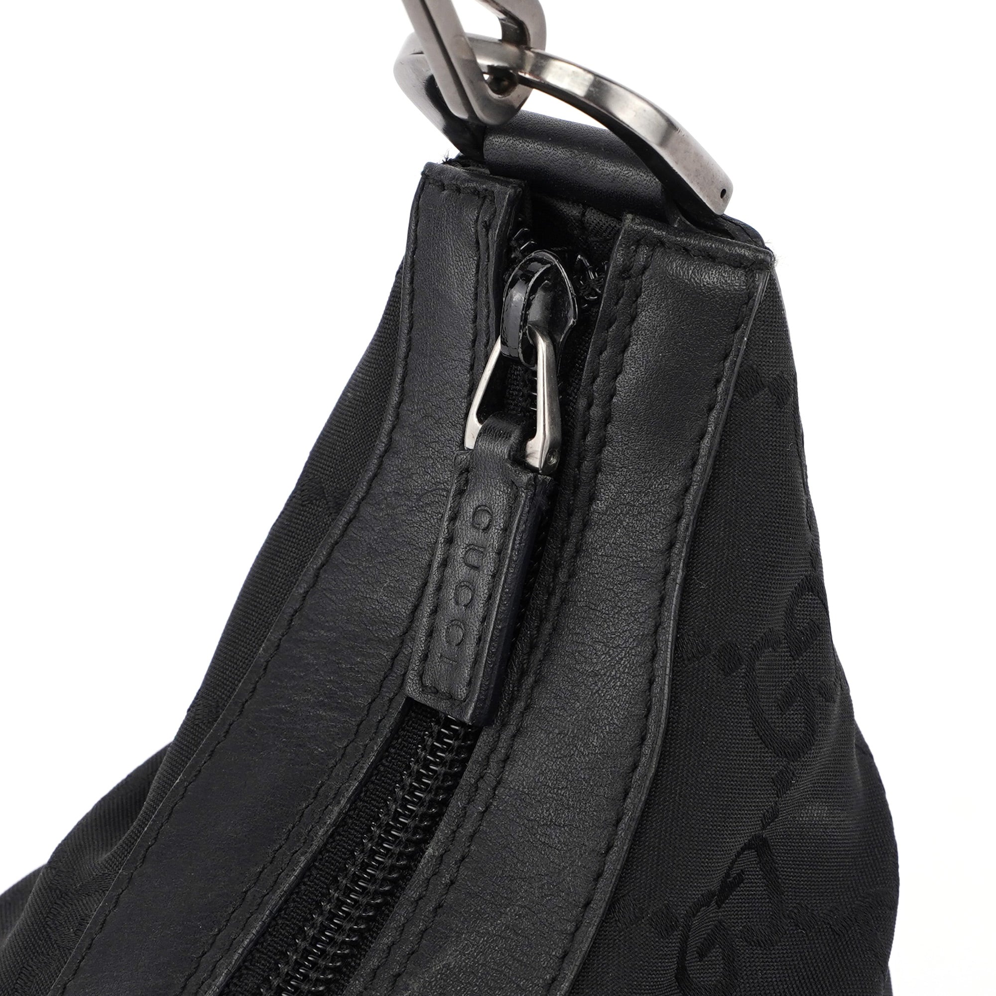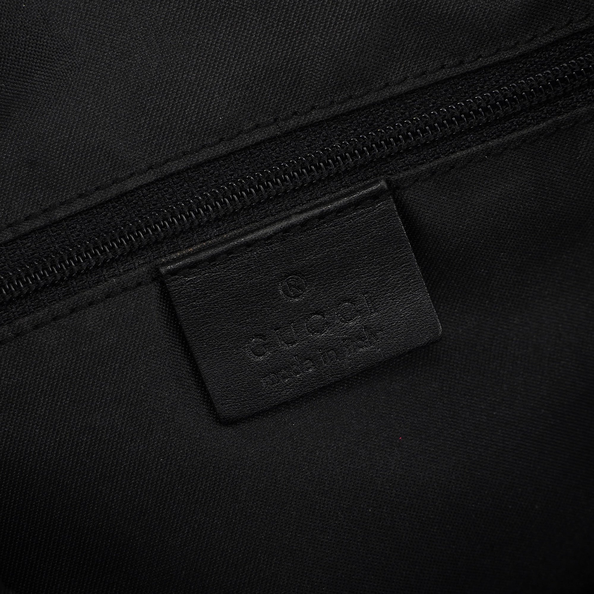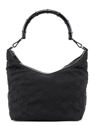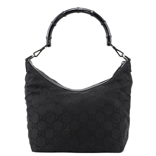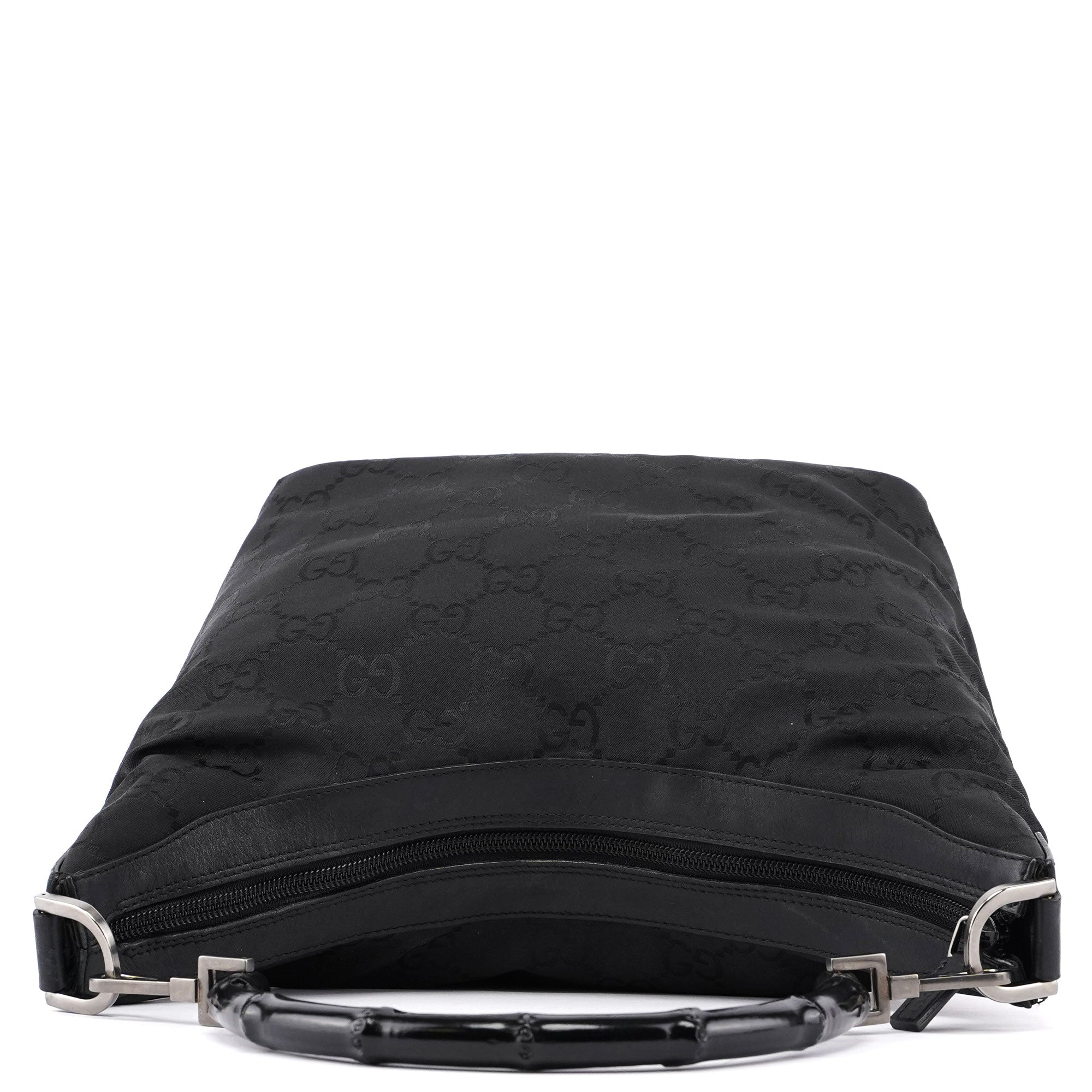 This Gucci Bamboo shoulder bag, designed in the late 1990s by Tom Ford features bamboo handle, the black GG monogram canvas, silver-tone hardware, and tonal leather trim. The bag's spacious zipper-closed compartment is lined with satin and includes an interior zipper pocket.