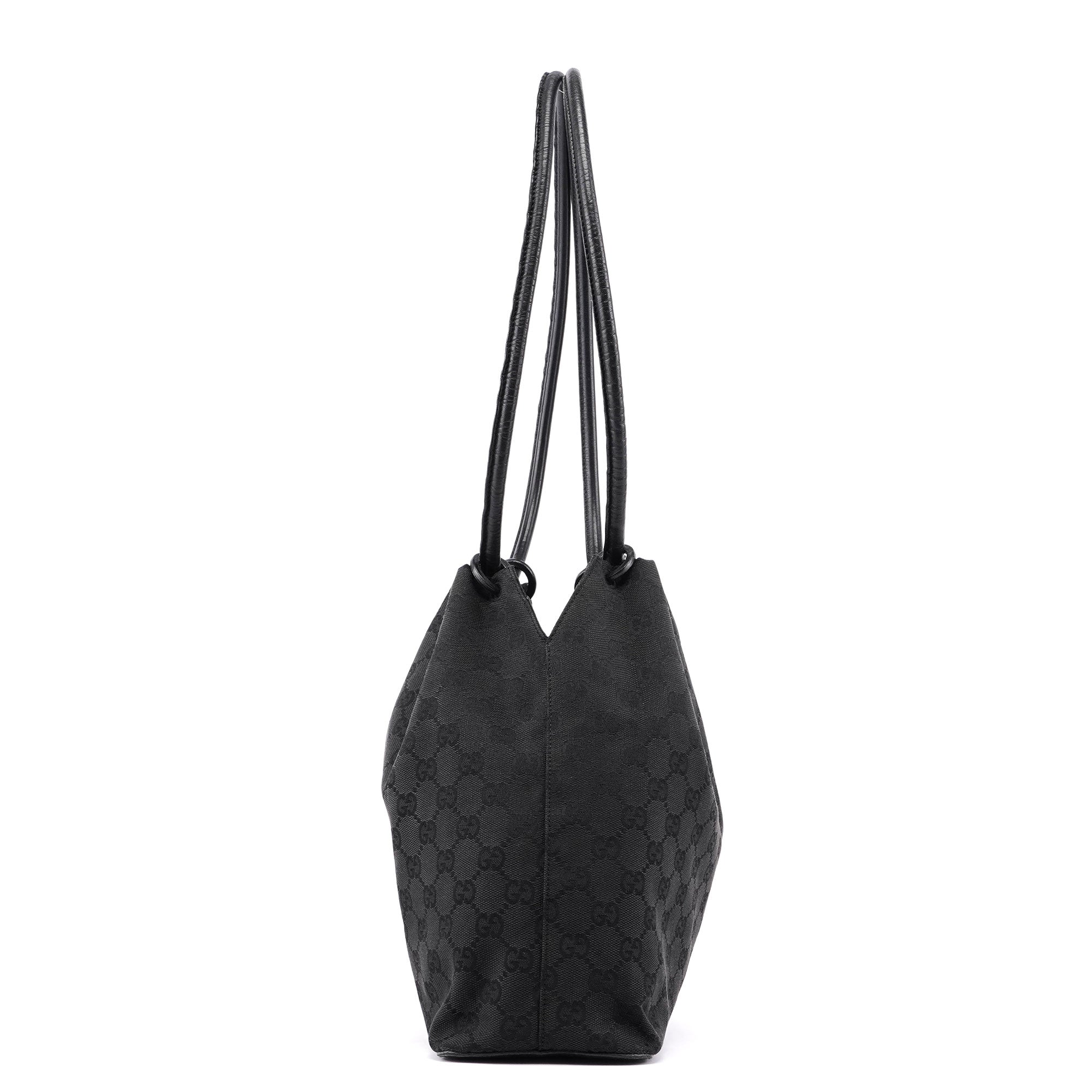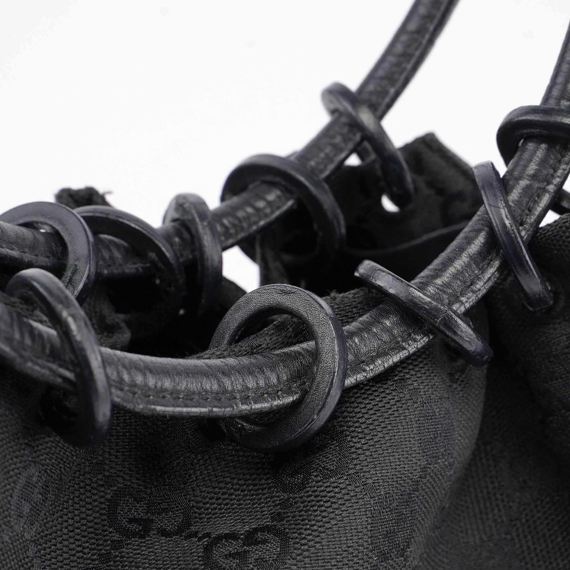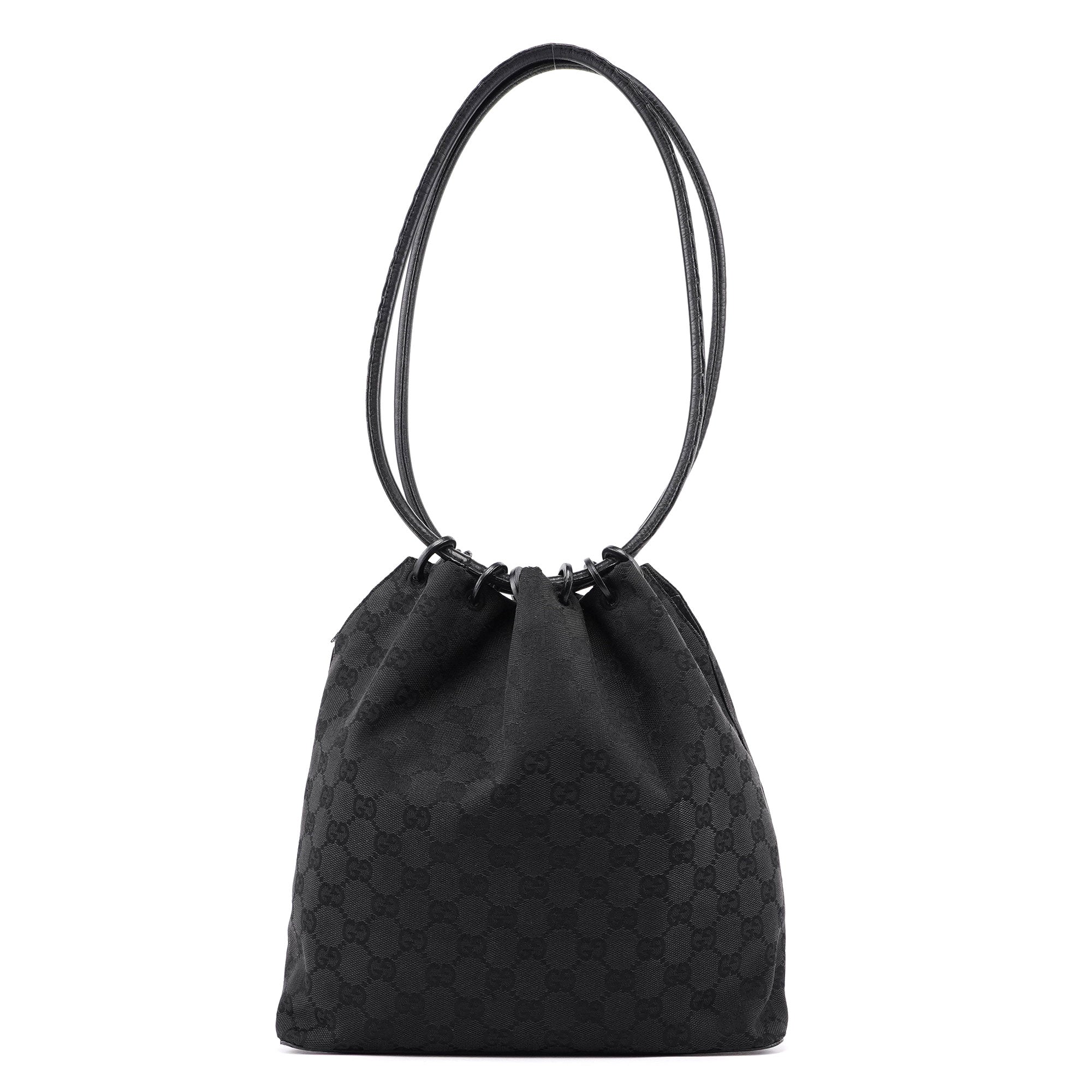 This vintage Gucci shoulder bag, crafted from GG monogram canvas and black leather, exudes timeless elegance. It features a double drawstring style handle and gold-tone hardware, highlighted by a Gucci logo bangle. The interior is lined in GG monogram satin.