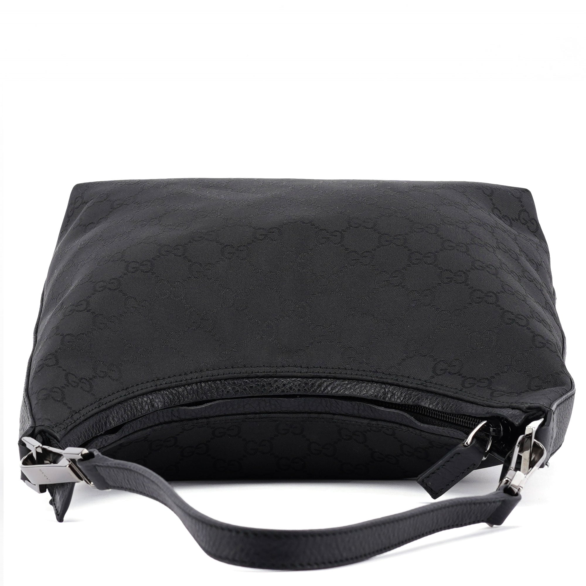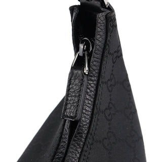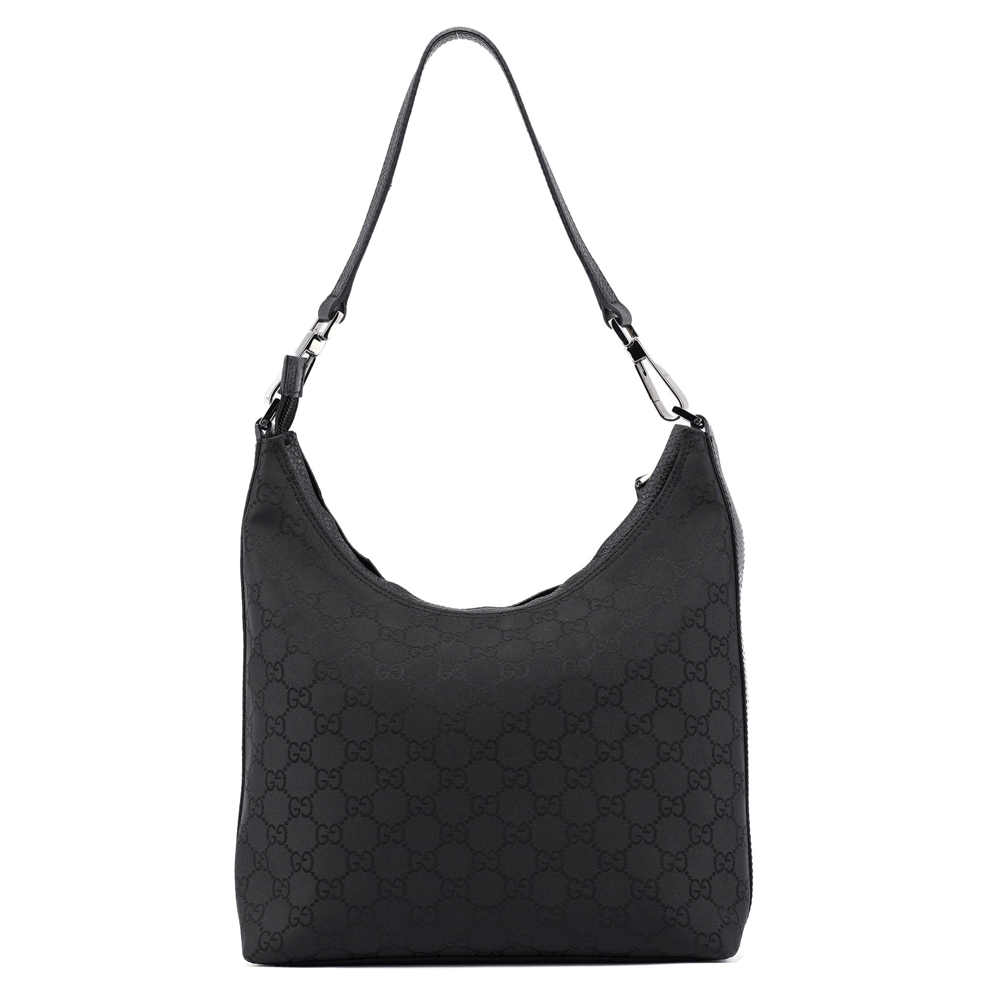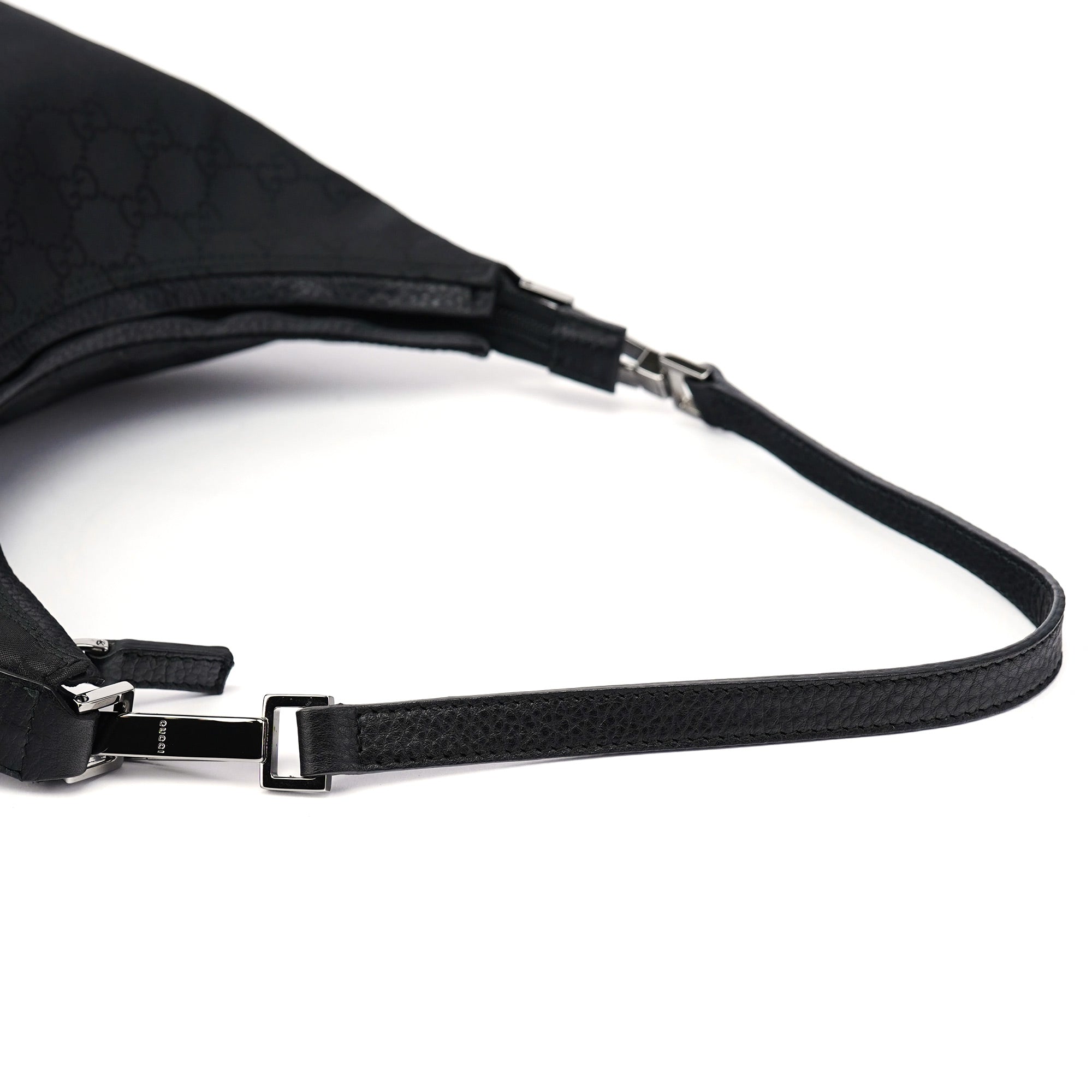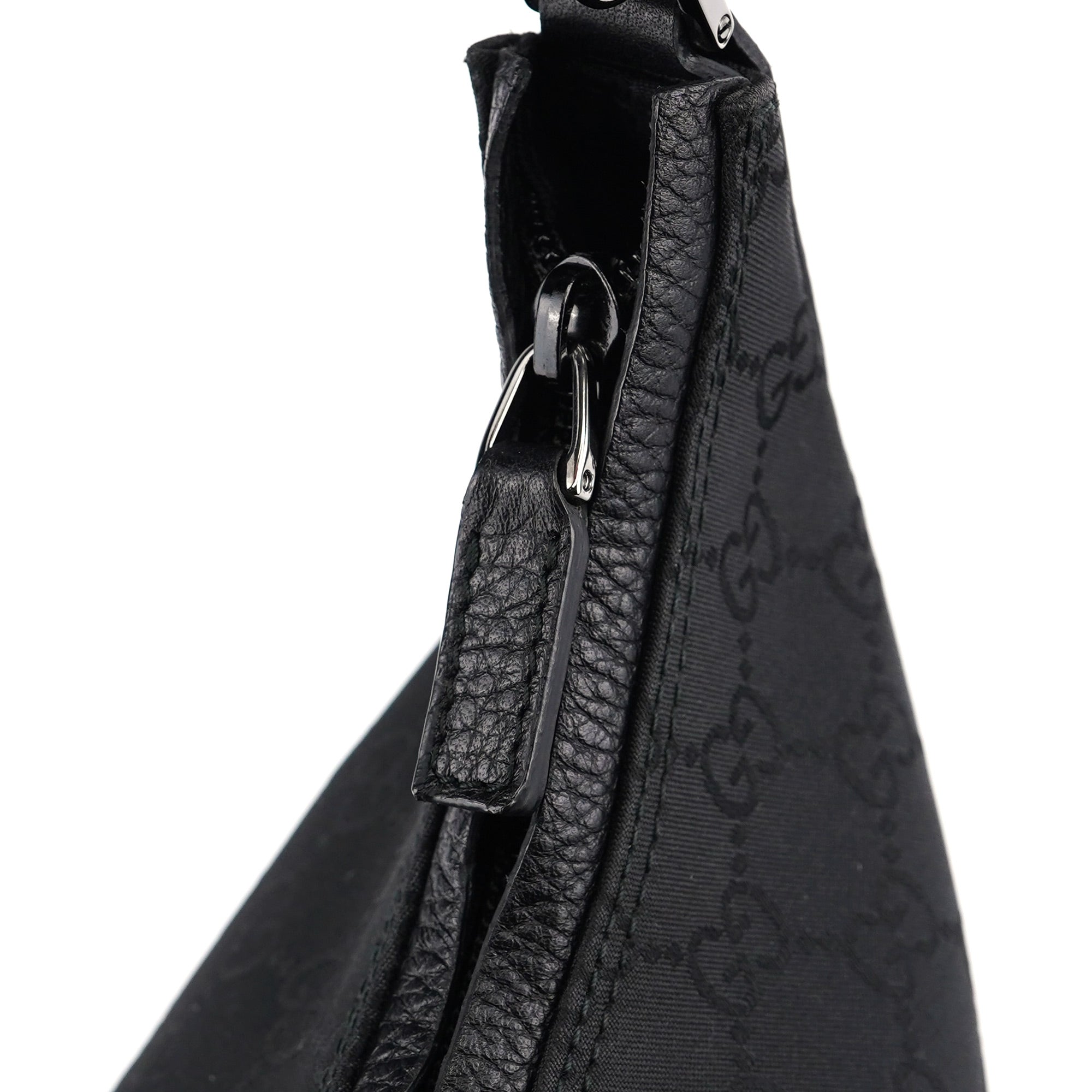 Designed by Tom Ford in the late 1990s, this Gucci GG hobo shoulder bag combines black GG monogram nylon with tonal calfskin leather trim. Silver-tone hardware engraved with the Gucci logo adds a refined touch, while the satin-lined interior includes a zipper pocket for organized storage. A timeless blend of elegance and functionality.