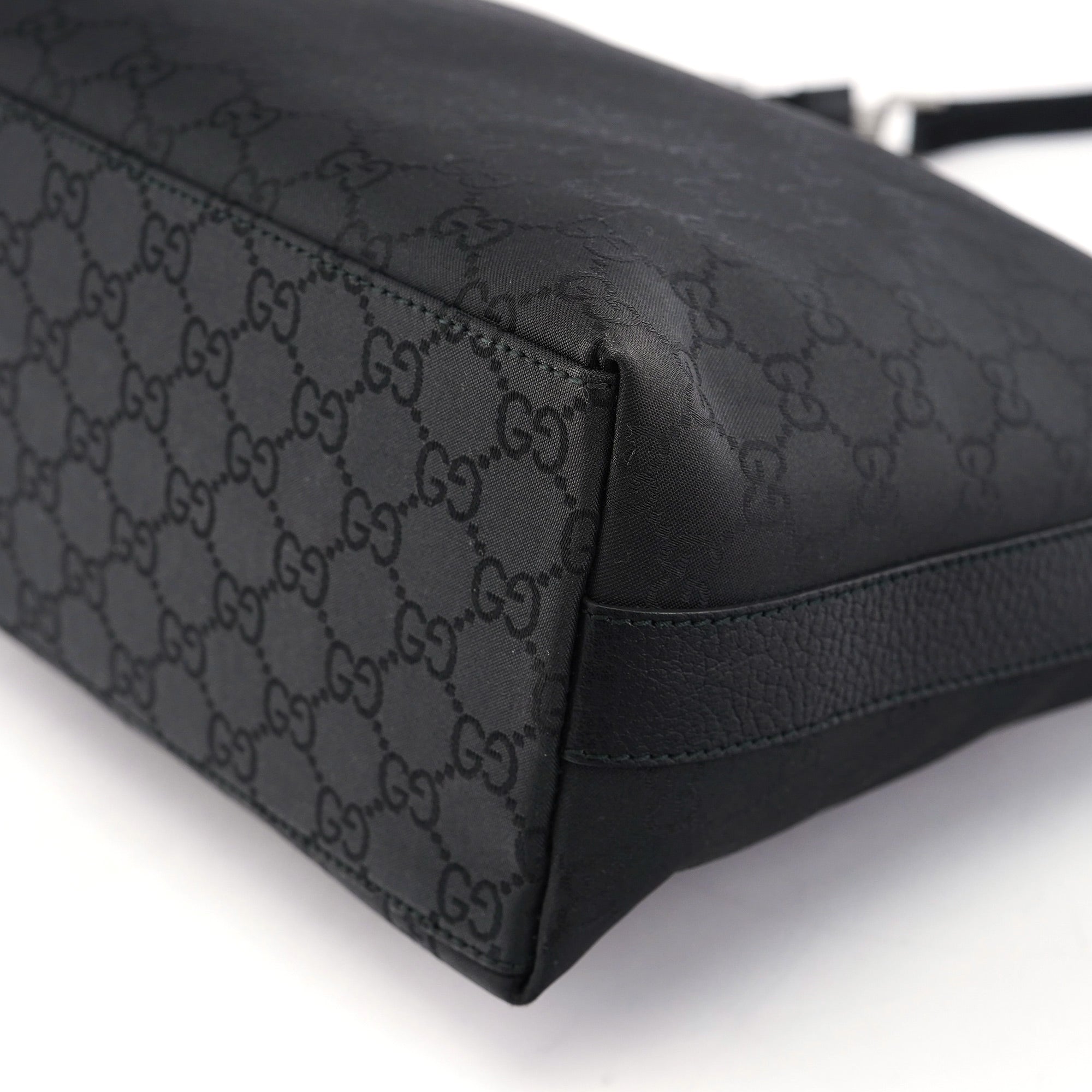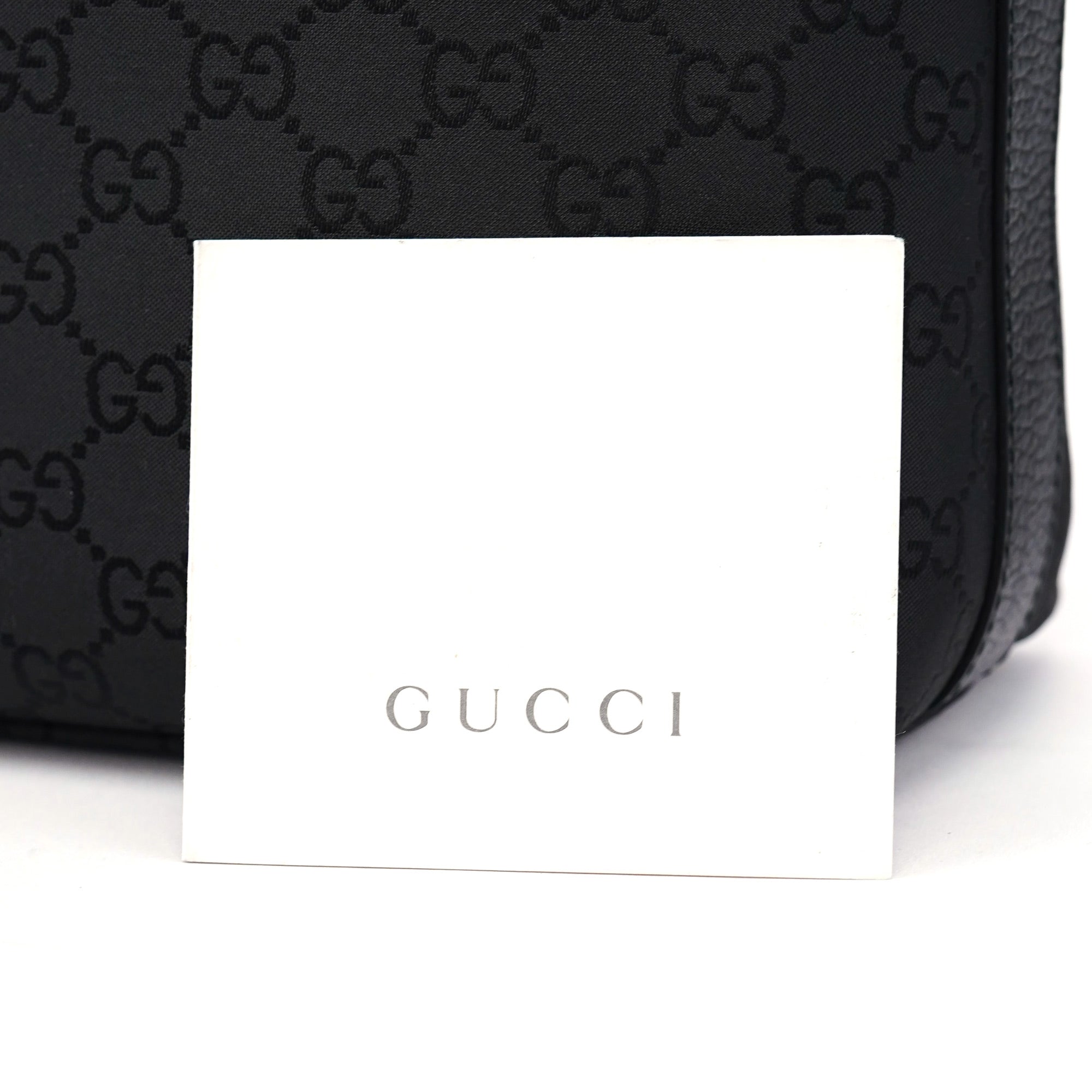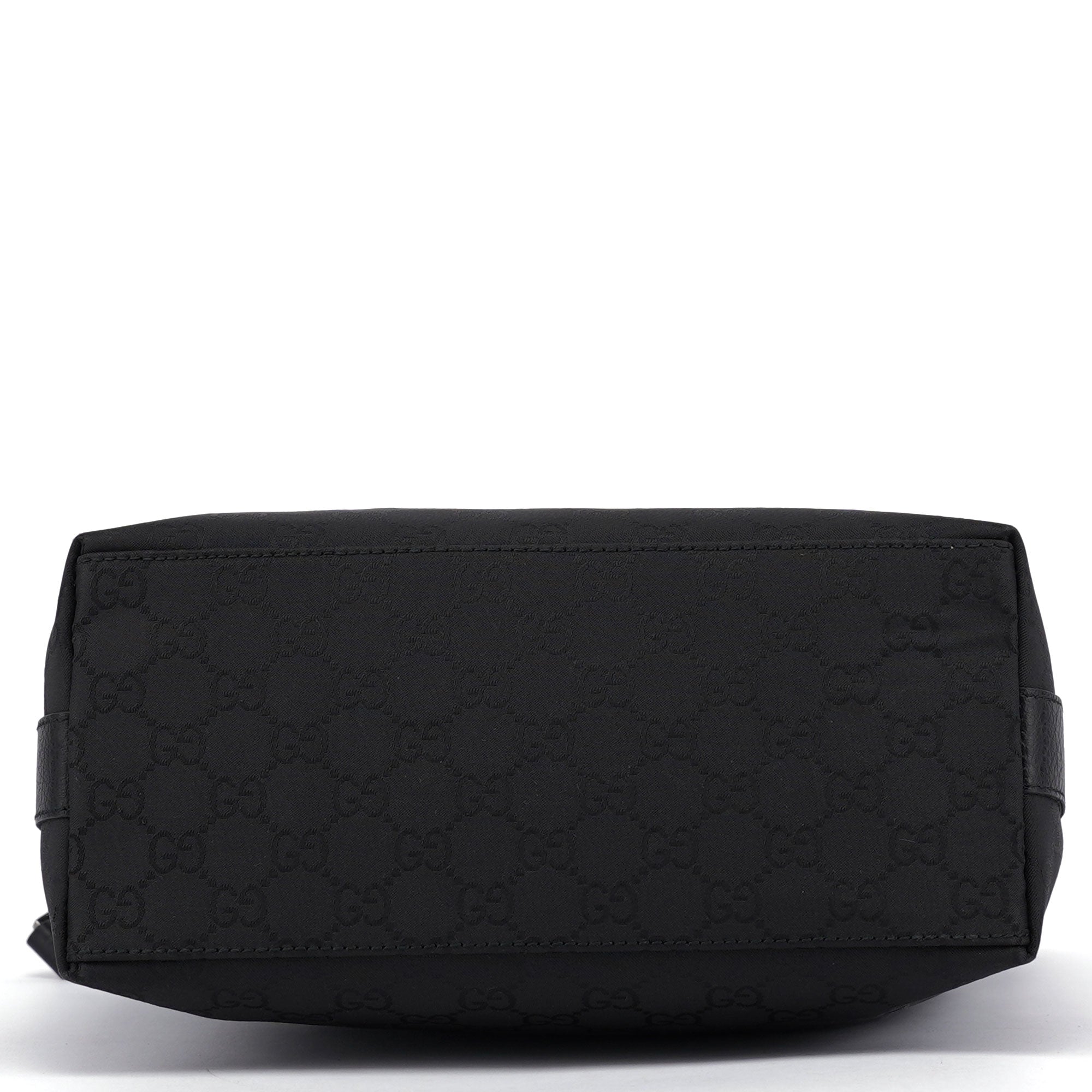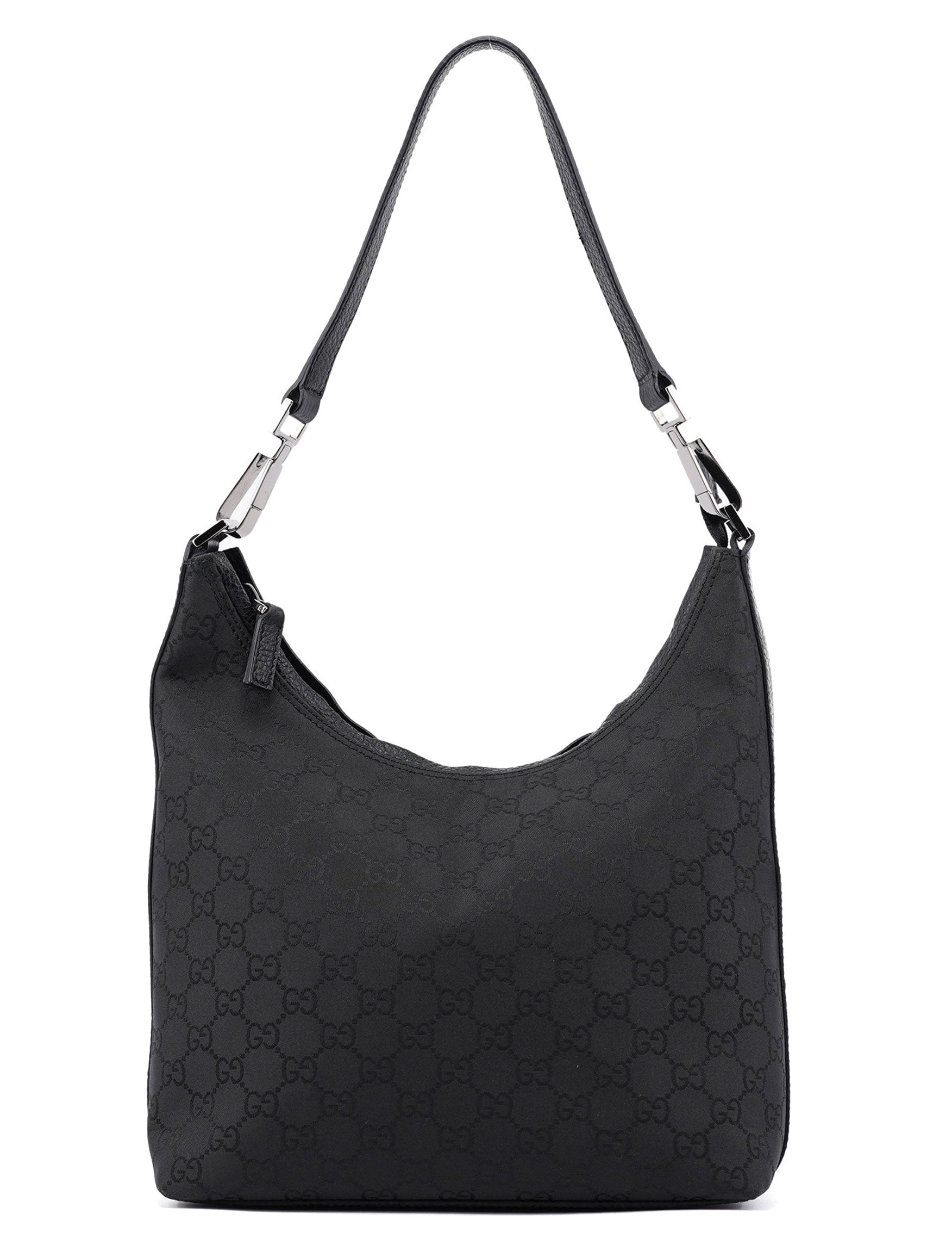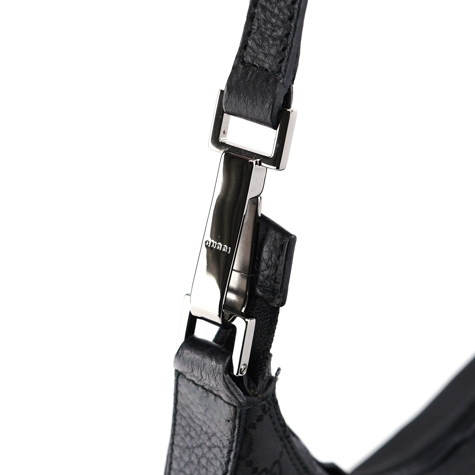 Designed by Tom Ford in the late 1990s, this Gucci GG hobo shoulder bag combines black GG monogram nylon with tonal calfskin leather trim. Silver-tone hardware engraved with the Gucci logo adds a refined touch, while the satin-lined interior includes a zipper pocket for organized storage. A timeless blend of elegance and functionality.
