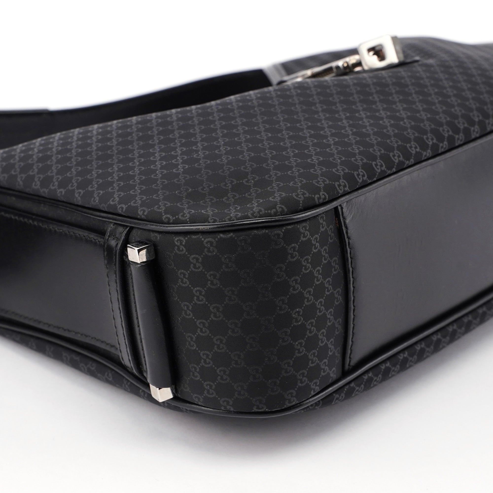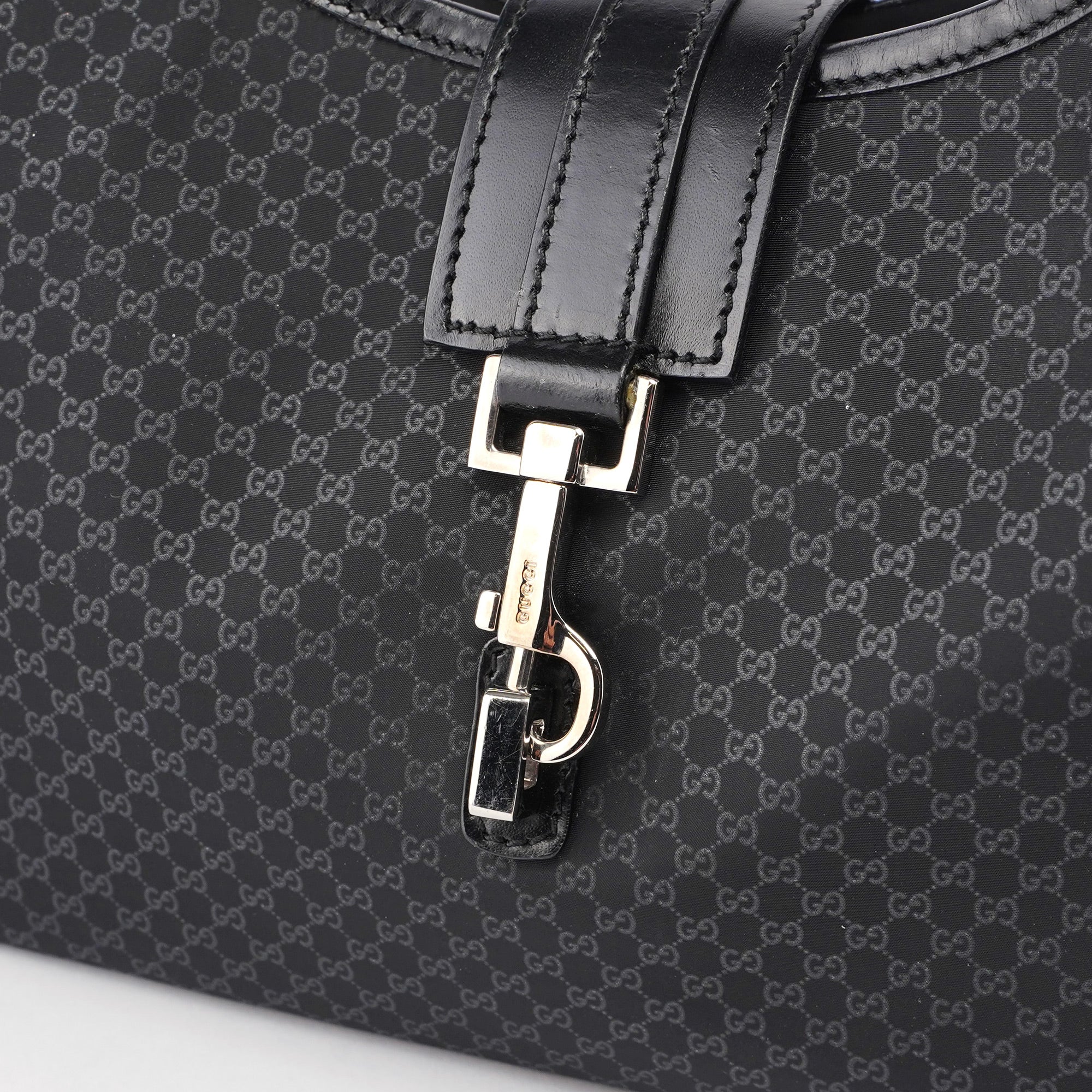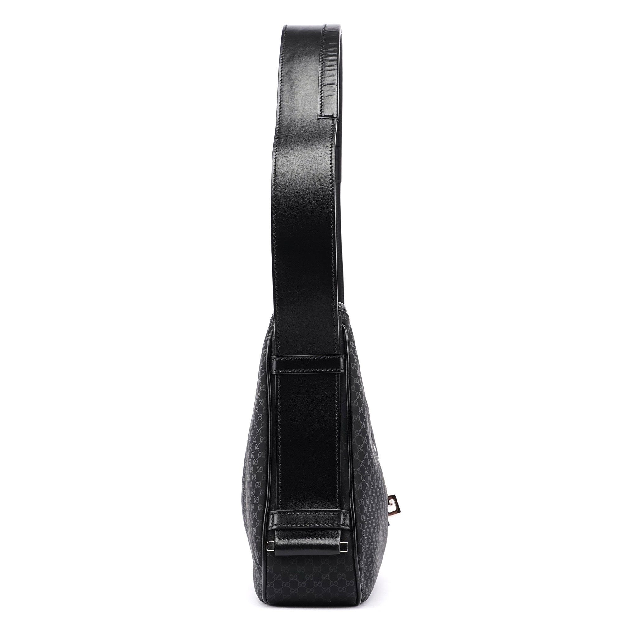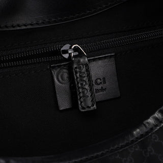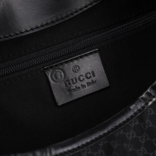 Handcrafted from black micro GG monogram canvas with black calfskin leather trim, this Gucci GG Jackie bag by Tom Ford from the late 1990s features silver-tone hardware engraved with the Gucci logo, an iconic Jackie clasp closure, and a satin-lined interior with an interior zipper pocket, showcasing timeless elegance.