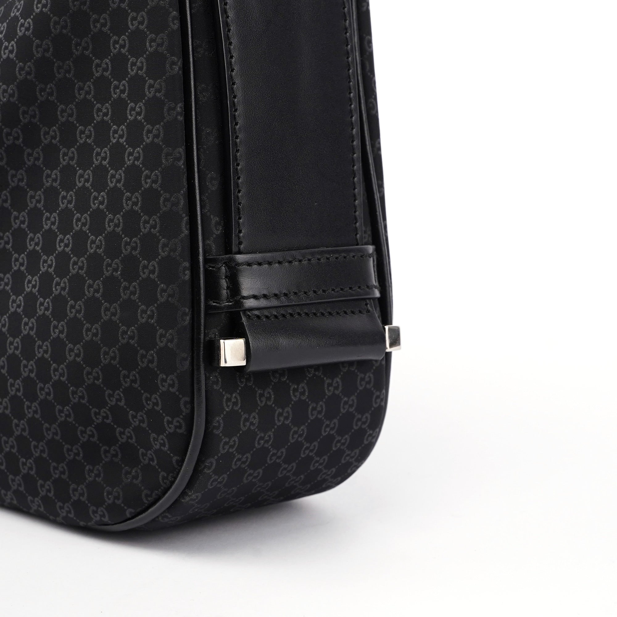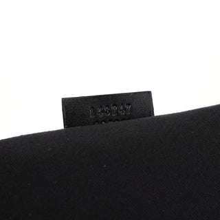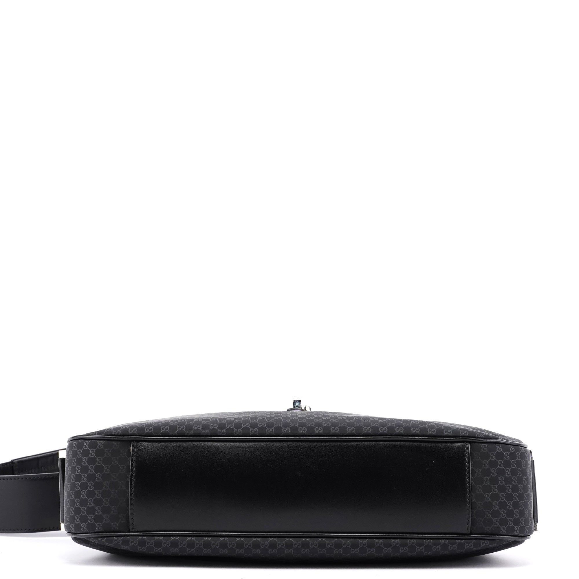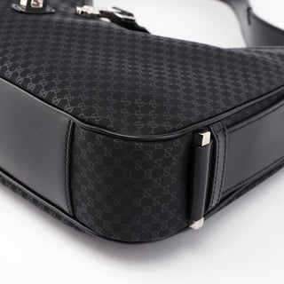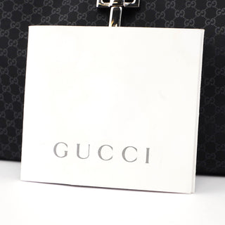 Handcrafted from black micro GG monogram canvas with black calfskin leather trim, this Gucci GG Jackie bag by Tom Ford from the late 1990s features silver-tone hardware engraved with the Gucci logo, an iconic Jackie clasp closure, and a satin-lined interior with an interior zipper pocket, showcasing timeless elegance.