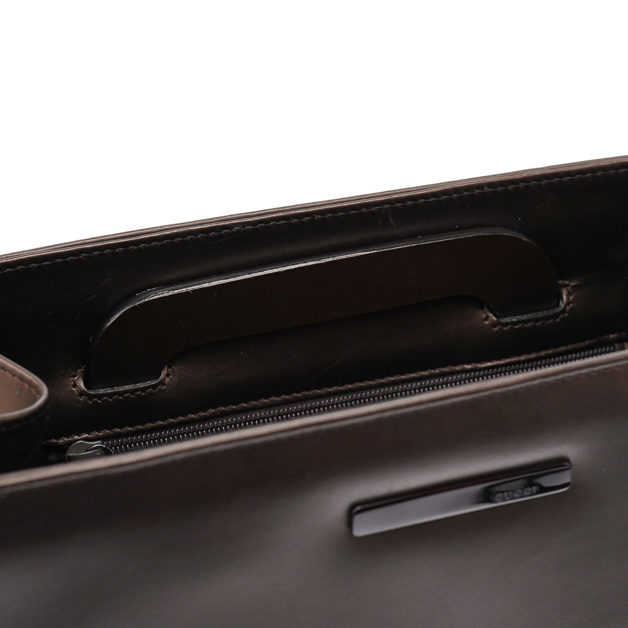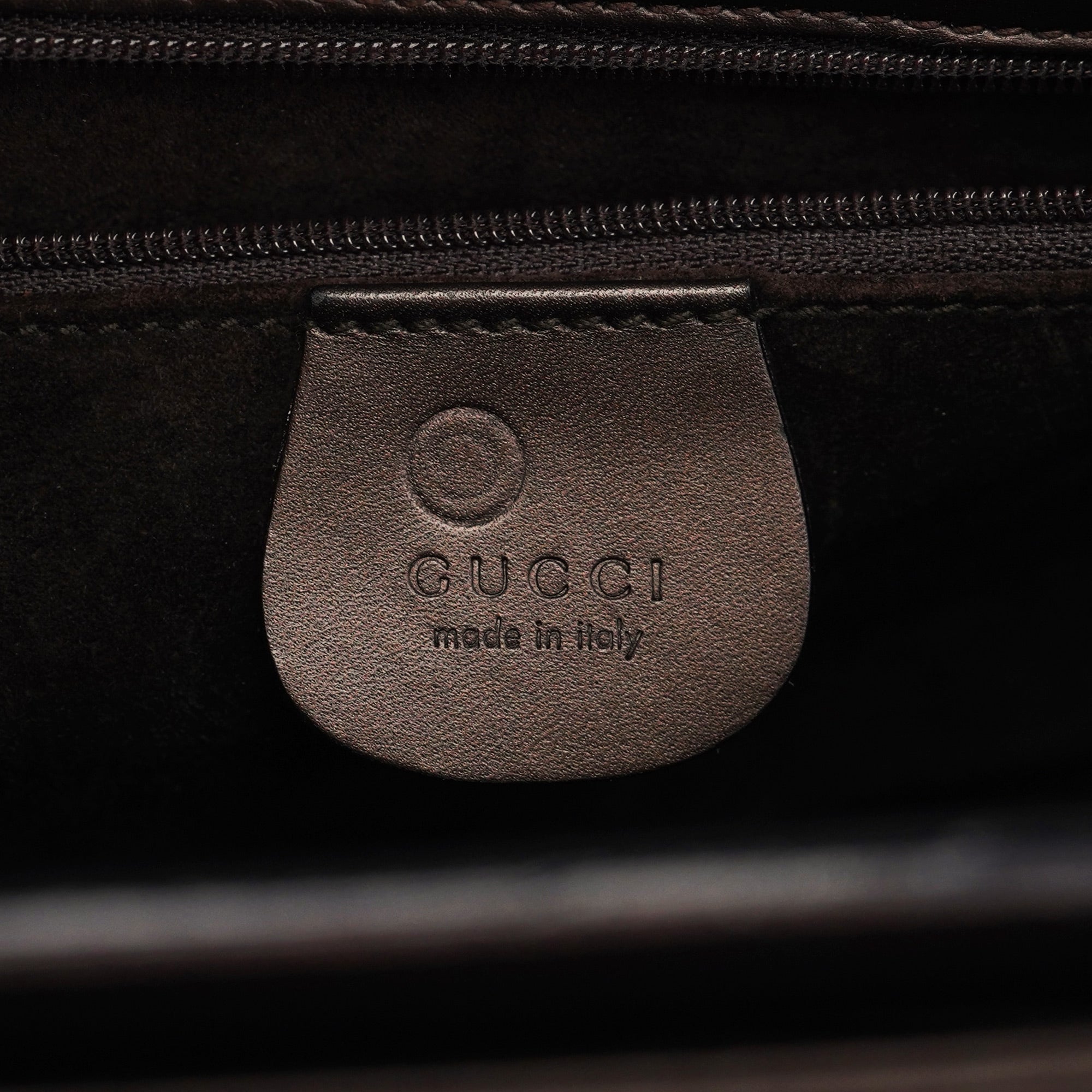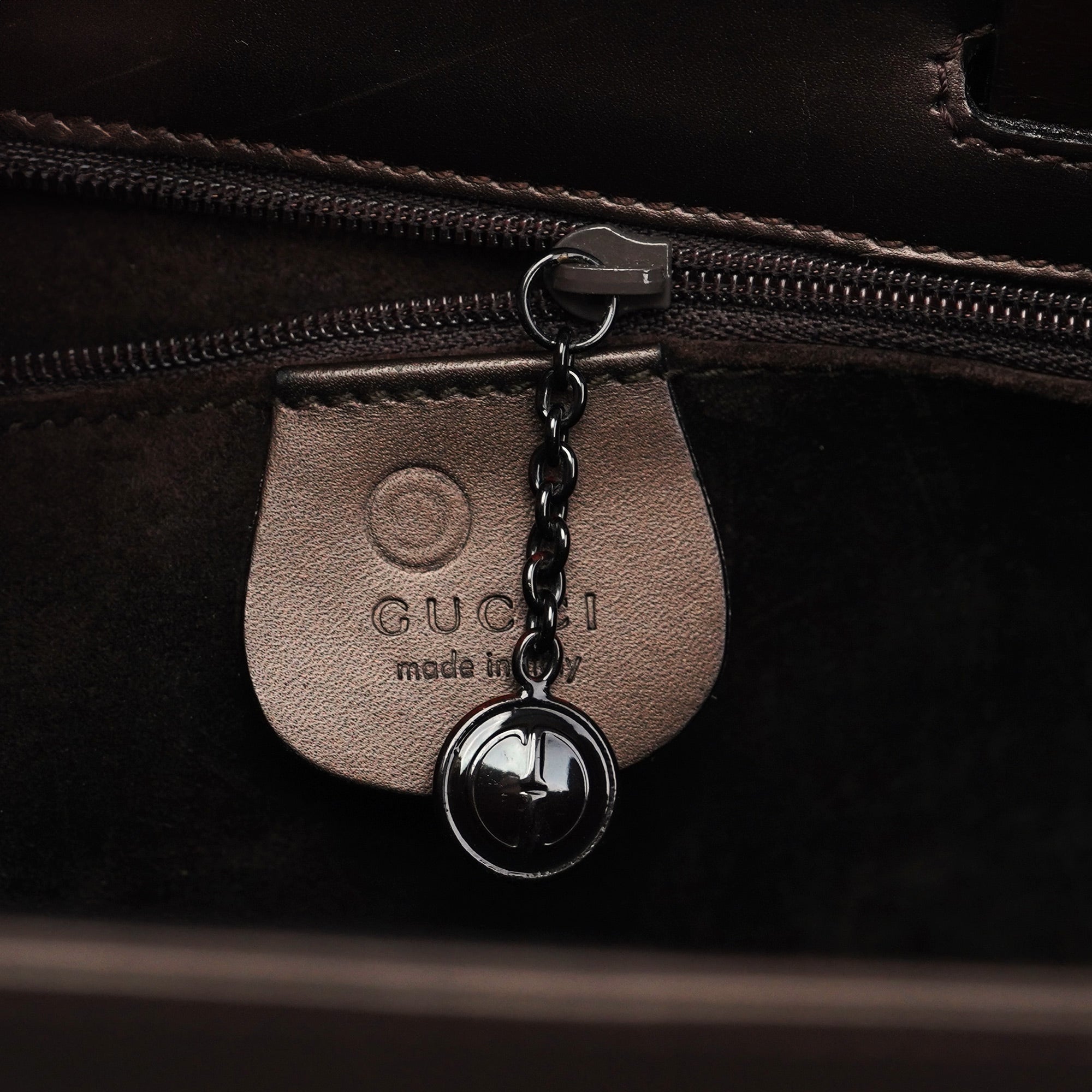 Designed by Tom Ford in the late 1990s, this Gucci 2-way tote bag is handcrafted in bronze leather and features a Gucci logo plate at the front with gloss anthracite hardware for a polished look. Designed with retractable handles and a detachable shoulder strap, it offers versatile carrying options. The interior houses a zipper pocket, ensuring essentials are kept secure and organized.